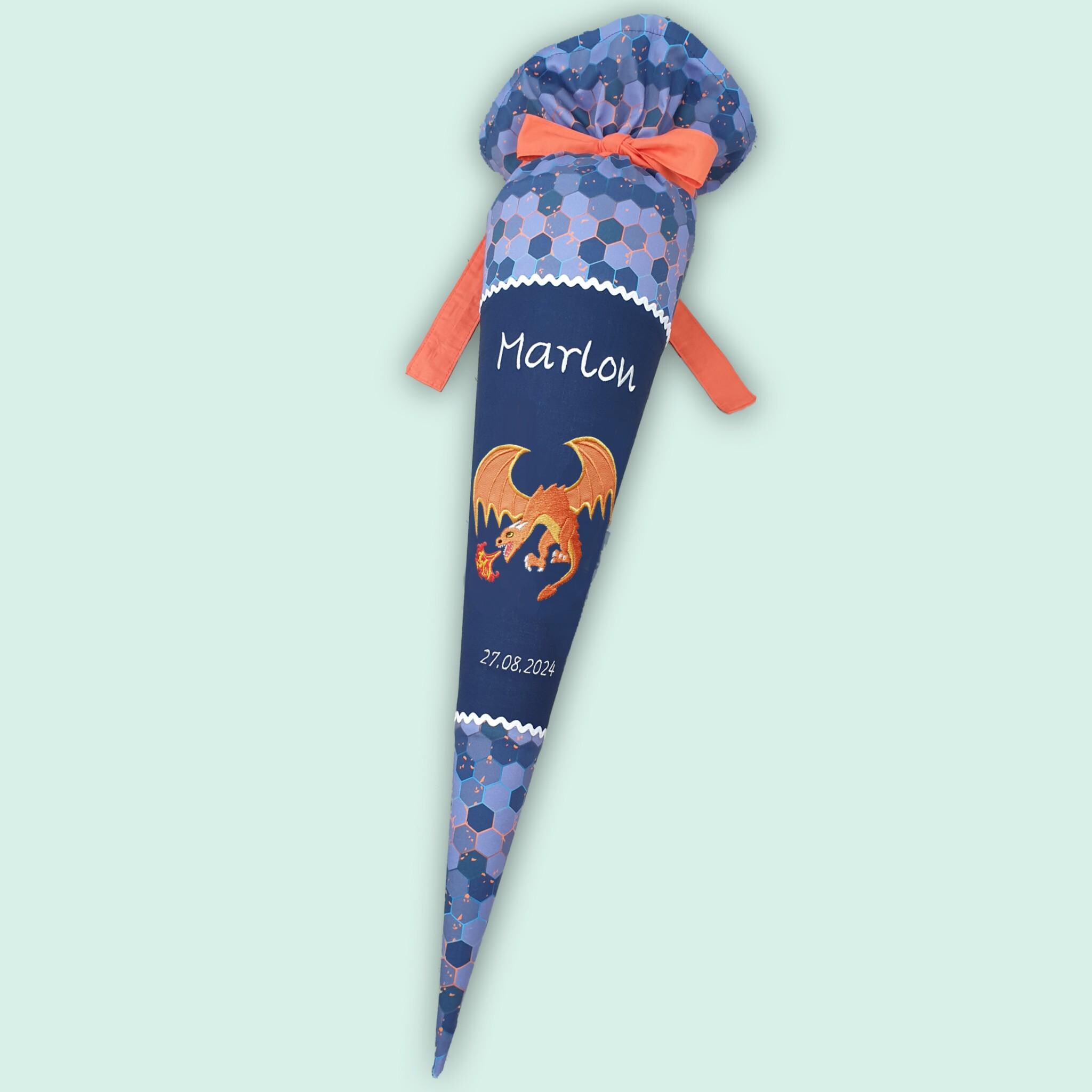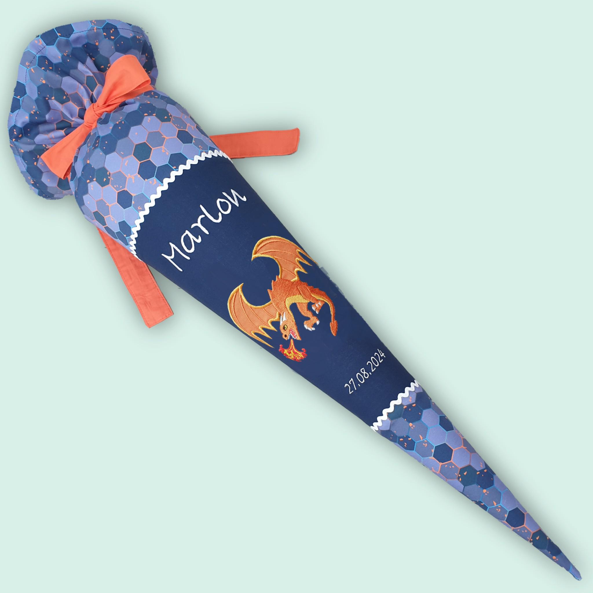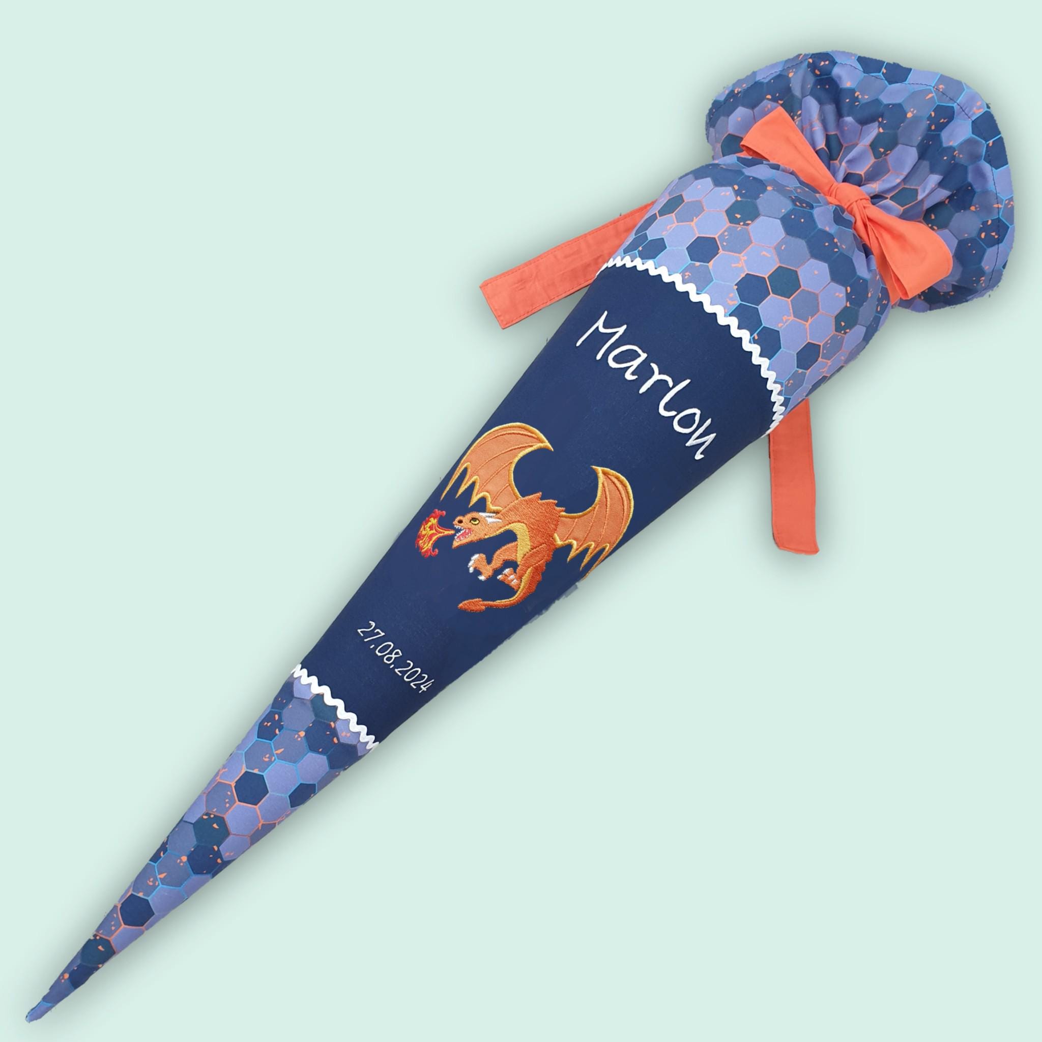 Schultüte mit Drachen und Namen farblich auf den Eldrador Schulranzen abgestimmt.