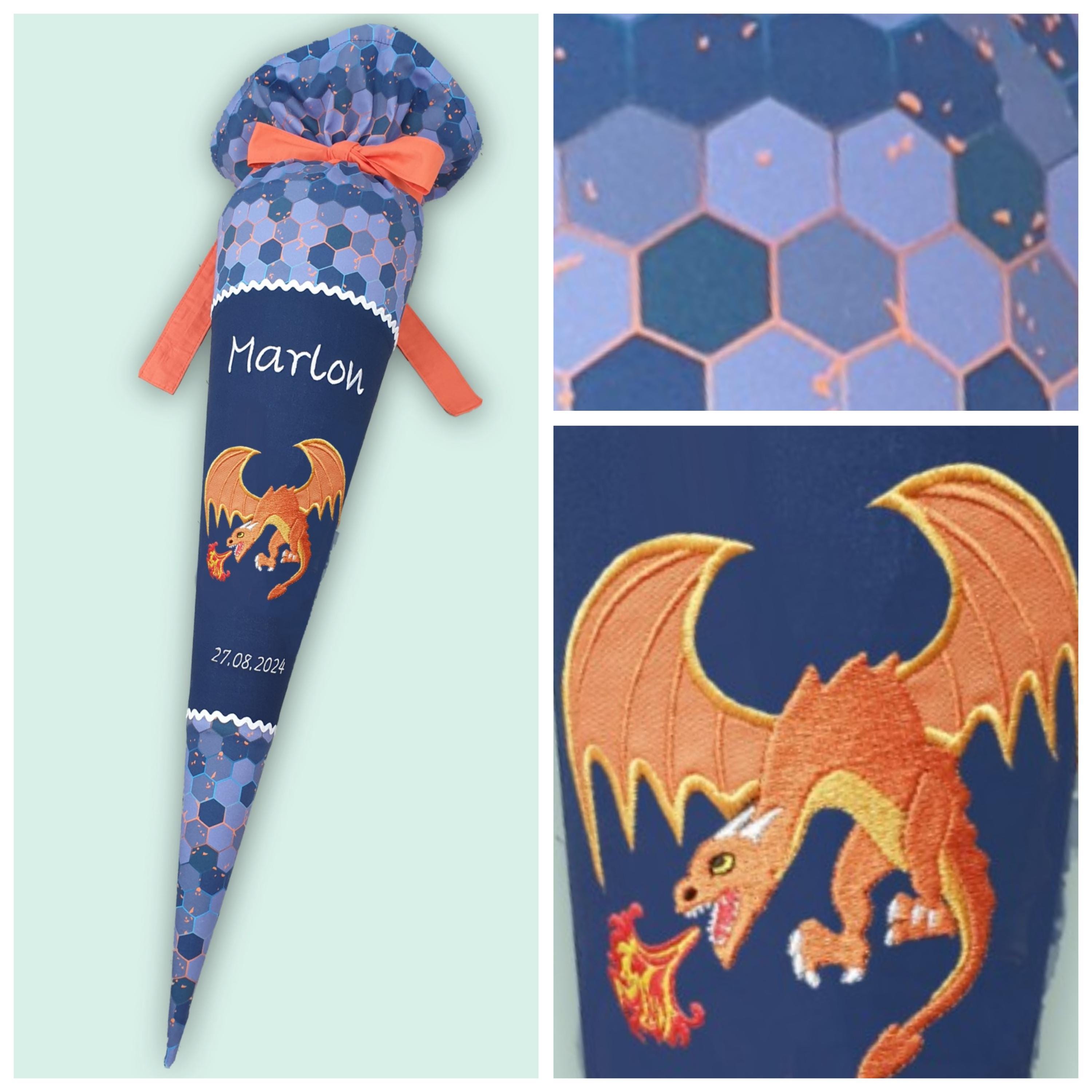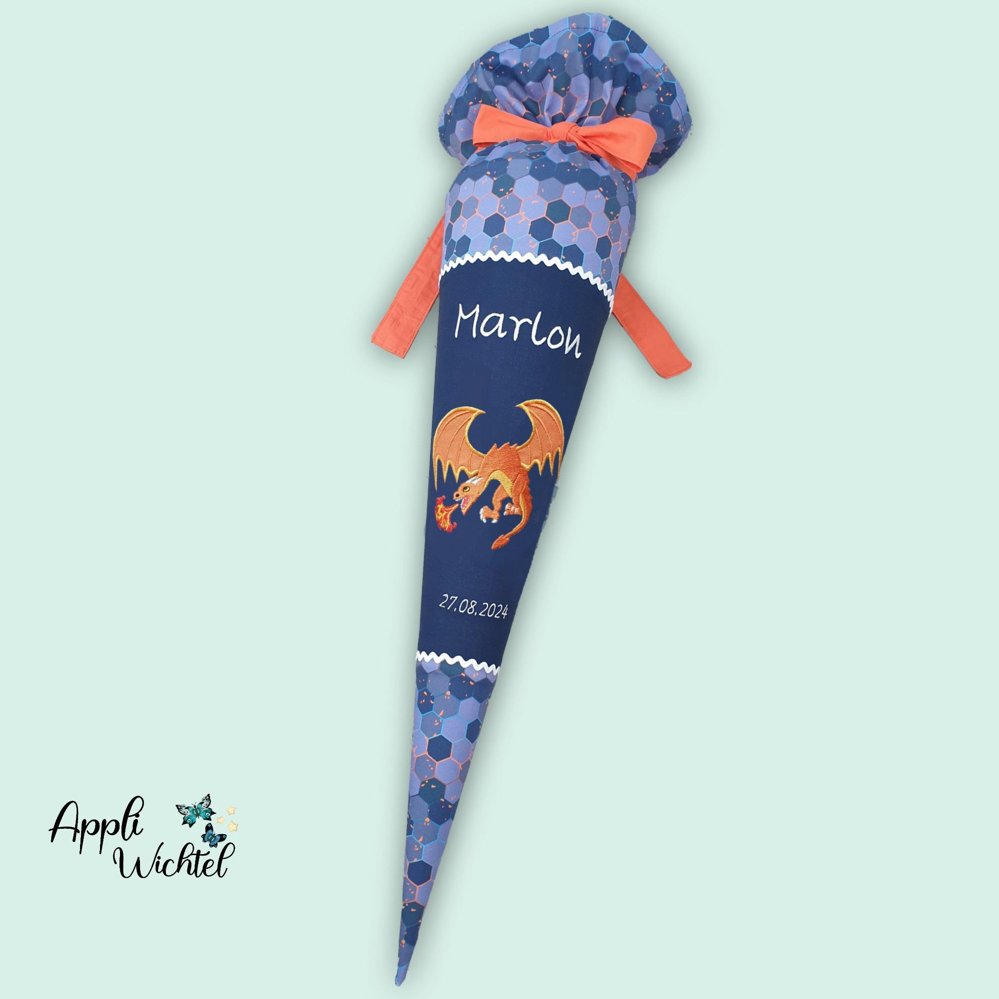 Jede Schultüte wird mit einem gestickten Motiv und dem Namen deines Kindes individuell gestaltet. Auf Wunsch fügen wir auch das Datum des ersten Schultages hinzu.