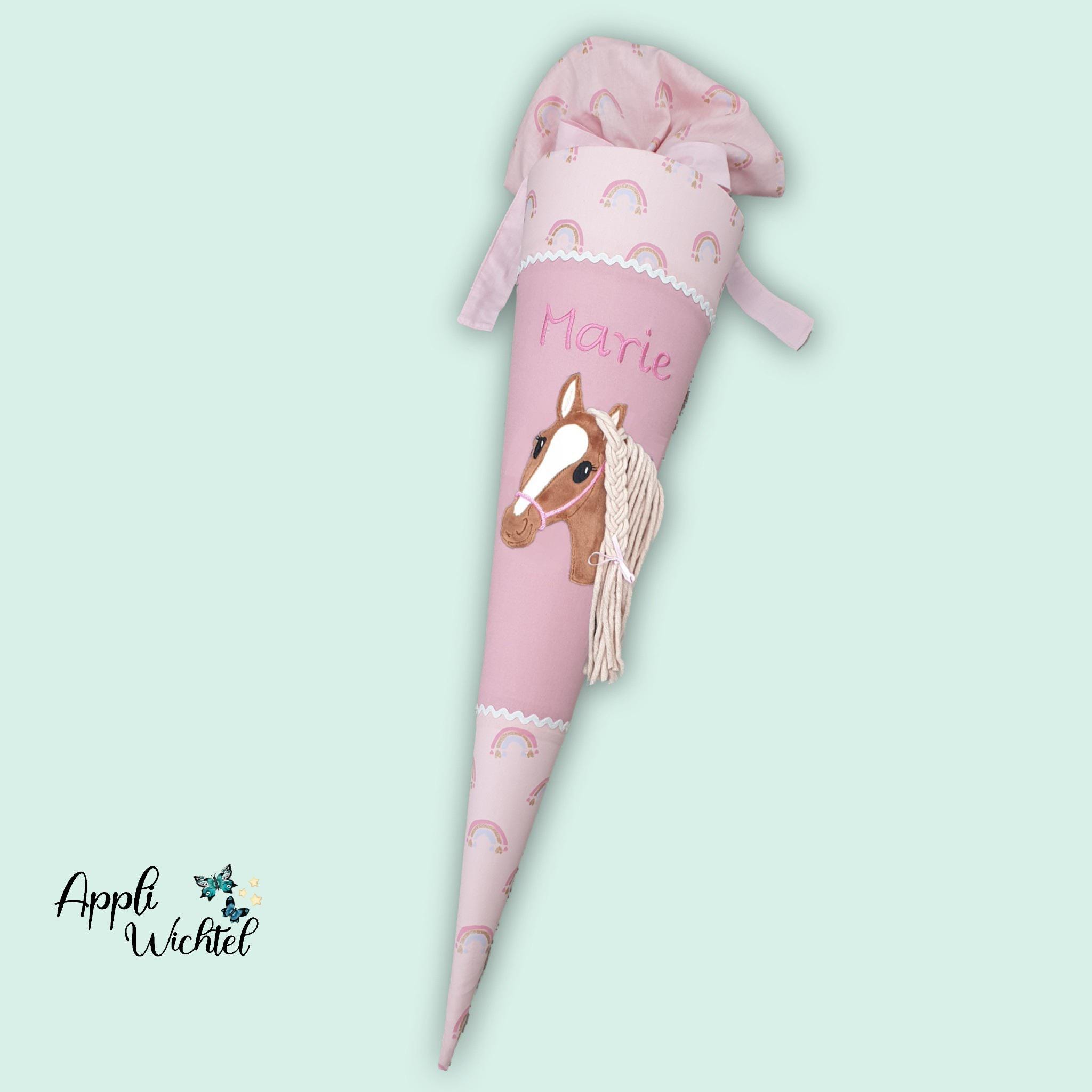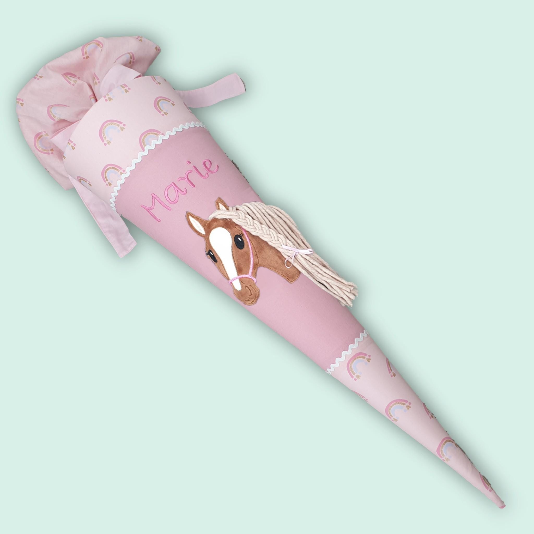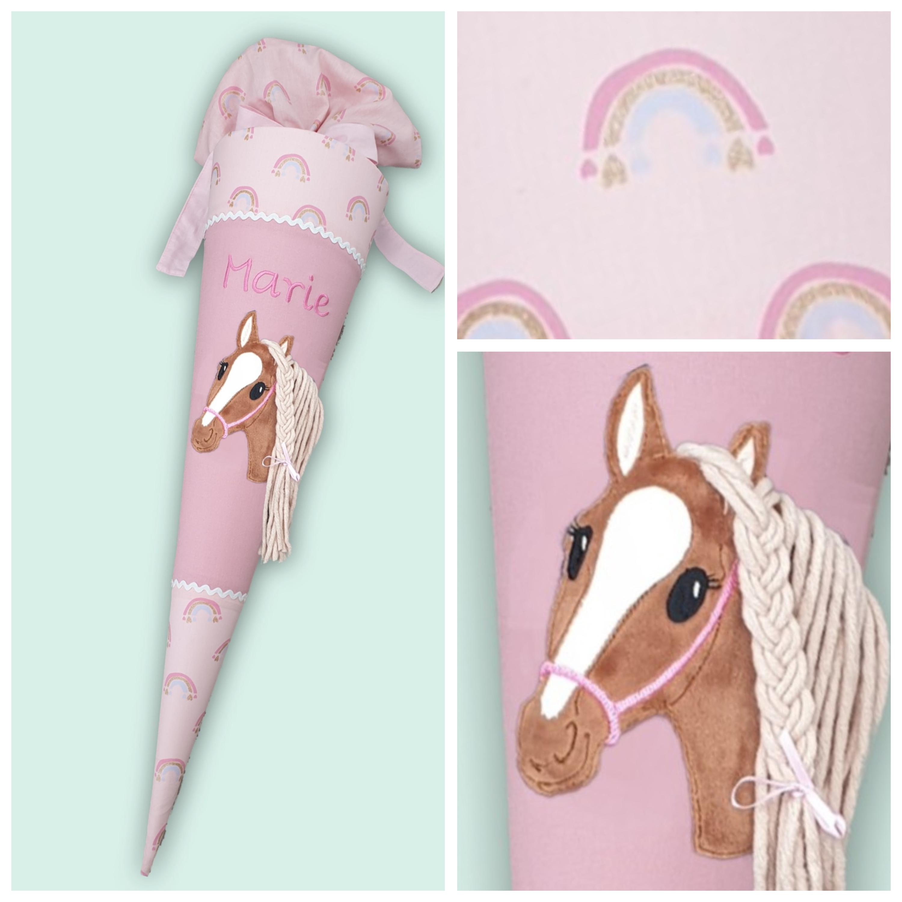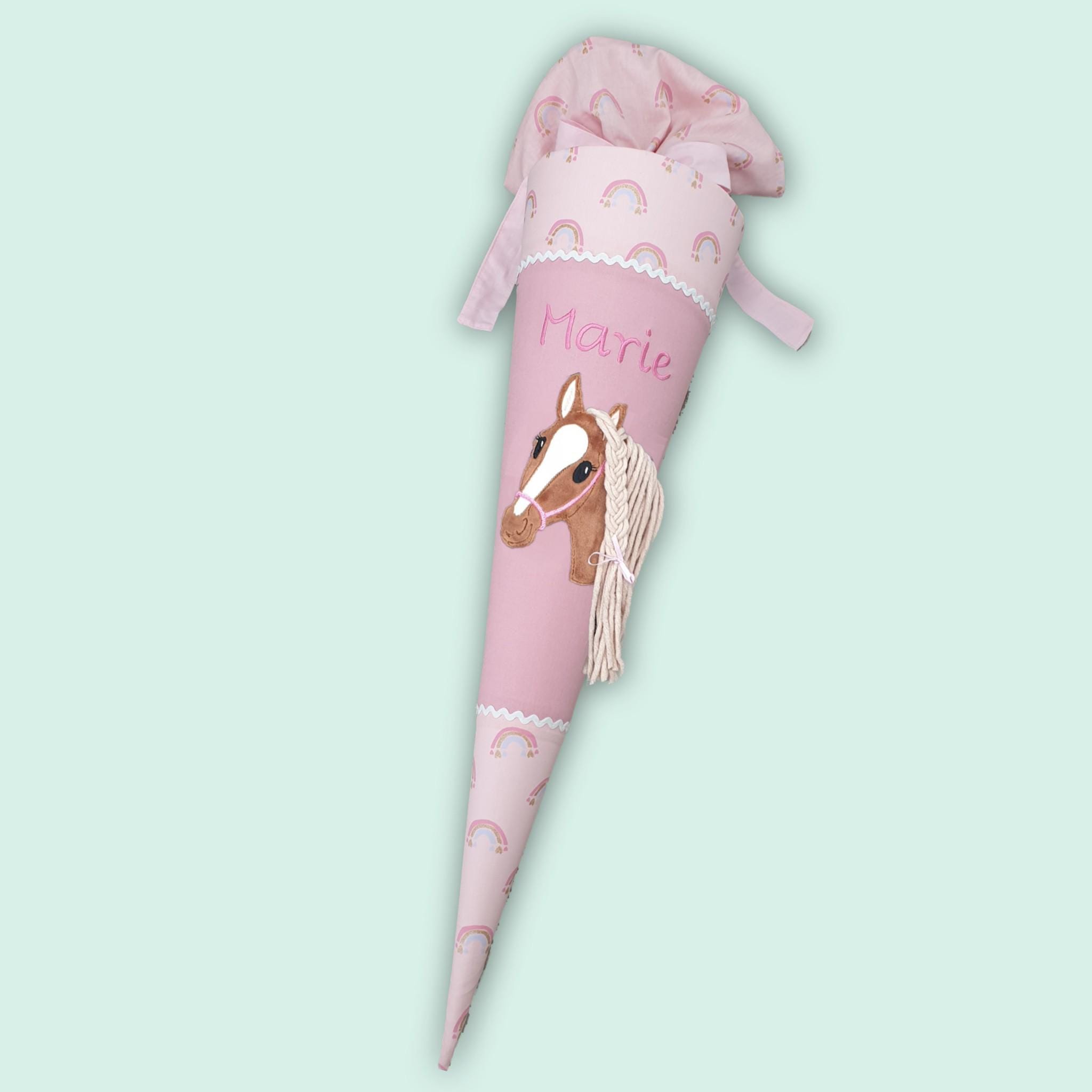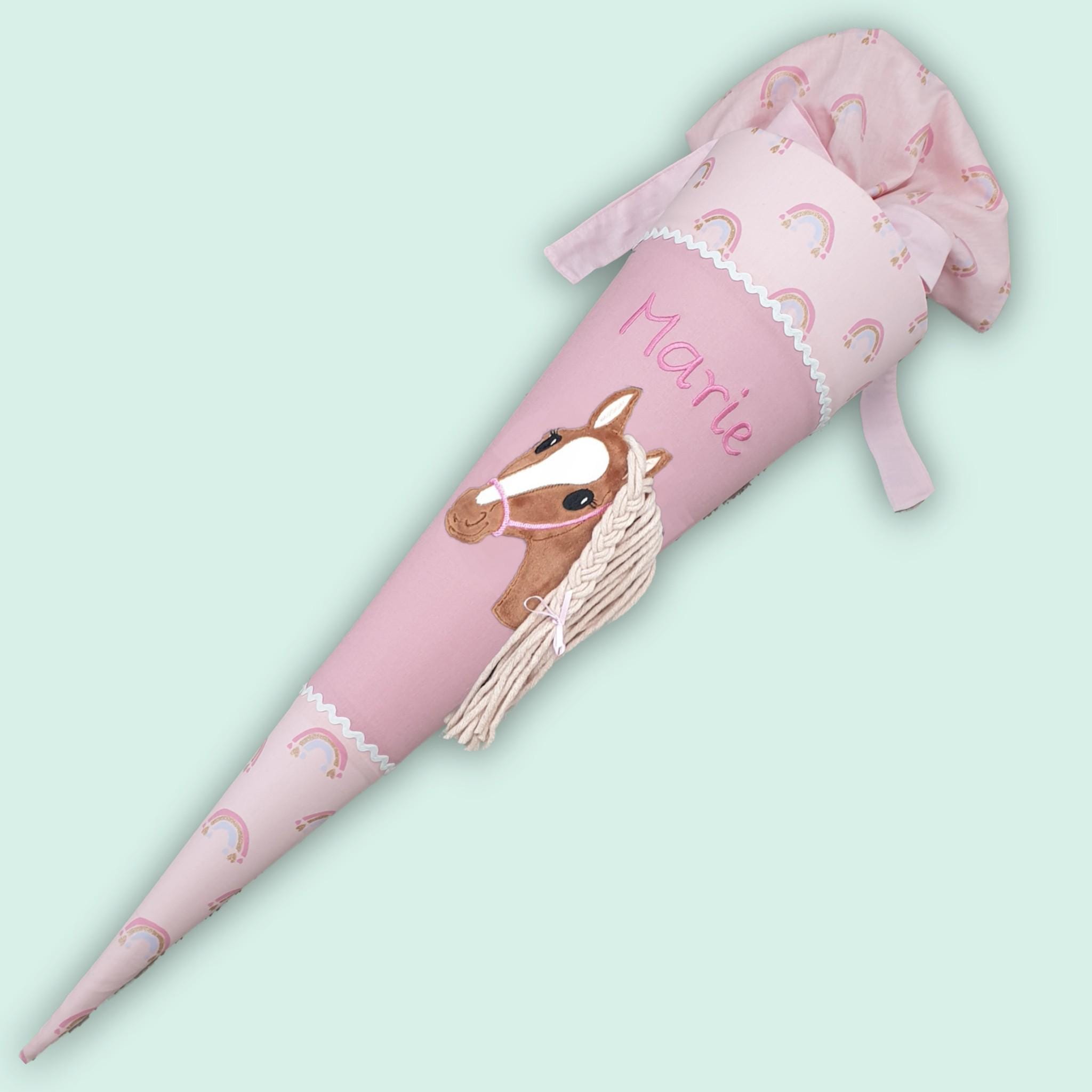 Schultüte mit Pferd Regenbogen und Namen und Regenbogen Stoff