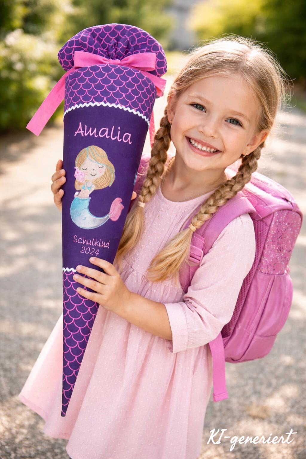 Schultüte mit Meerjungfrau und Namen farblich auf den Ergobag Perlentauchbär Schulranzen abgestimmt.