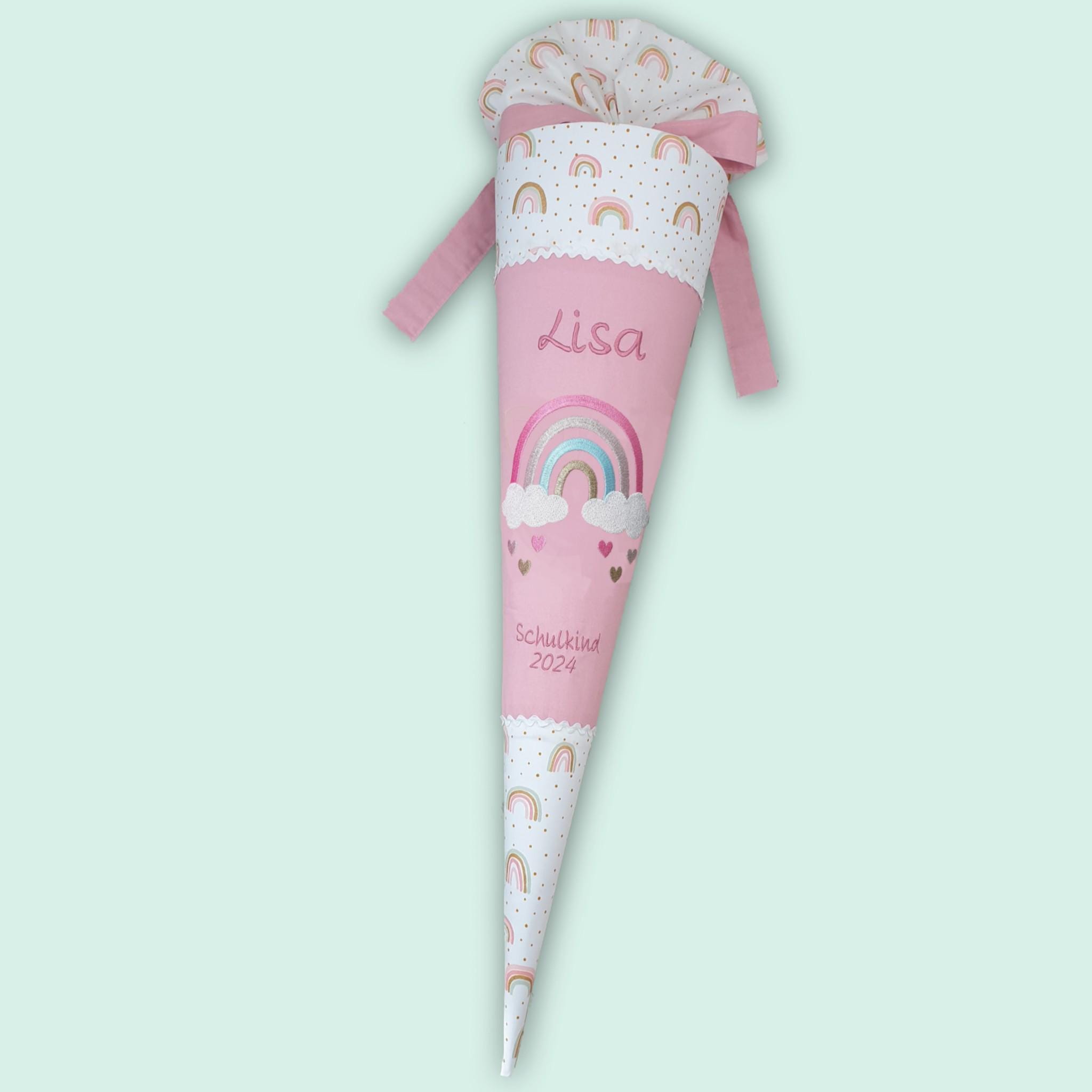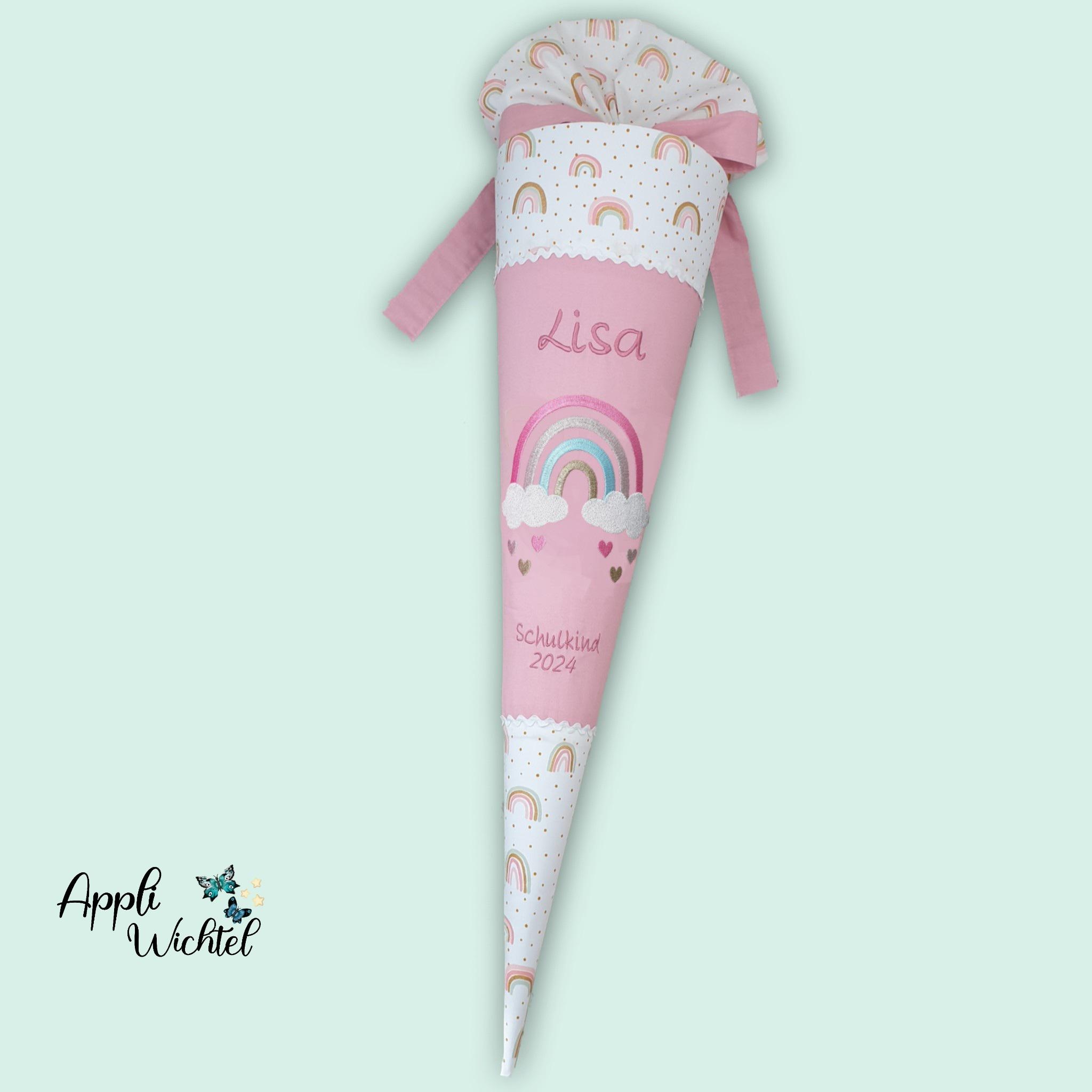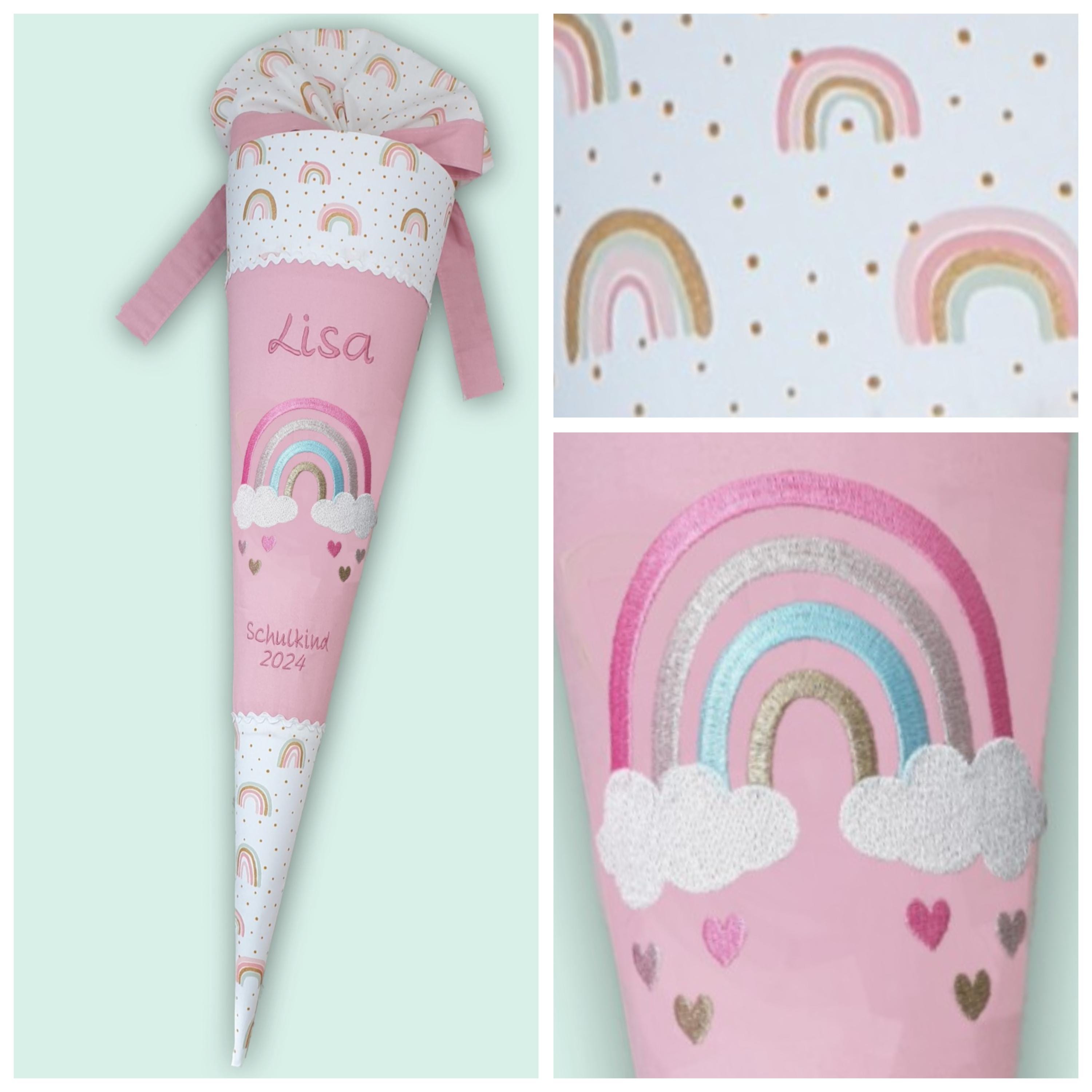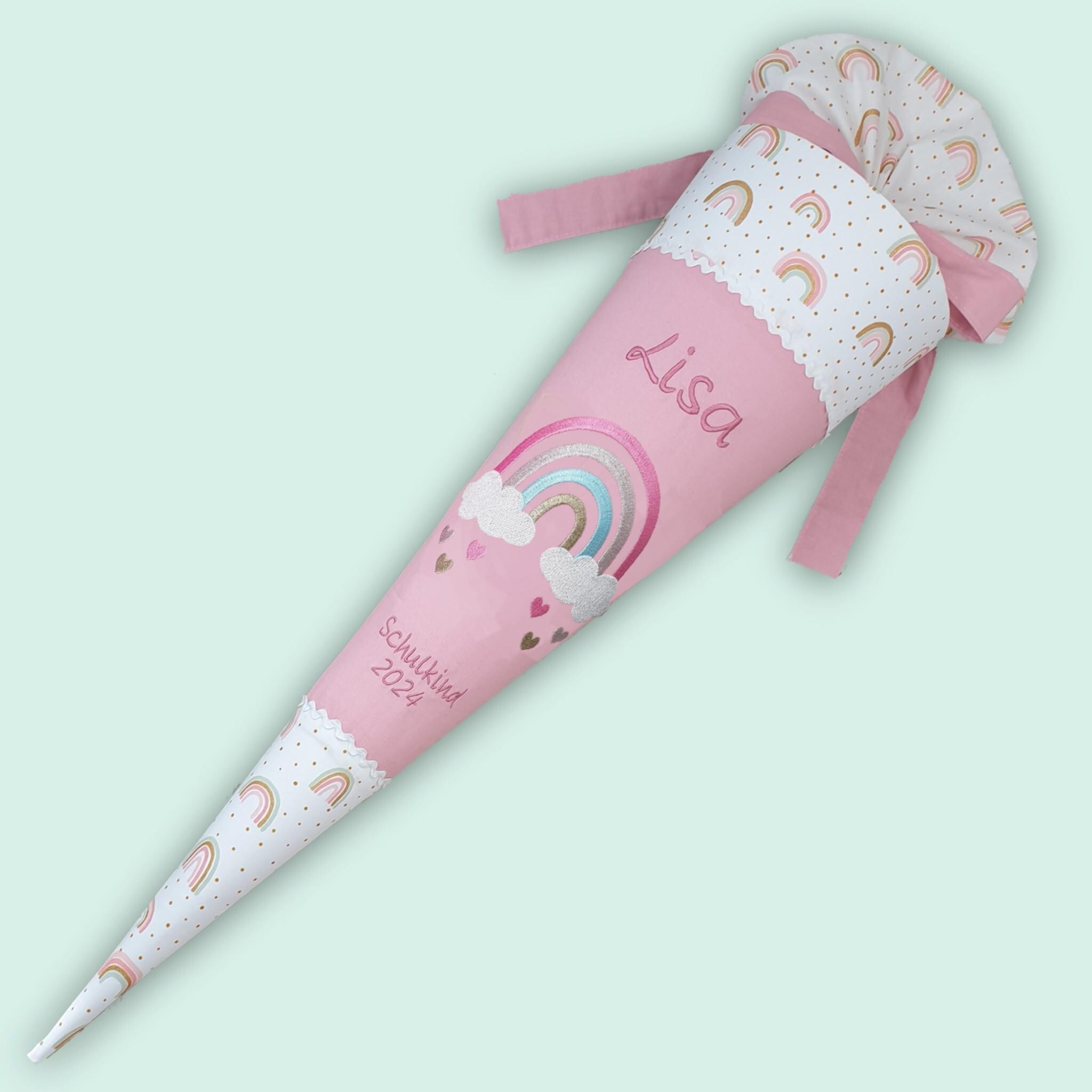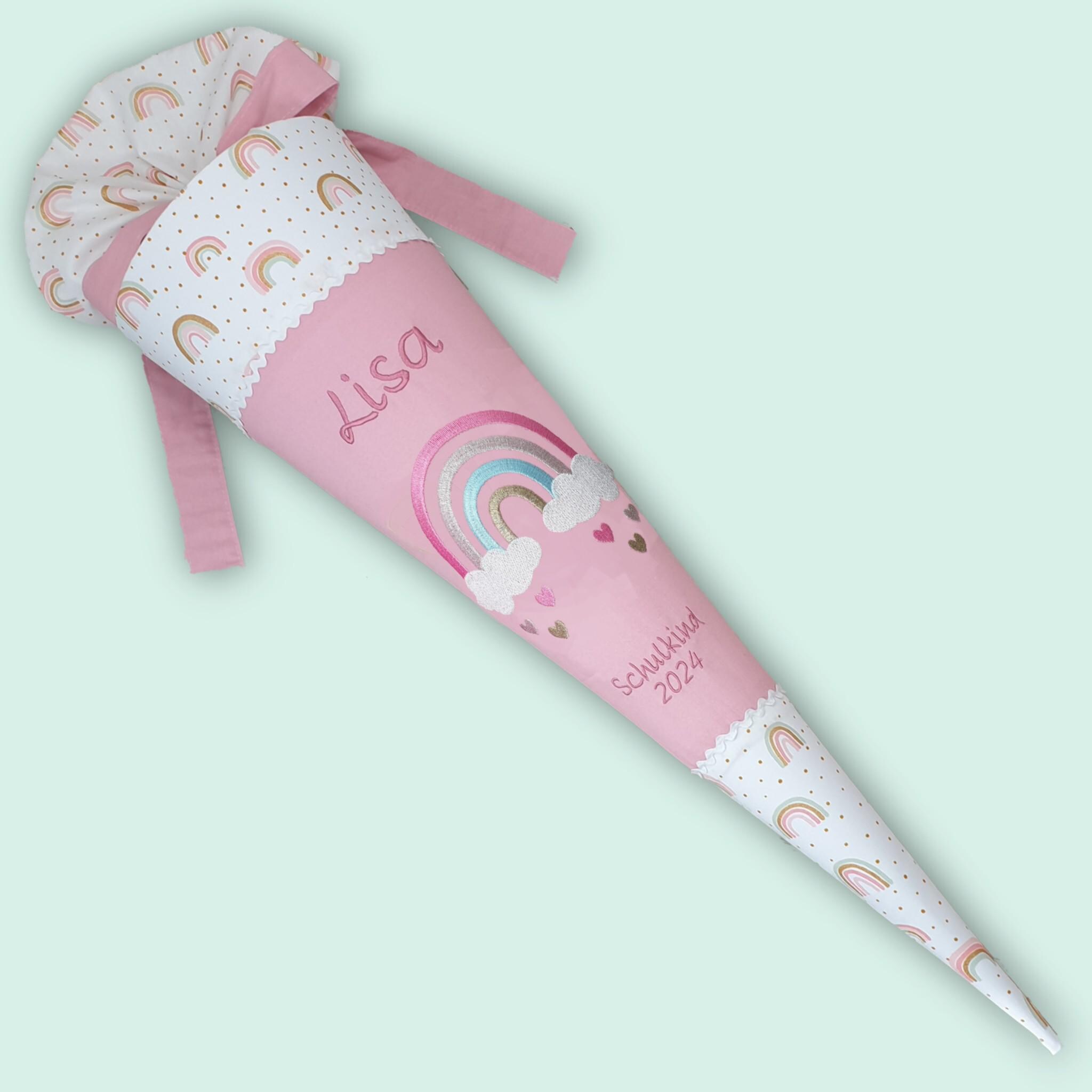Feiere den ersten Schultag deines Kindes mit einer einzigartigen Schultüte, die mit einem glitzernden, gestickten Regenbogen-Motiv verziert ist! Unsere handgefertigten Schultüten sind nicht nur ein Blickfang für die Einschulung, sondern können später auch in ein gemütliches Kissen verwandelt werden.