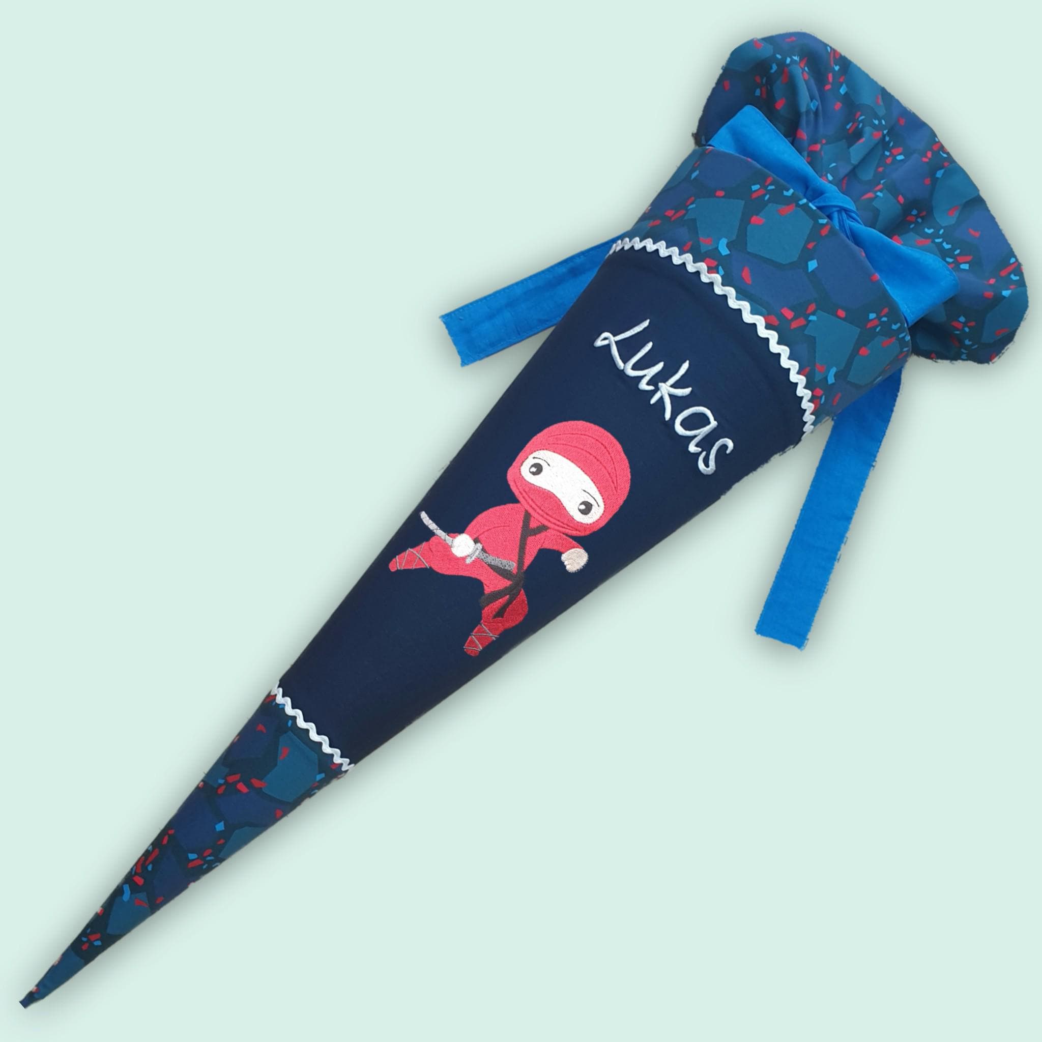 Die Schultüte ist mit Zackenlitze aus Baumwolle verziert und wird mit einem genähten Baumwollband sicher verschlossen.