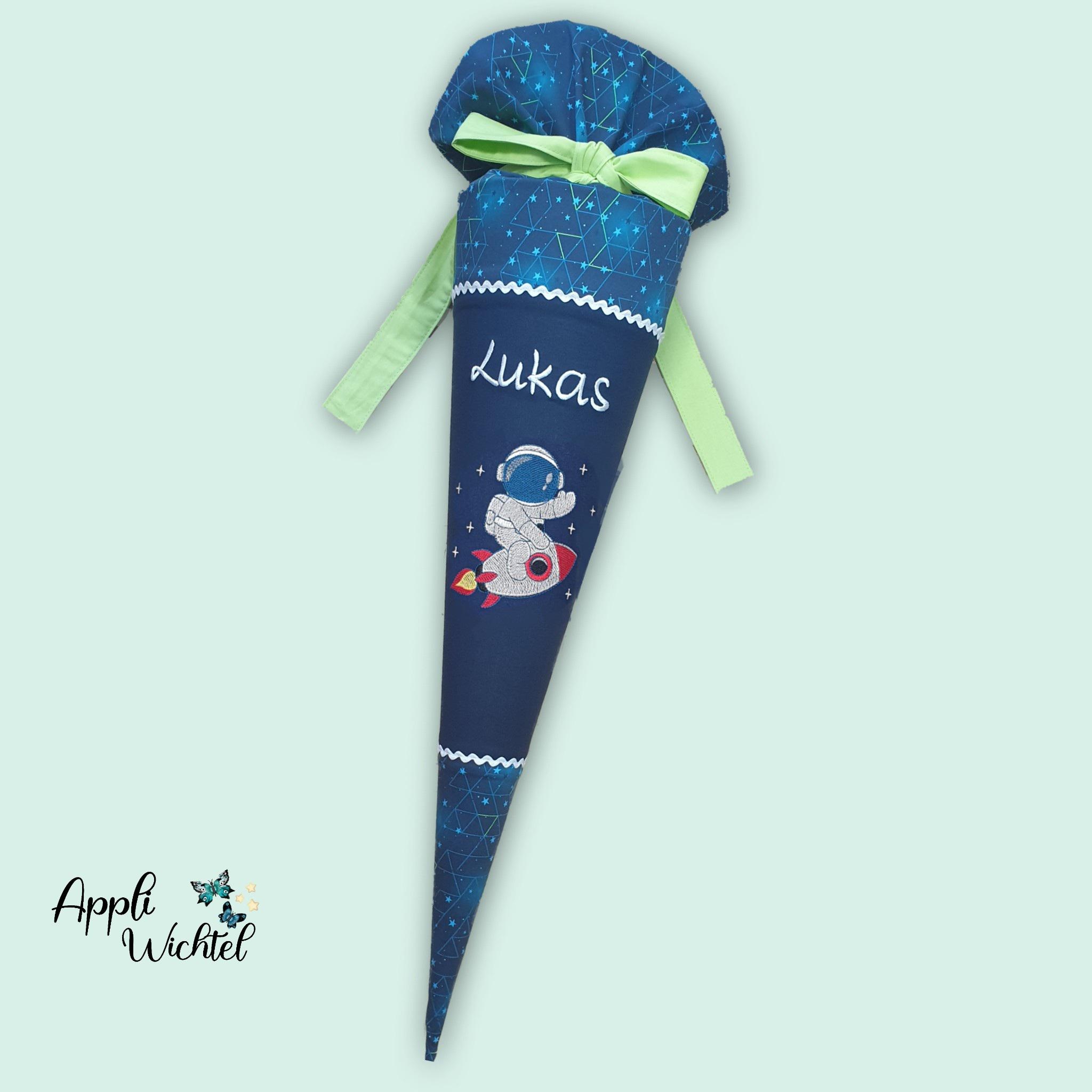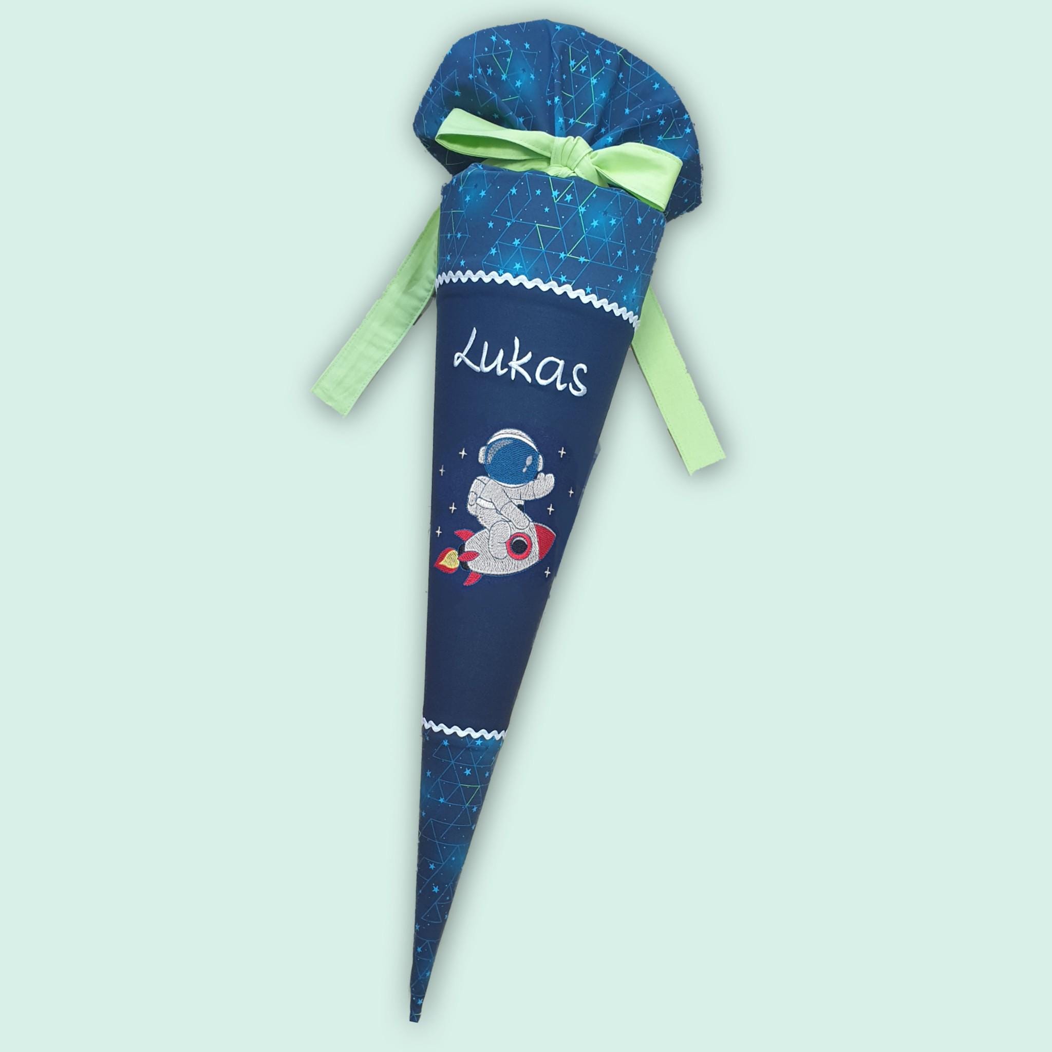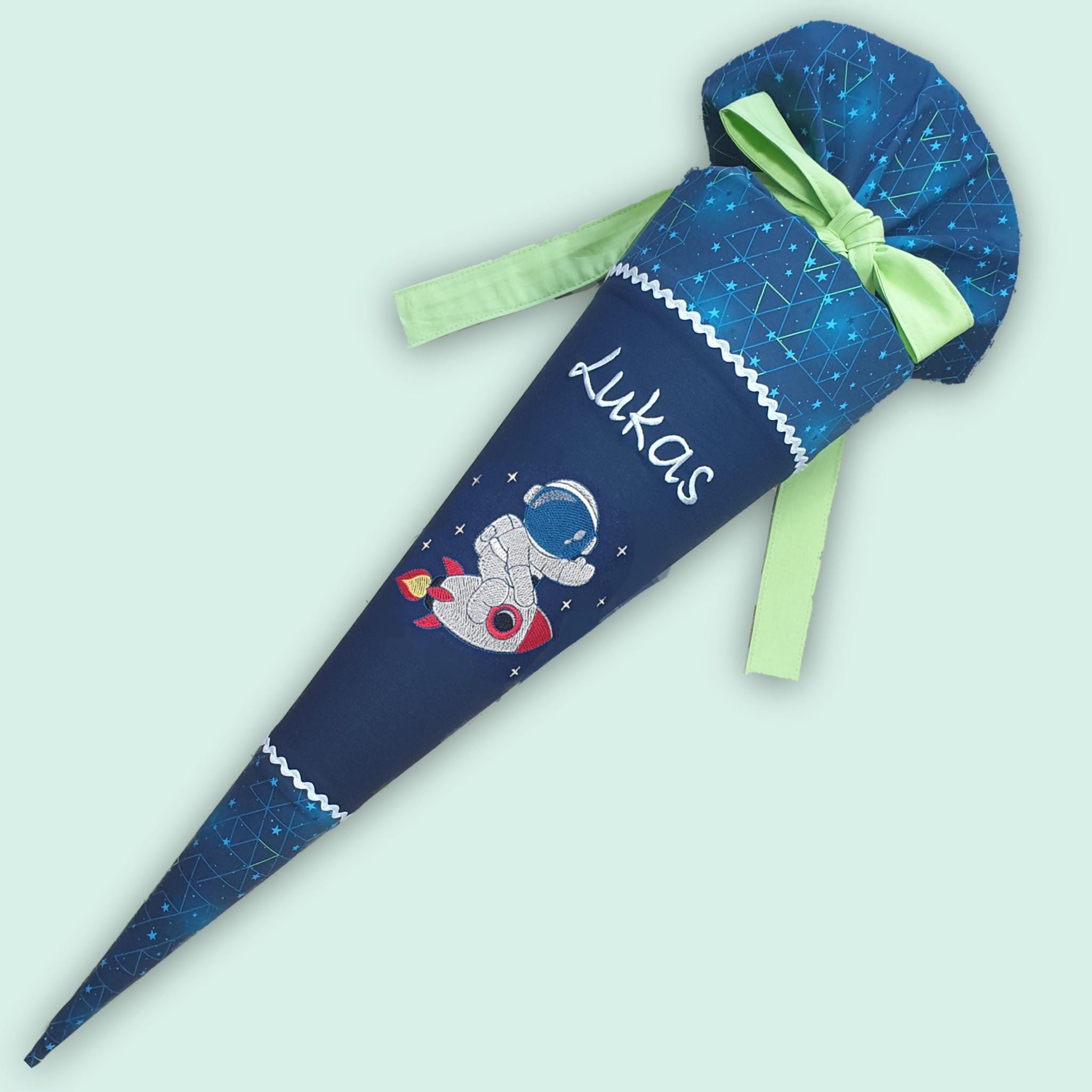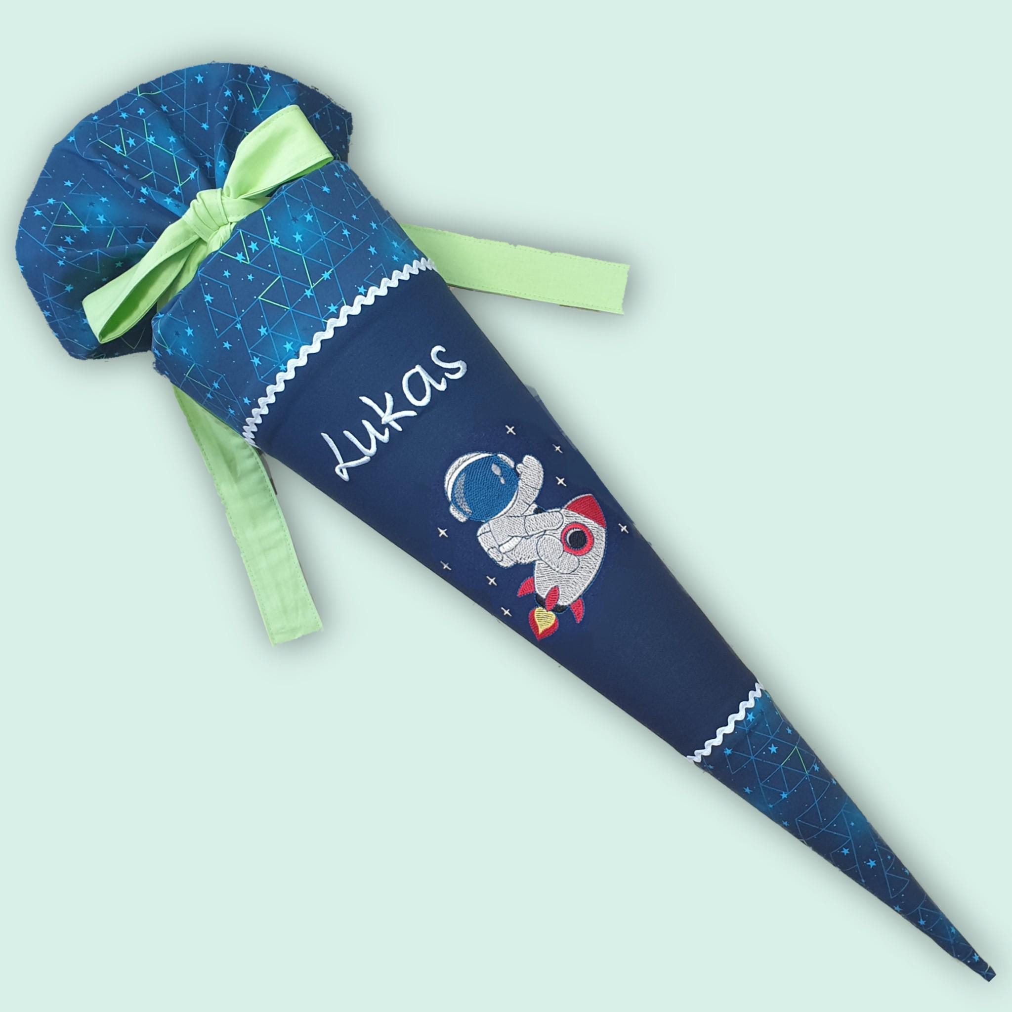 Schultüte mit, Astronaut, Raumschiff und Namen farblich auf den Step by Step Starship Galactus Schulranzen abgestimmt.