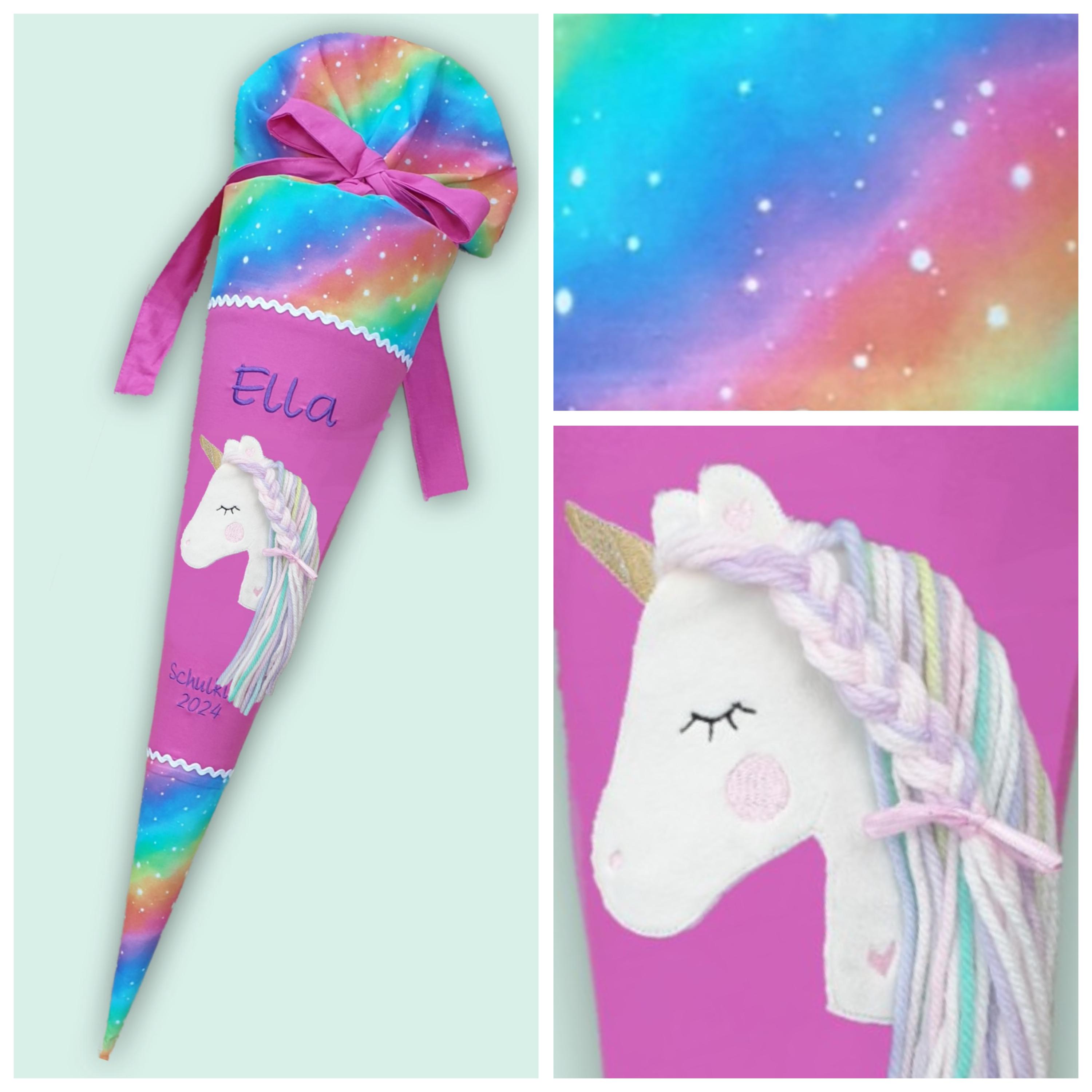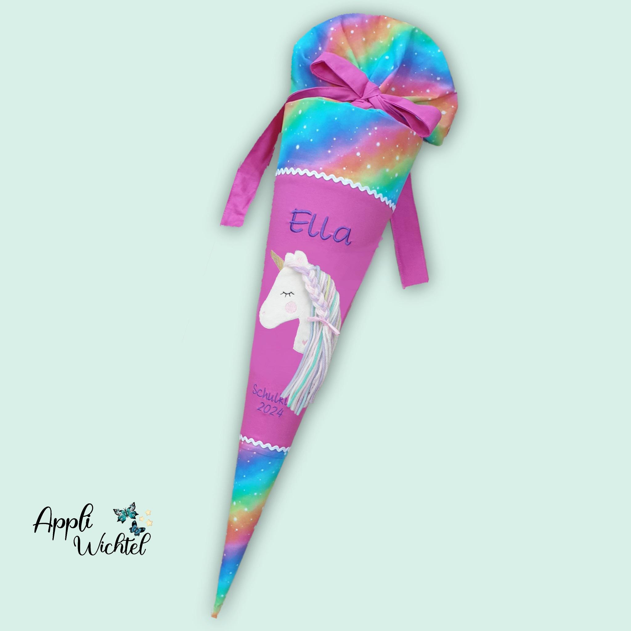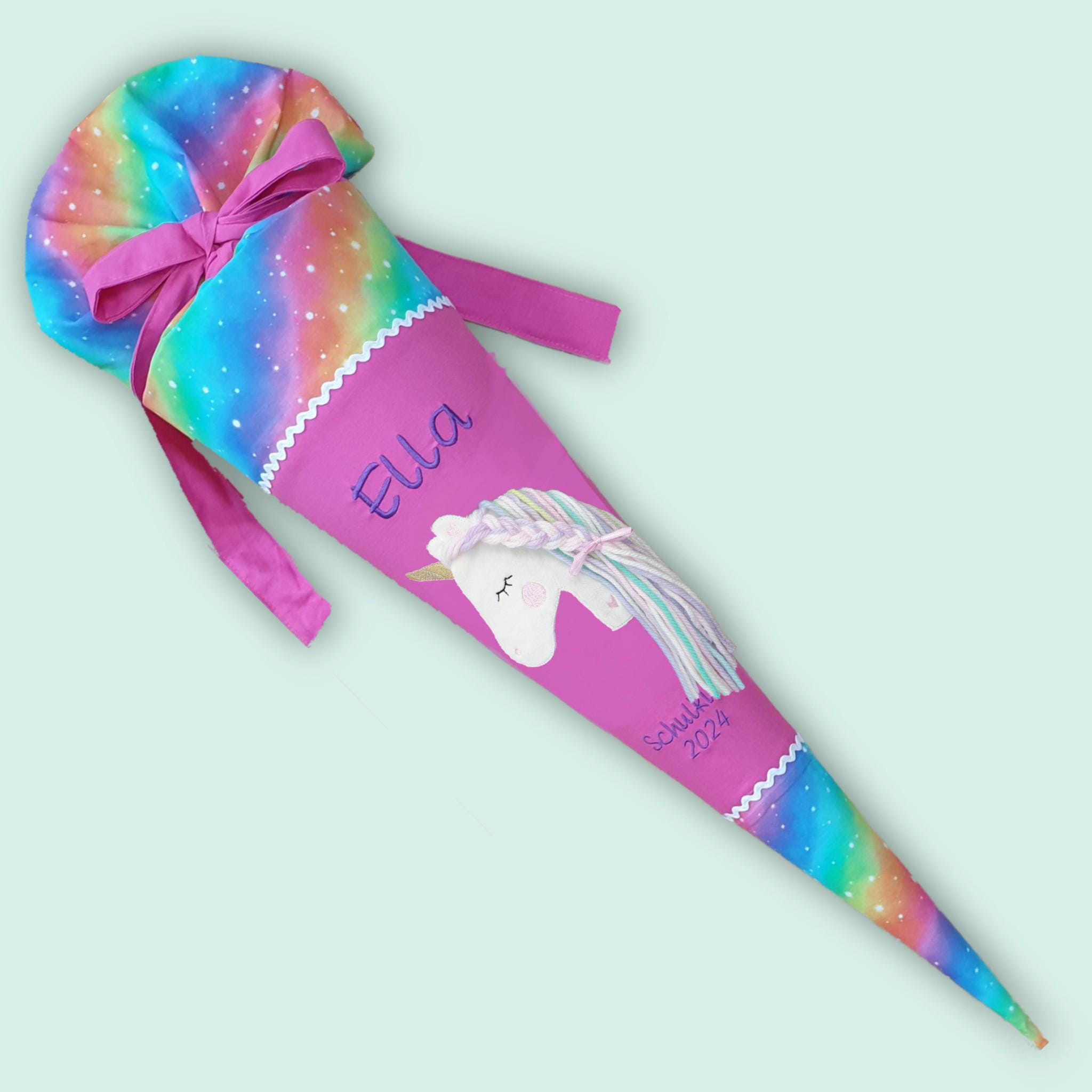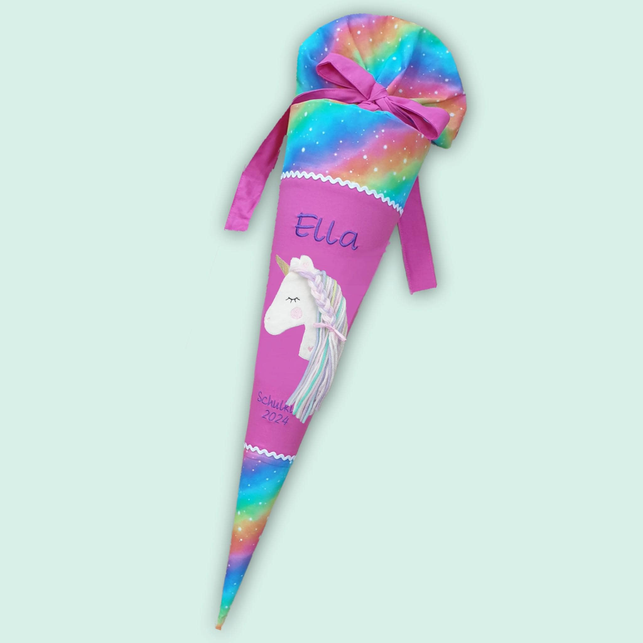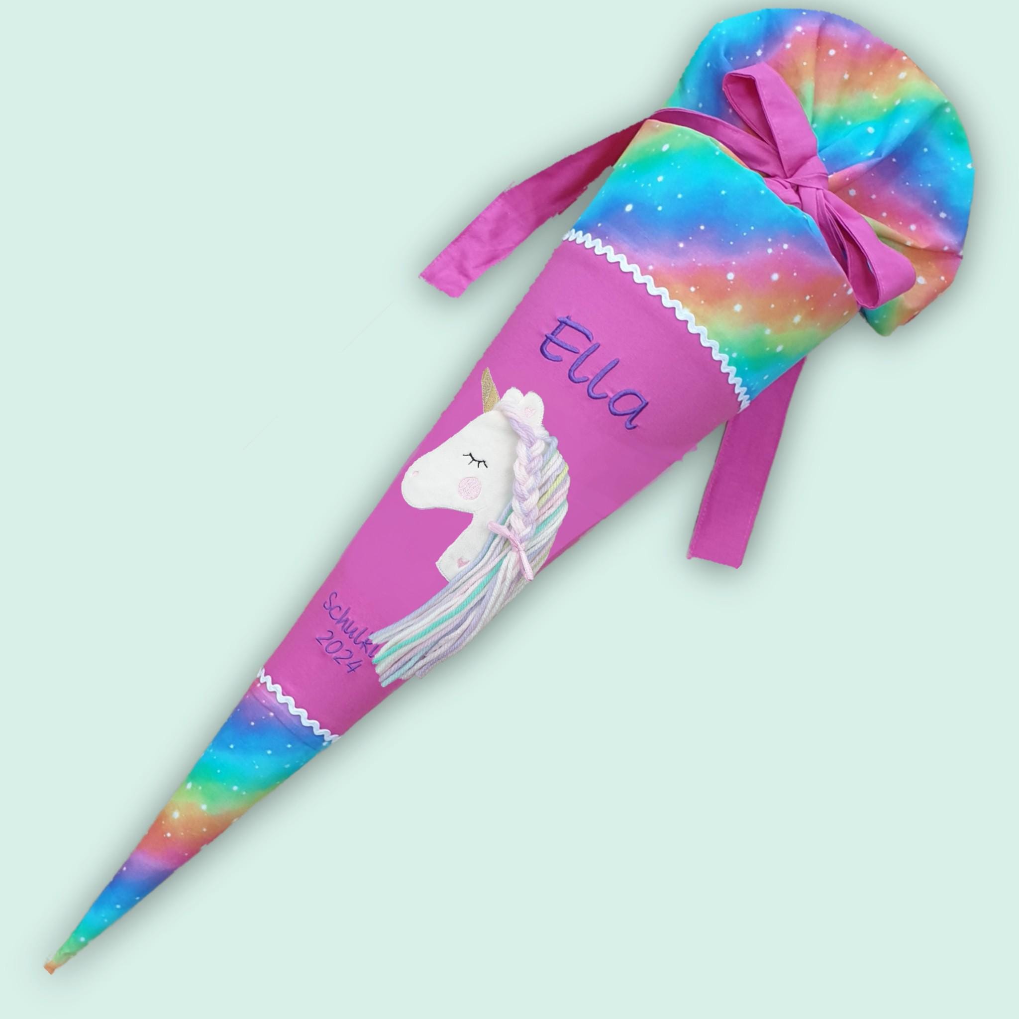 Schultüte mit Einhorn und Namen in Regenbogenfarben