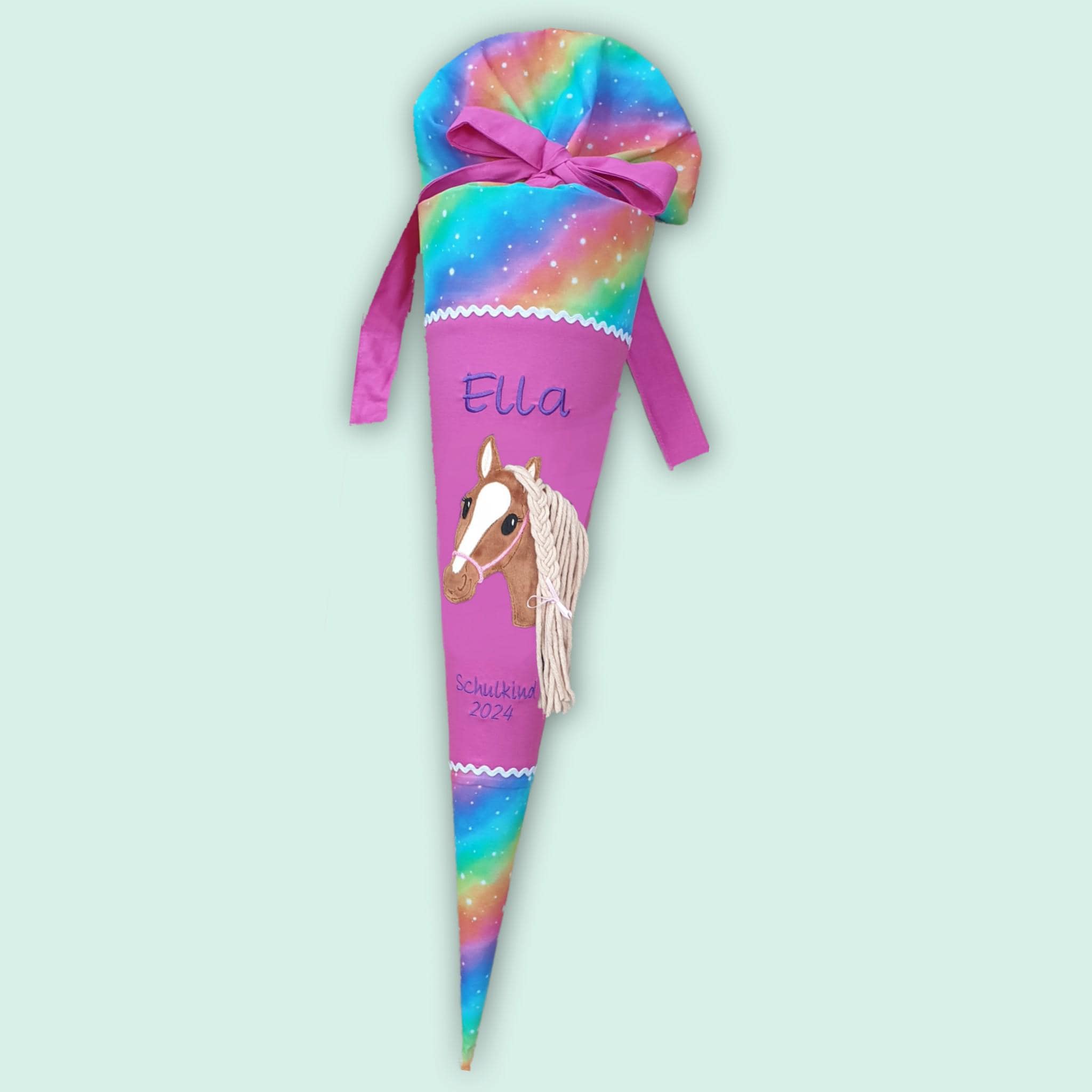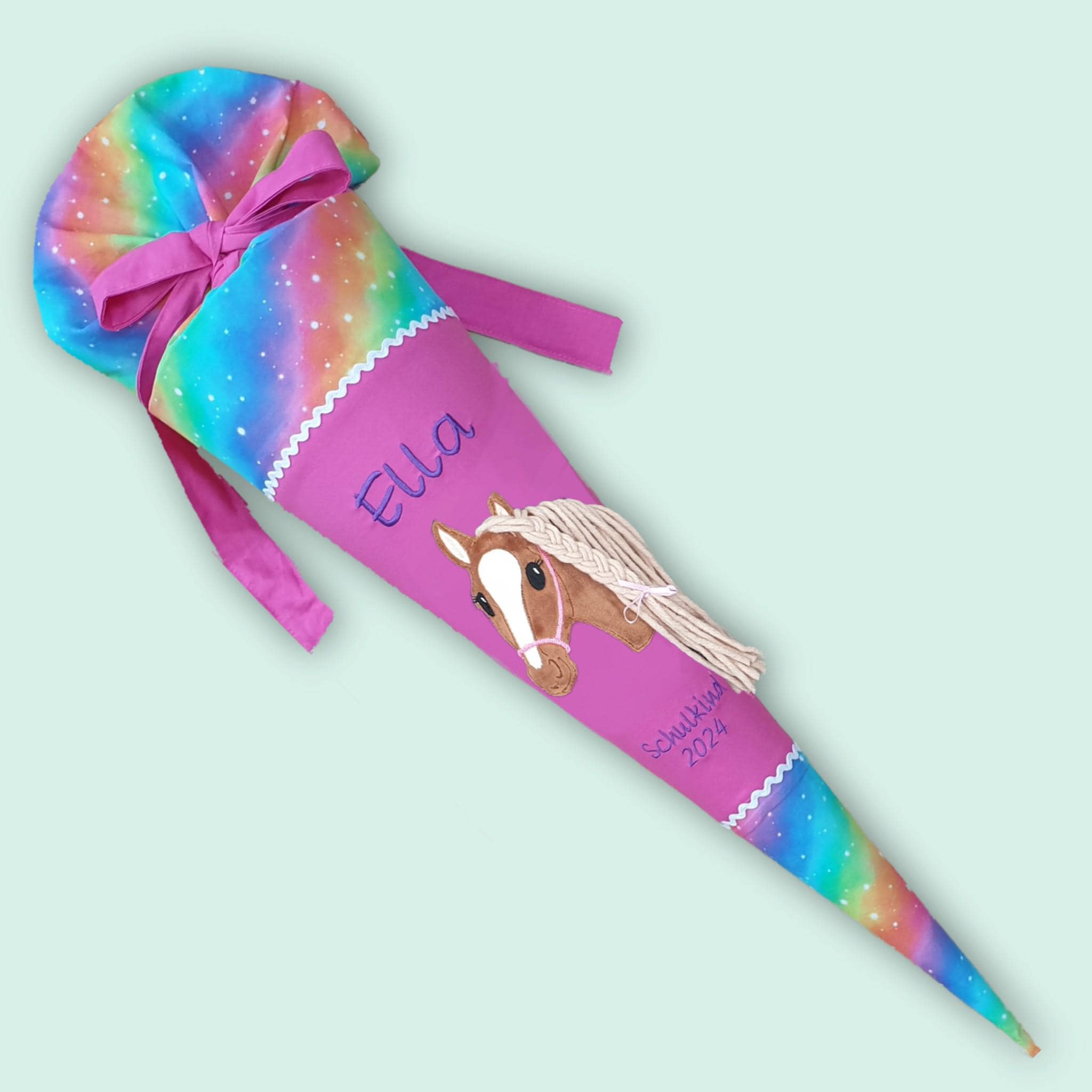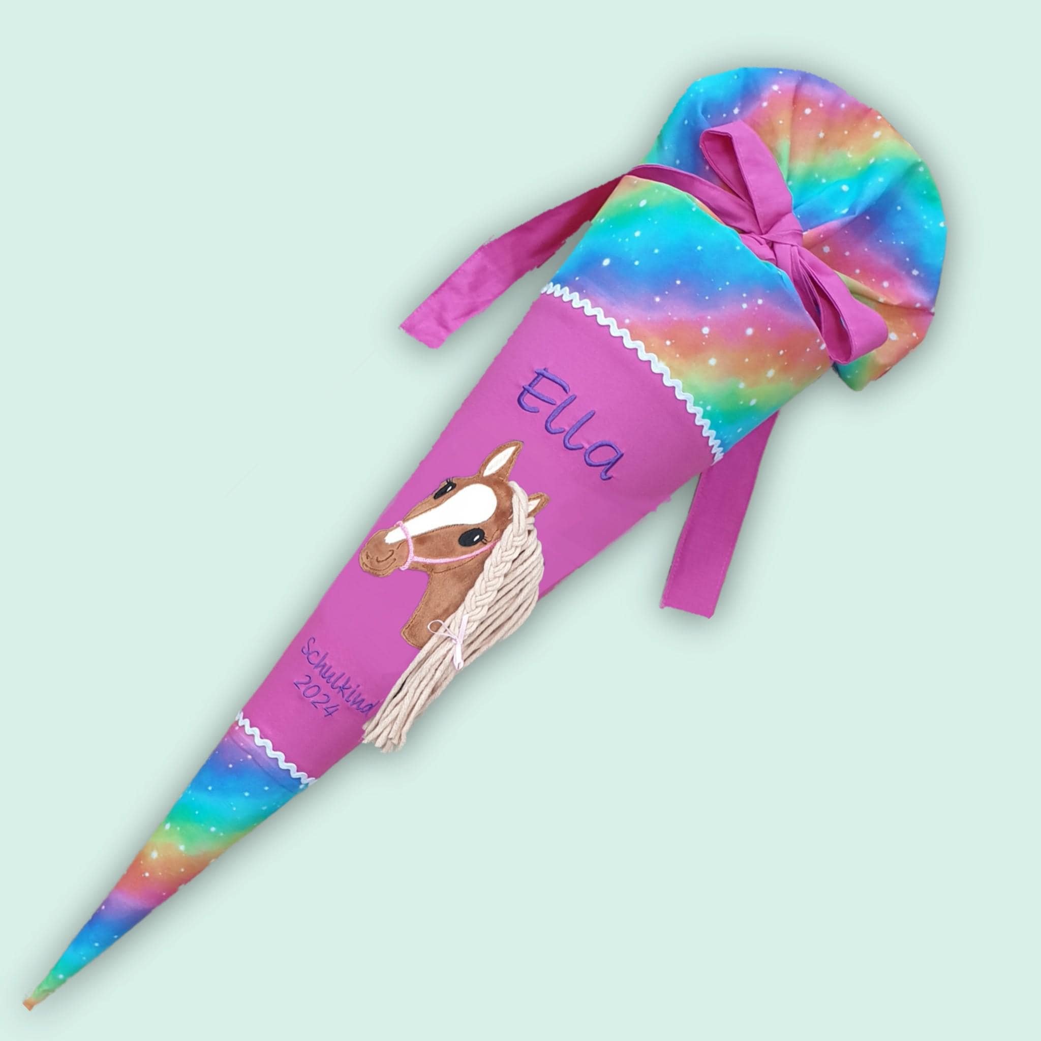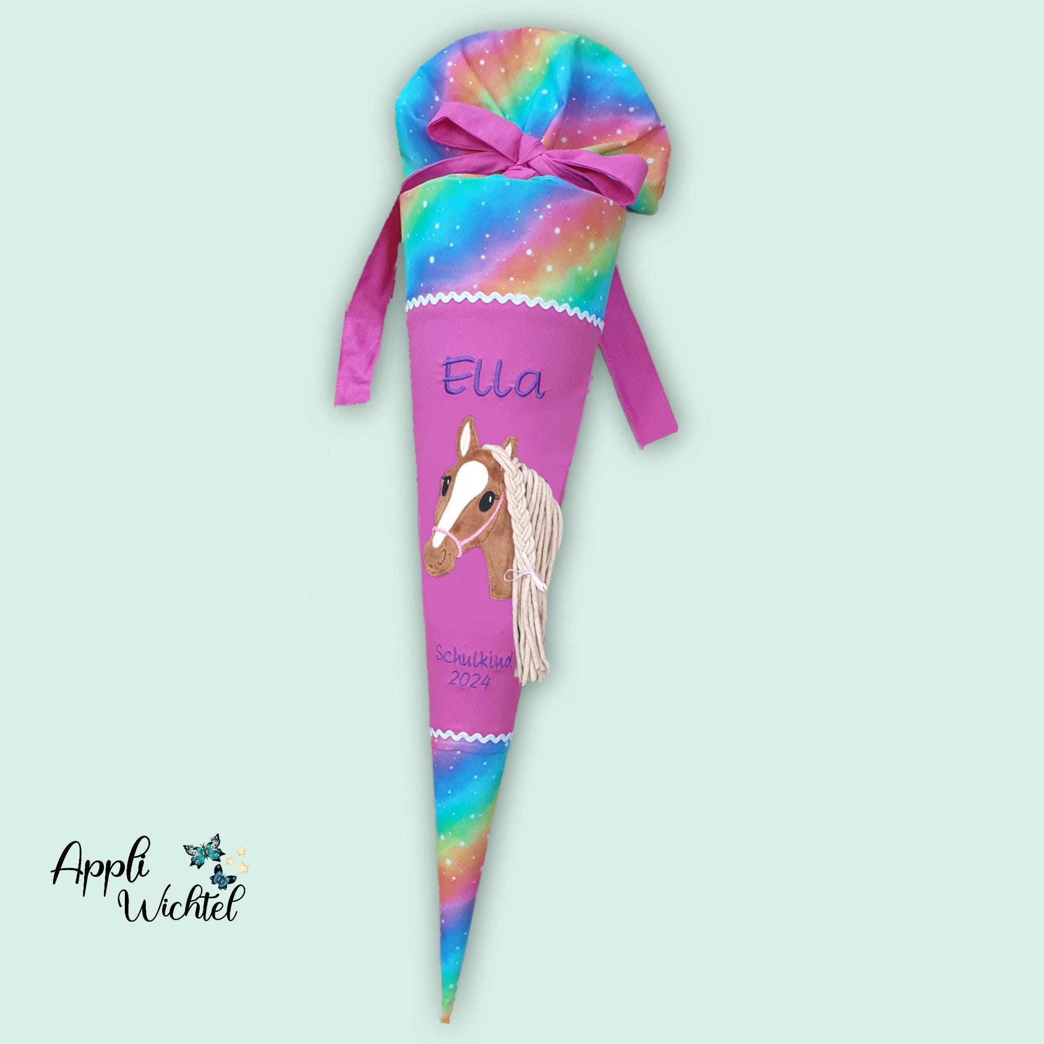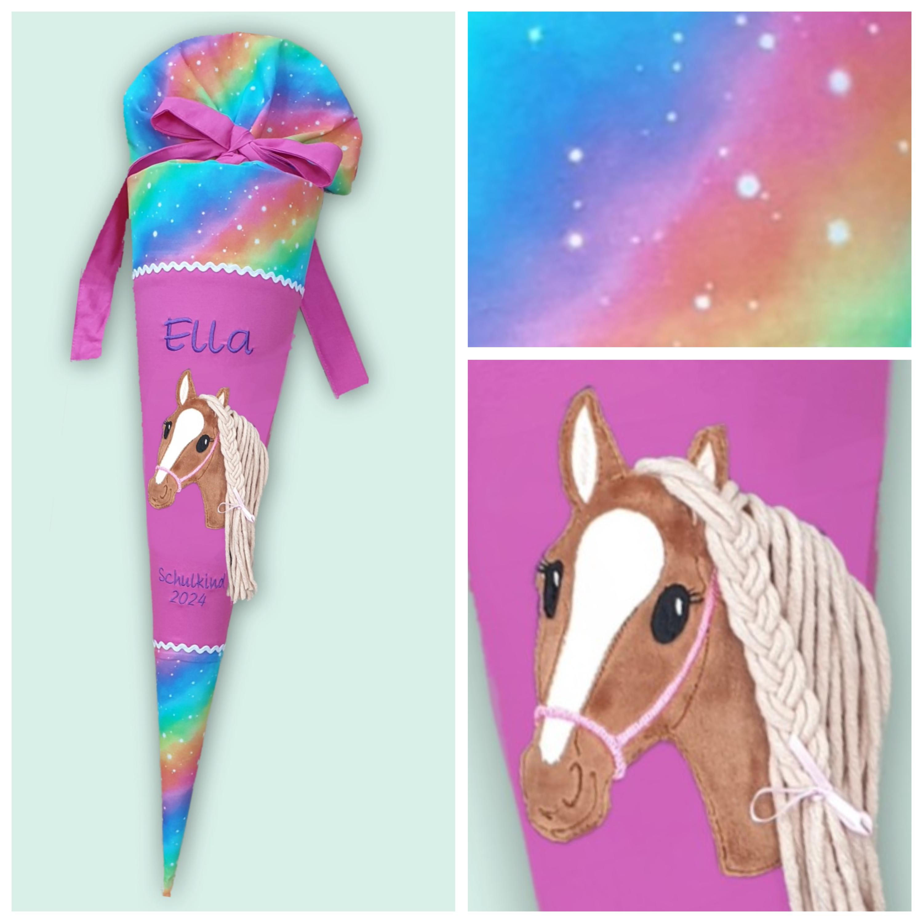 Schultüte mit Pferd und Namen in Regenbogenfarben