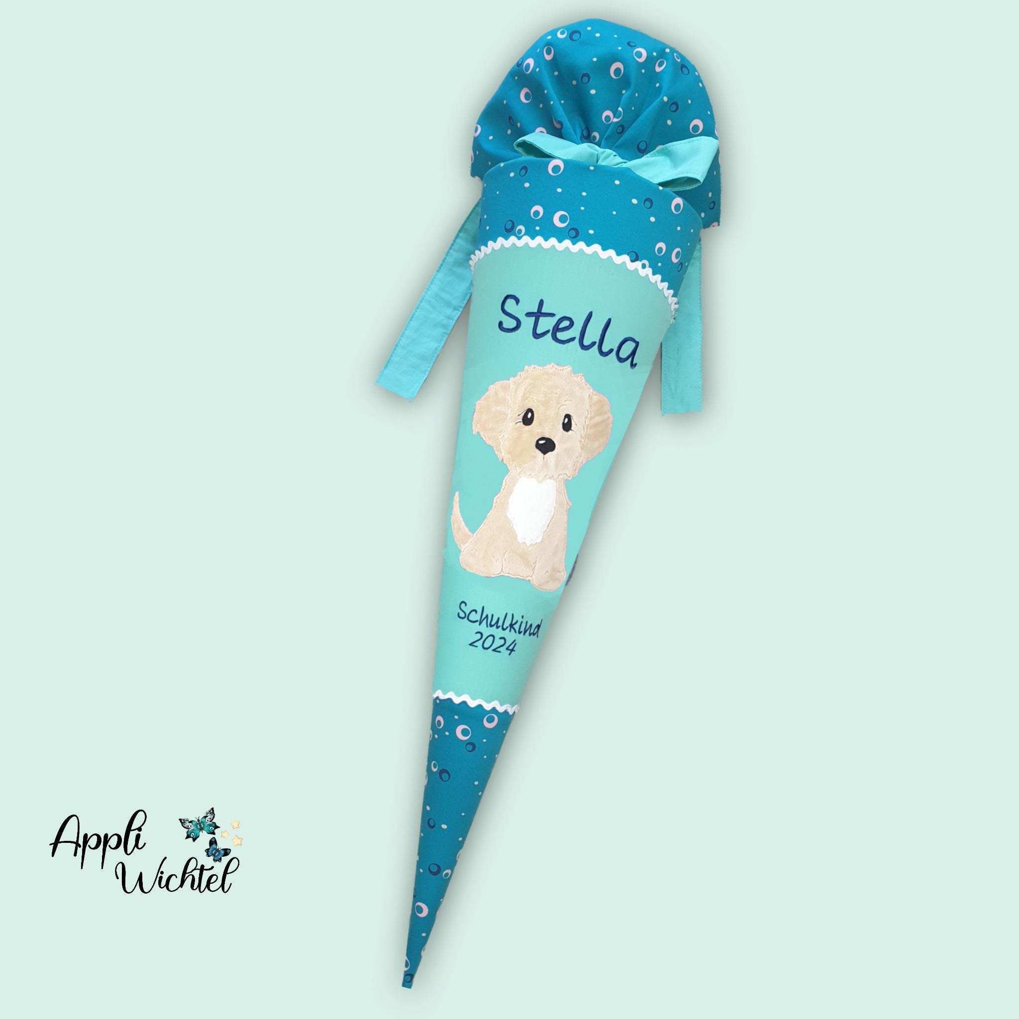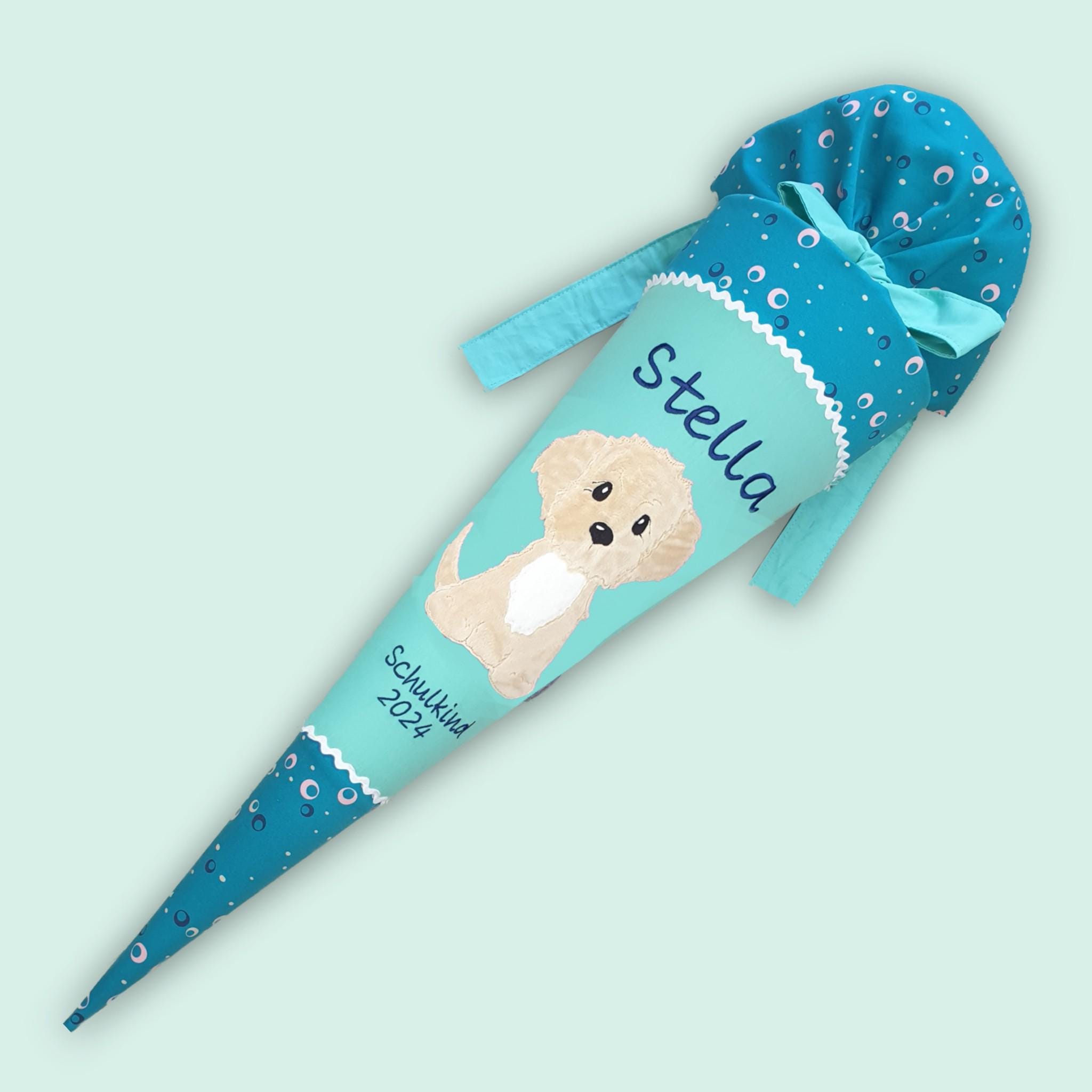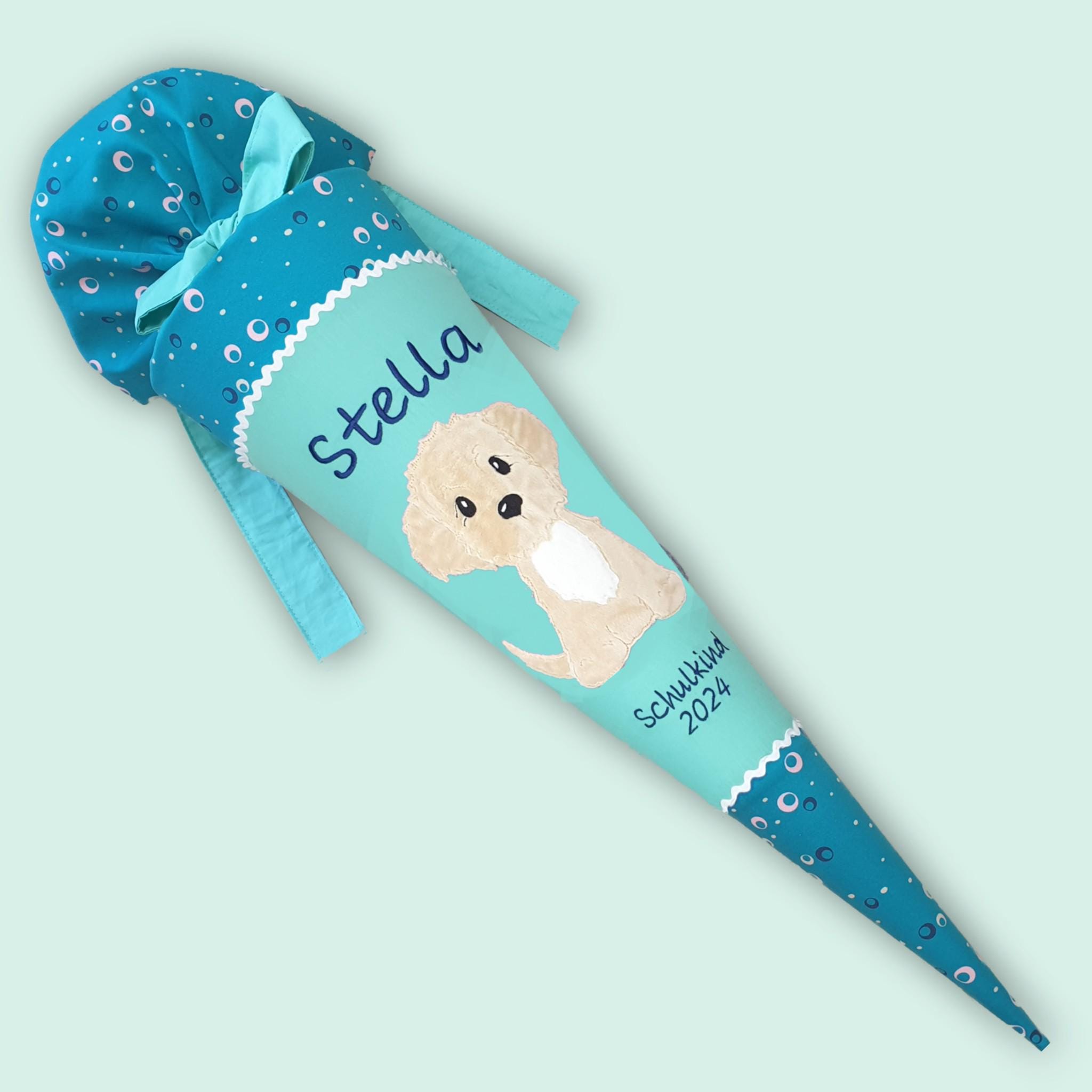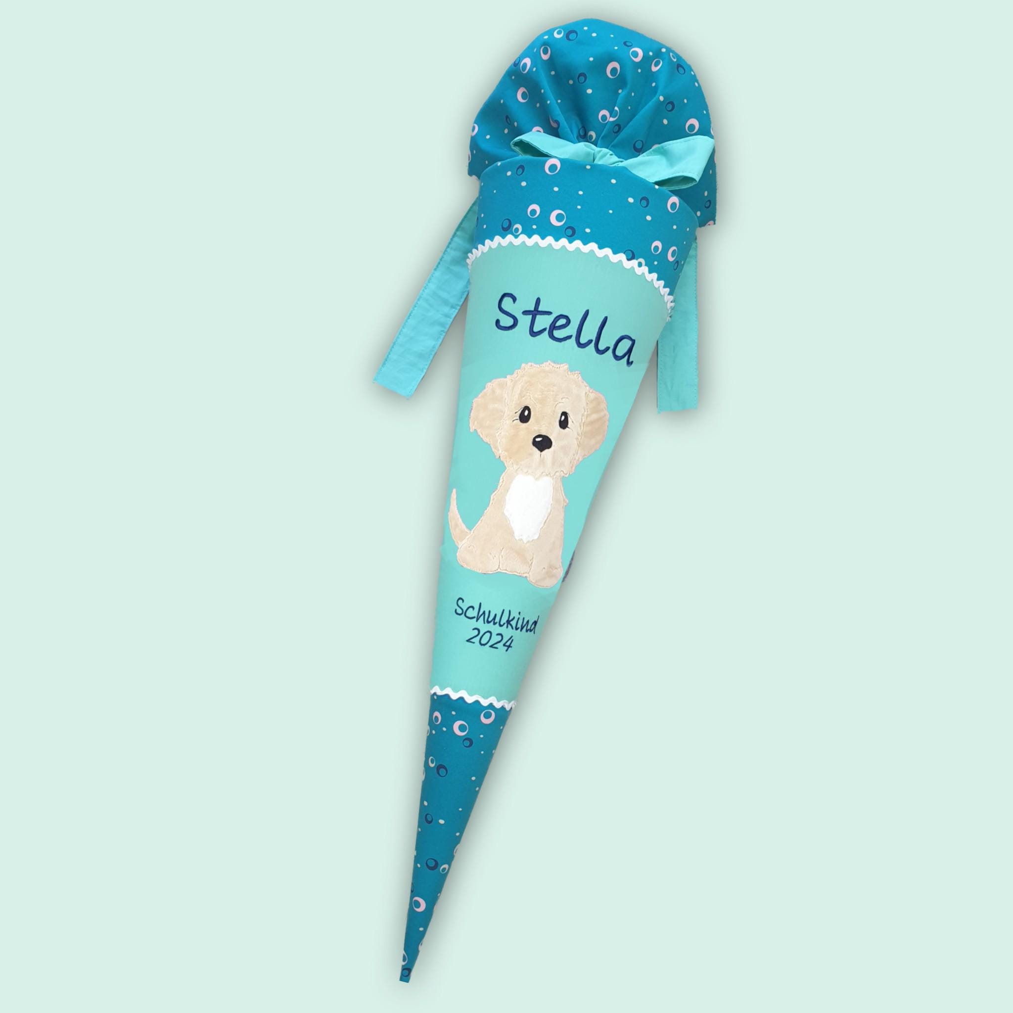 70 cm Schultüte oder 85 cm Schultüte mit Hund und Namen farblich auf den Dog Basty Schulranzen abgestimmt.