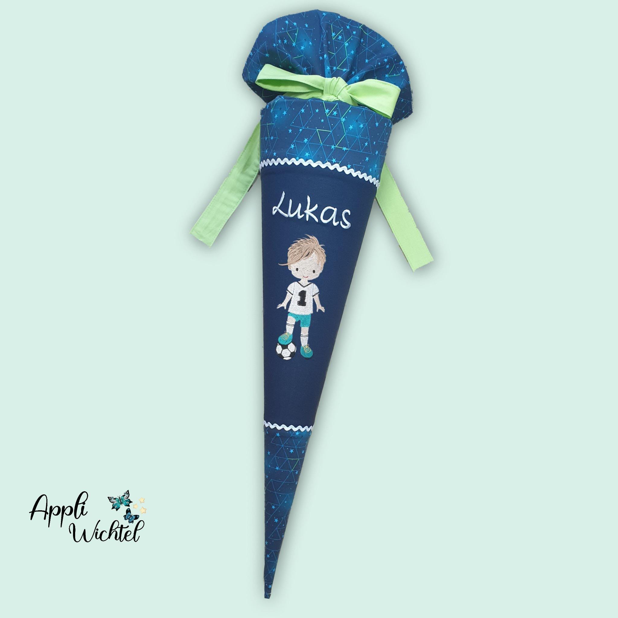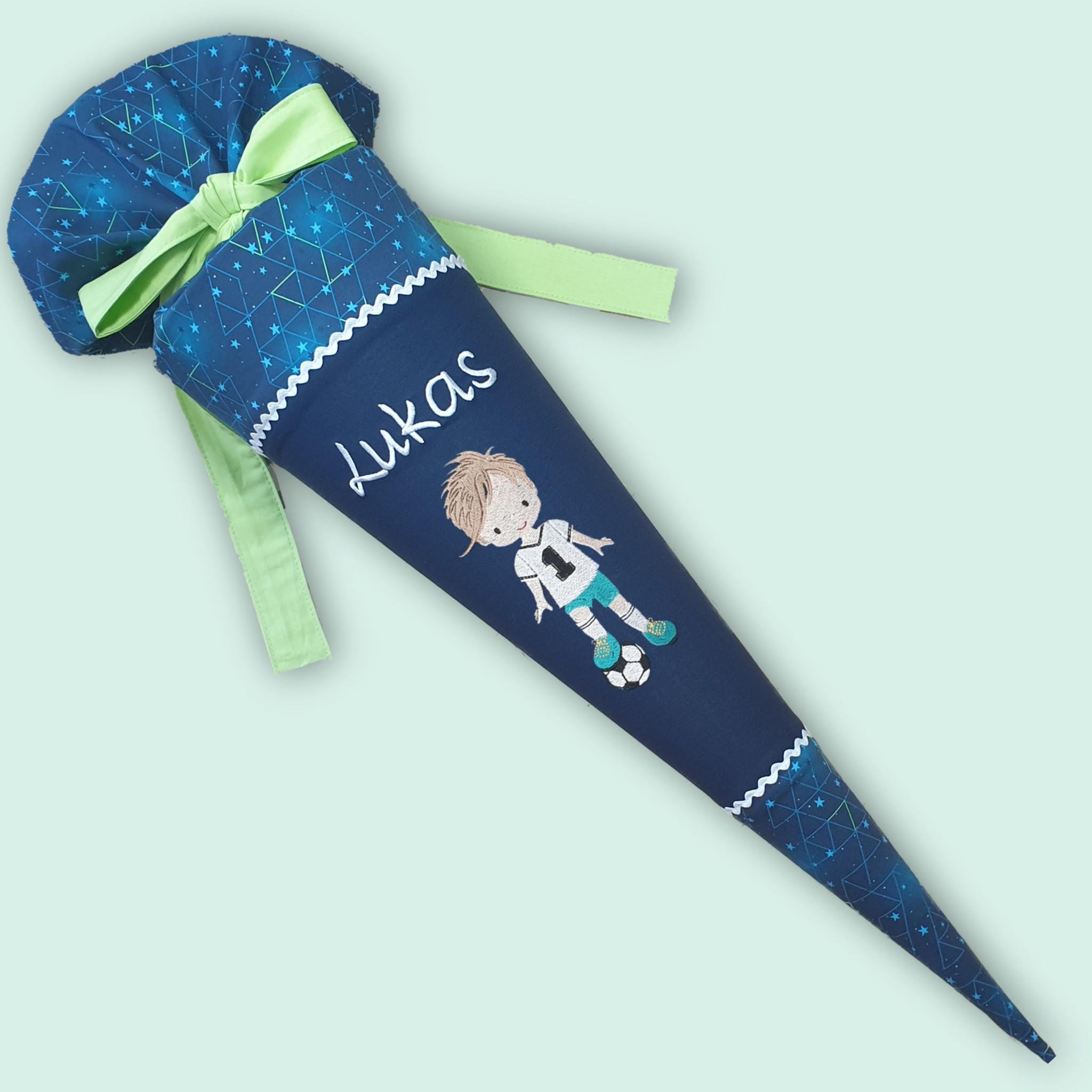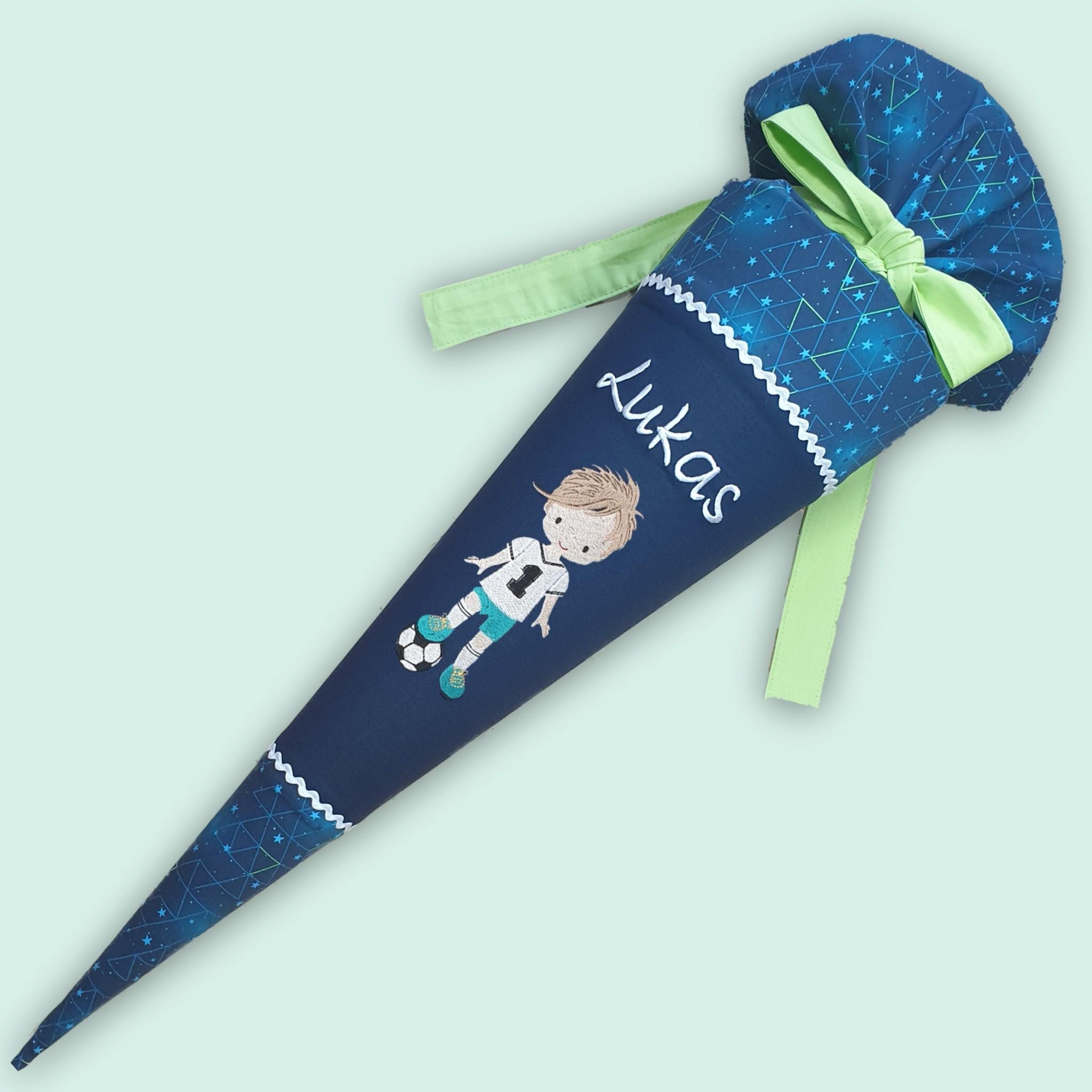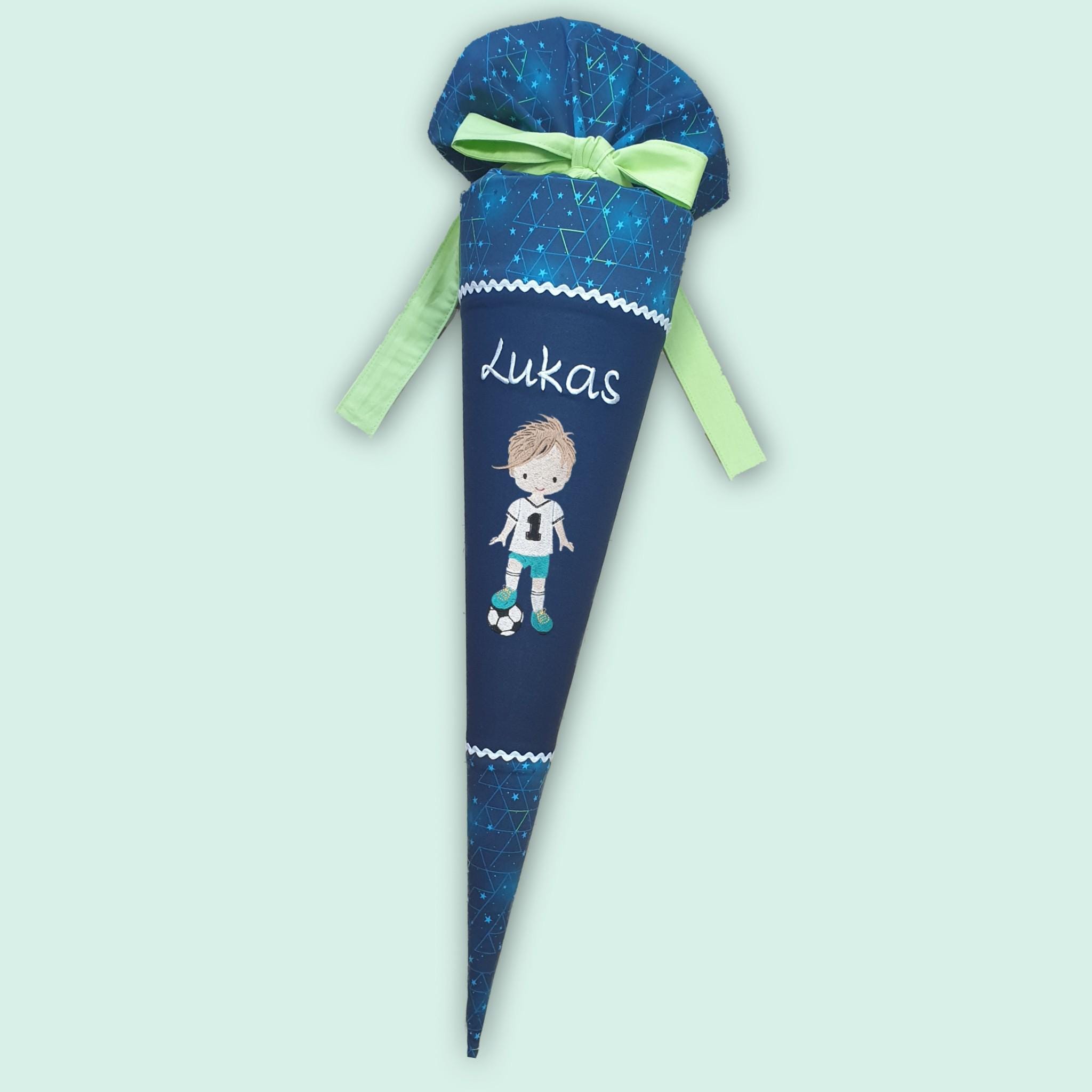 Schultüte mit Fussballer und Namen farblich auf den Step by Step Starship Galactus Schulranzen abgestimmt.