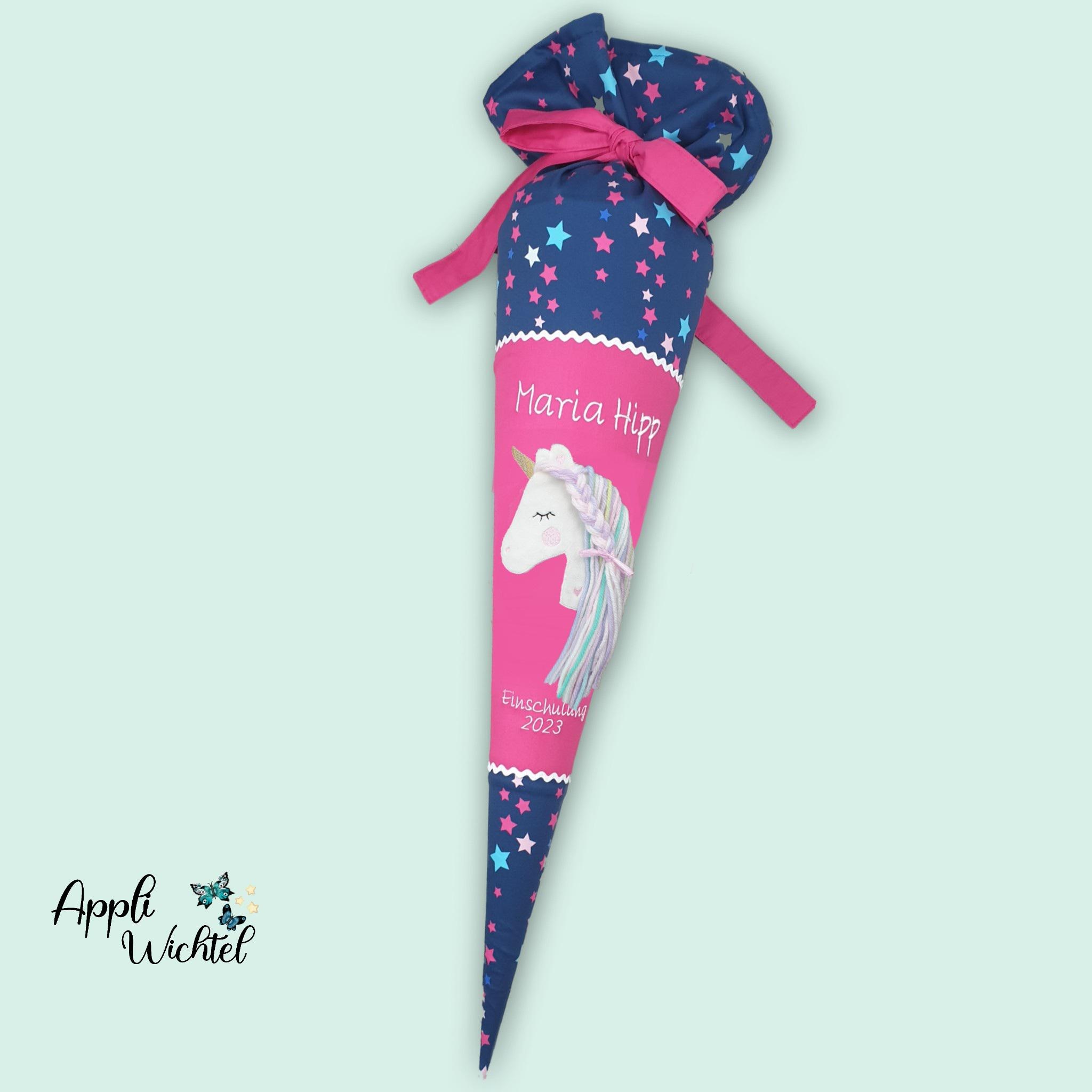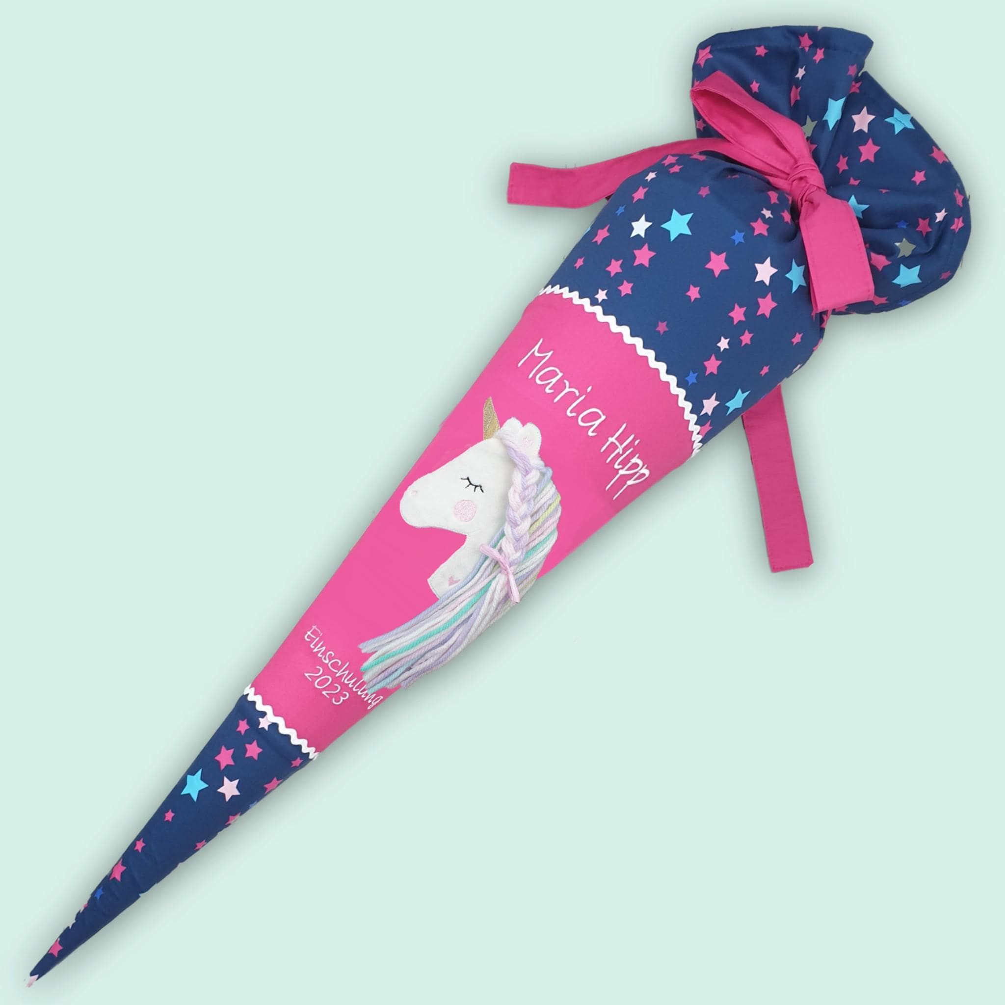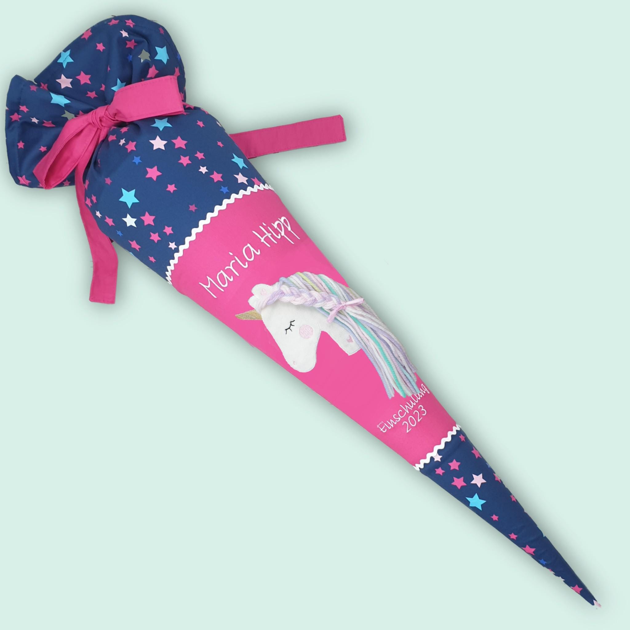 Schultüte mit Einhorn und Namen farblich auf den Leni Schulranzen abgestimmt.