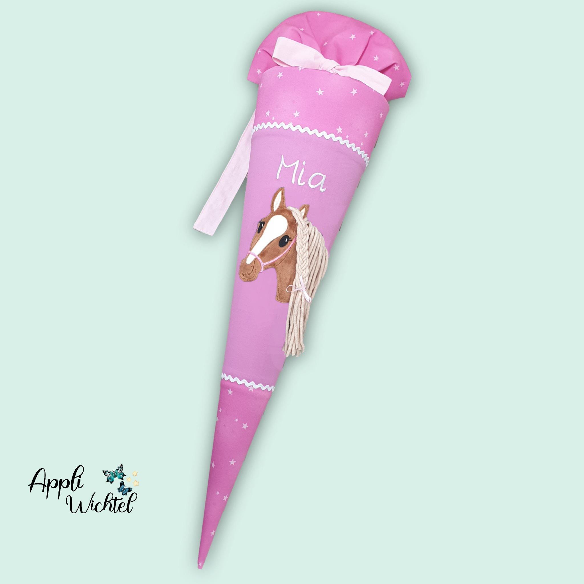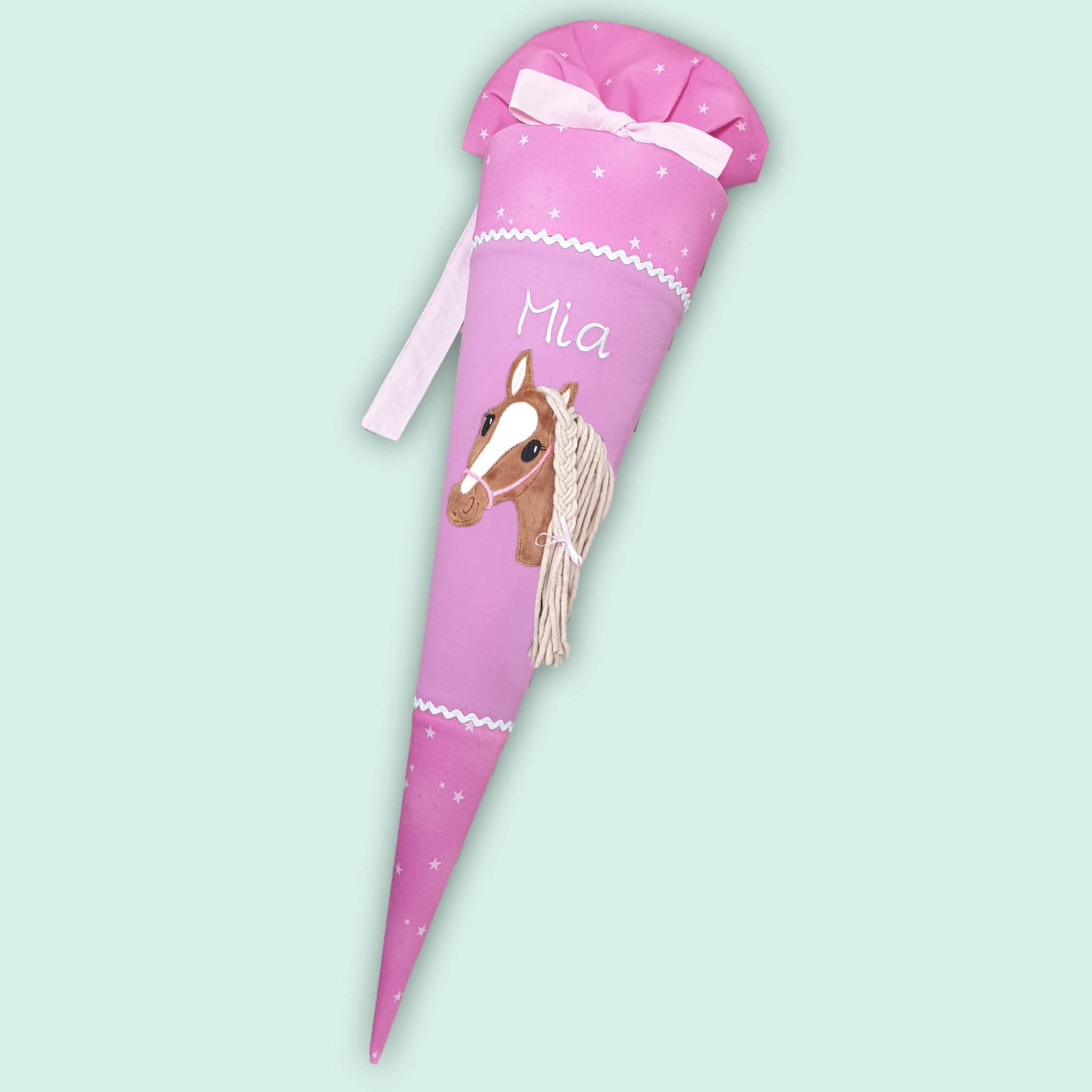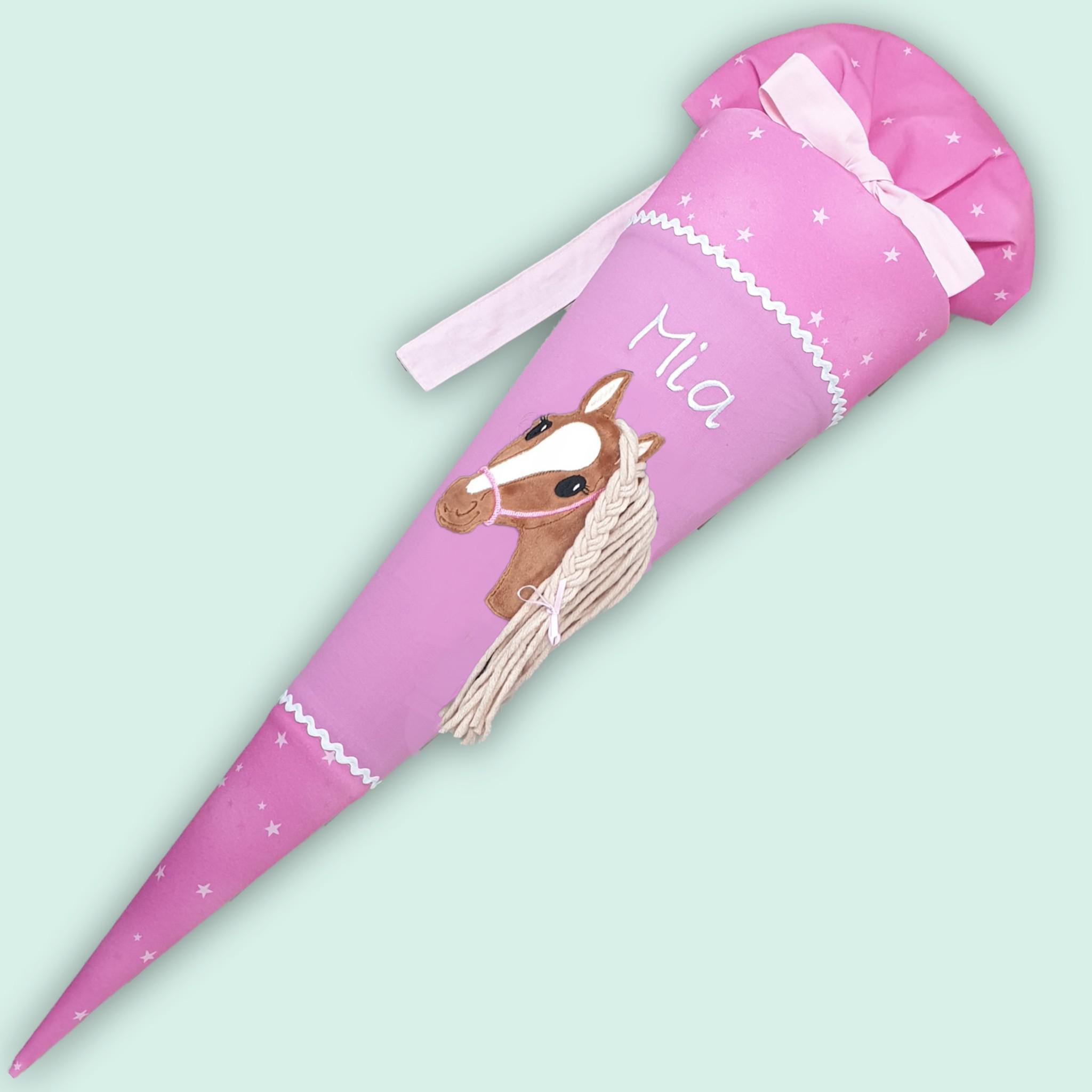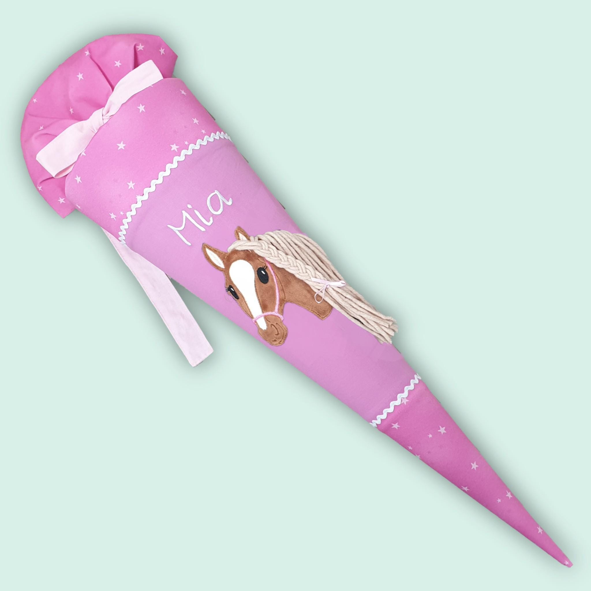 Schultüte mit Pferd und Namen farblich auf den Wolkenzaubär Schulranzen abgestimmt.