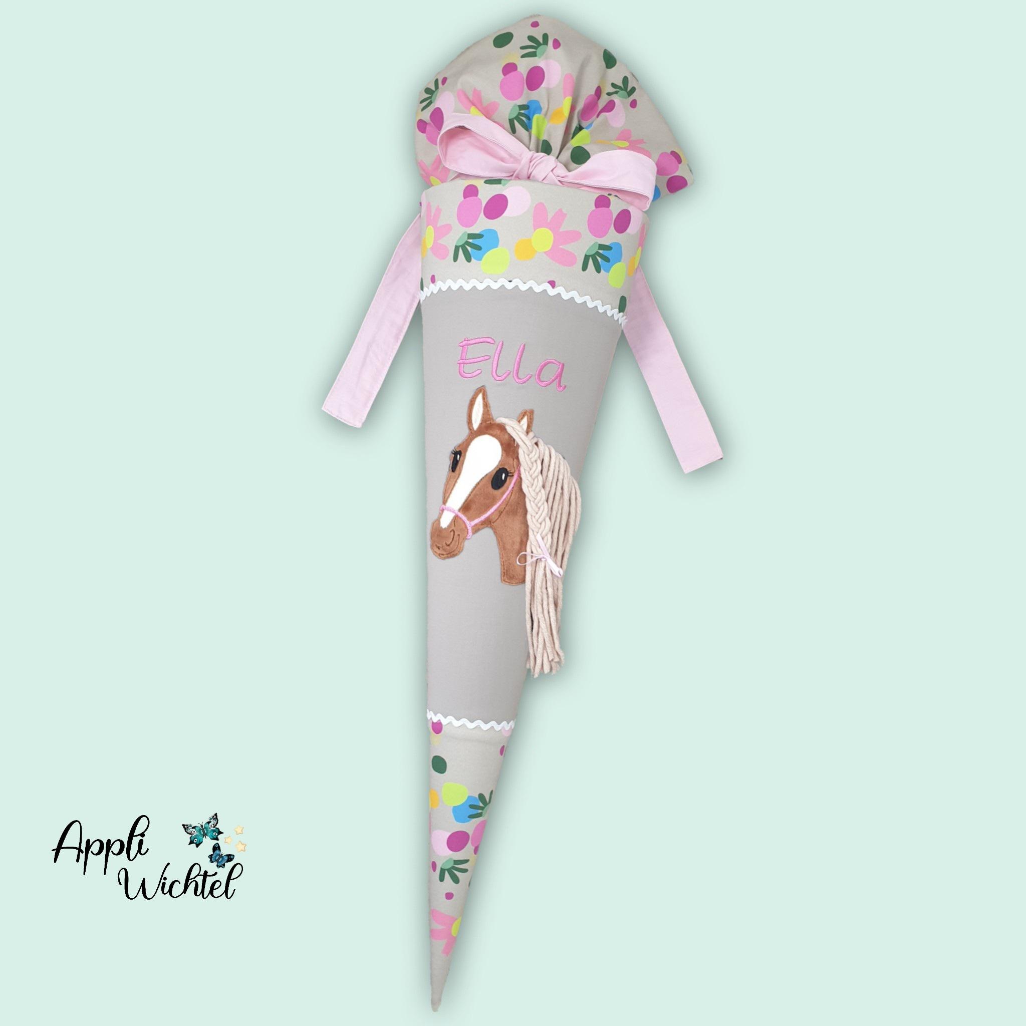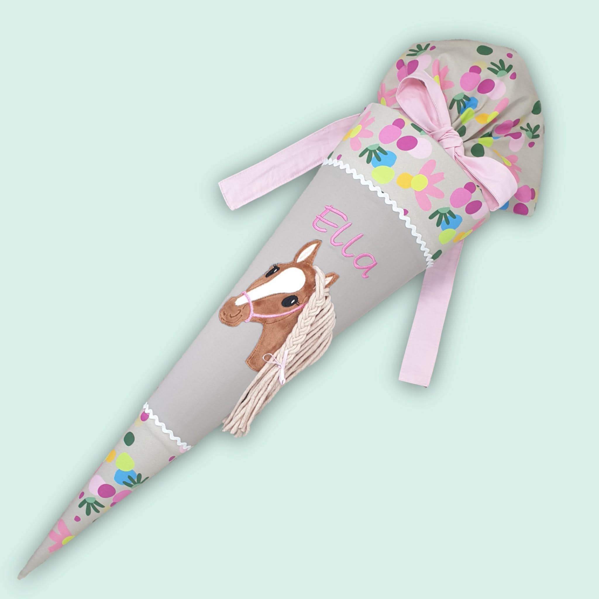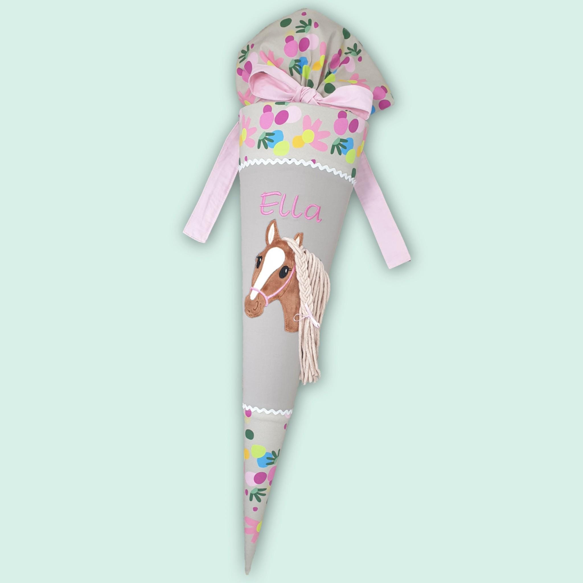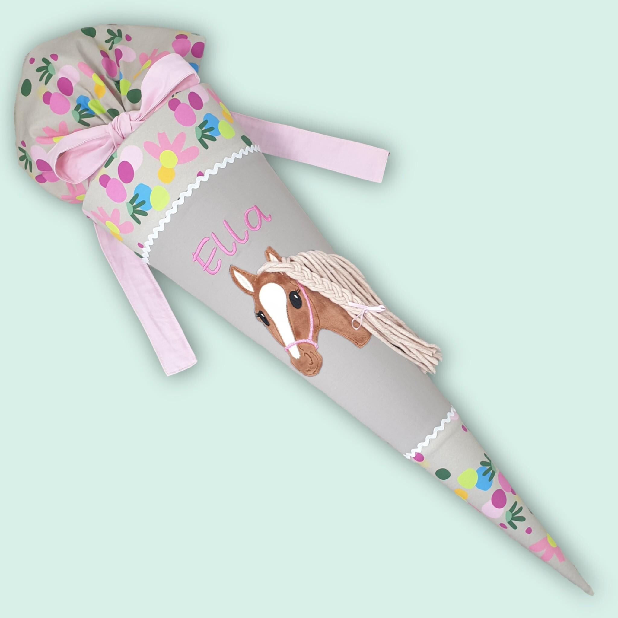Schultüte mit Pferd und Namen farblich auf den Flower Powbär Schulranzen abgestimmt.