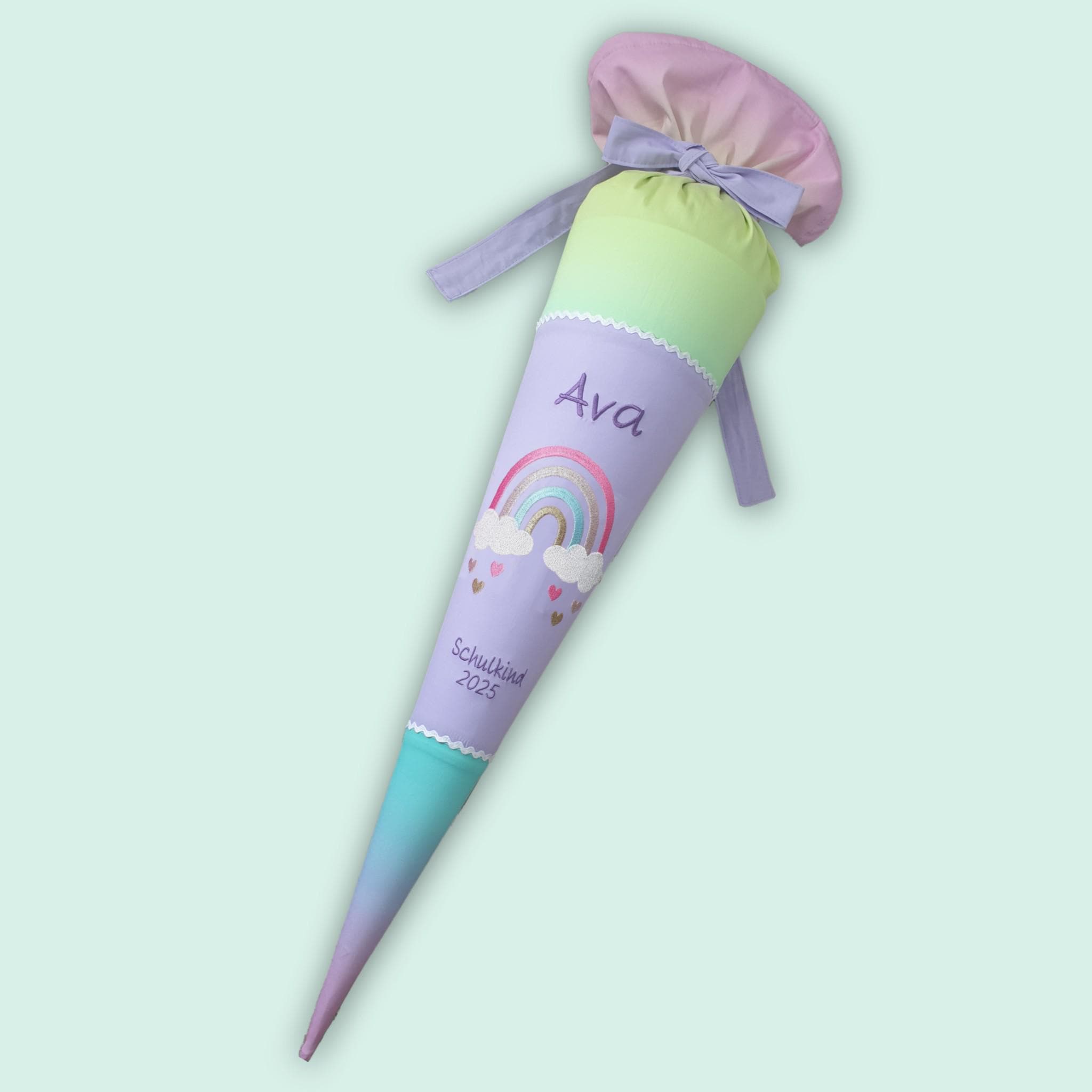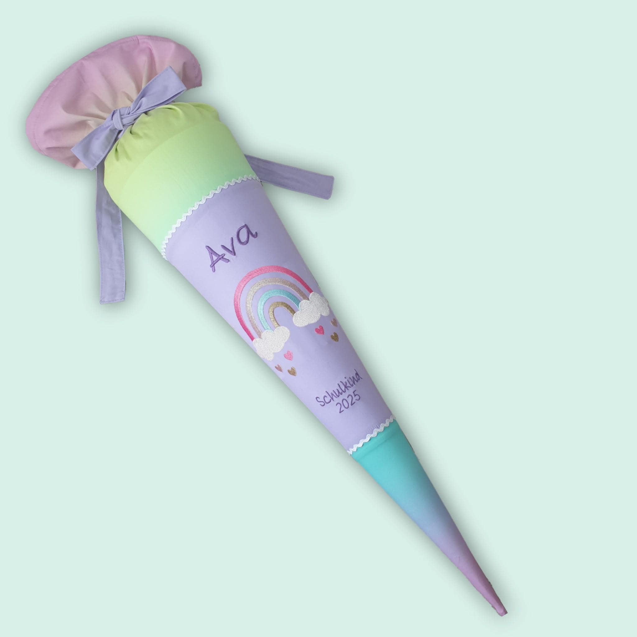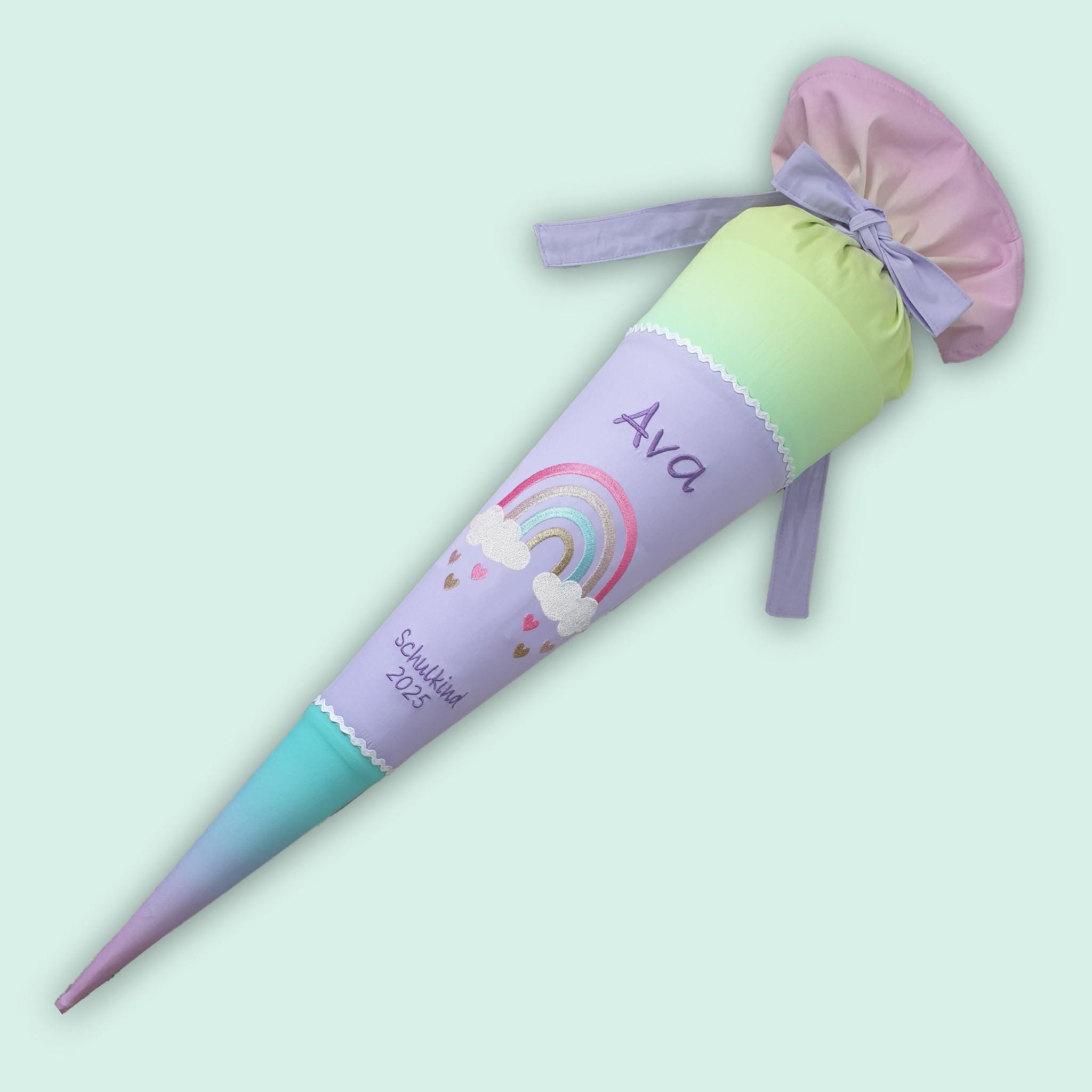 Schultüte mit Regenbogen und Namen farblich auf den Ergobag Zaubärwelt Schulranzen abgestimmt.