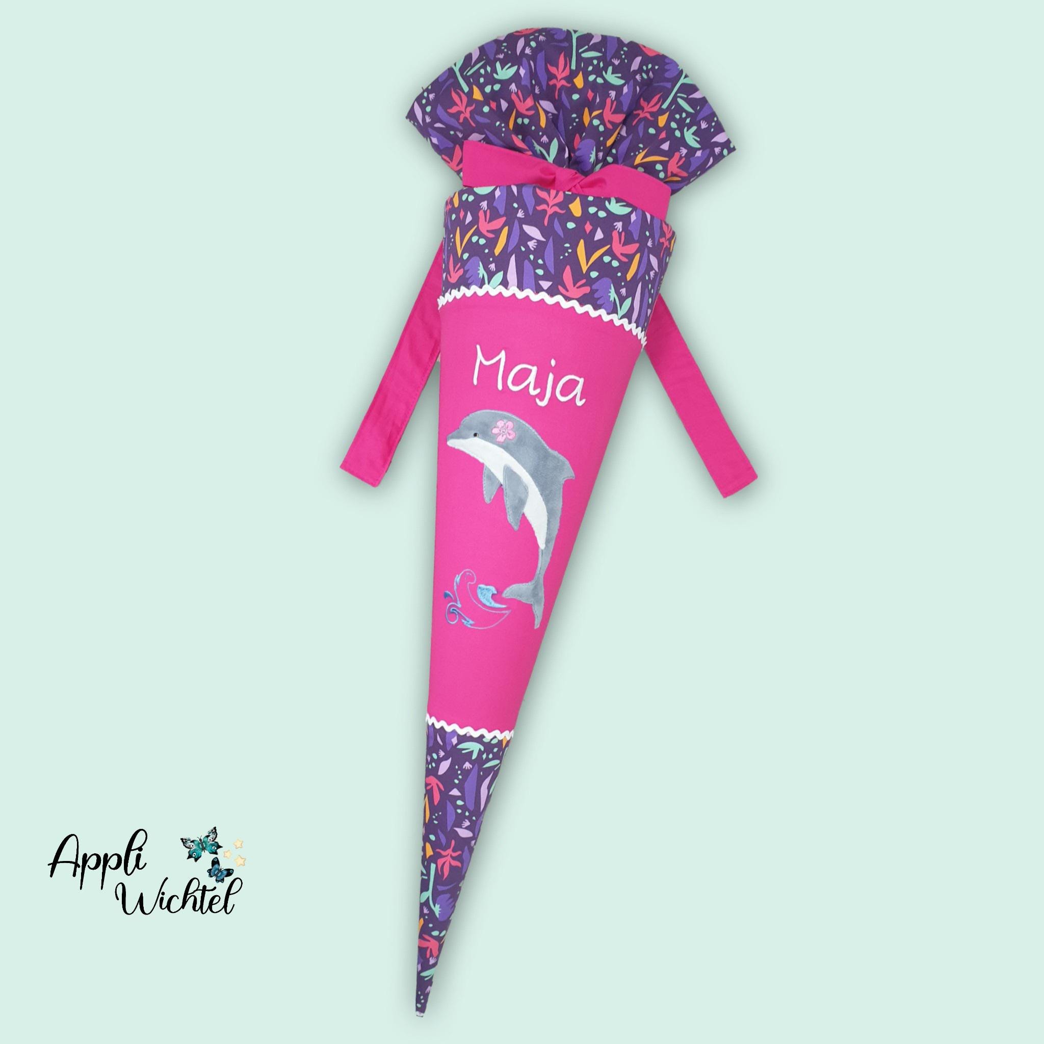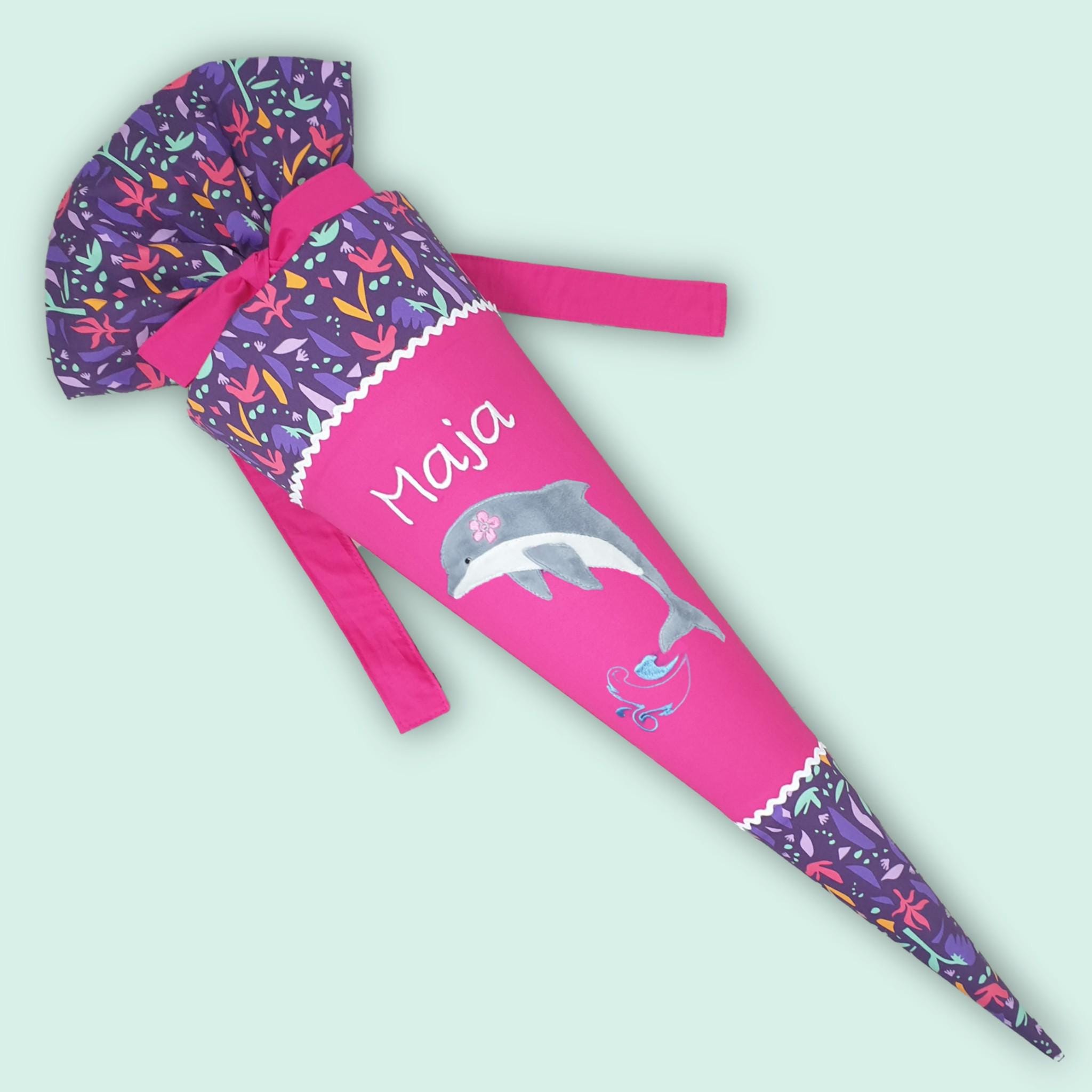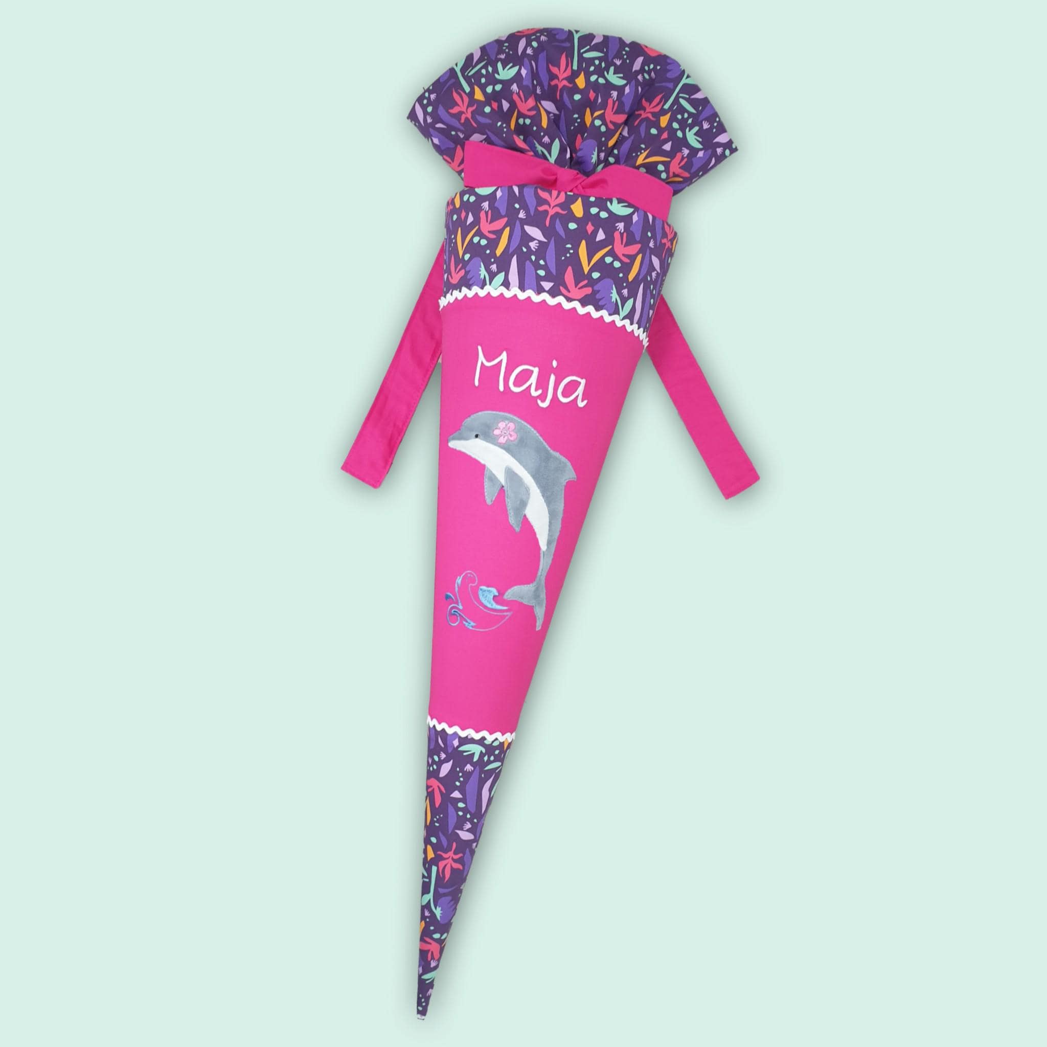 Schultüte mit Delfin und Namen farblich auf den Ambärzonas Schulranzen abgestimmt.