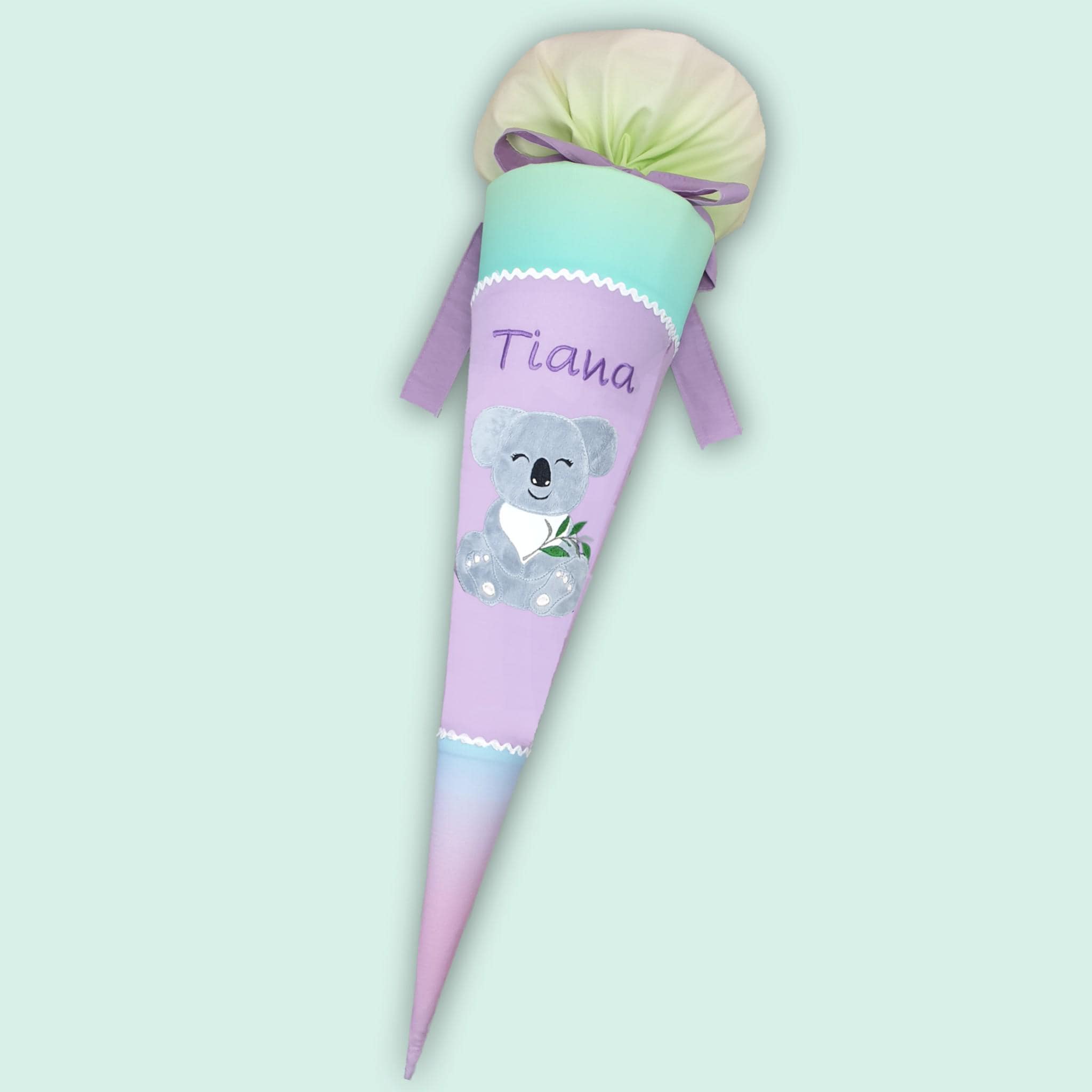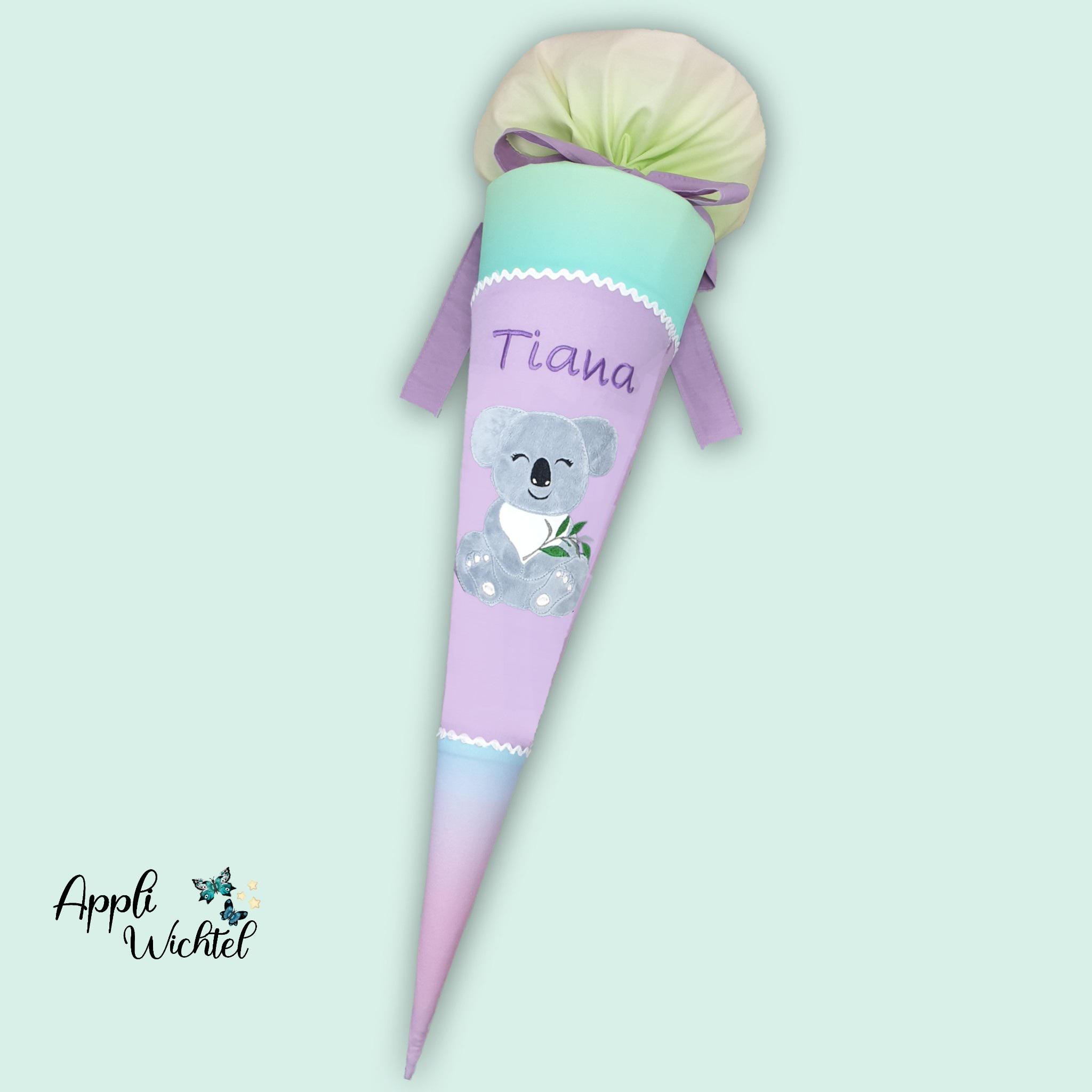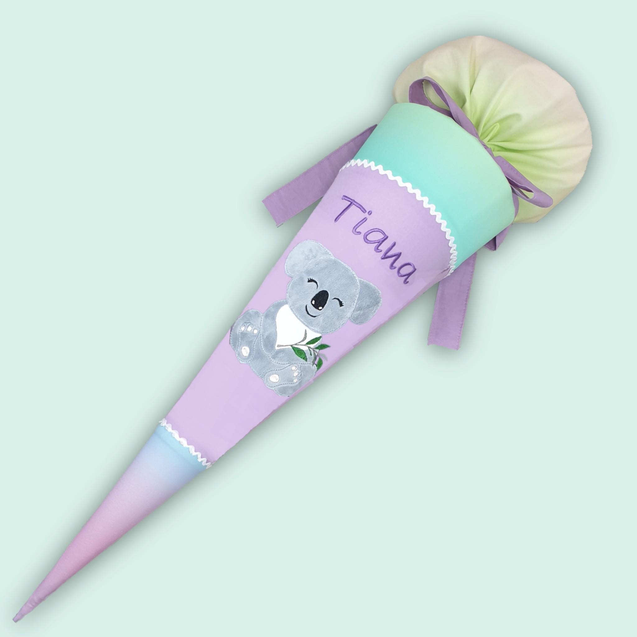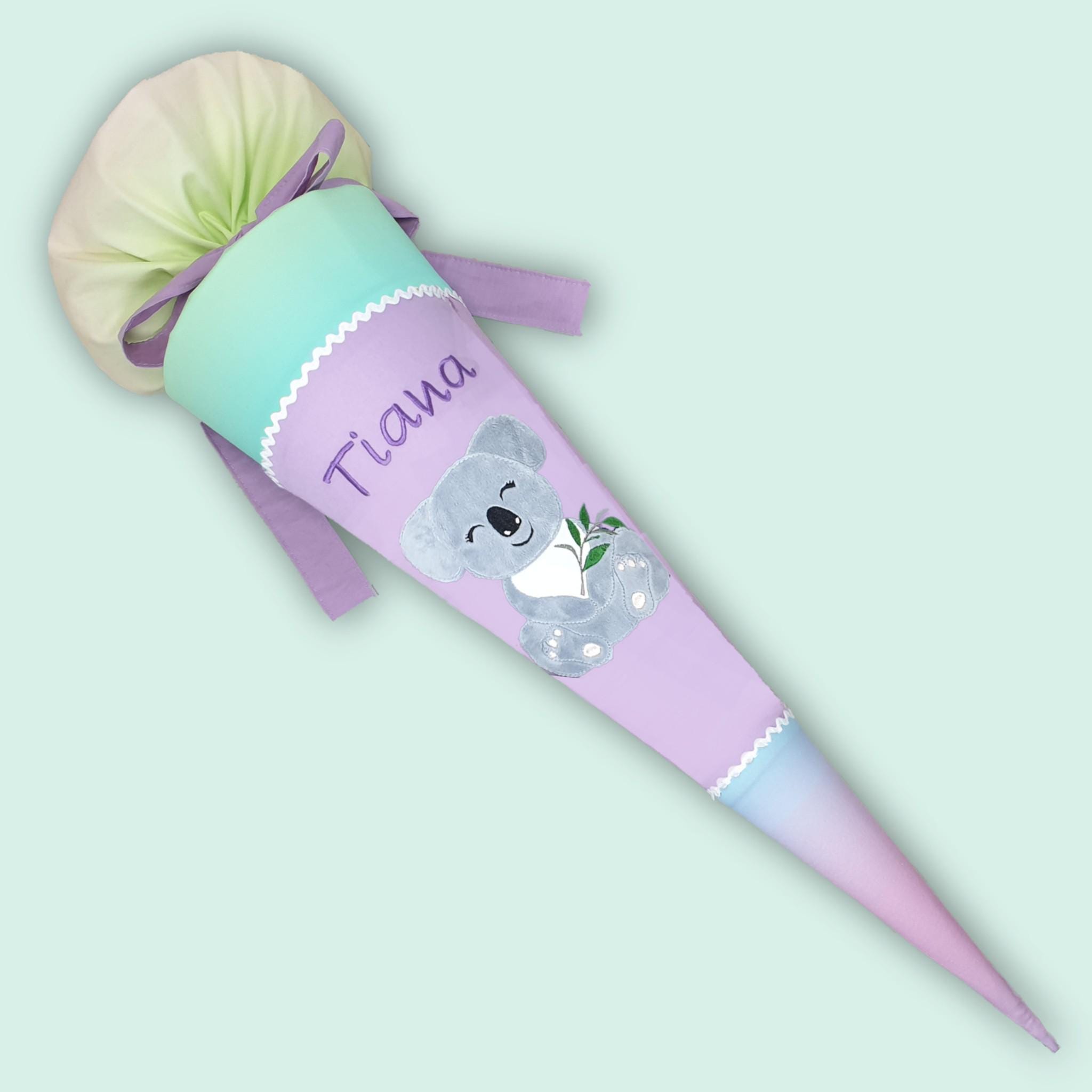 Schultüte mit Koala und Namen farblich auf den Ergobag Zaubärwelt Schulranzen abgestimmt.