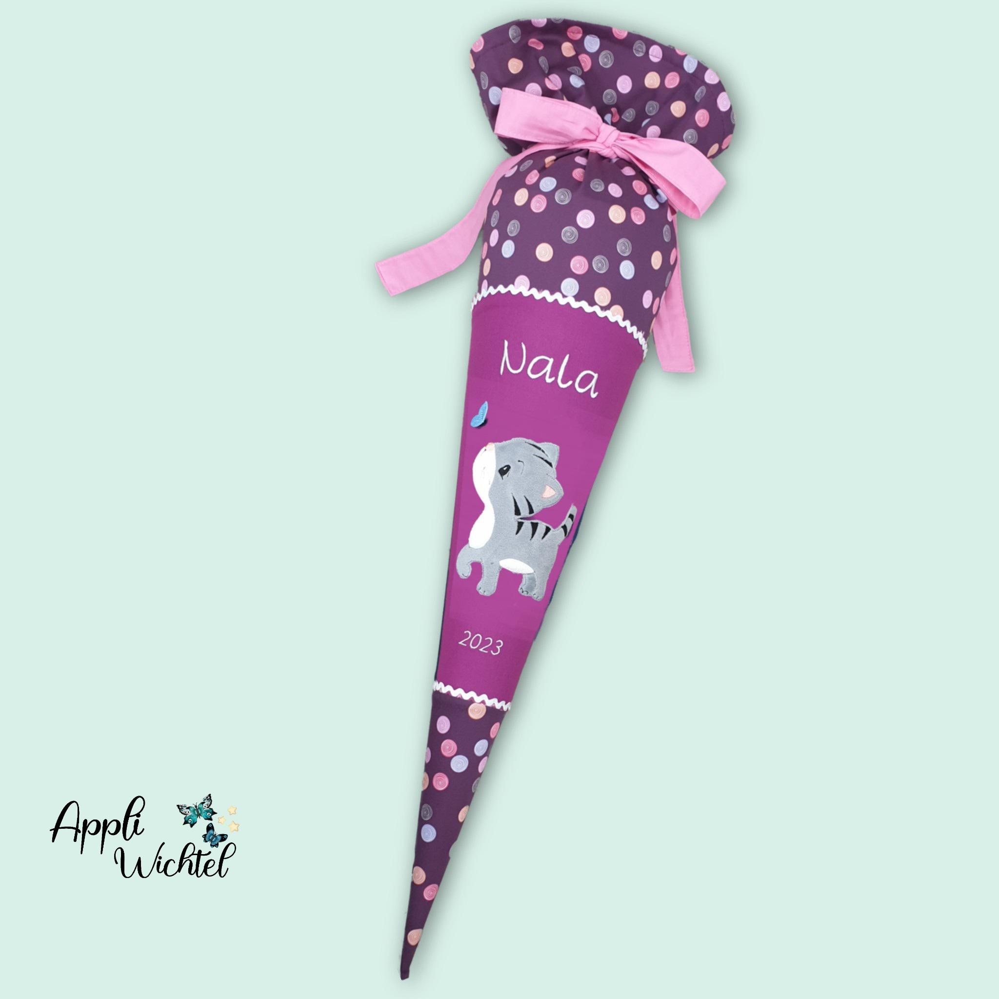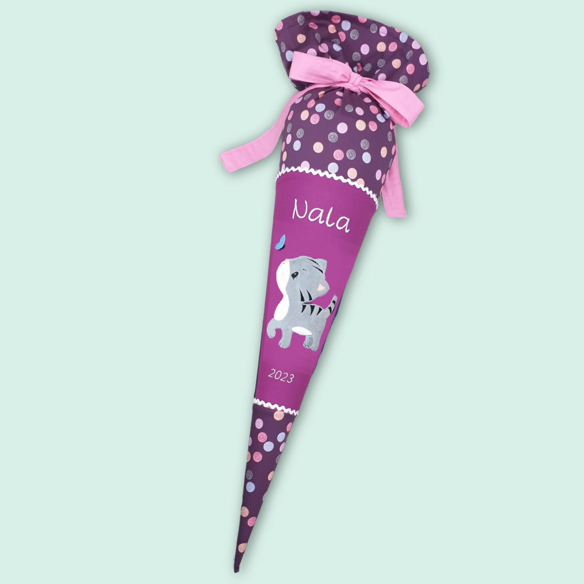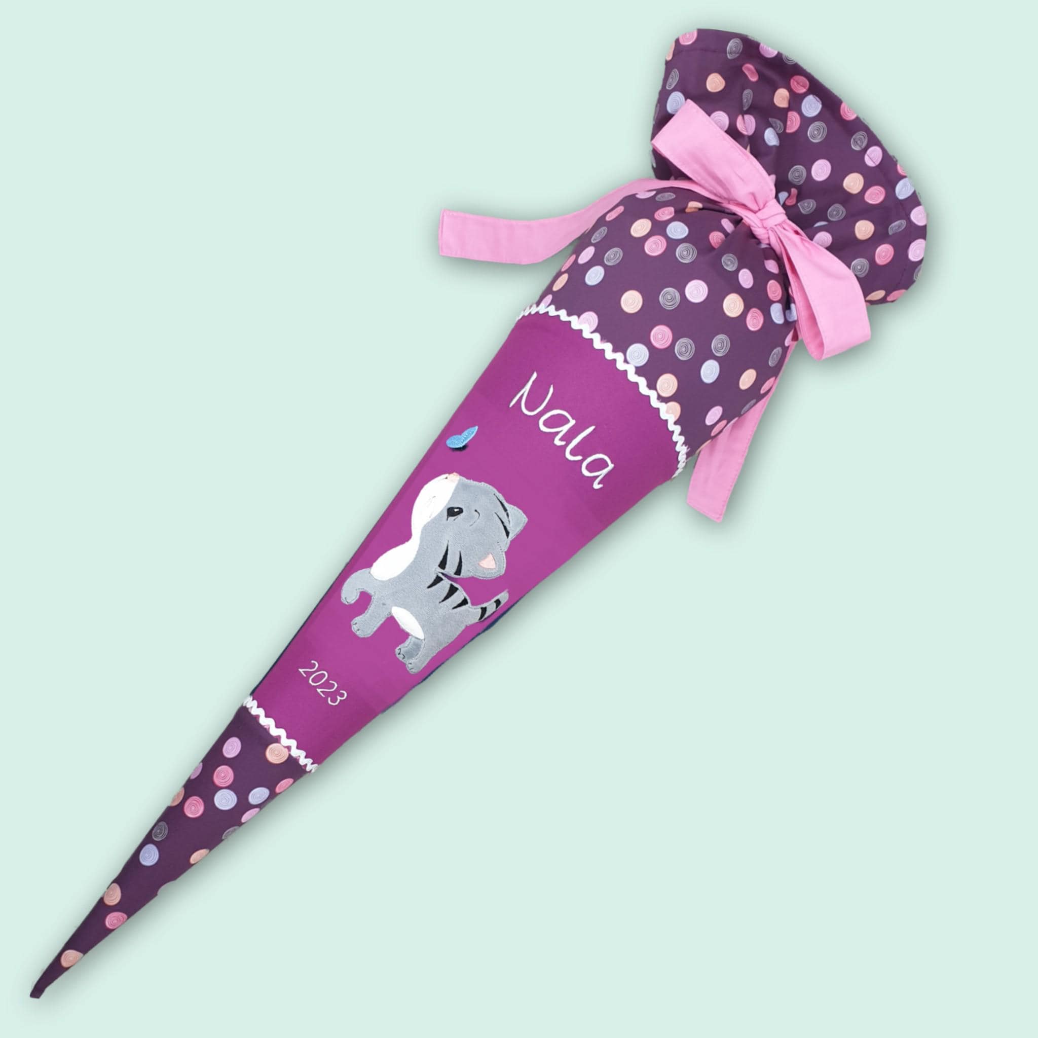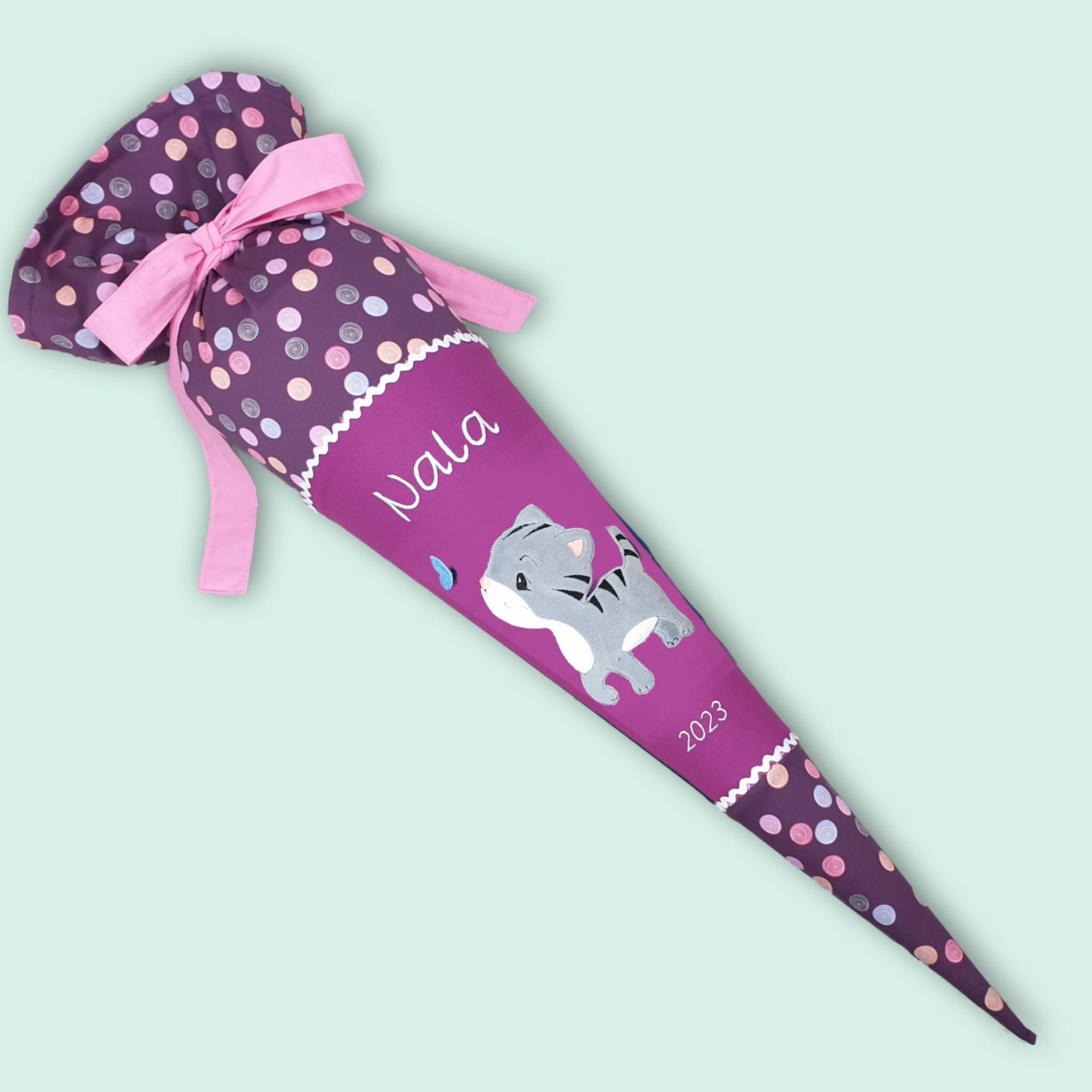 Schultüte mit Katze und Namen farblich auf den Ruby Schulranzen abgestimmt.