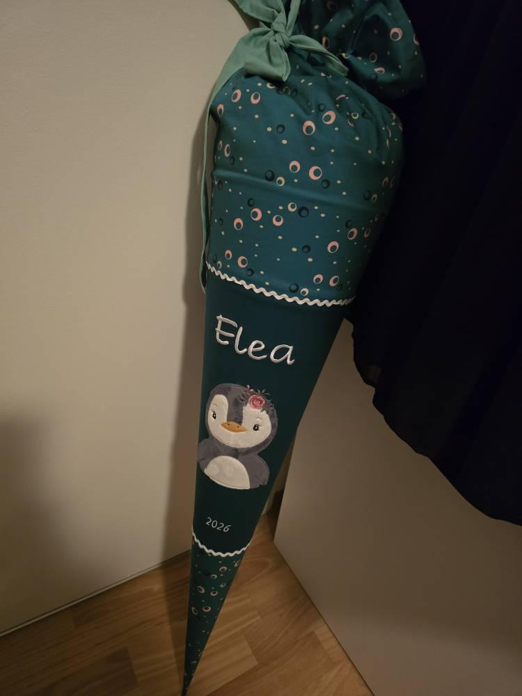 Schultüte mit Pinguin und Namen farblich auf den Dog Basty Schulranzen abgestimmt.