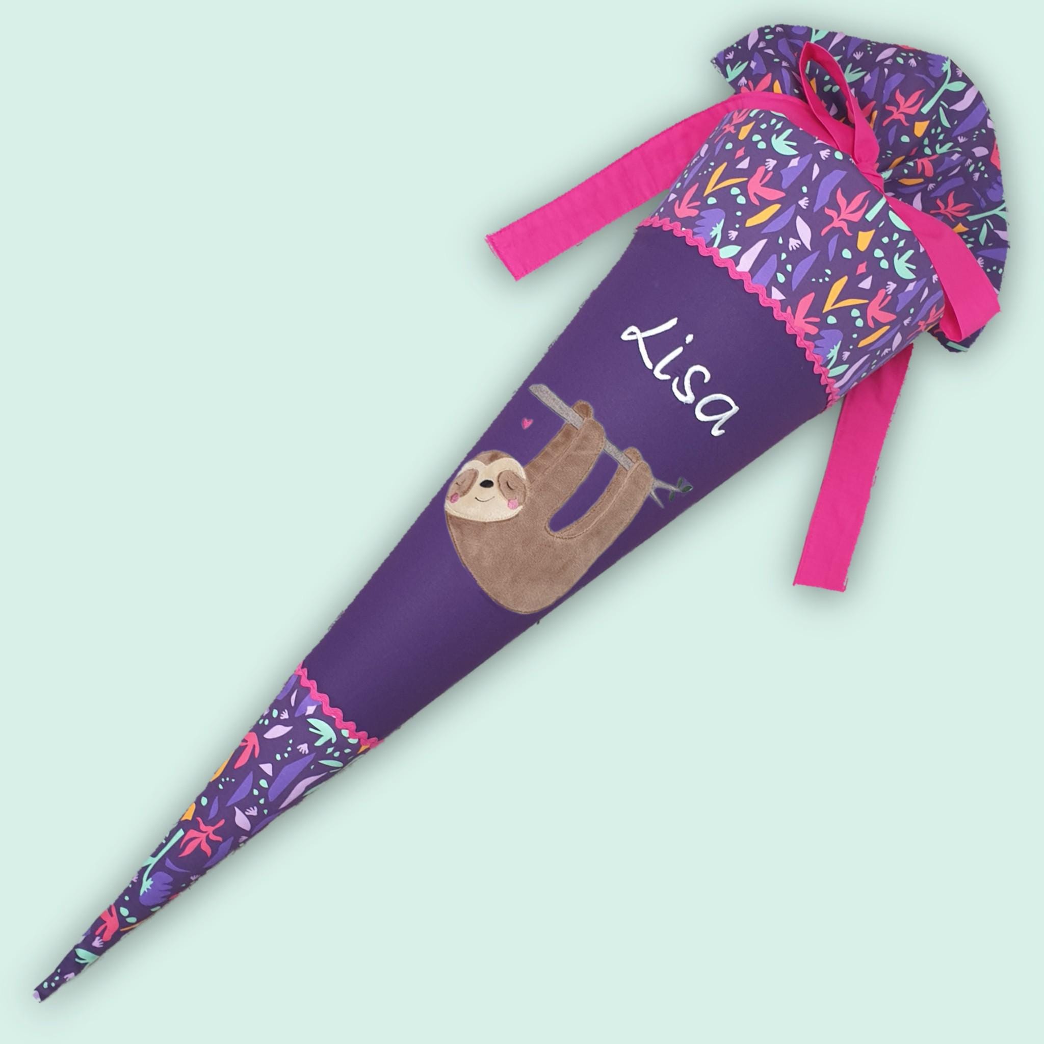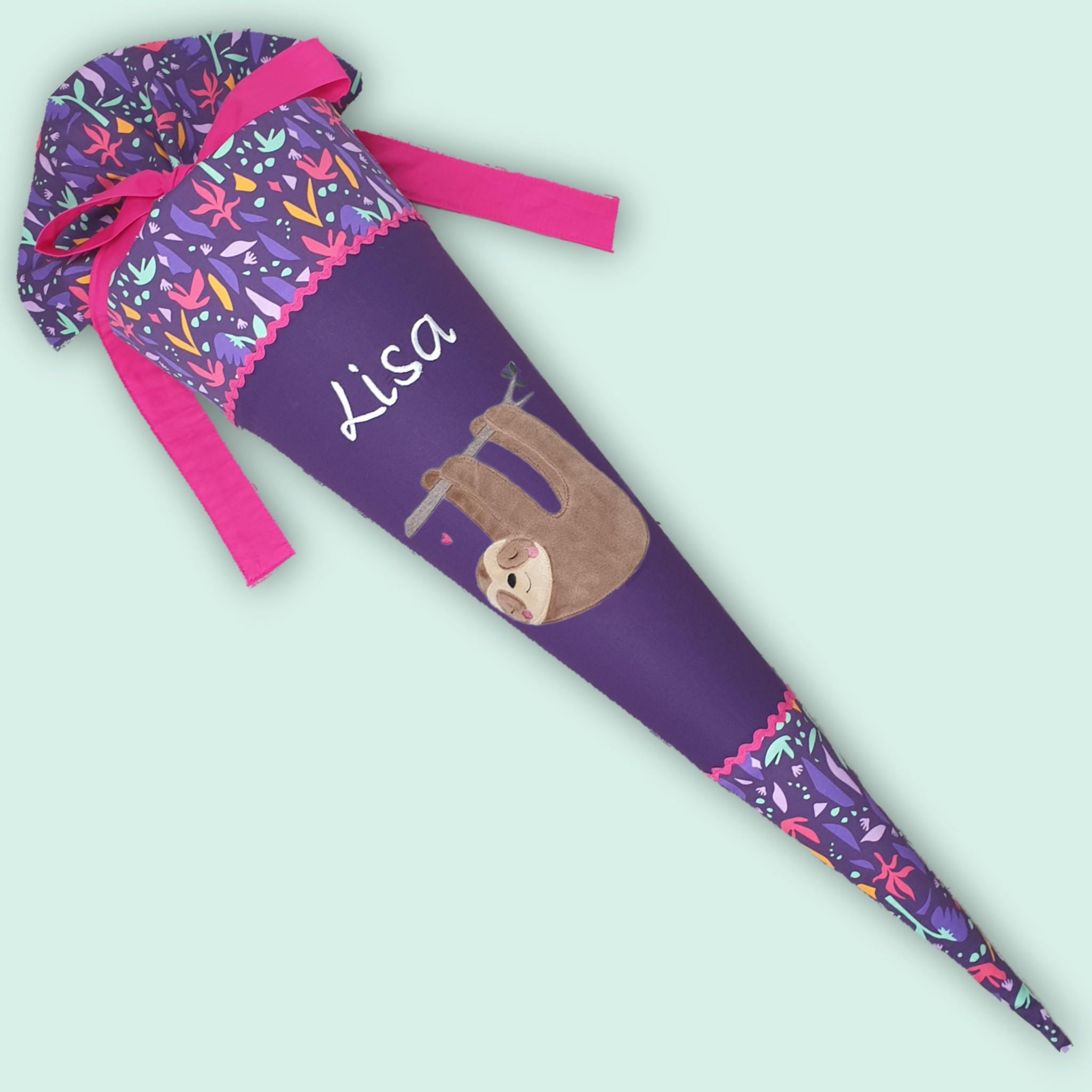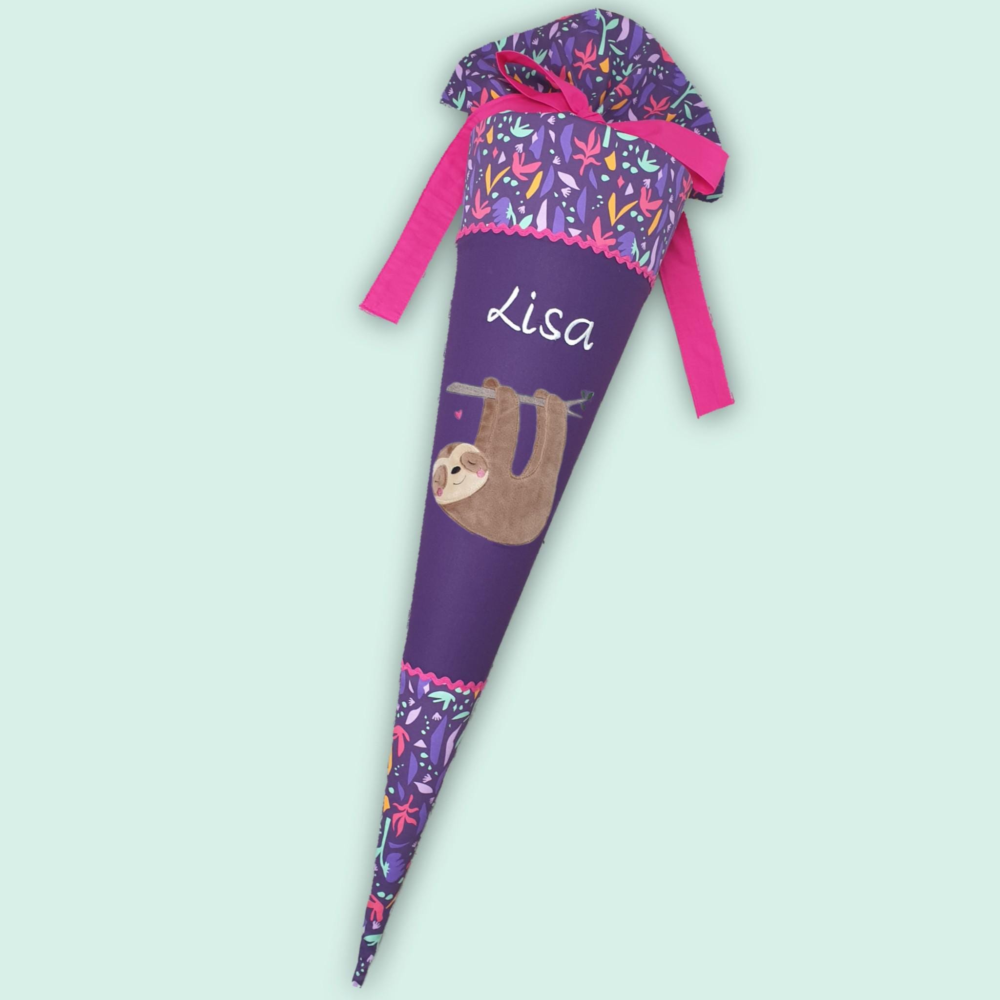 Schultüte mit Faultier und Namen farblich auf den Ambärzonas Schulranzen abgestimmt.