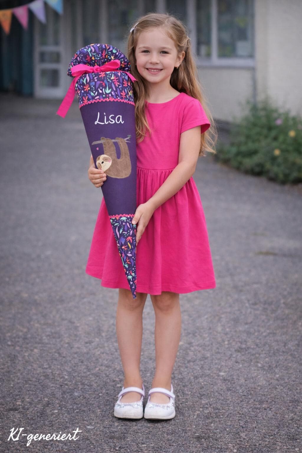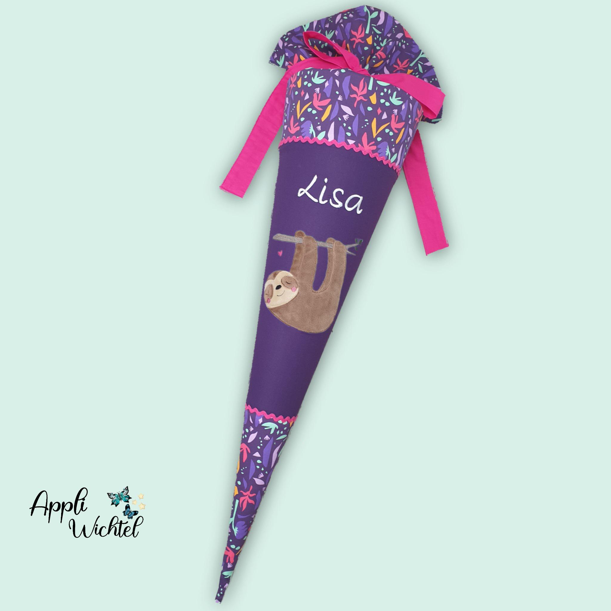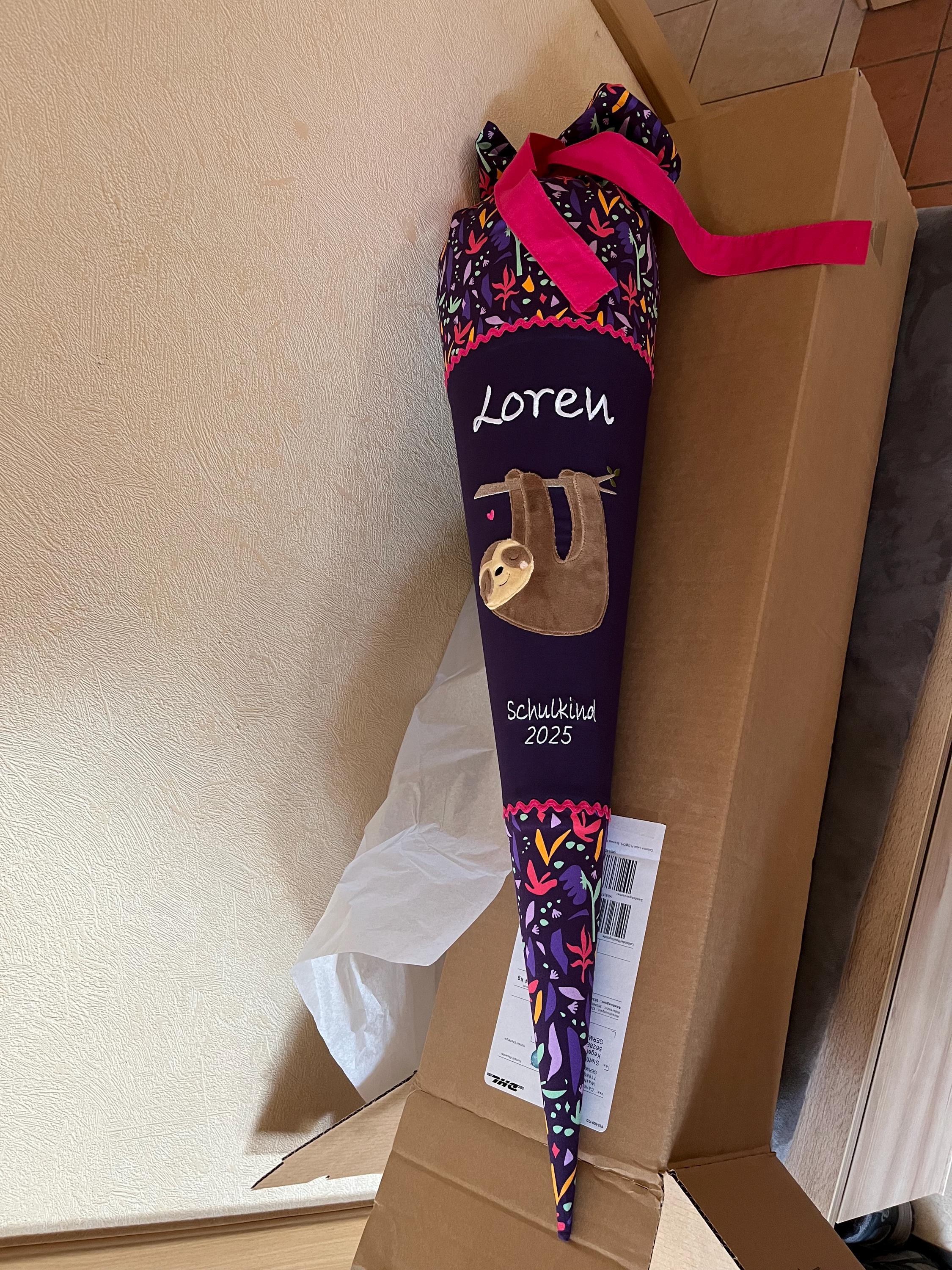 Schultüte mit Faultier und Namen farblich auf den Ambärzonas Schulranzen abgestimmt.