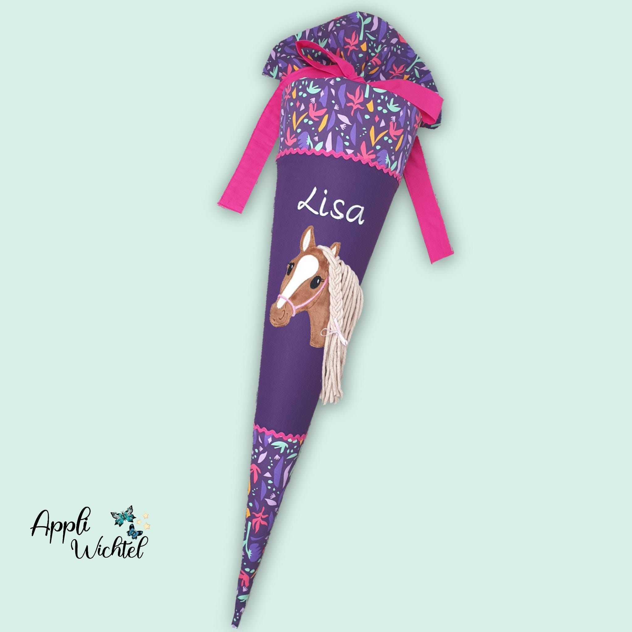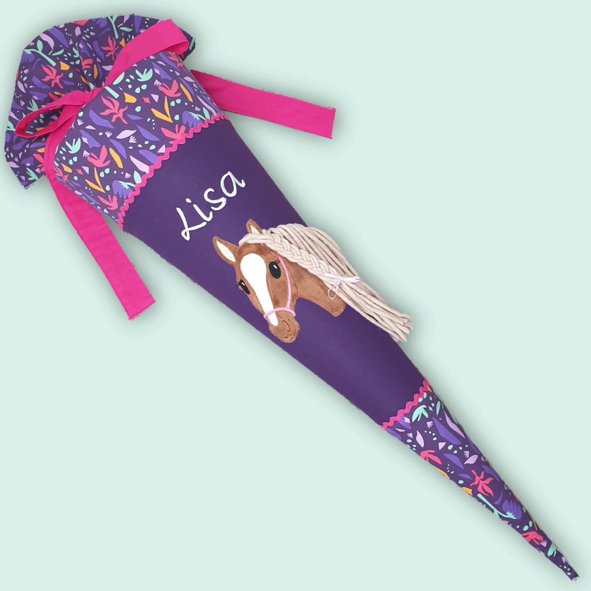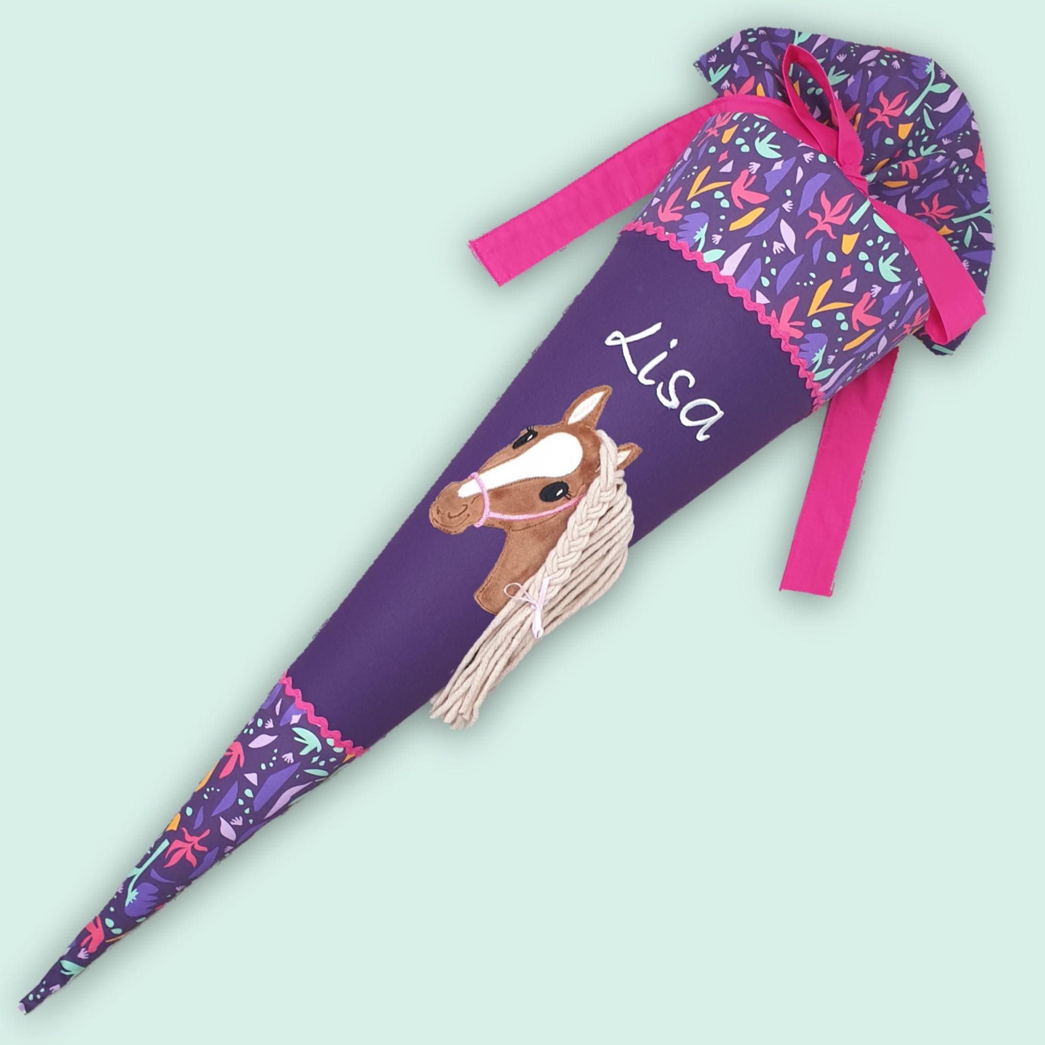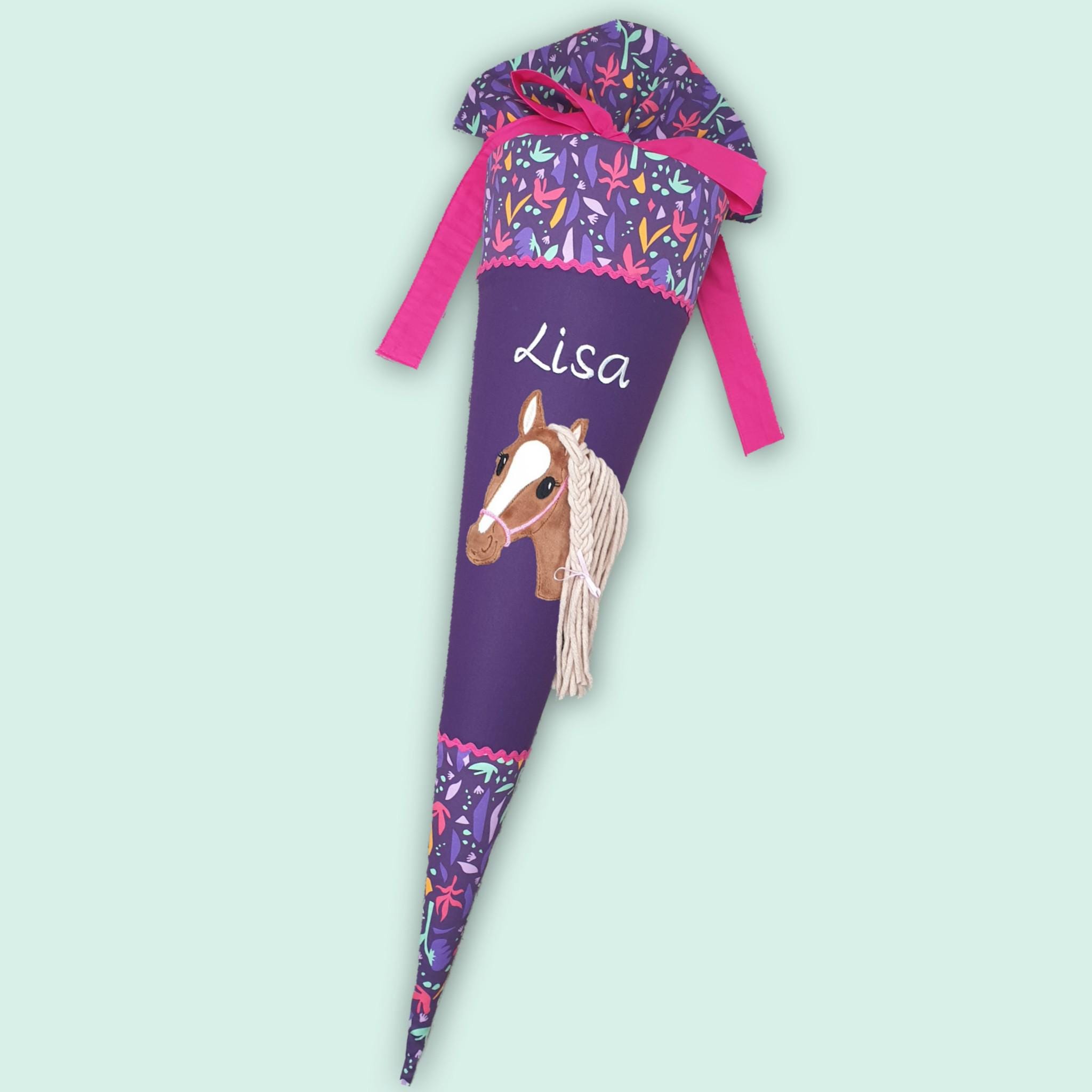 Schultüte mit Pferd und Namen farblich auf den Ambärzonas Schulranzen abgestimmt.