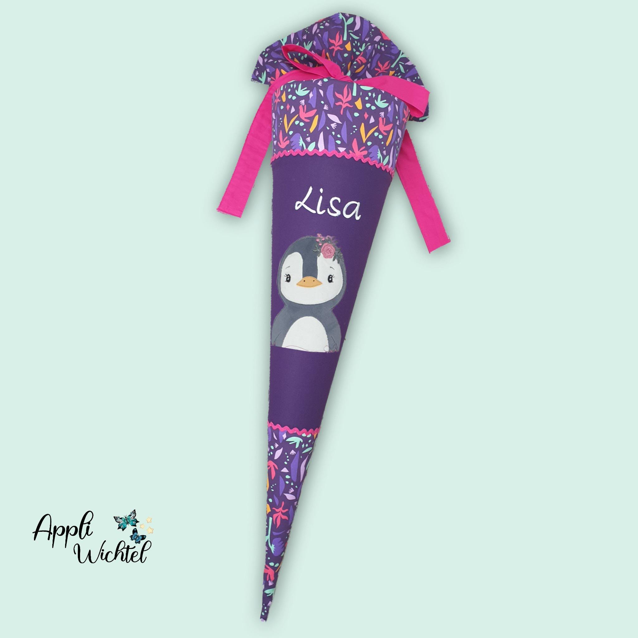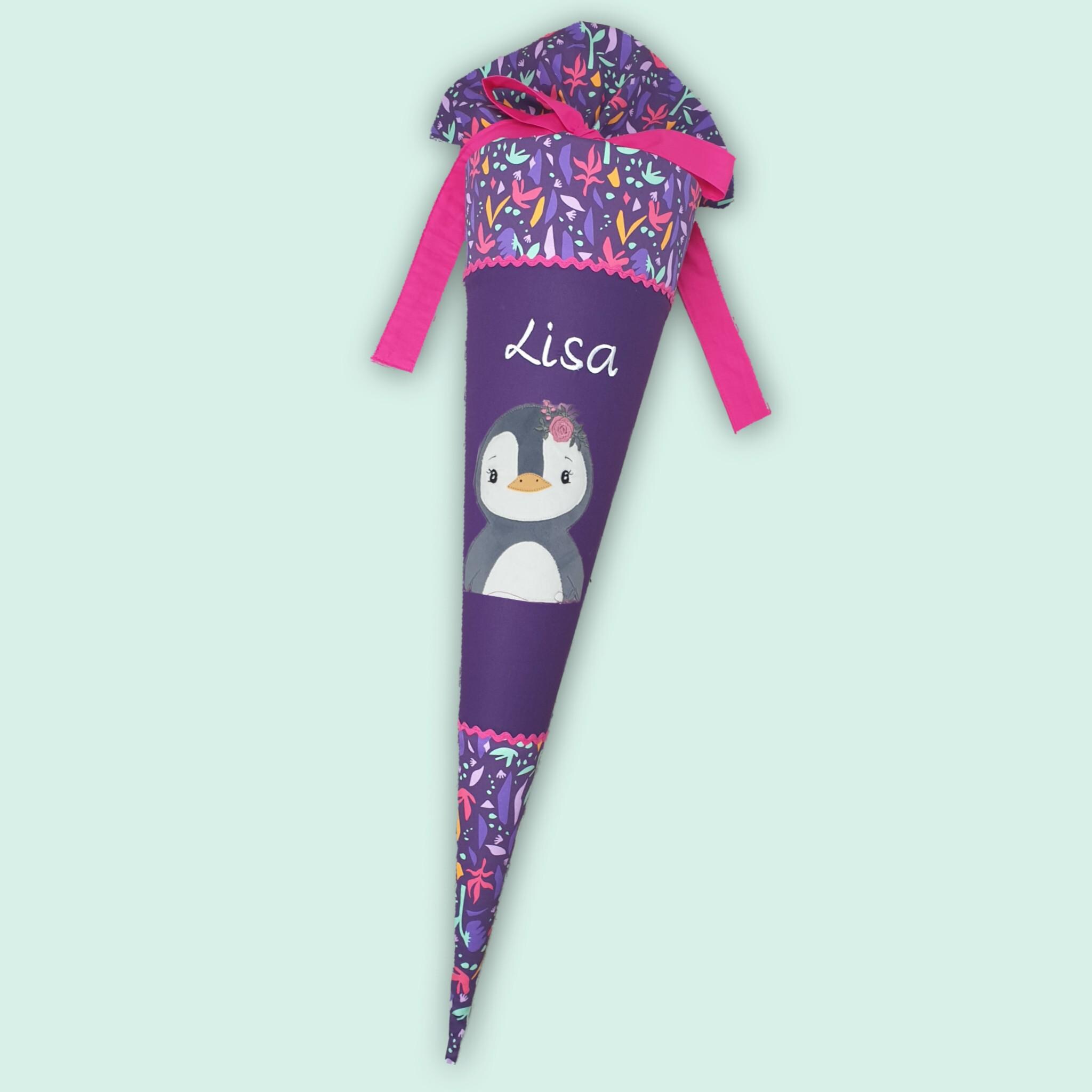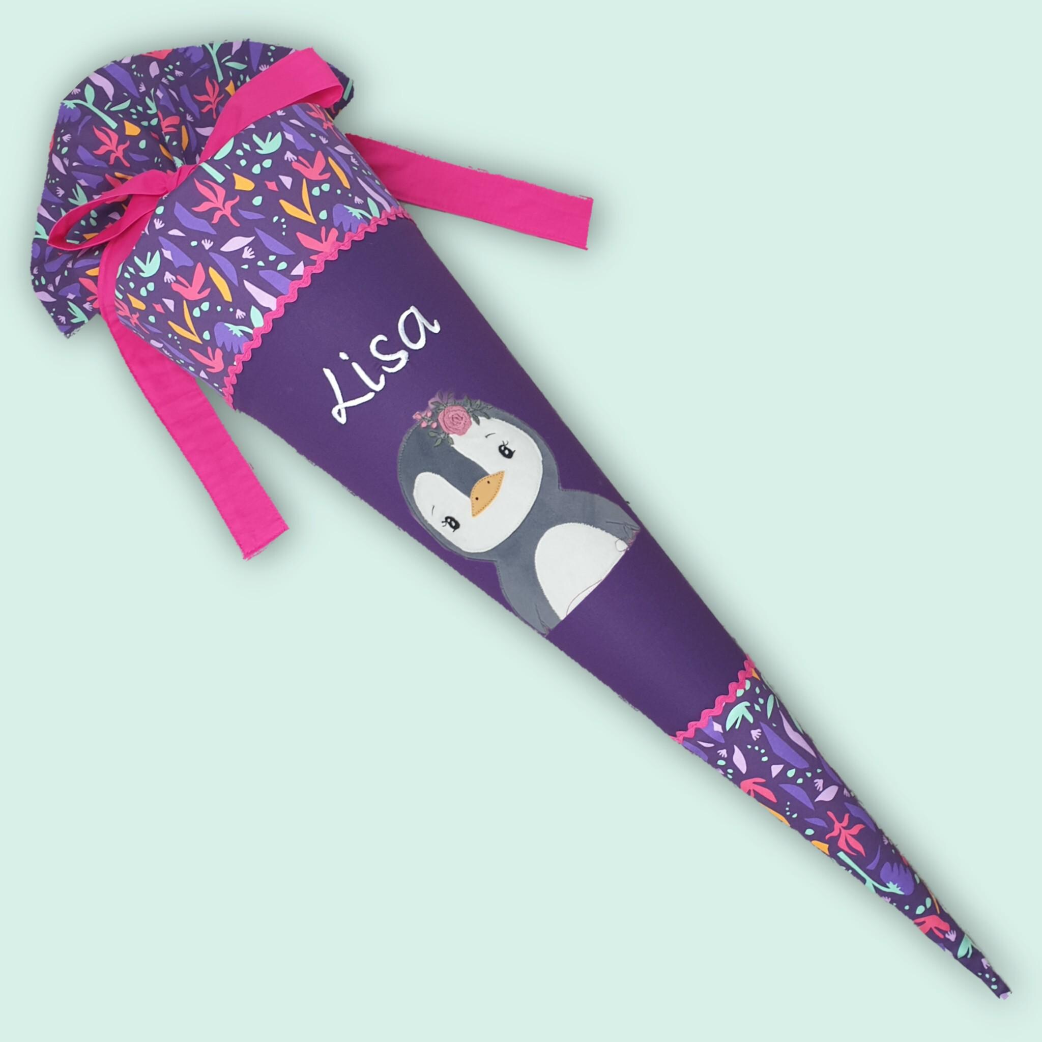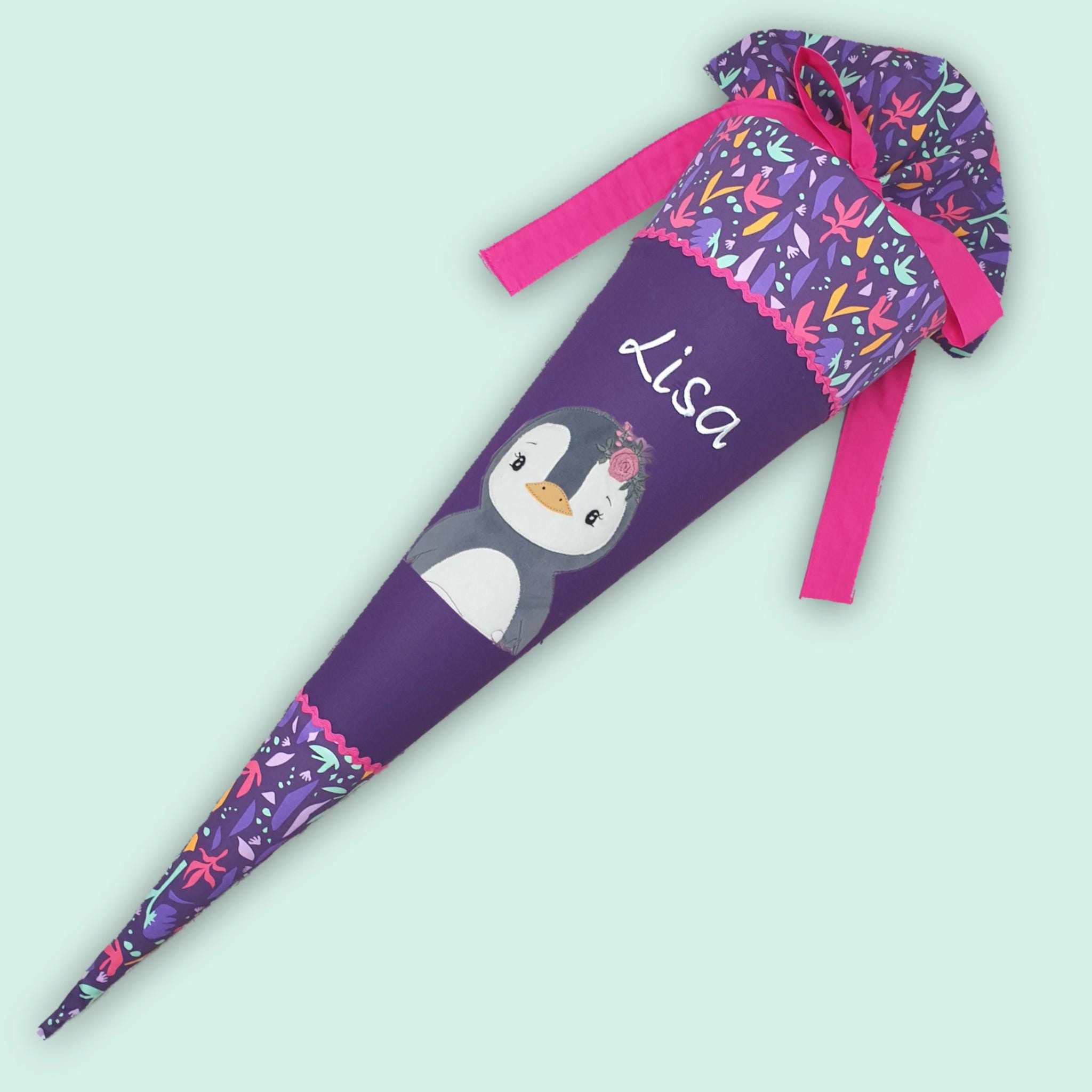 Schultüte mit Pinguin und Namen farblich auf den Ambärzonas Schulranzen abgestimmt.