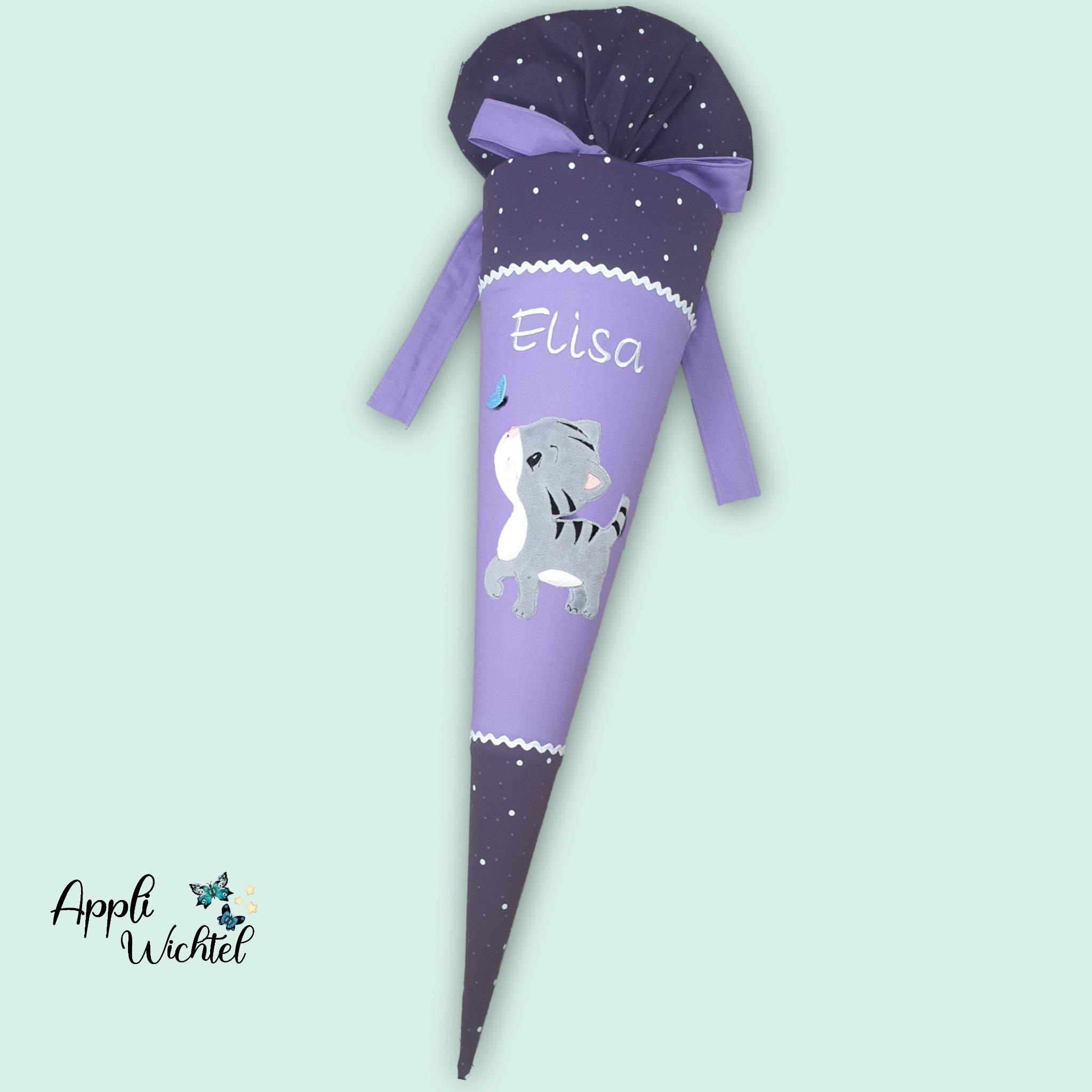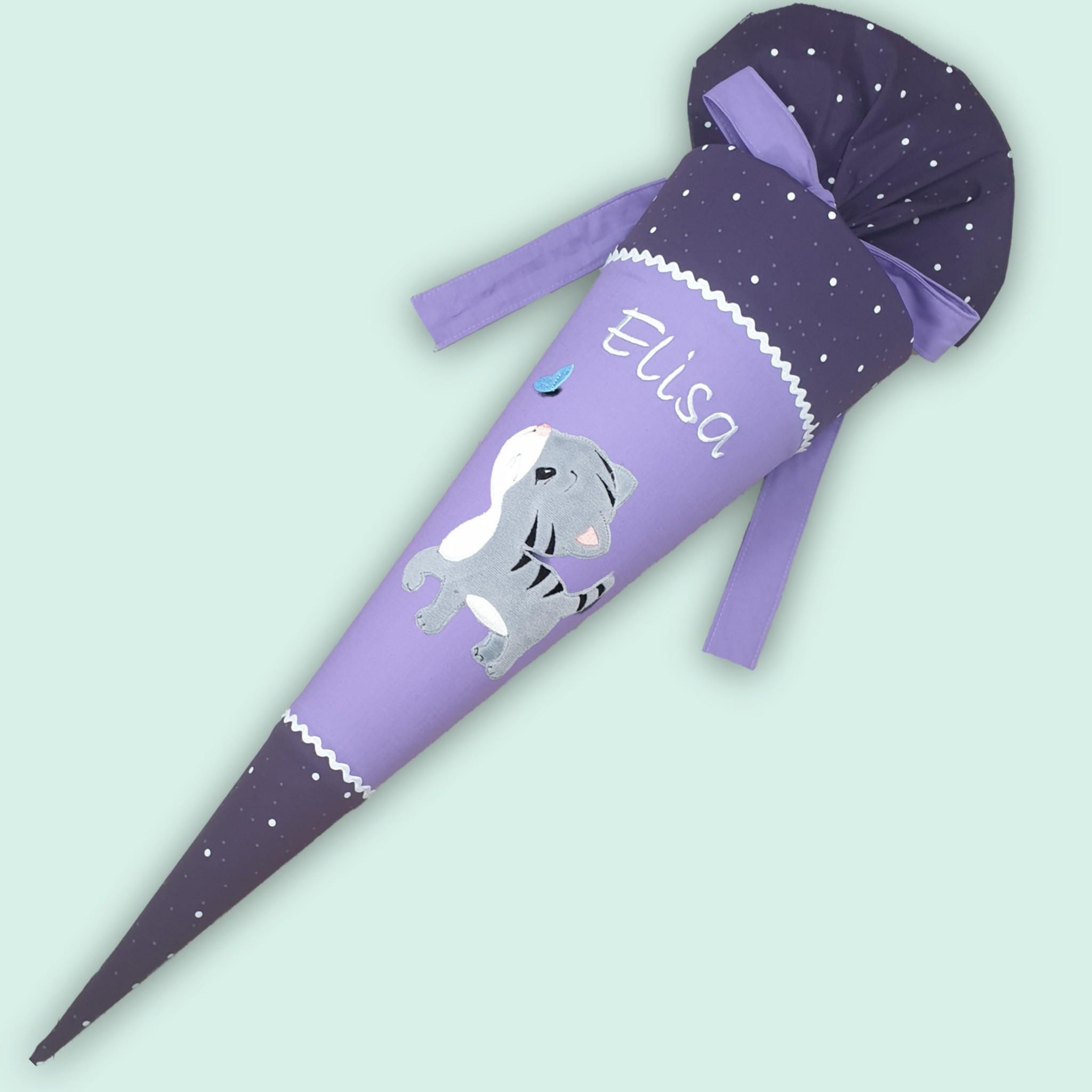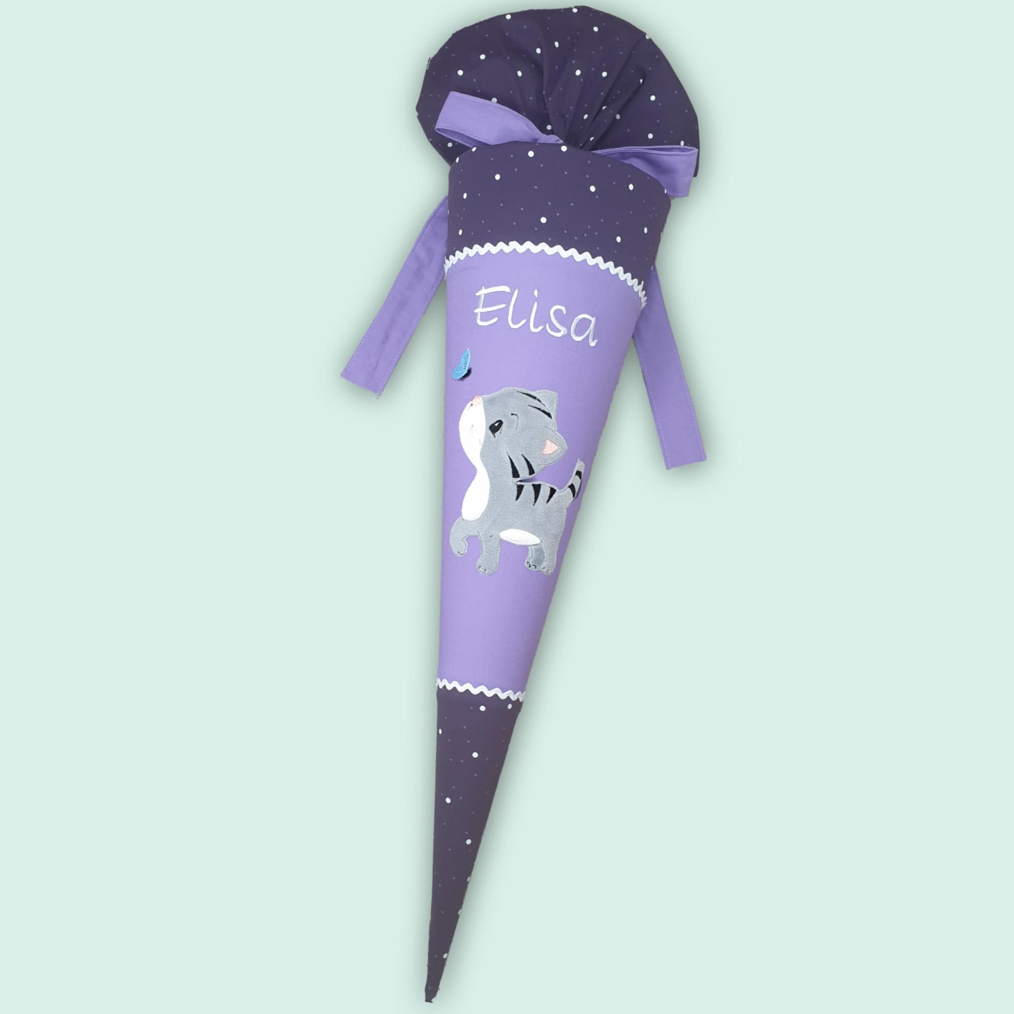 Schultüte mit Katze und Namen farblich auf den Sternguckbär Schulranzen abgestimmt.