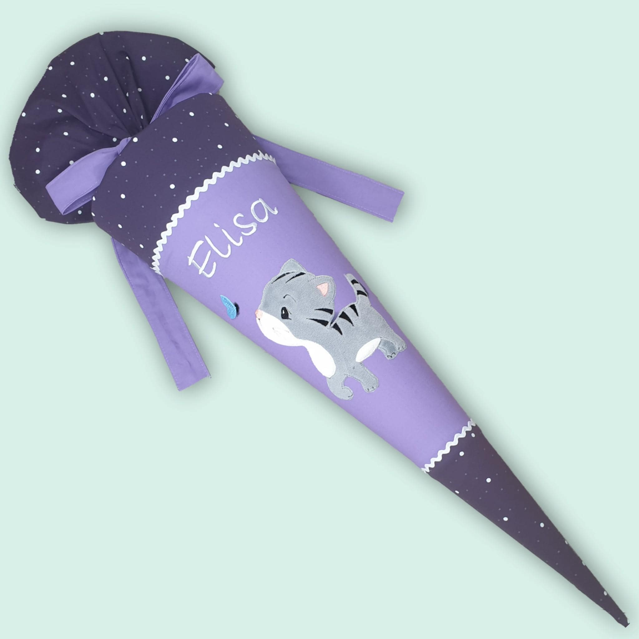 Die Schultüte ist mit Zackenlitze aus Baumwolle verziert und wird mit einem genähten Baumwollband sicher verschlossen.