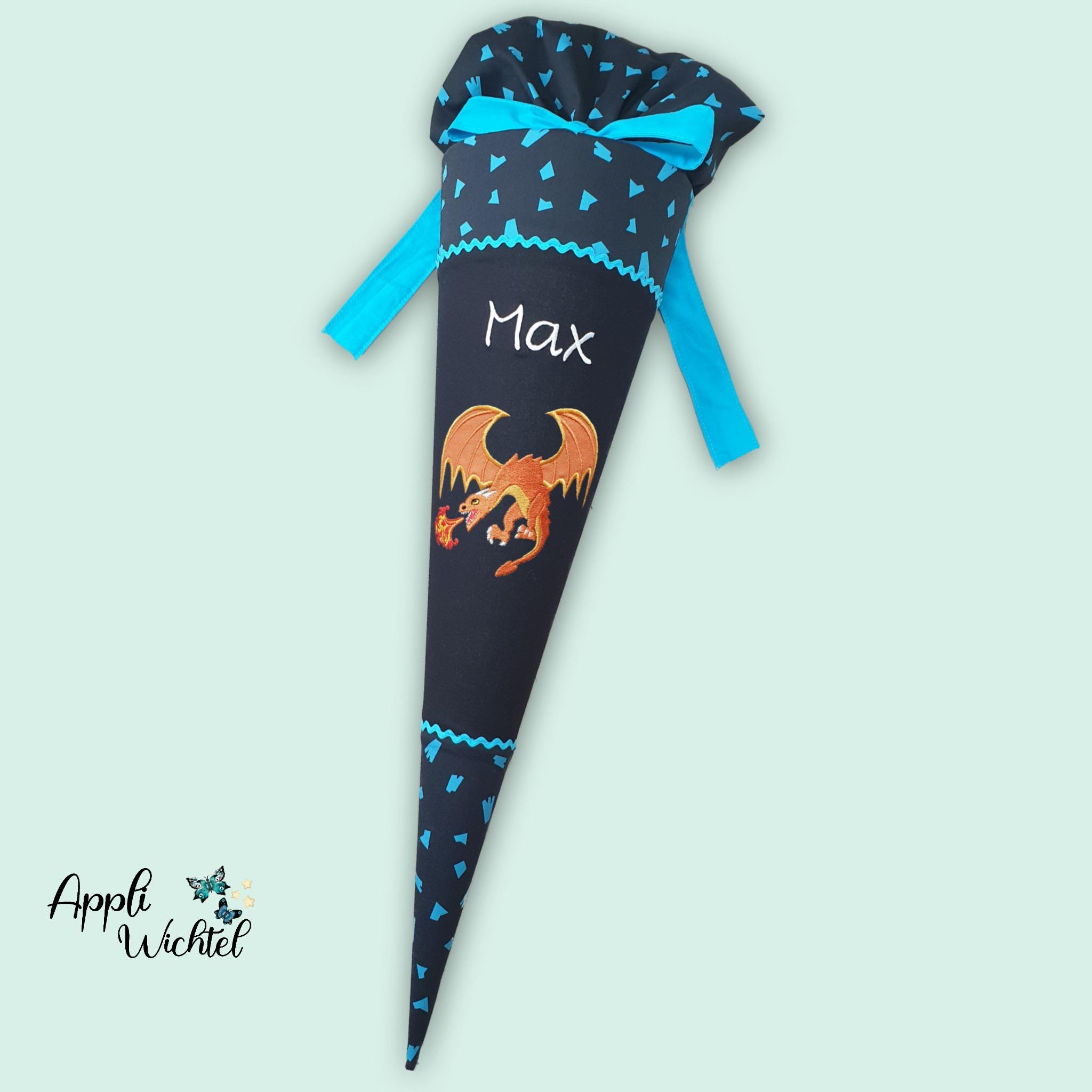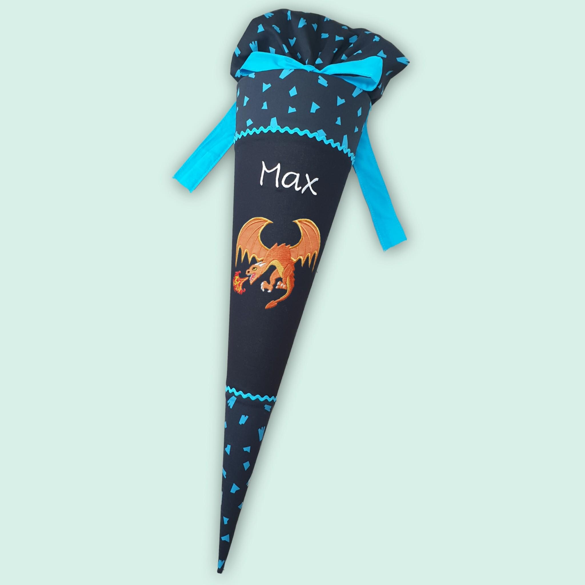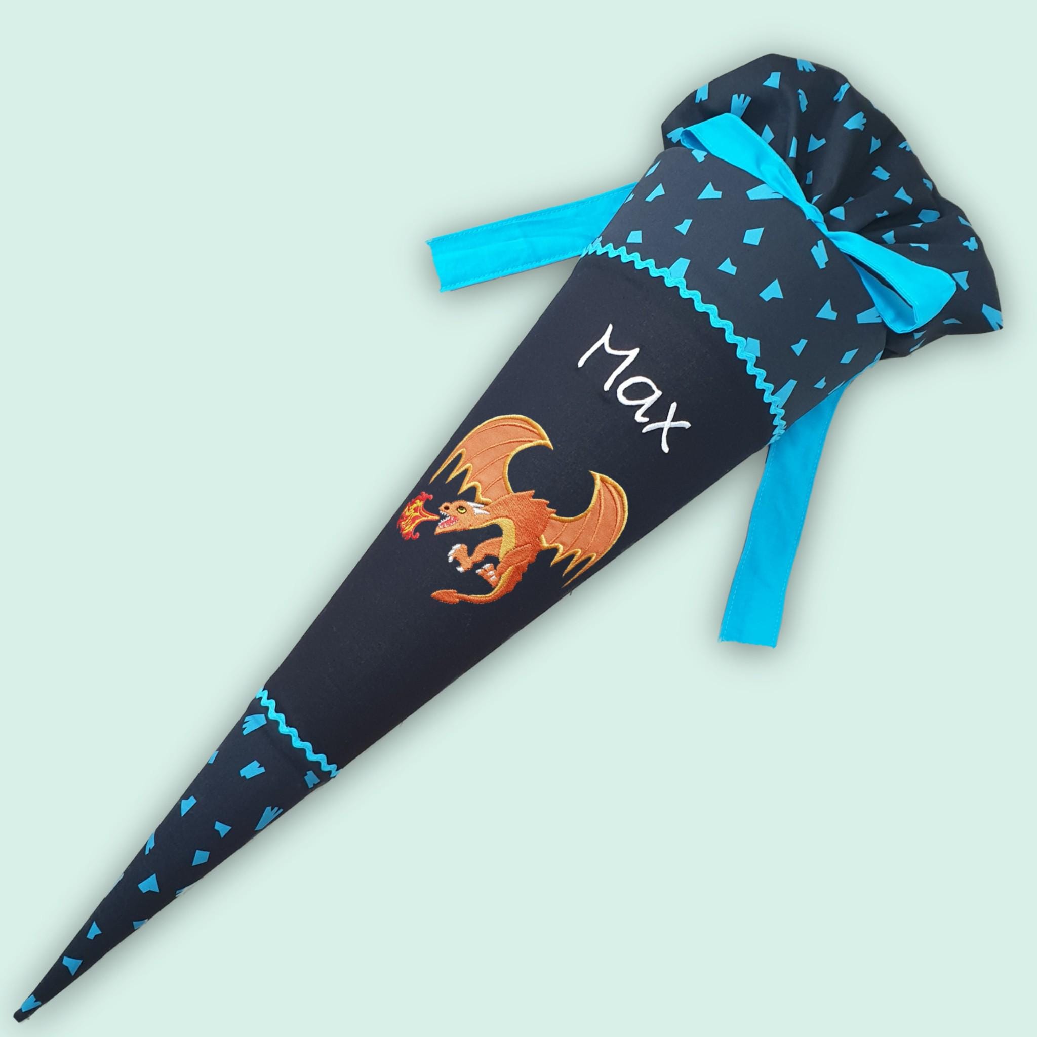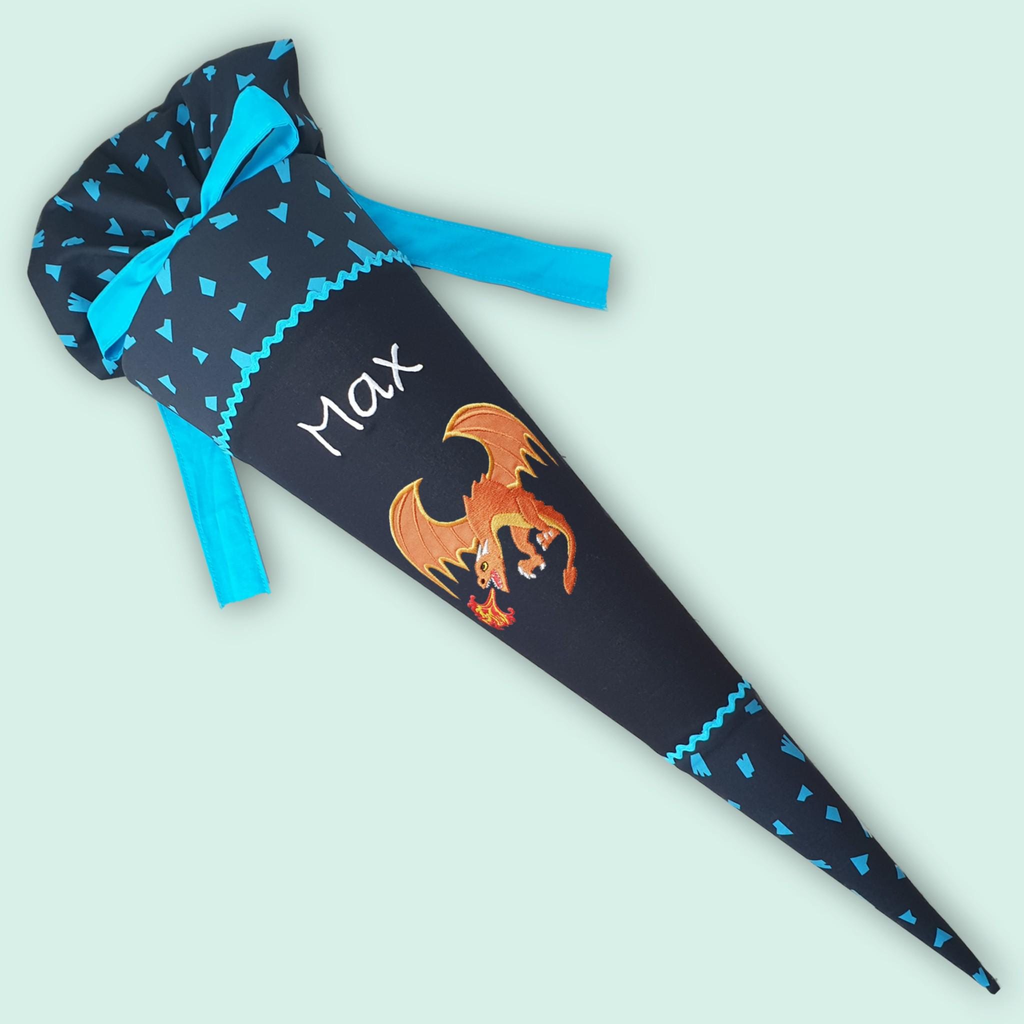 Schultüte mit Drache und Namen farblich auf den Verfolgbärjagd Schulranzen abgestimmt.
