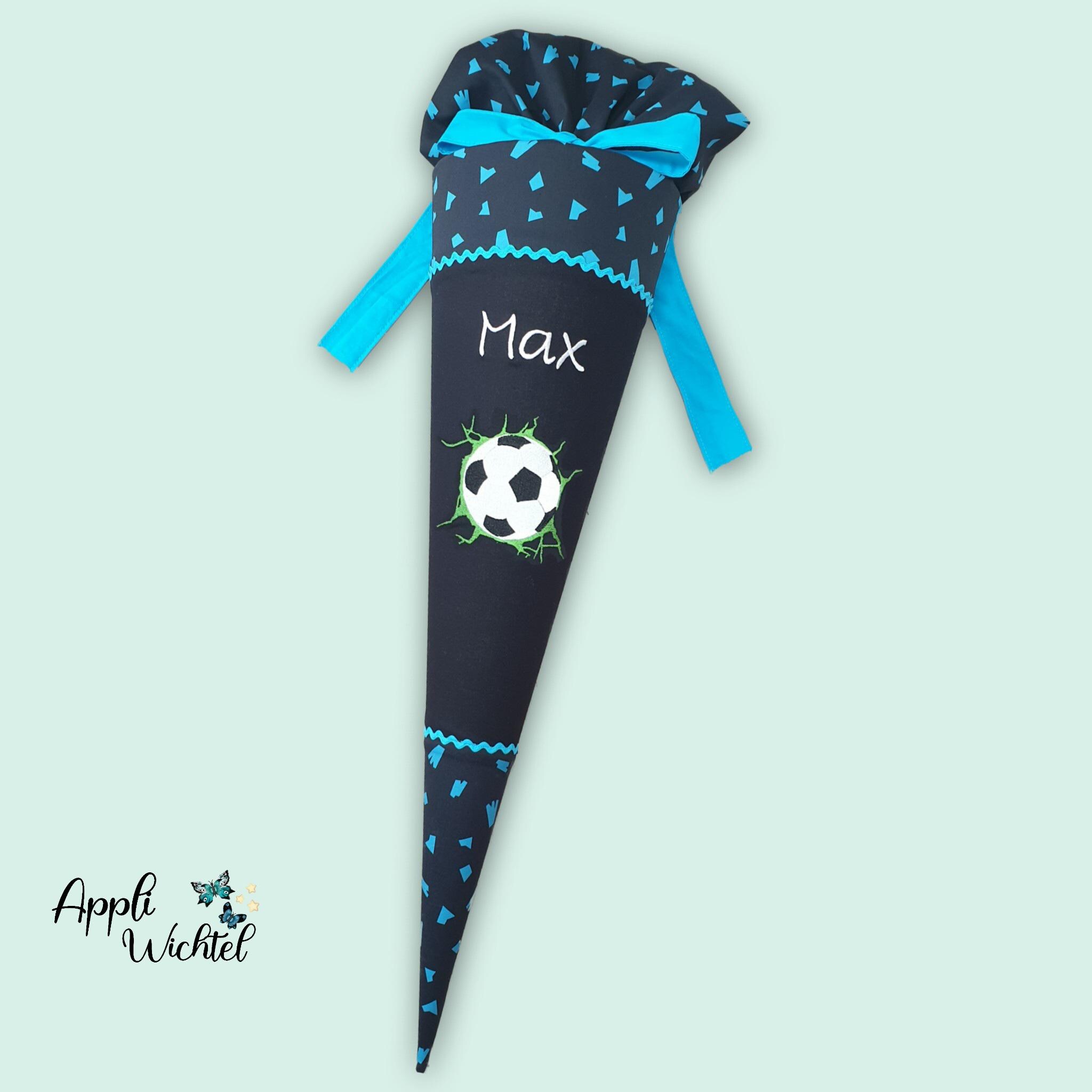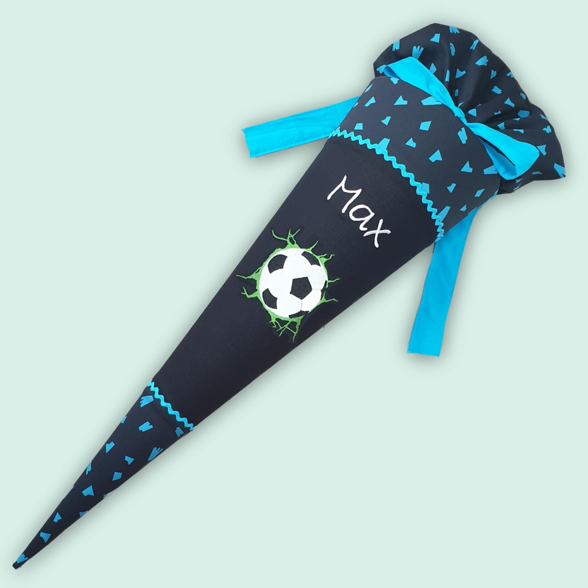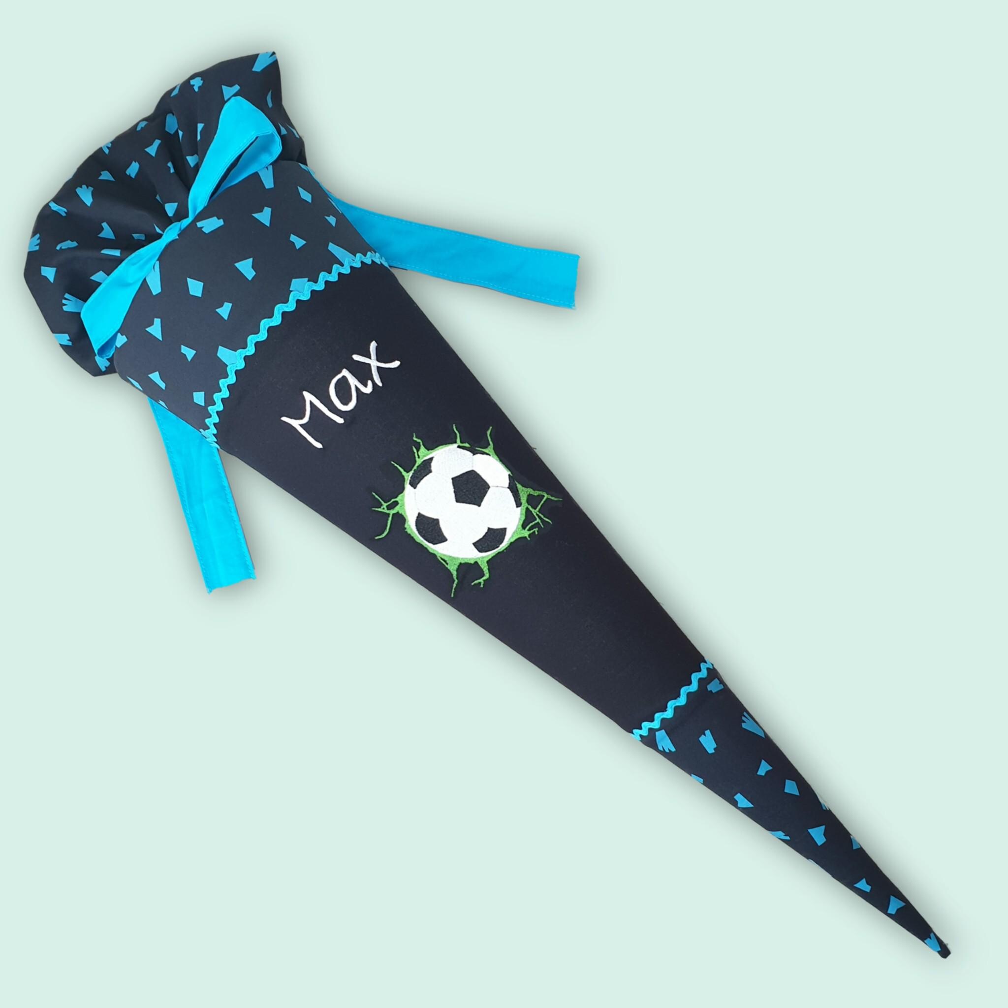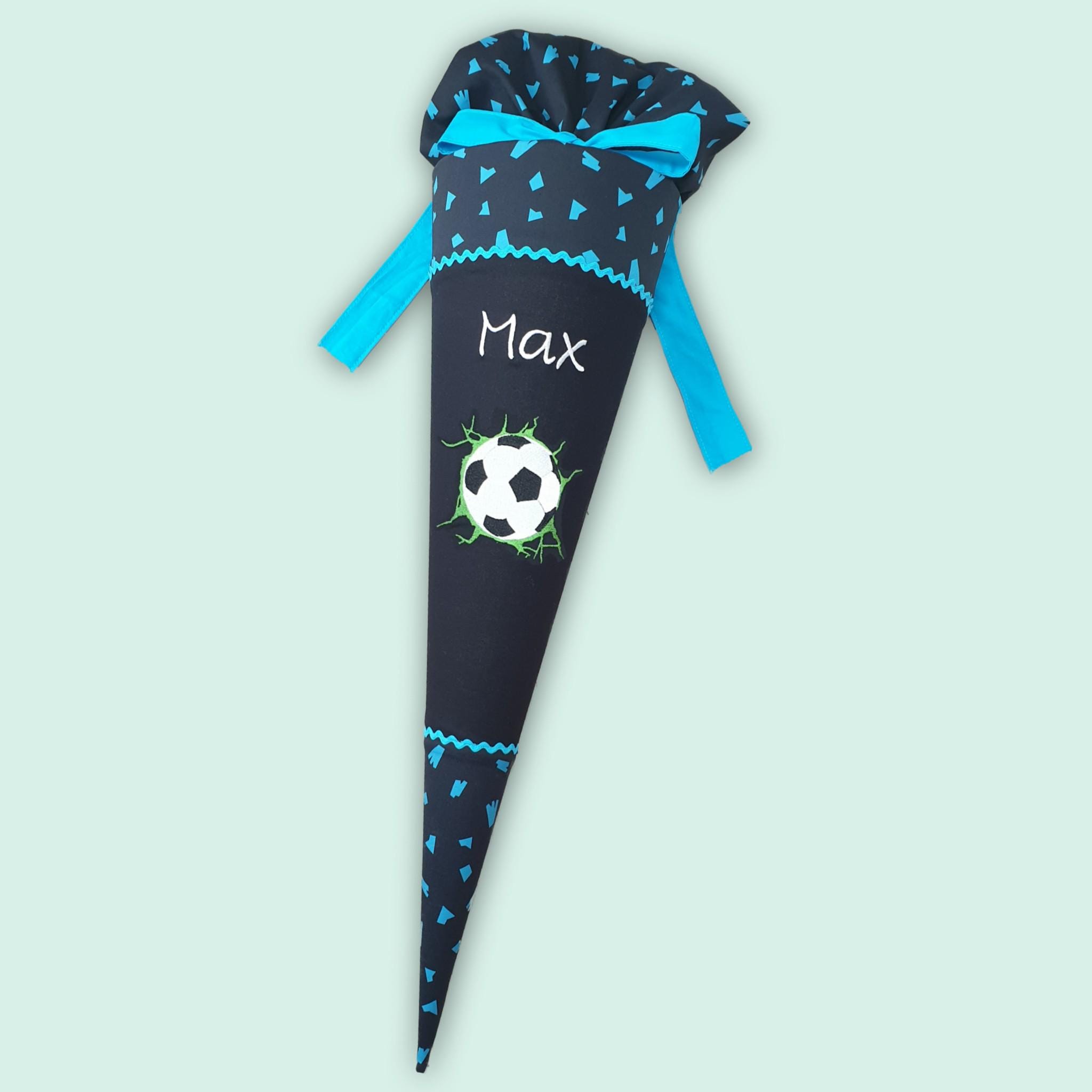Schultüte mit Fussball und Namen farblich auf den Verfolgbärjagd Schulranzen abgestimmt.