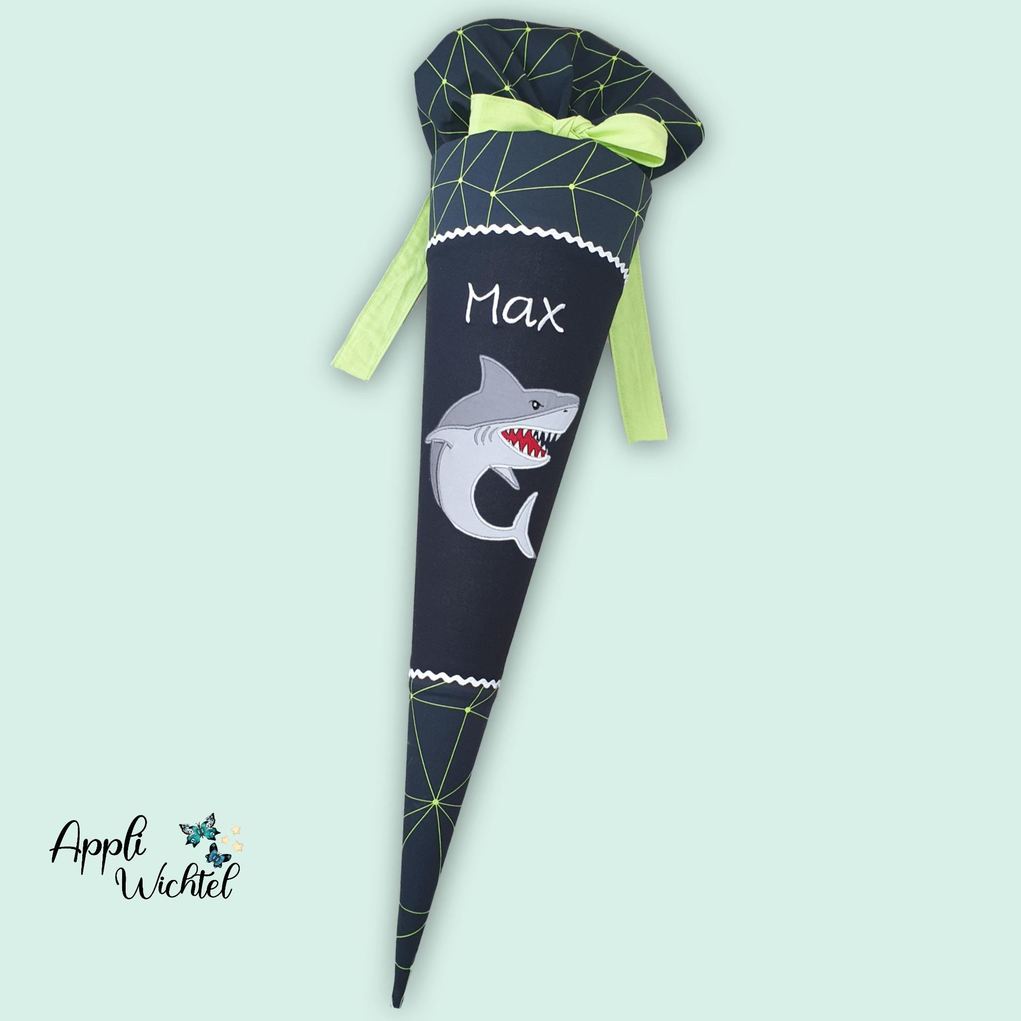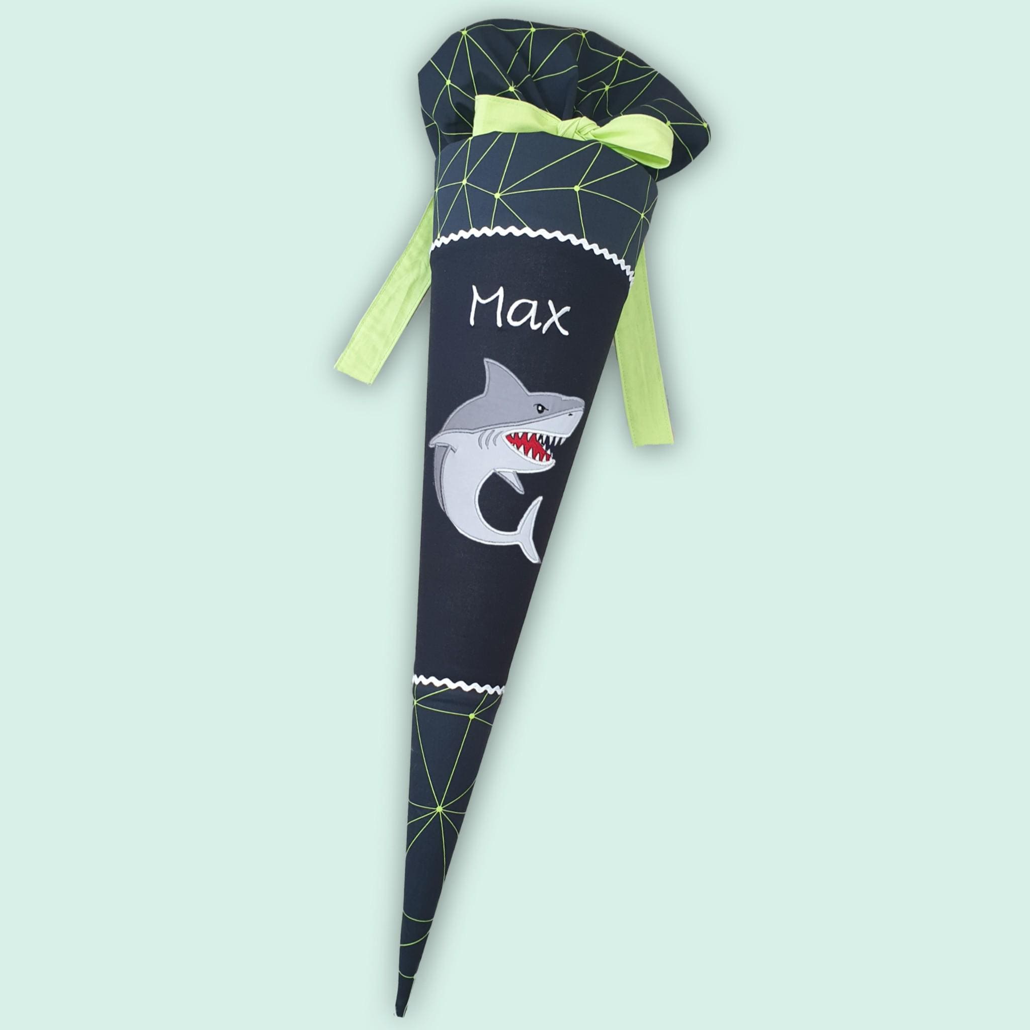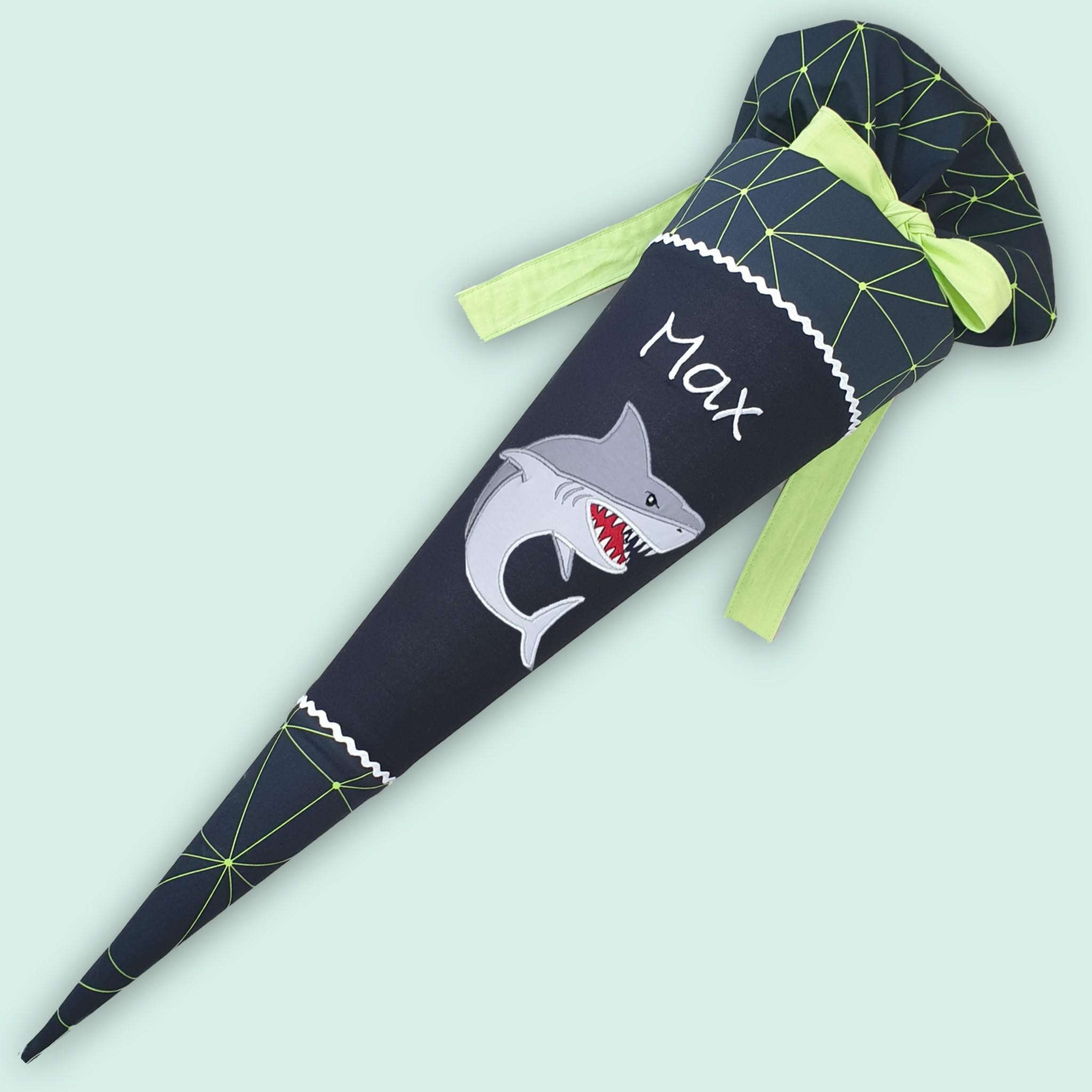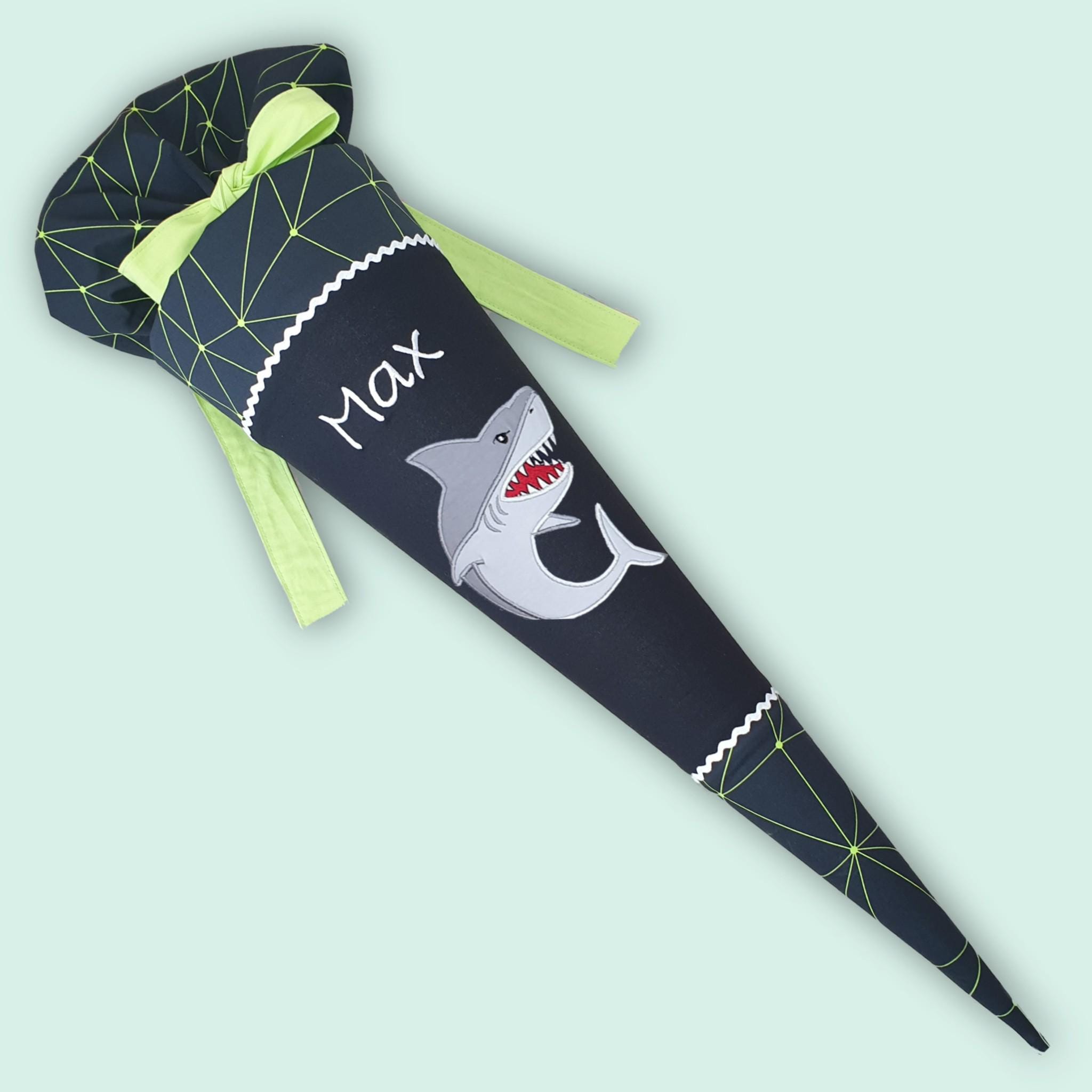 Schultüte mit Hai und Namen farblich auf den Cybär Race Schulranzen abgestimmt.