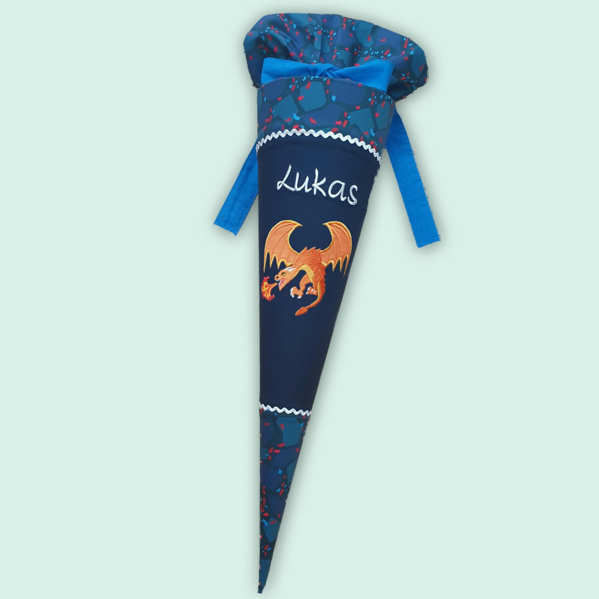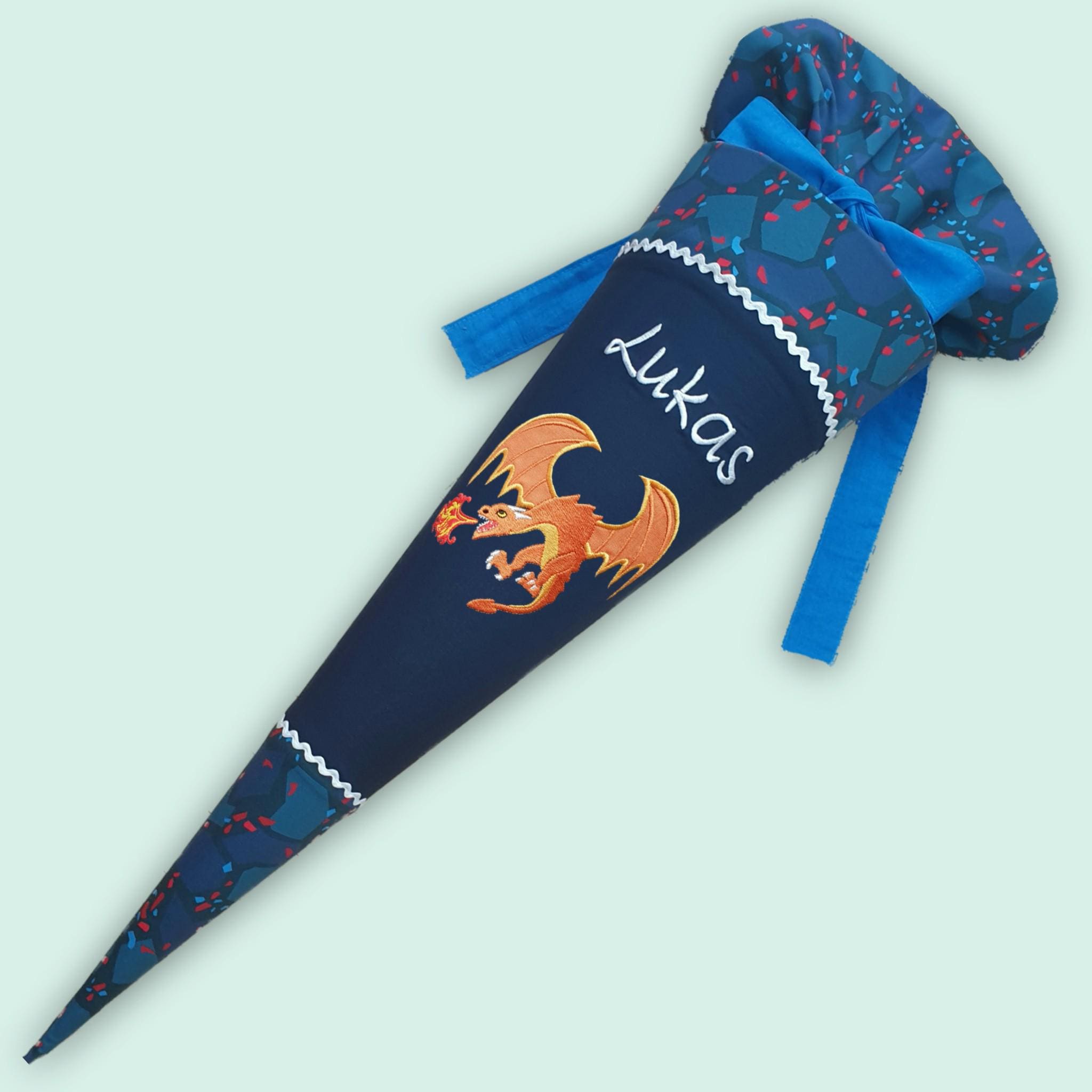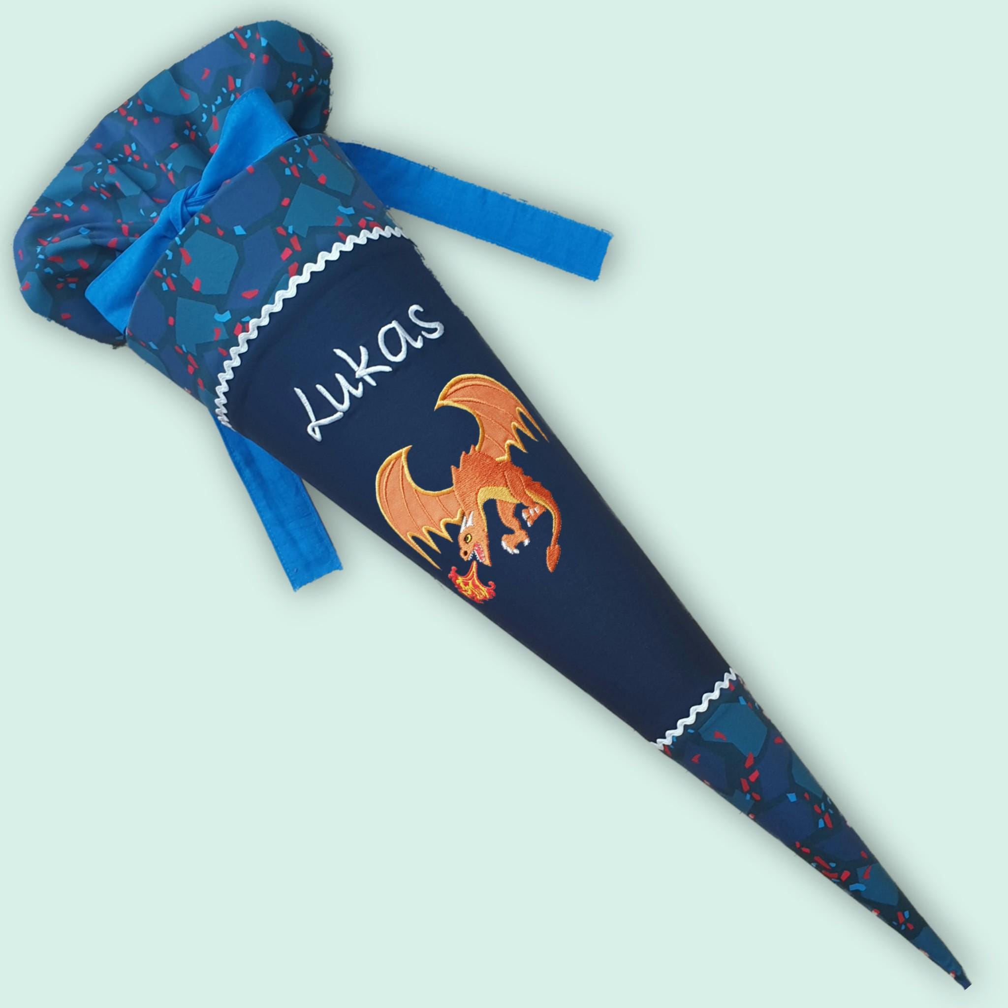 Schultüte mit Drache und Namen farblich auf den step by step Tractor Freddy Schulranzen abgestimmt.