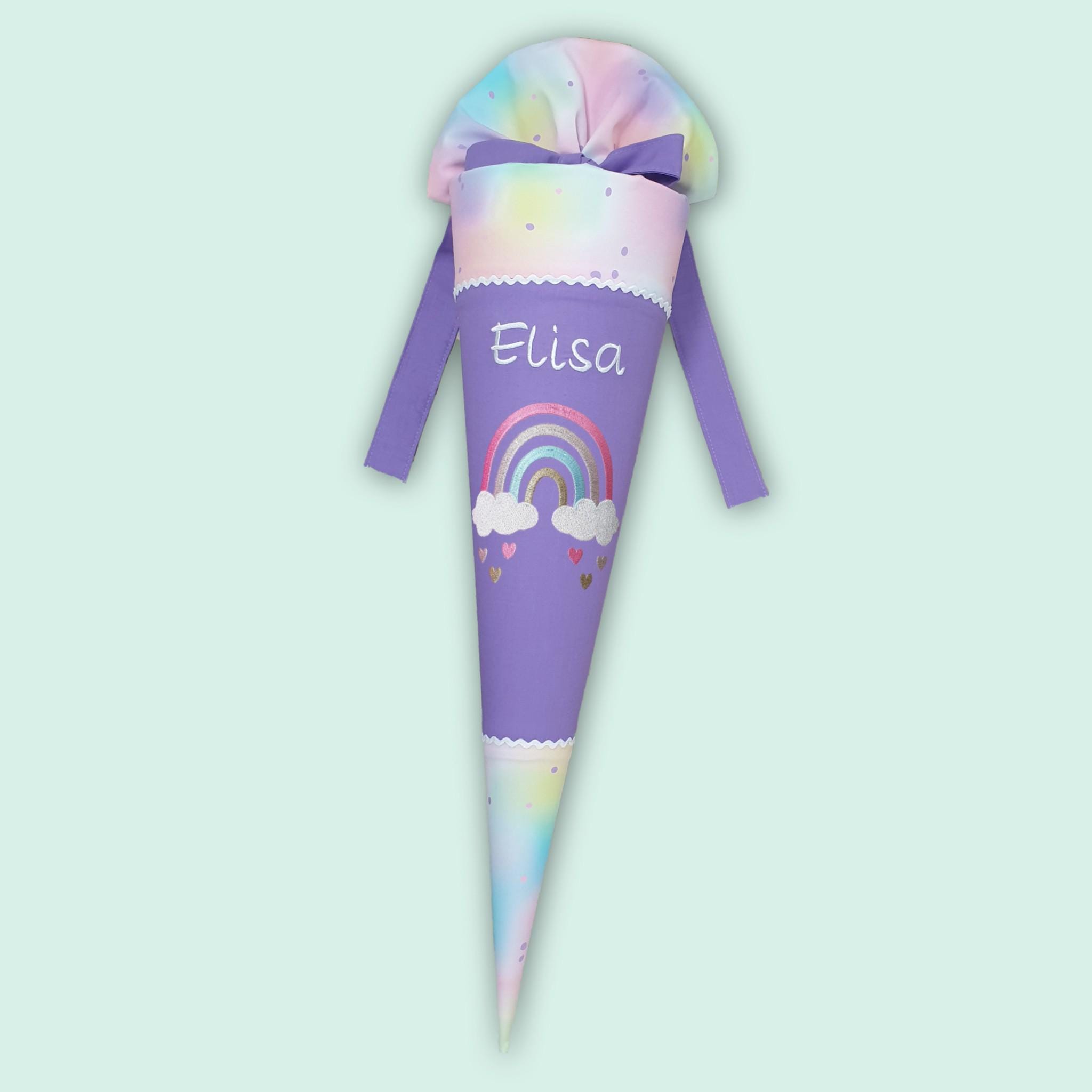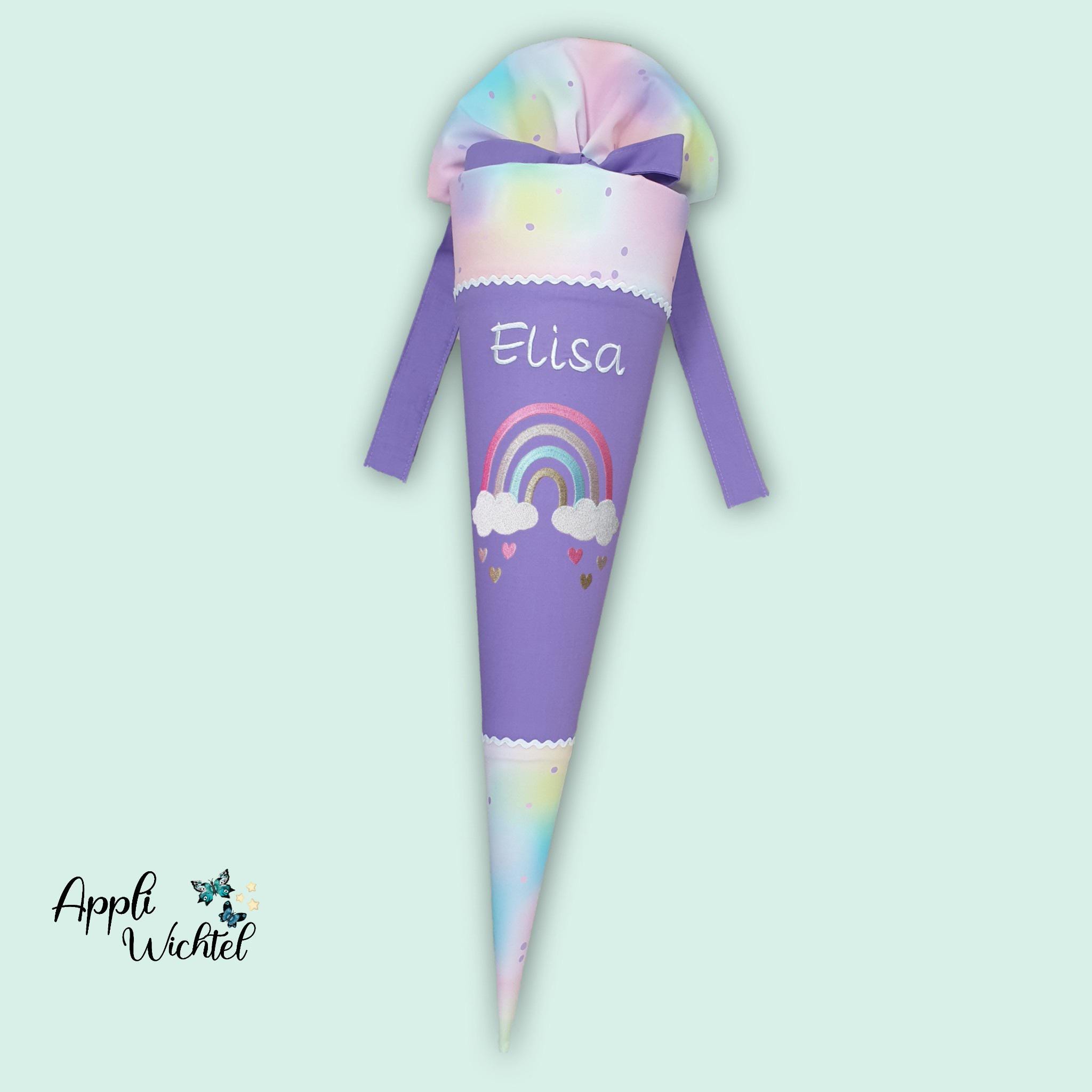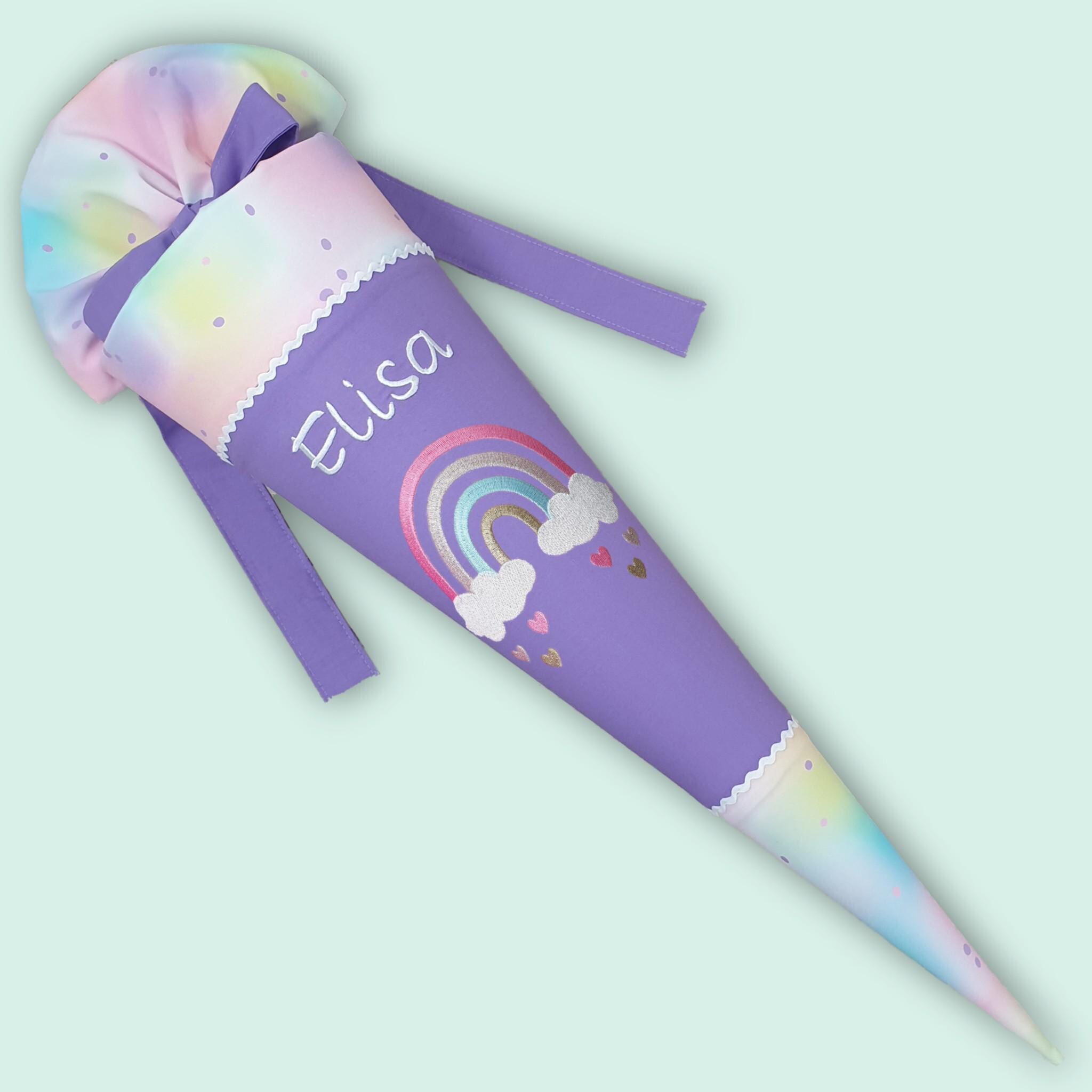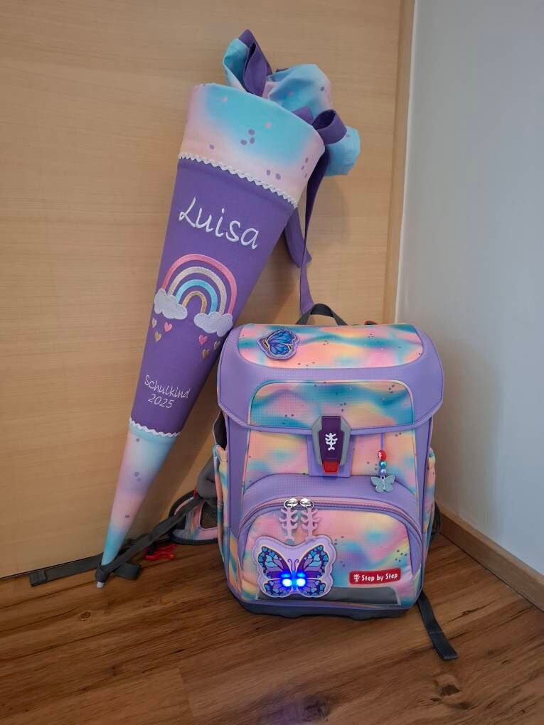 Schultüte mit Regenbogen und Namen farblich auf den Step by step Butterfly Luna abgestimmt.