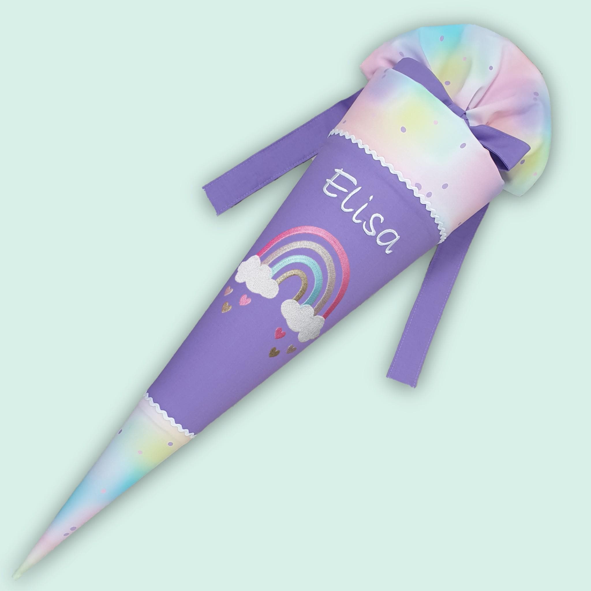 Jede Schultüte wird mit einem gestickten Motiv und dem Namen deines Kindes individuell gestaltet. Auf Wunsch fügen wir auch das Datum des ersten Schultages hinzu.