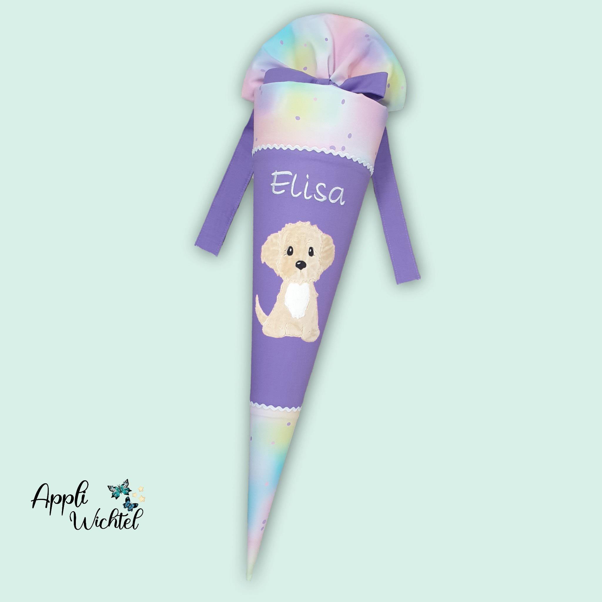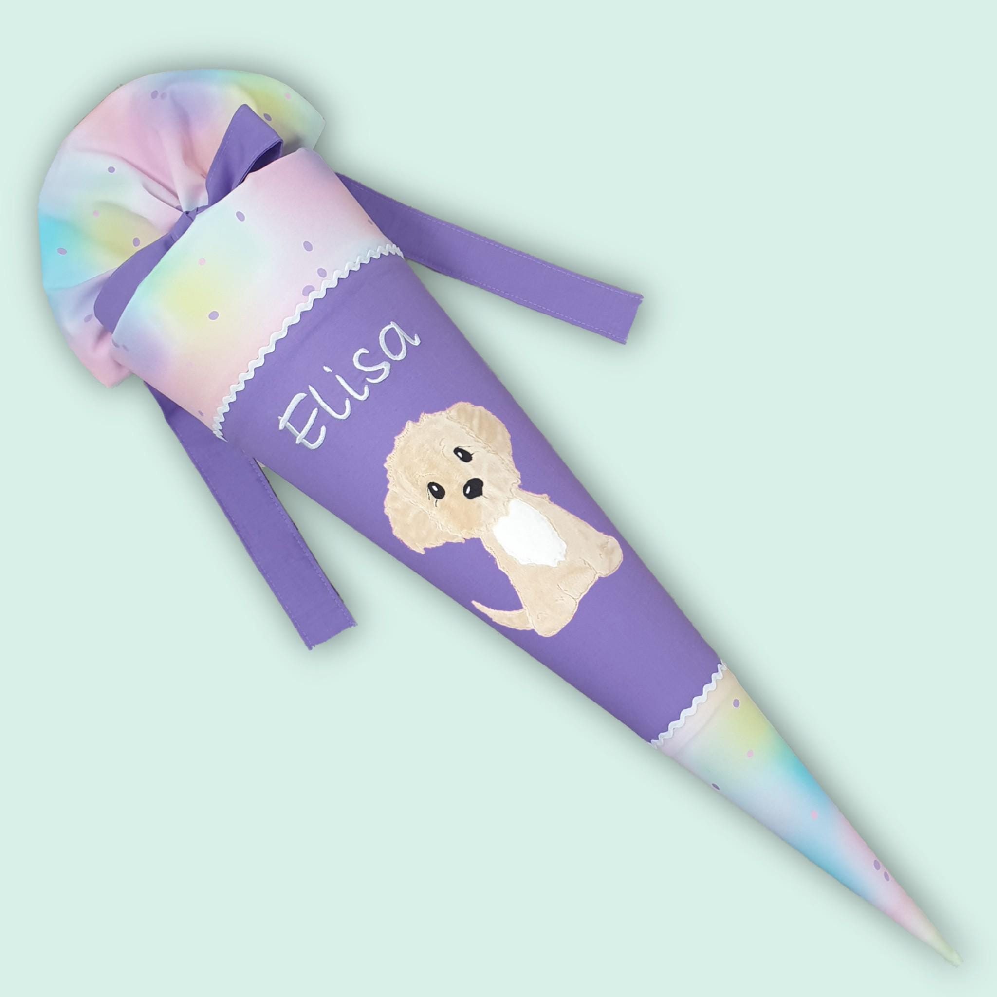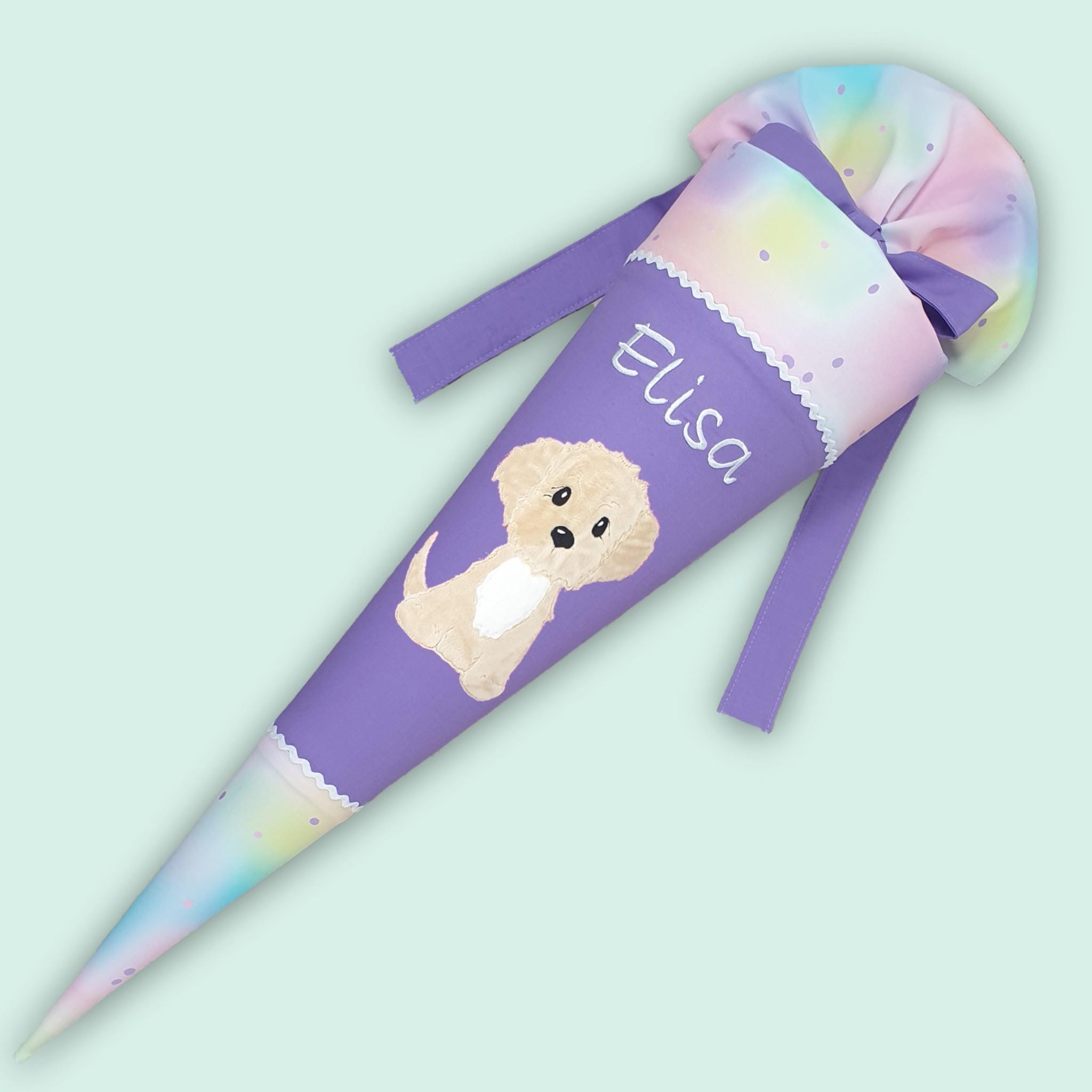 Schultüte mit Hund und Namen farblich auf den Step by step Butterfly Luna abgestimmt.