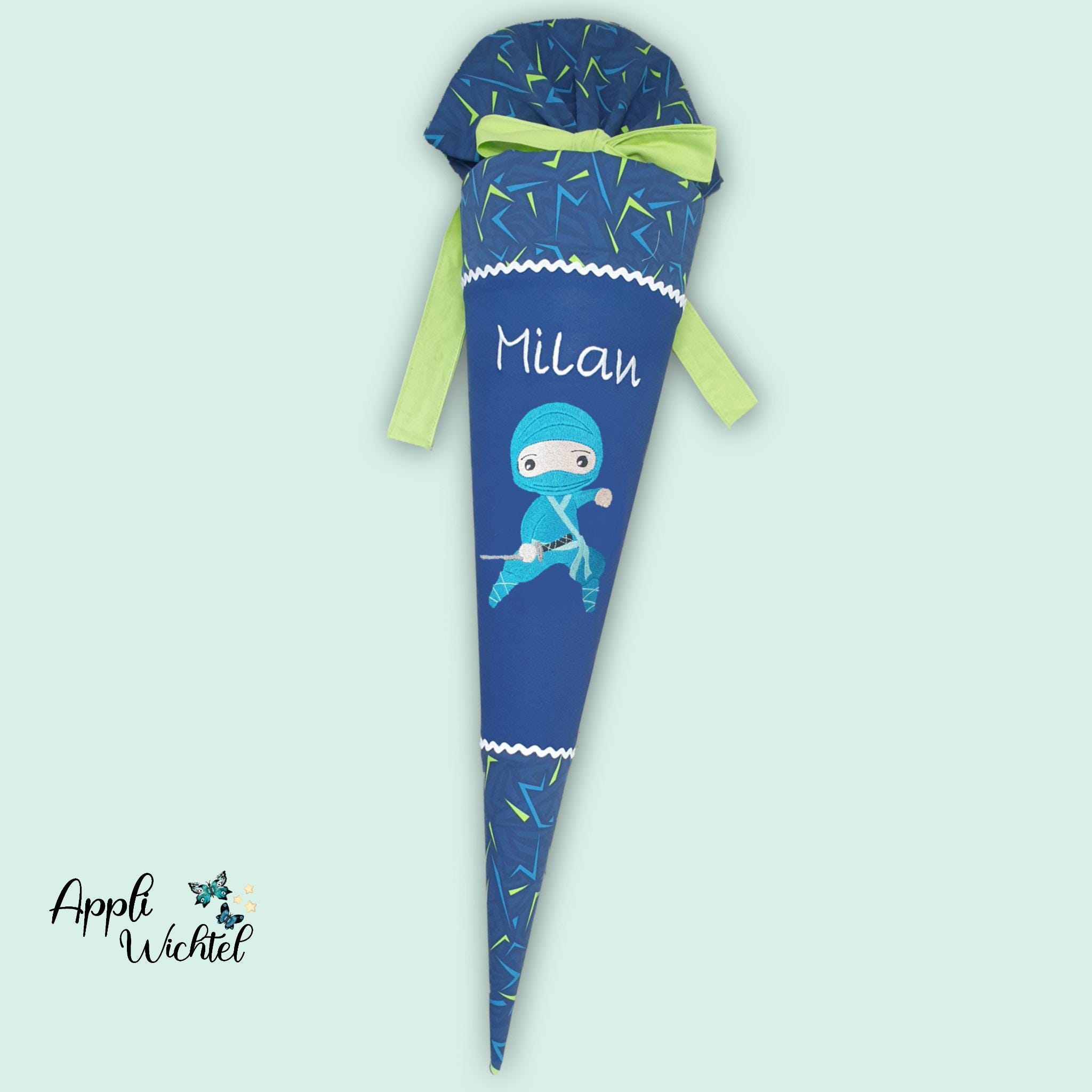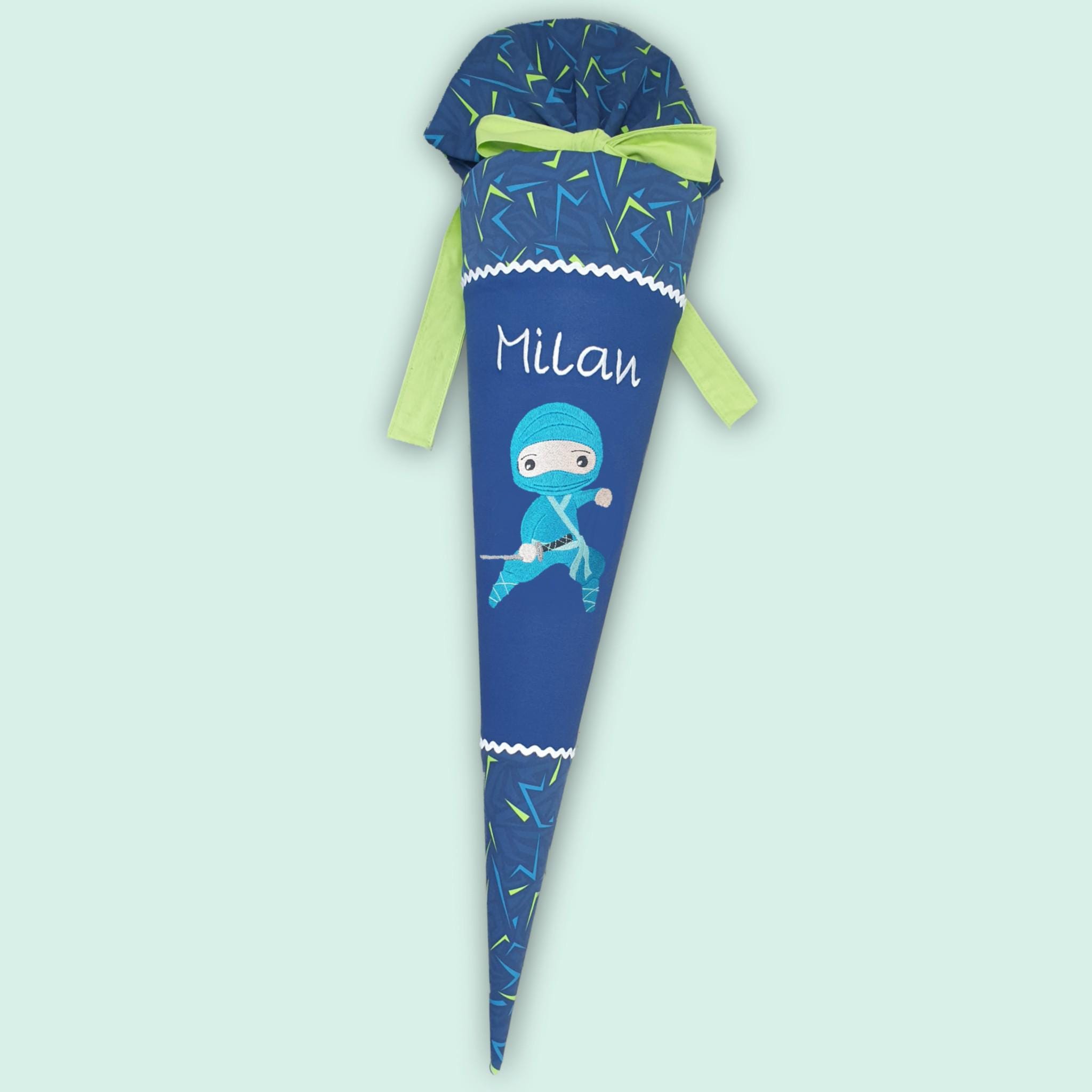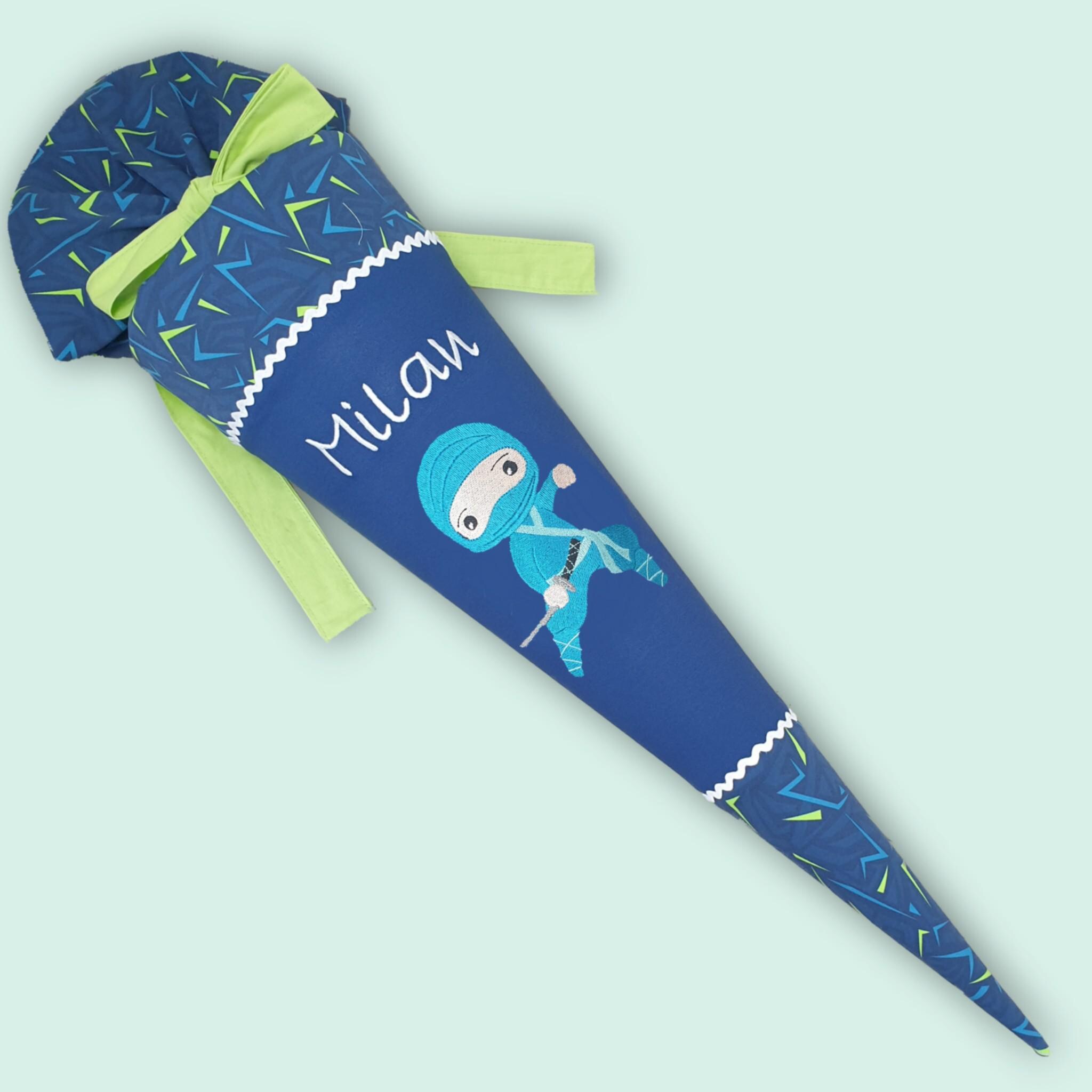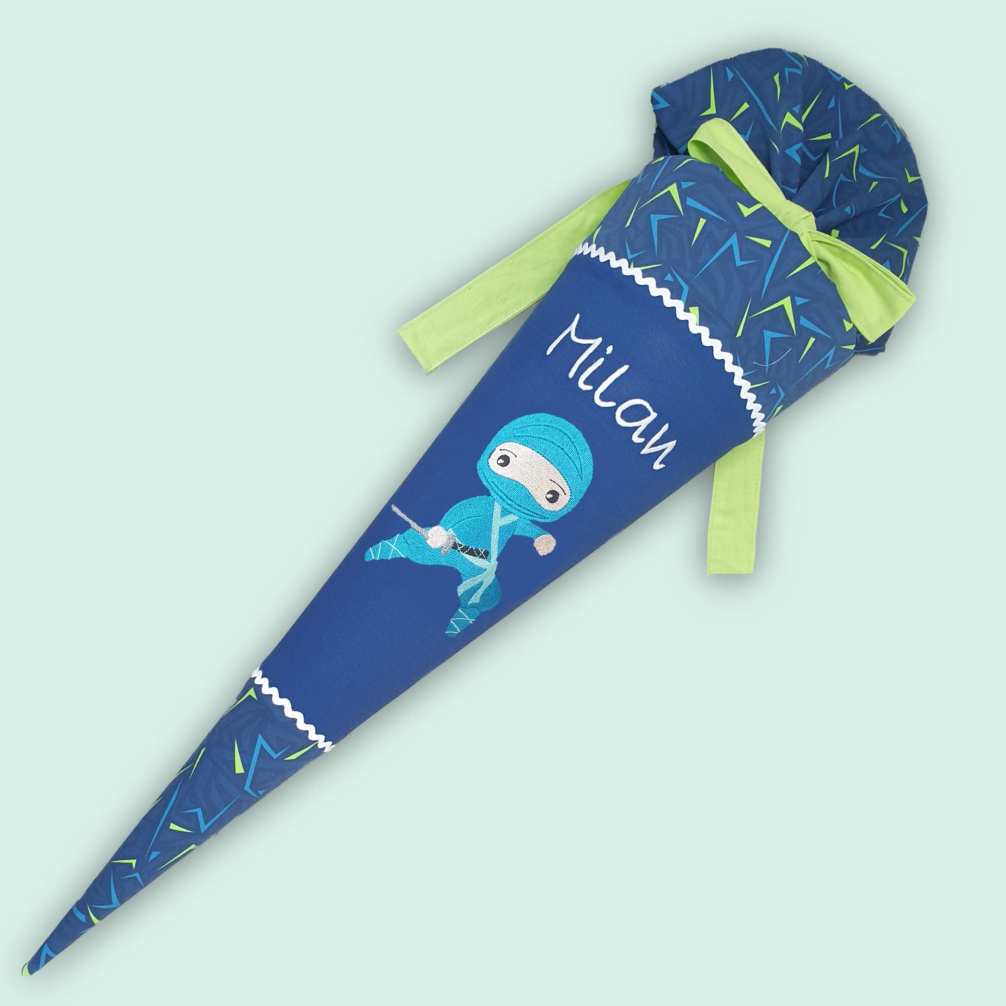Schultüte mit Ninja und Namen farblich auf den Spitzenreitbär Schulranzen abgestimmt.