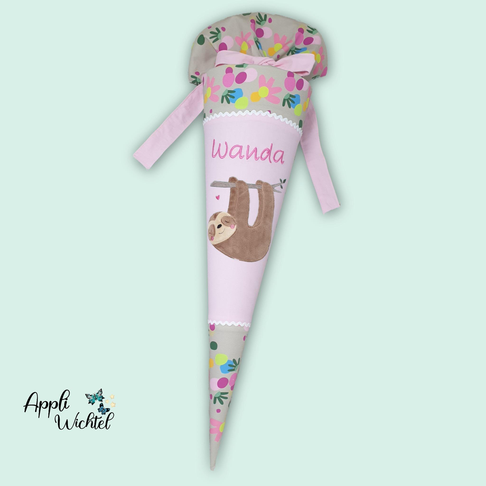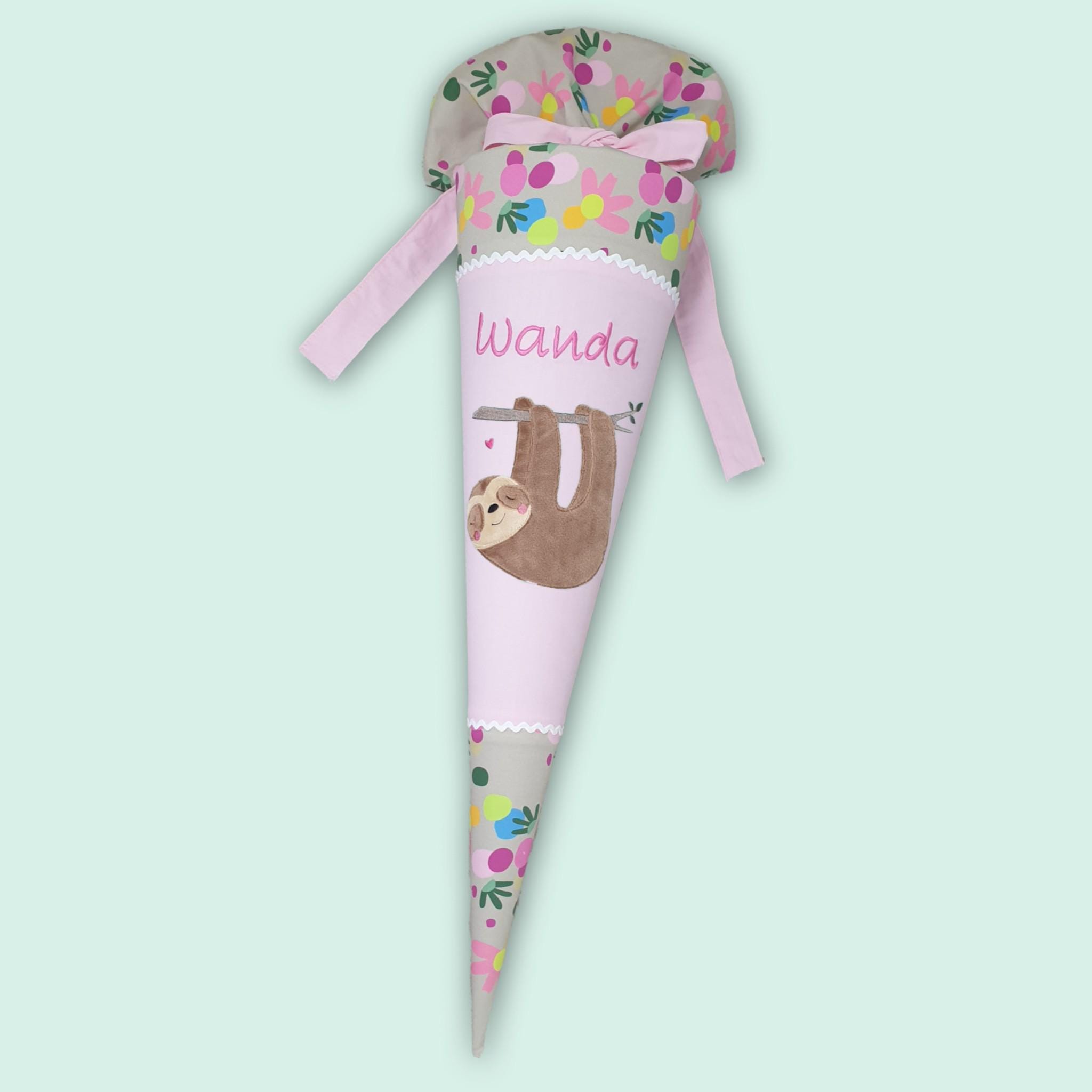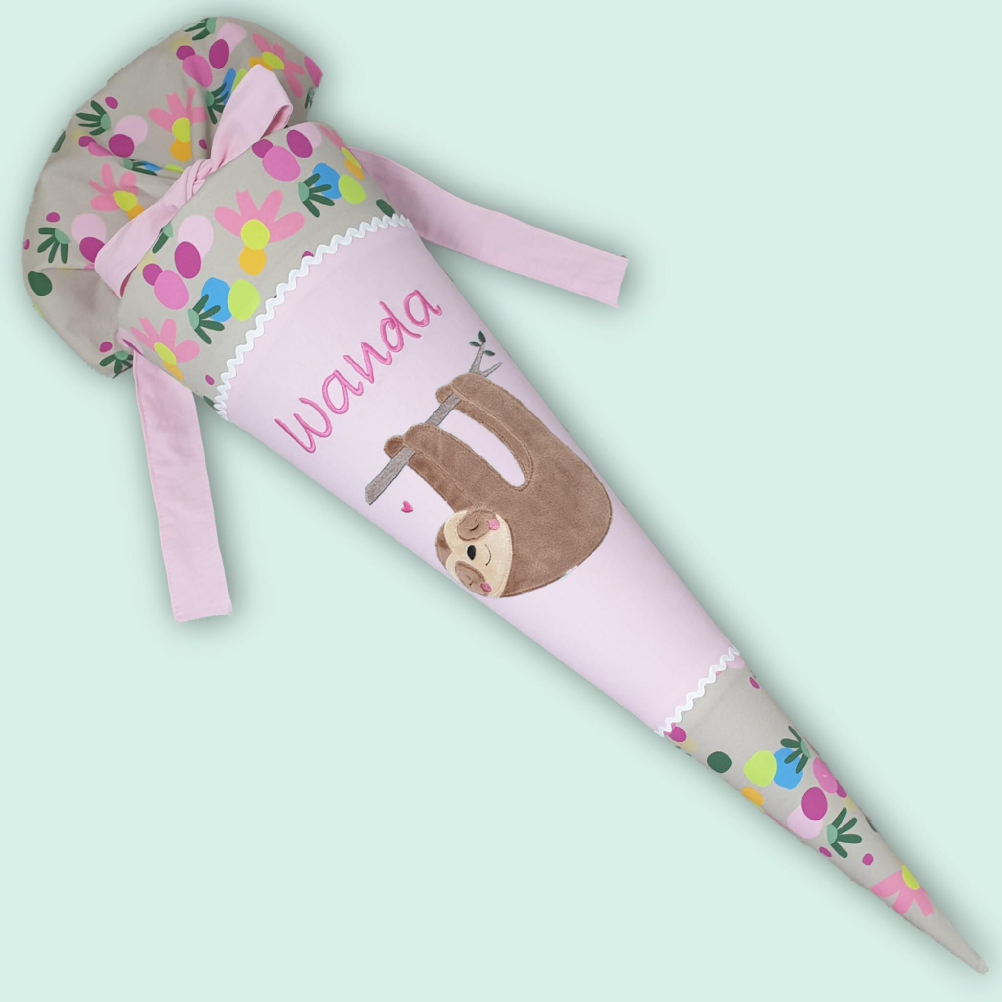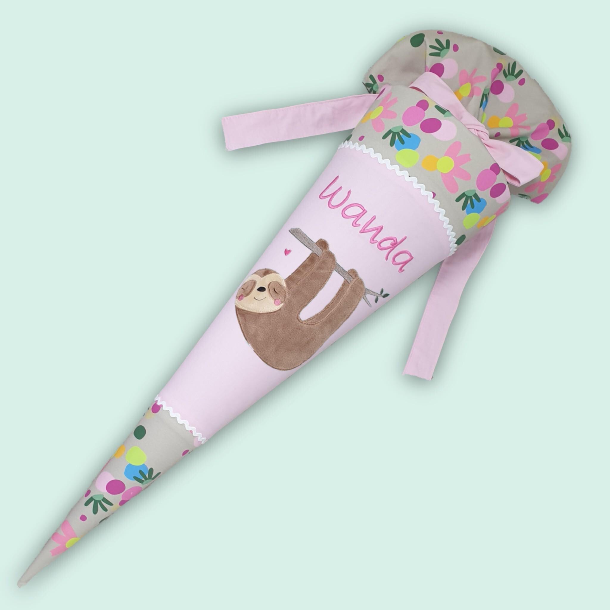 Schultüte mit Faultier und Namen farblich auf den Flower Powbär Schulranzen abgestimmt.