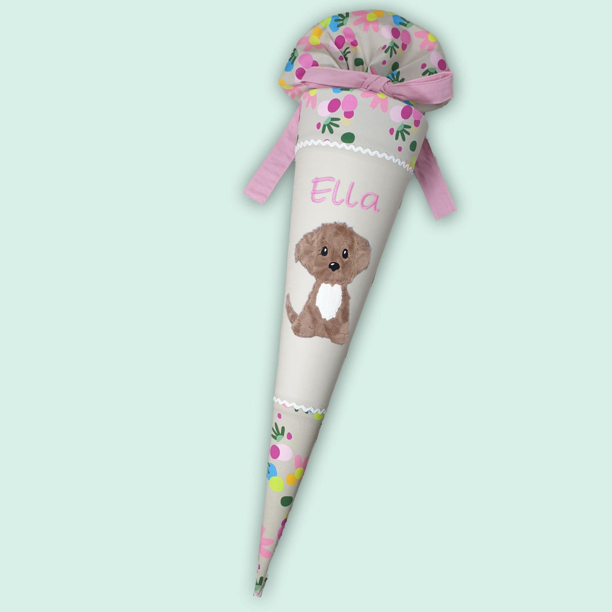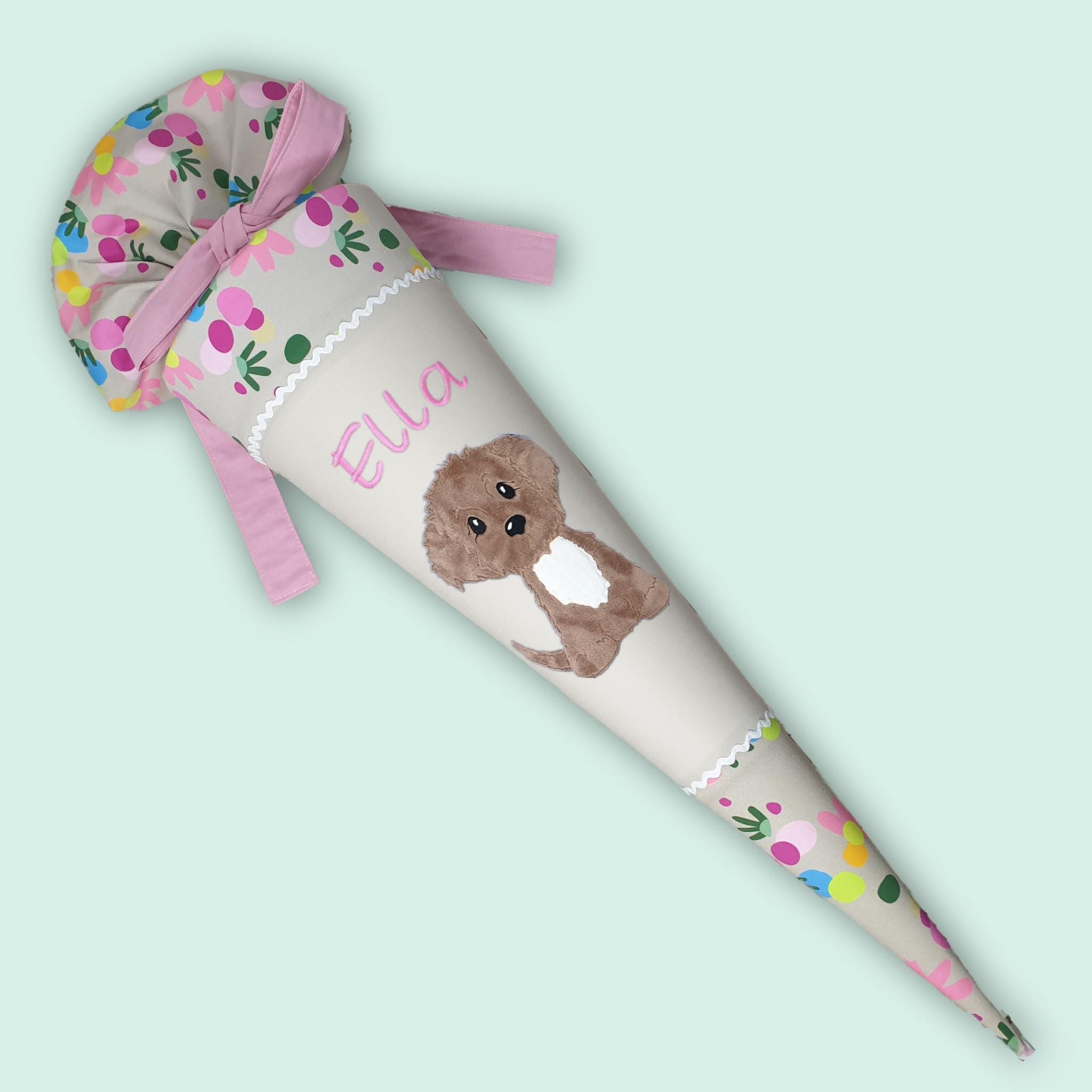 Schultüte mit Hund und Namen farblich auf den Flower Powbär Schulranzen abgestimmt.