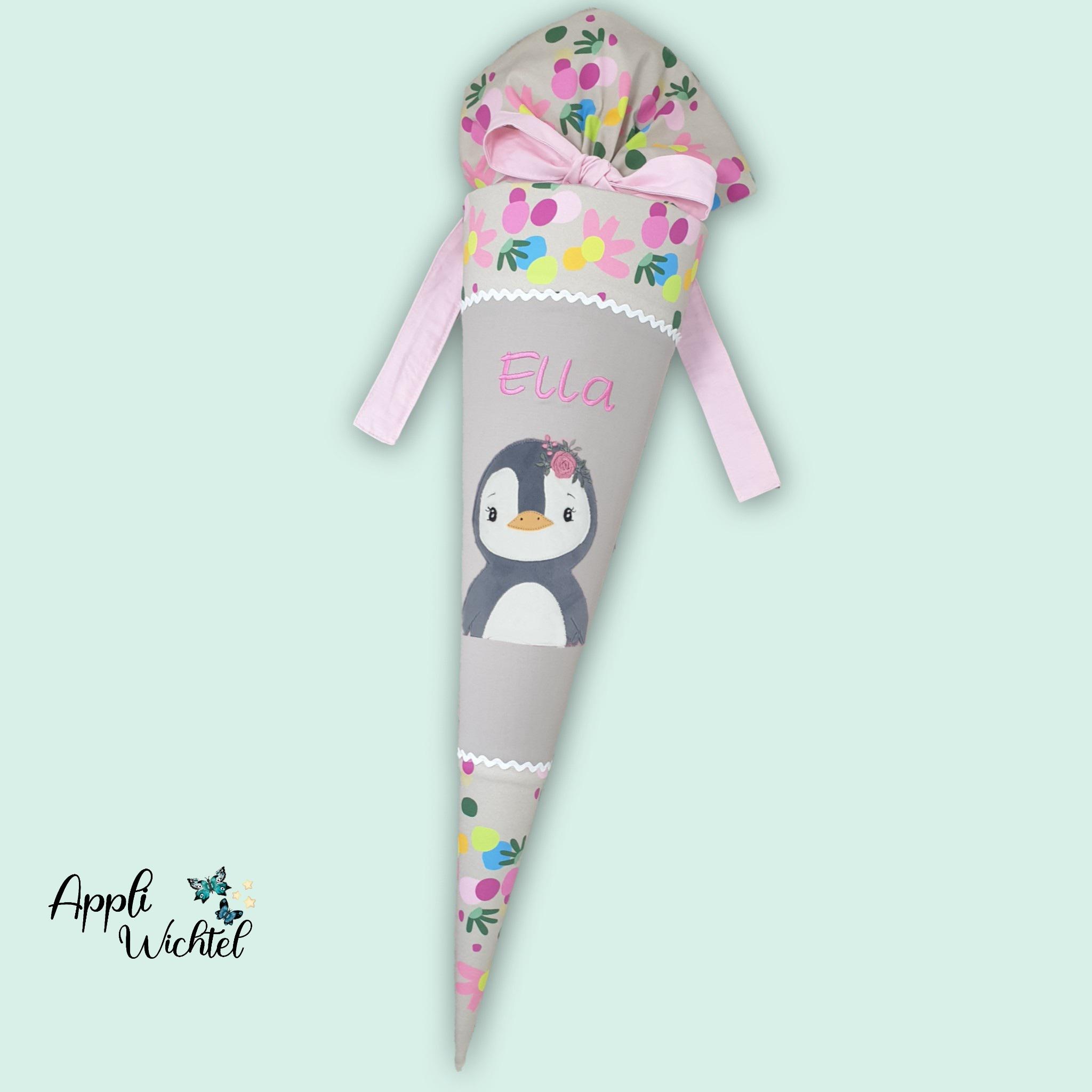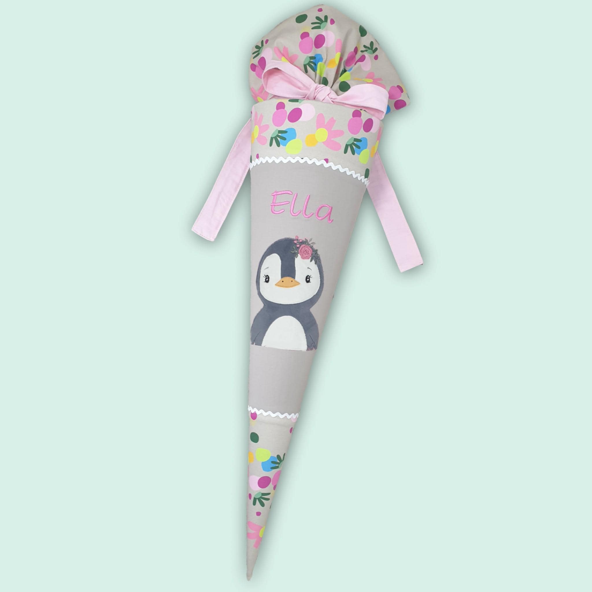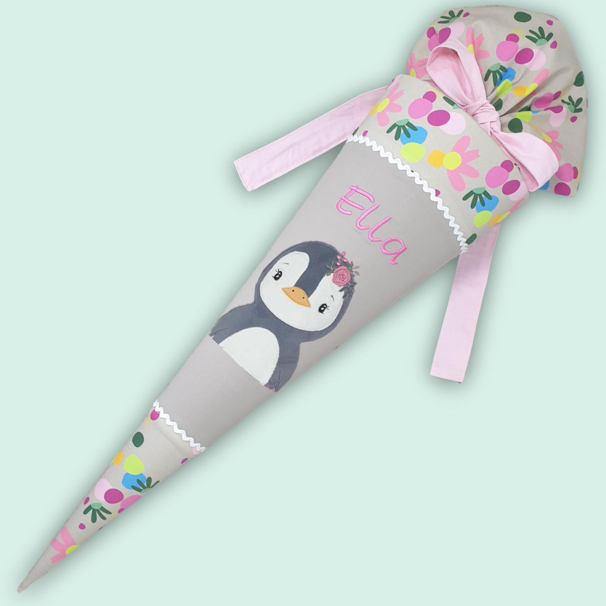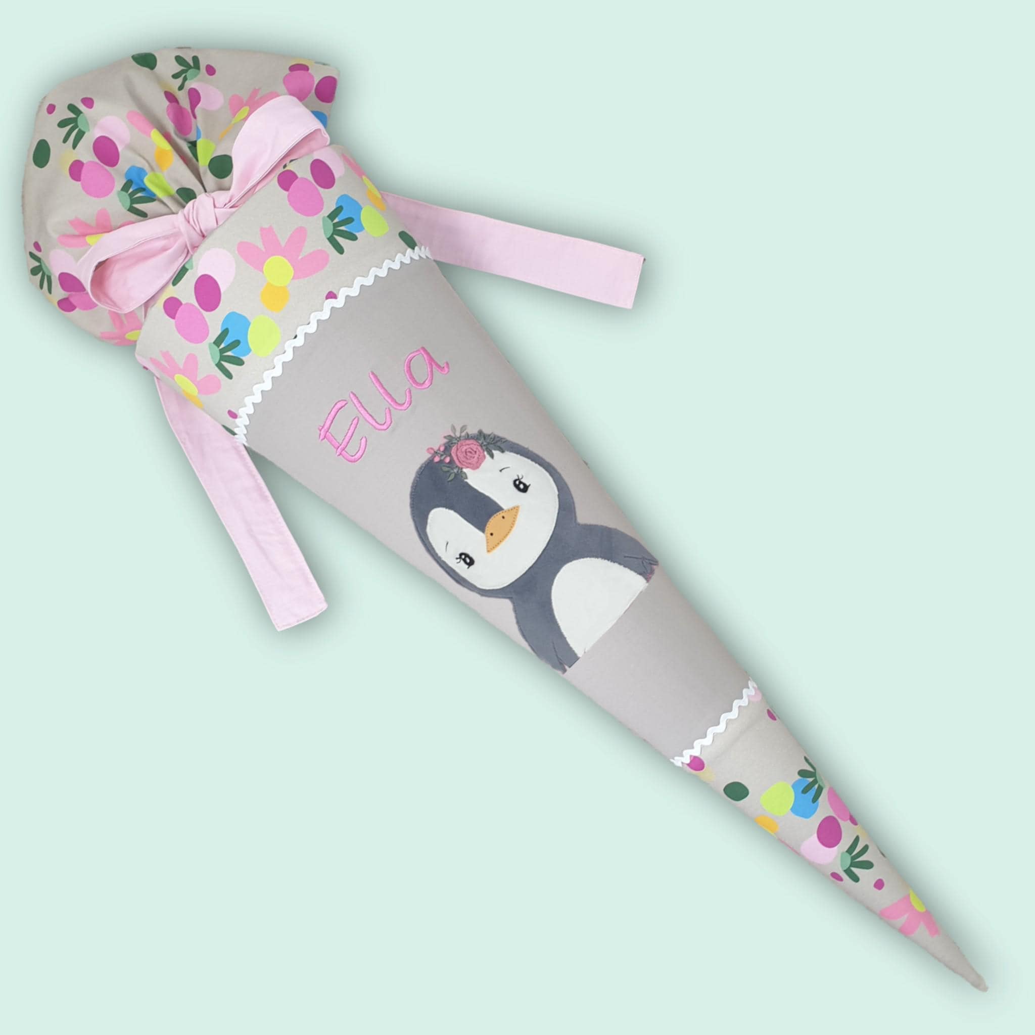 Schultüte mit Pinguin und Namen farblich auf den Flower Powbär Schulranzen abgestimmt.