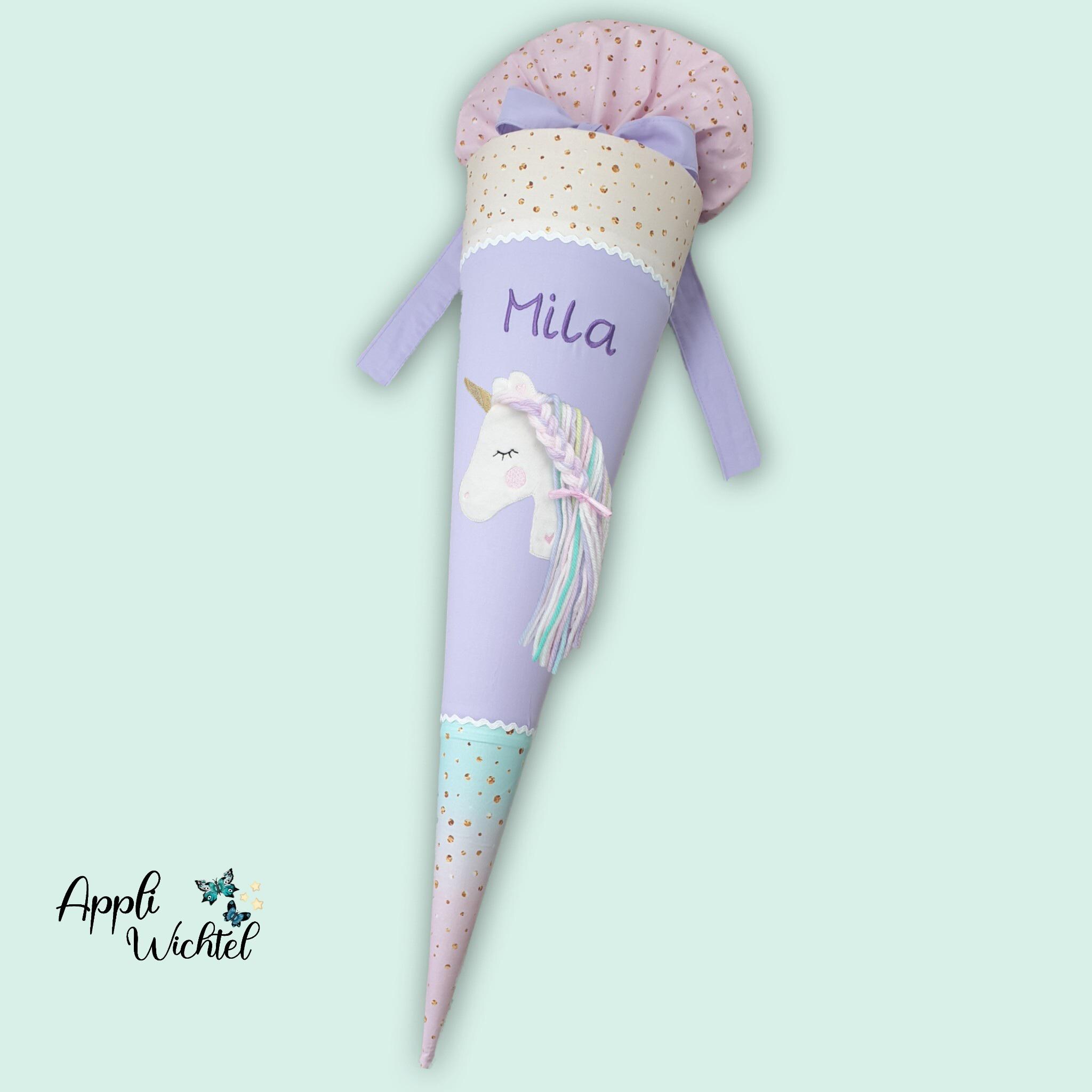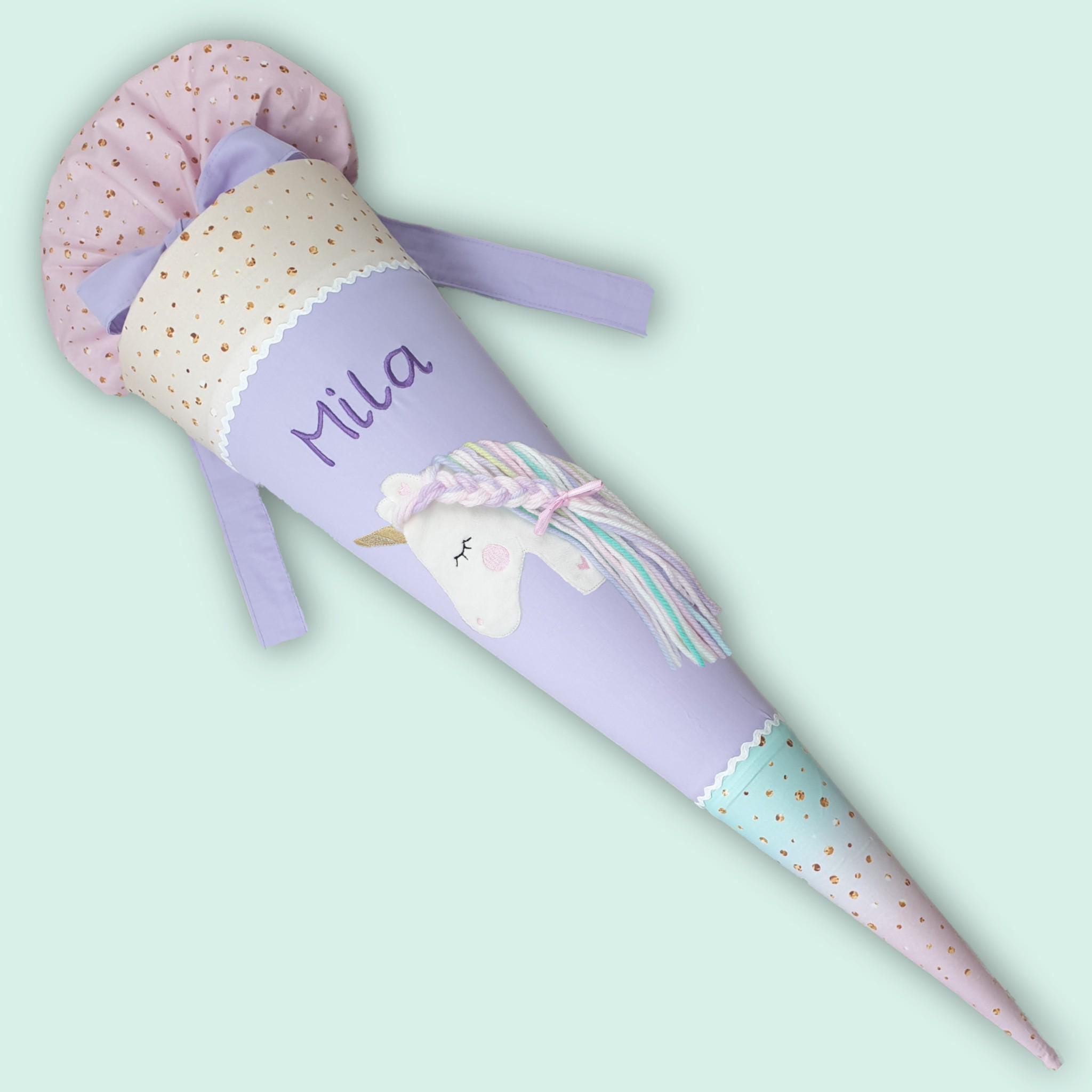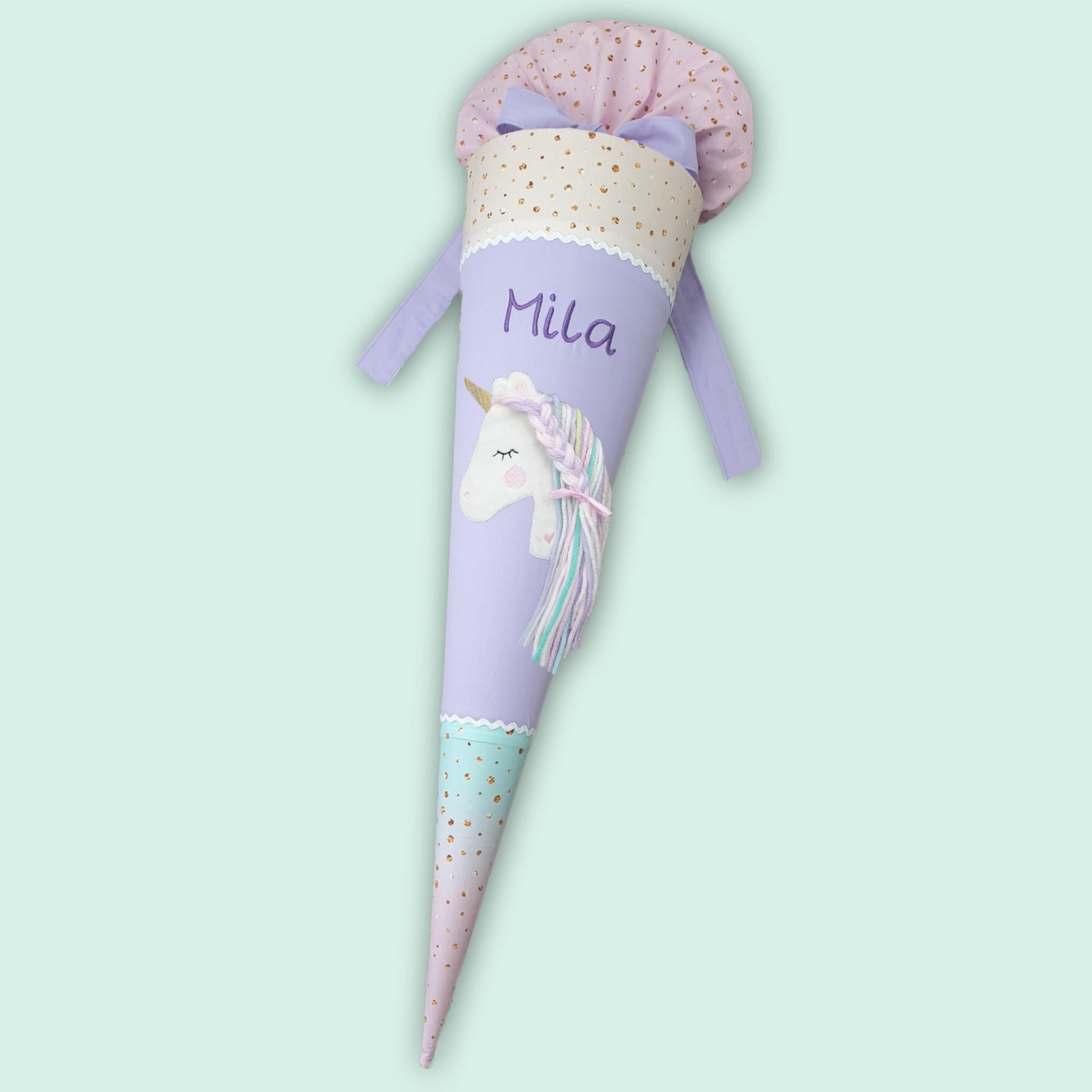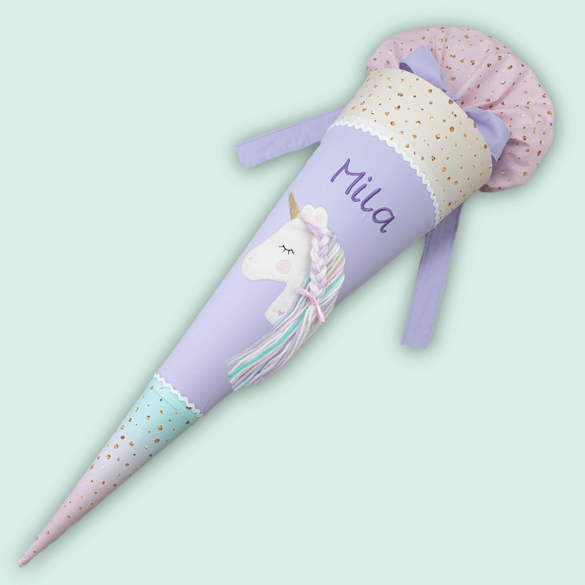 Schultüte mit Einhorn und Namen in pastel Regenbogenfarben passend zu vielen Schulranzen mit Regenbogen Farbverlauf