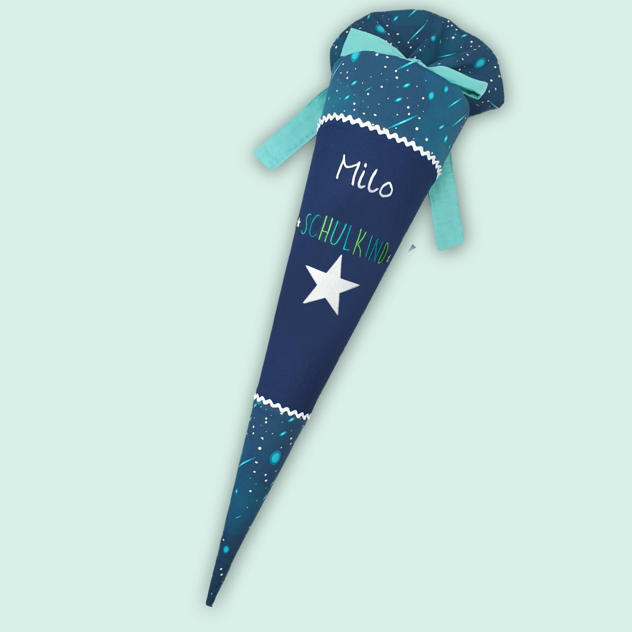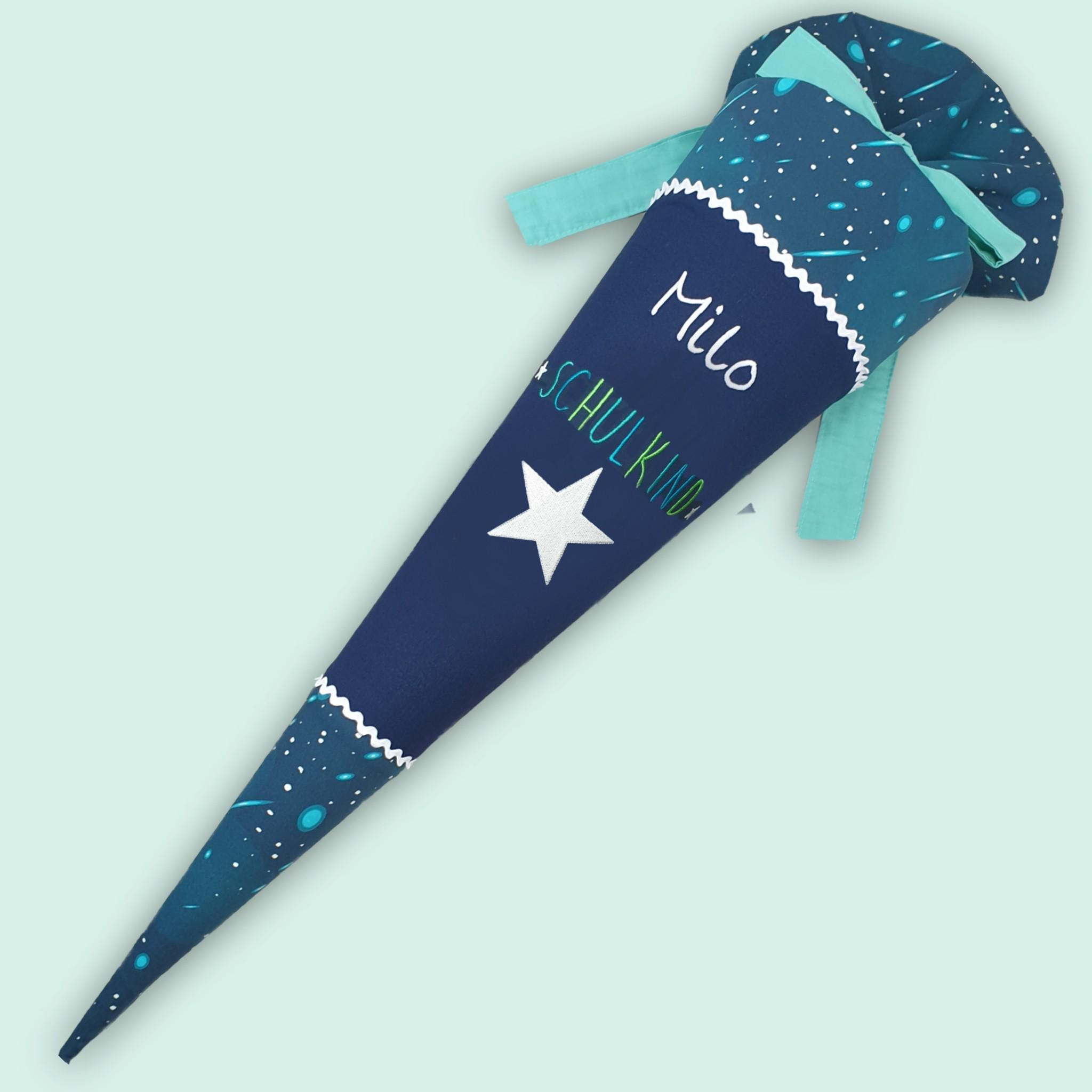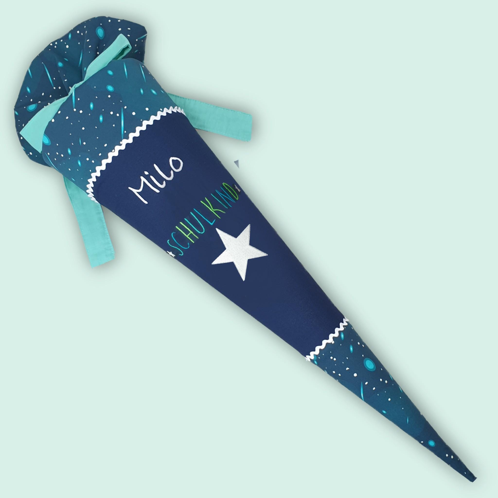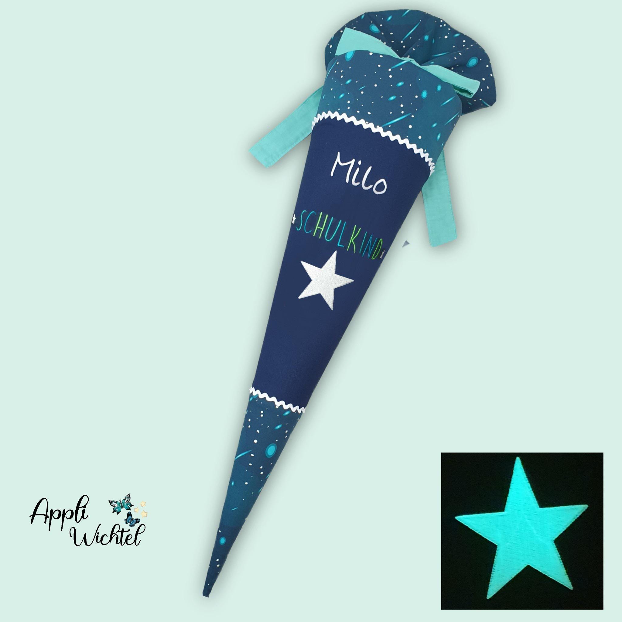 Schultüte mit Schulkind (Sterne leuchten im Dunkeln) und Namen farblich auf den Ergobag RaumfahrBär Schulranzen abgestimmt.