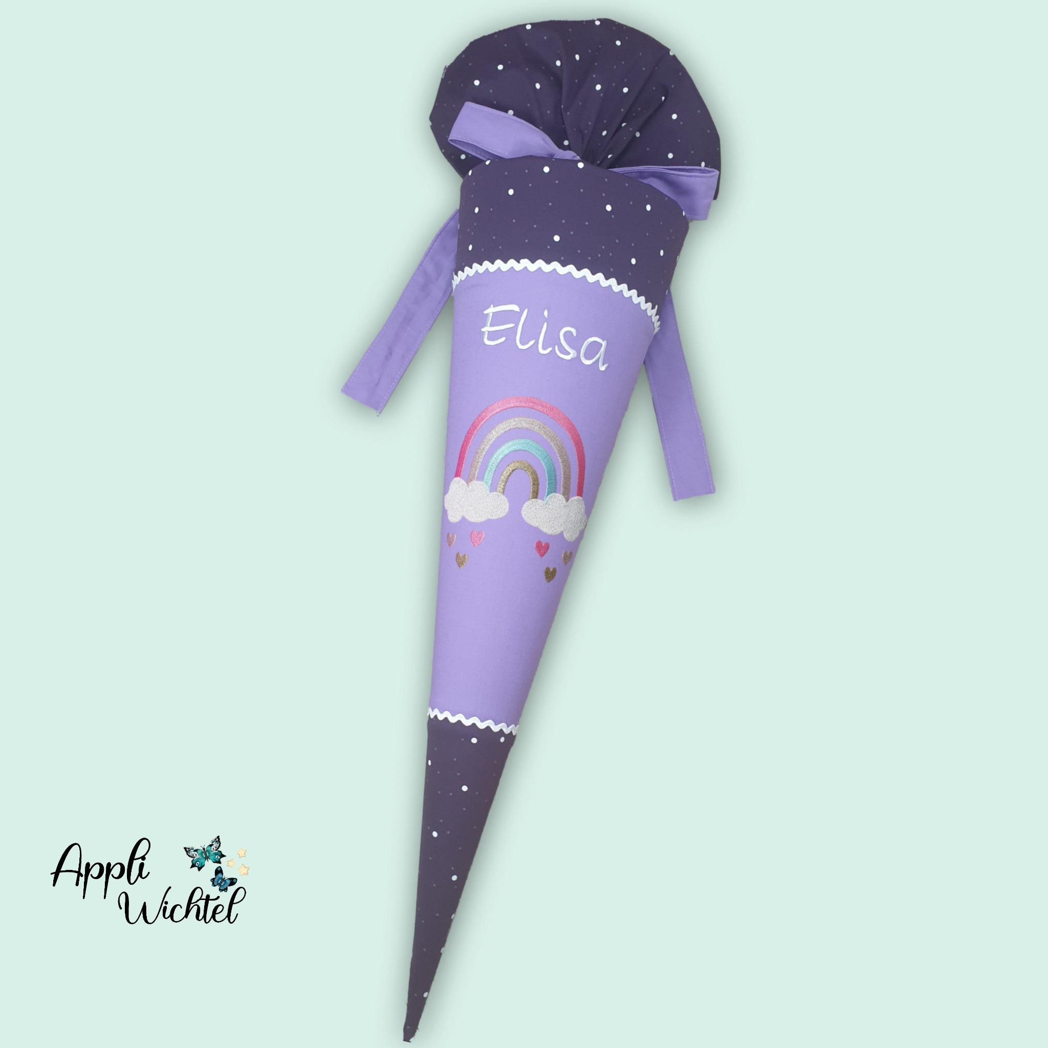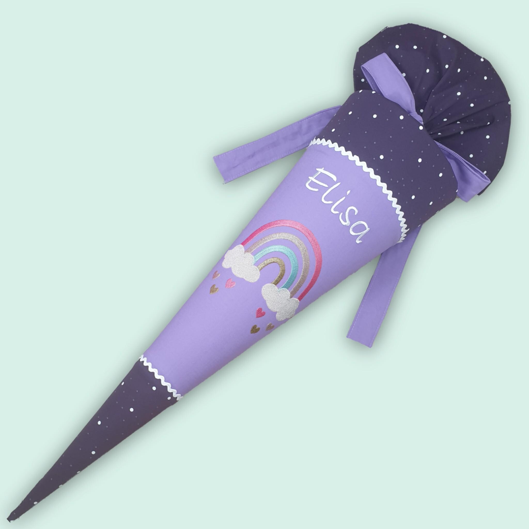 Schultüte mit Regenbogen und Namen farblich auf den Sternguckbär Schulranzen abgestimmt.