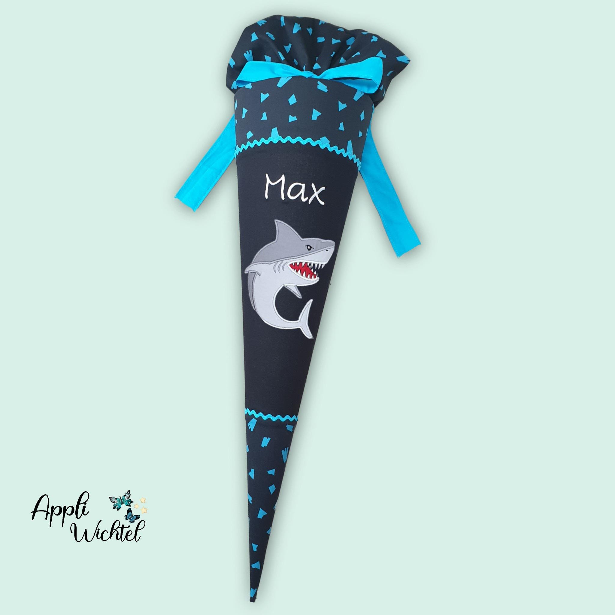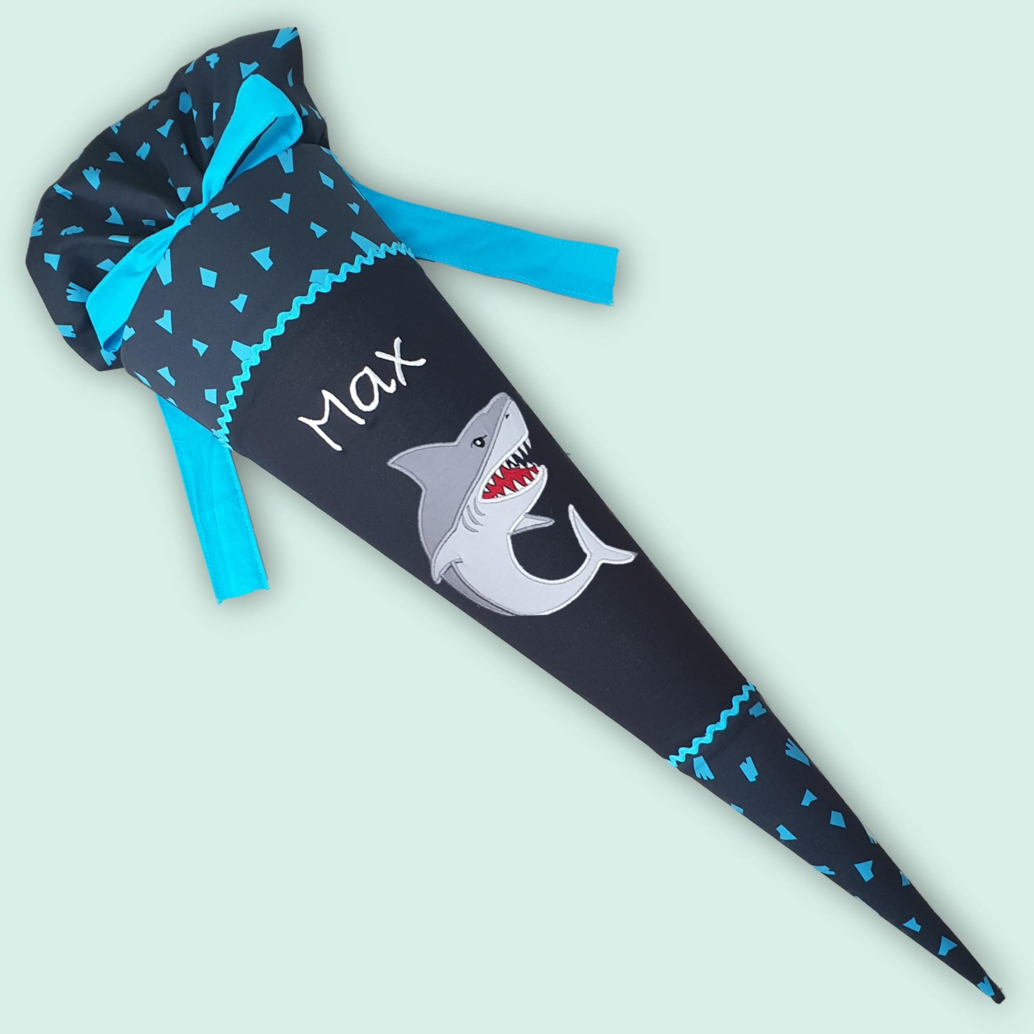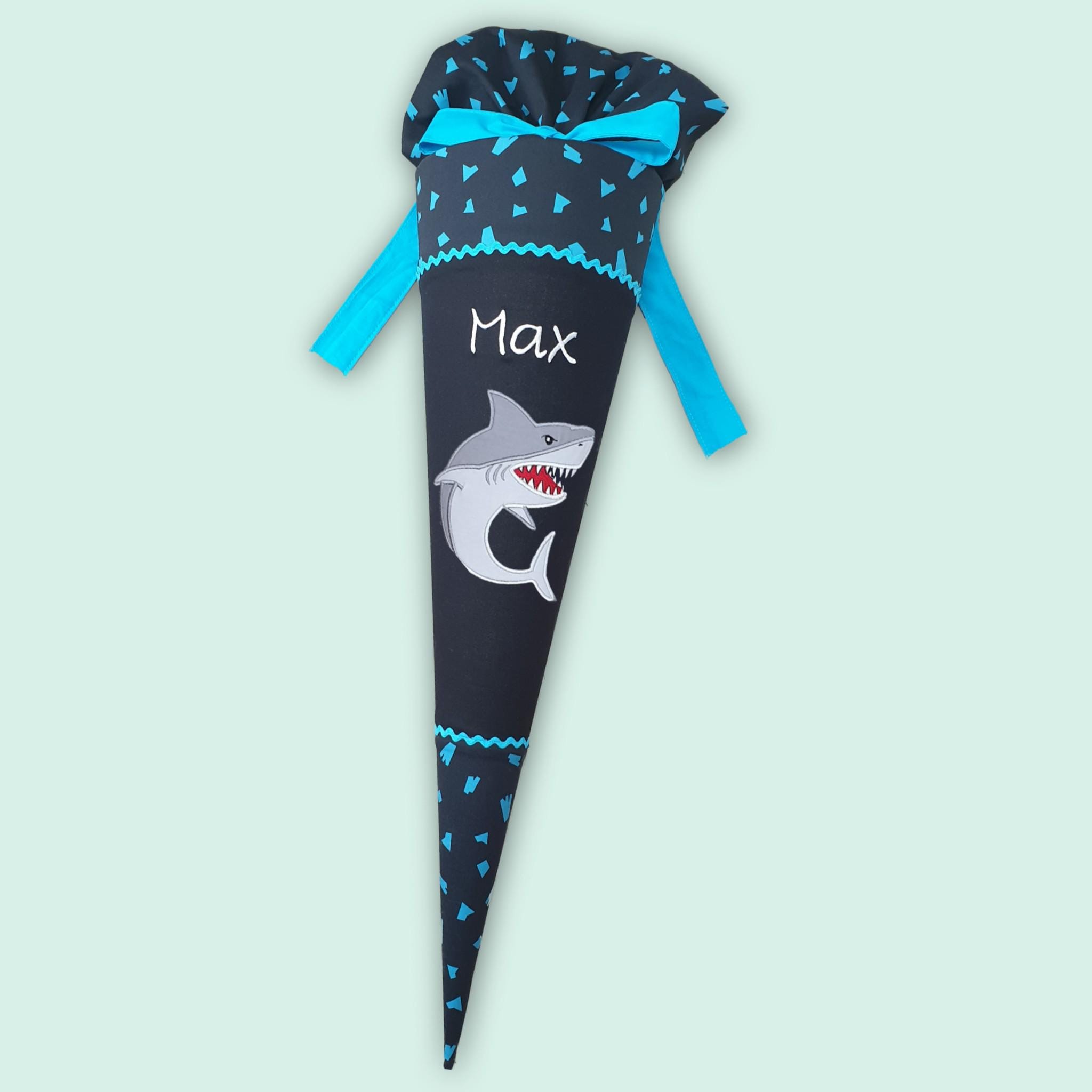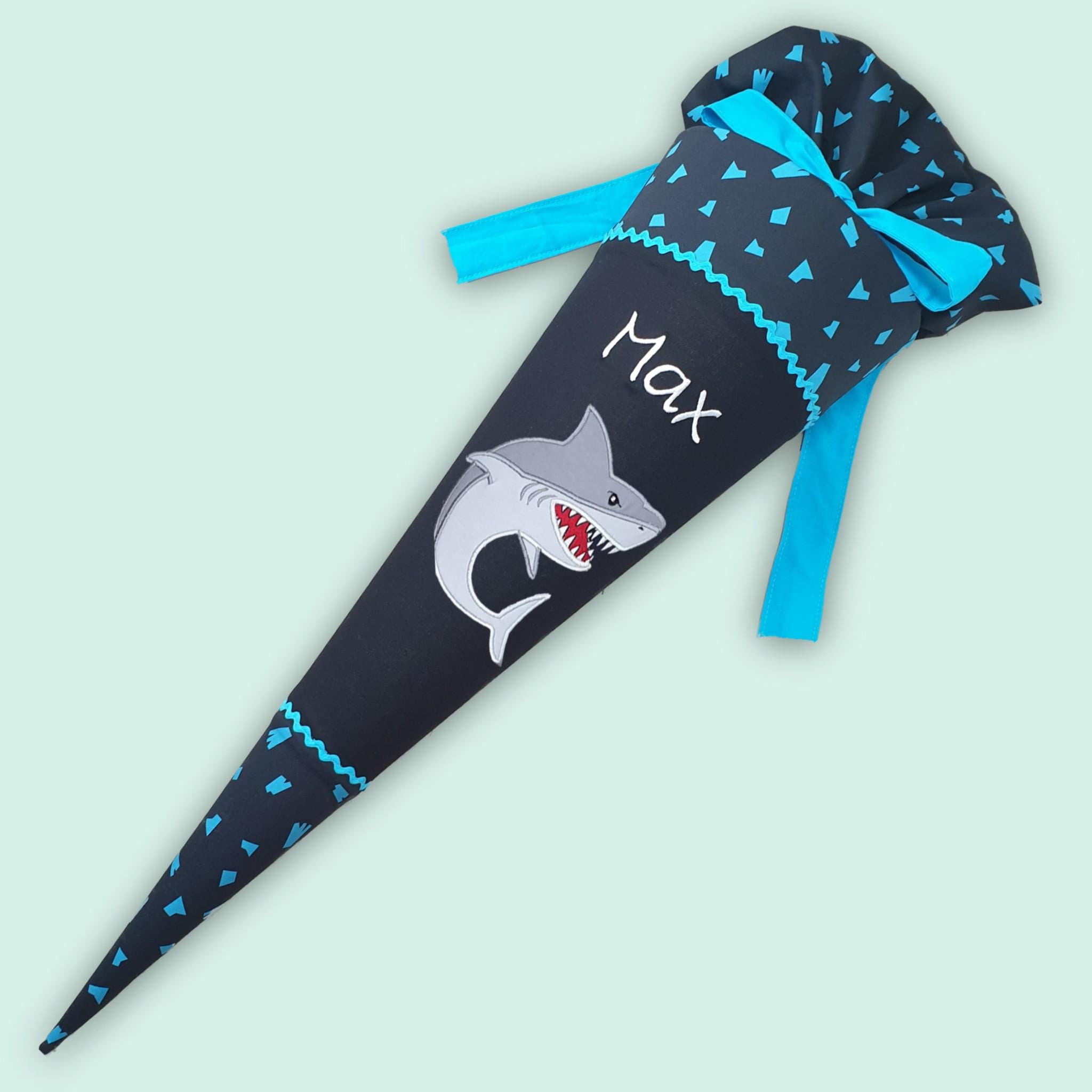 Schultüte mit Hai und Namen farblich auf den Verfolgbärjagd Schulranzen abgestimmt.