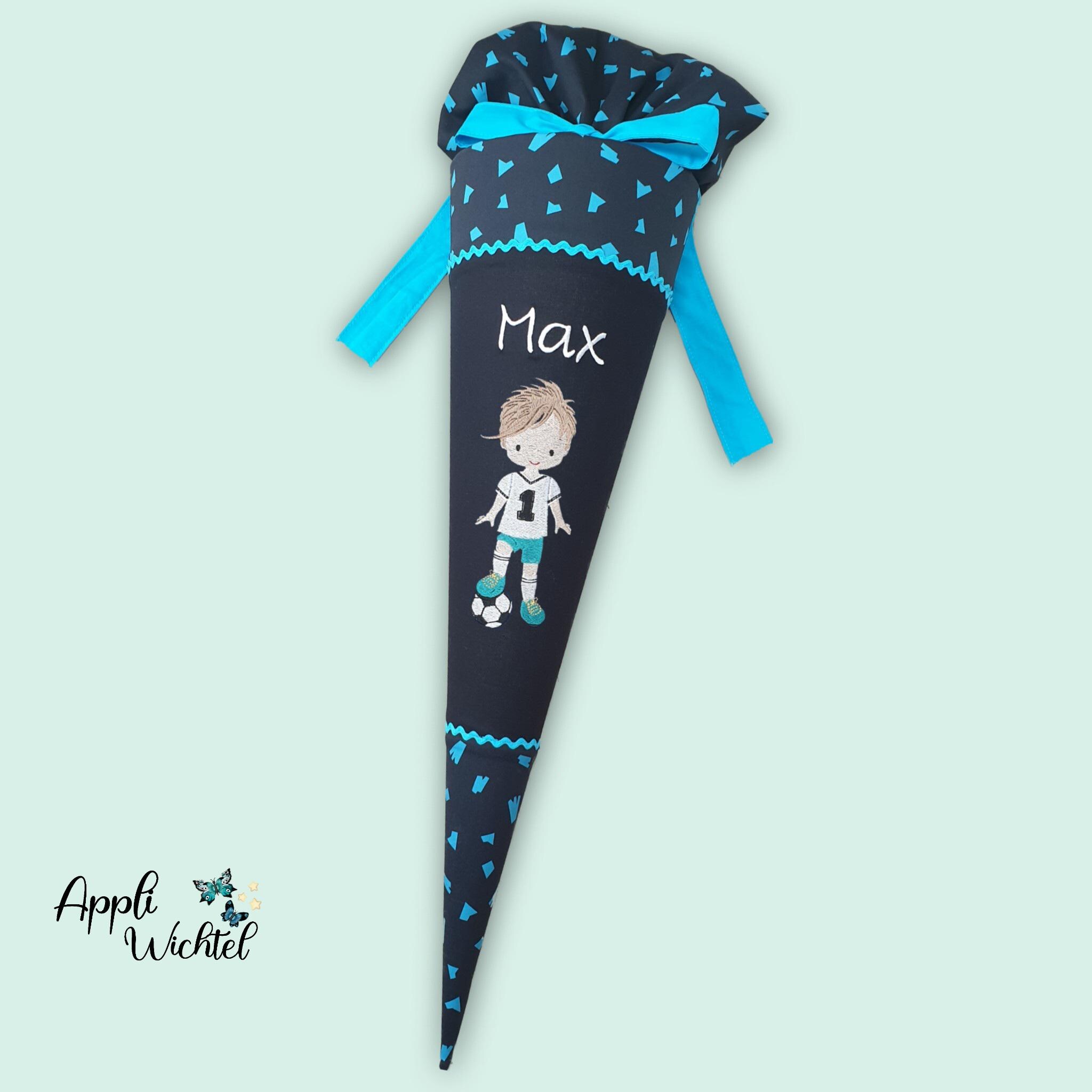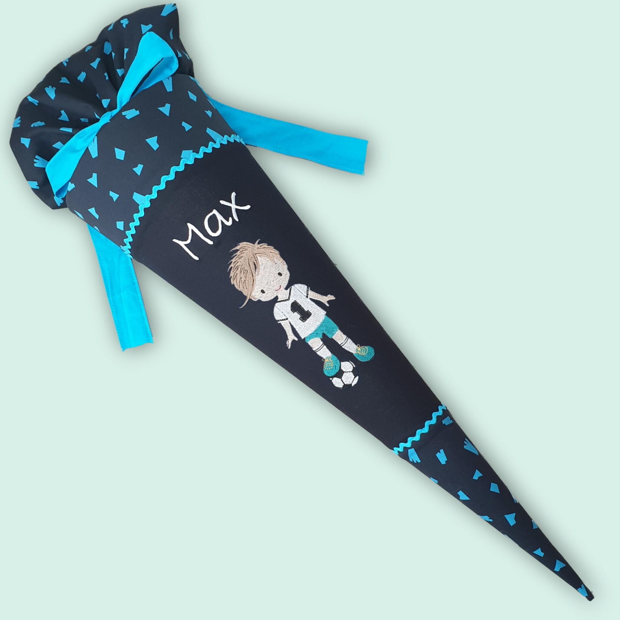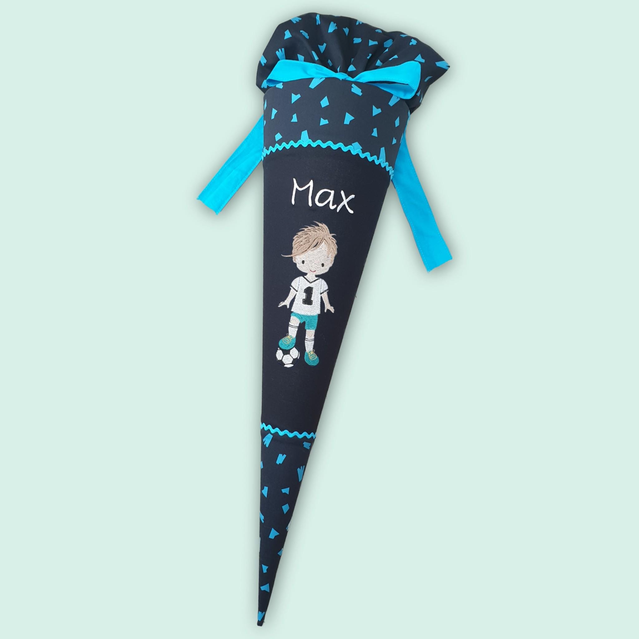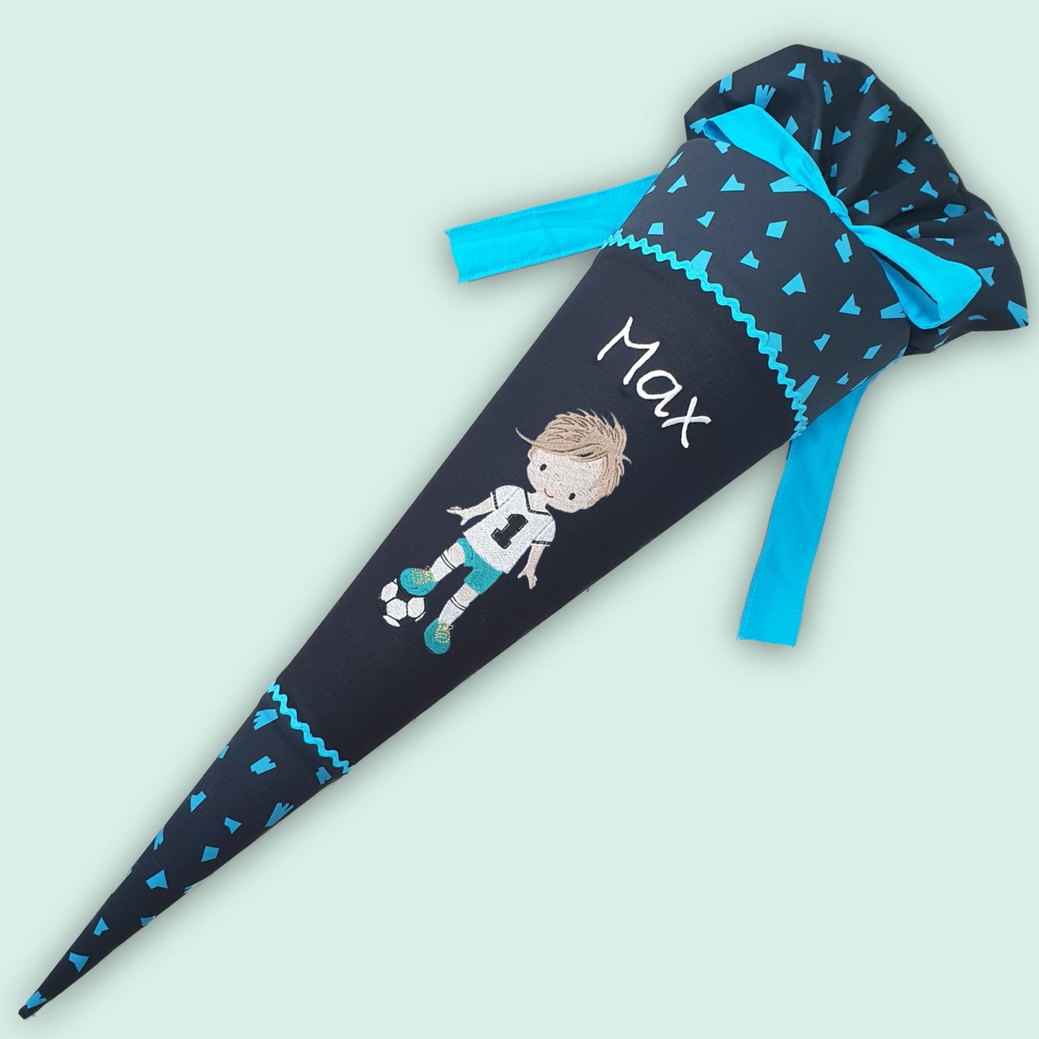 Schultüte mit Fussball und Namen farblich auf den Verfolgbärjagd Schulranzen abgestimmt.