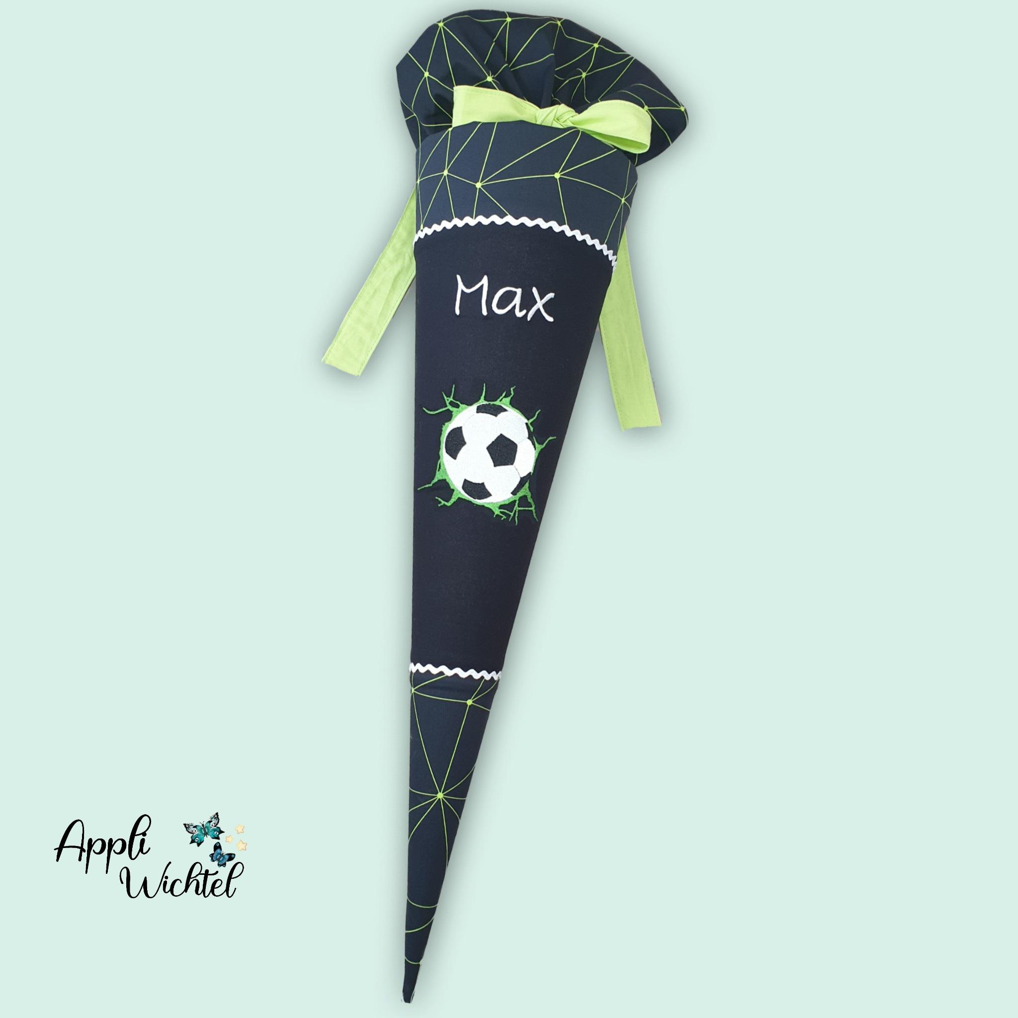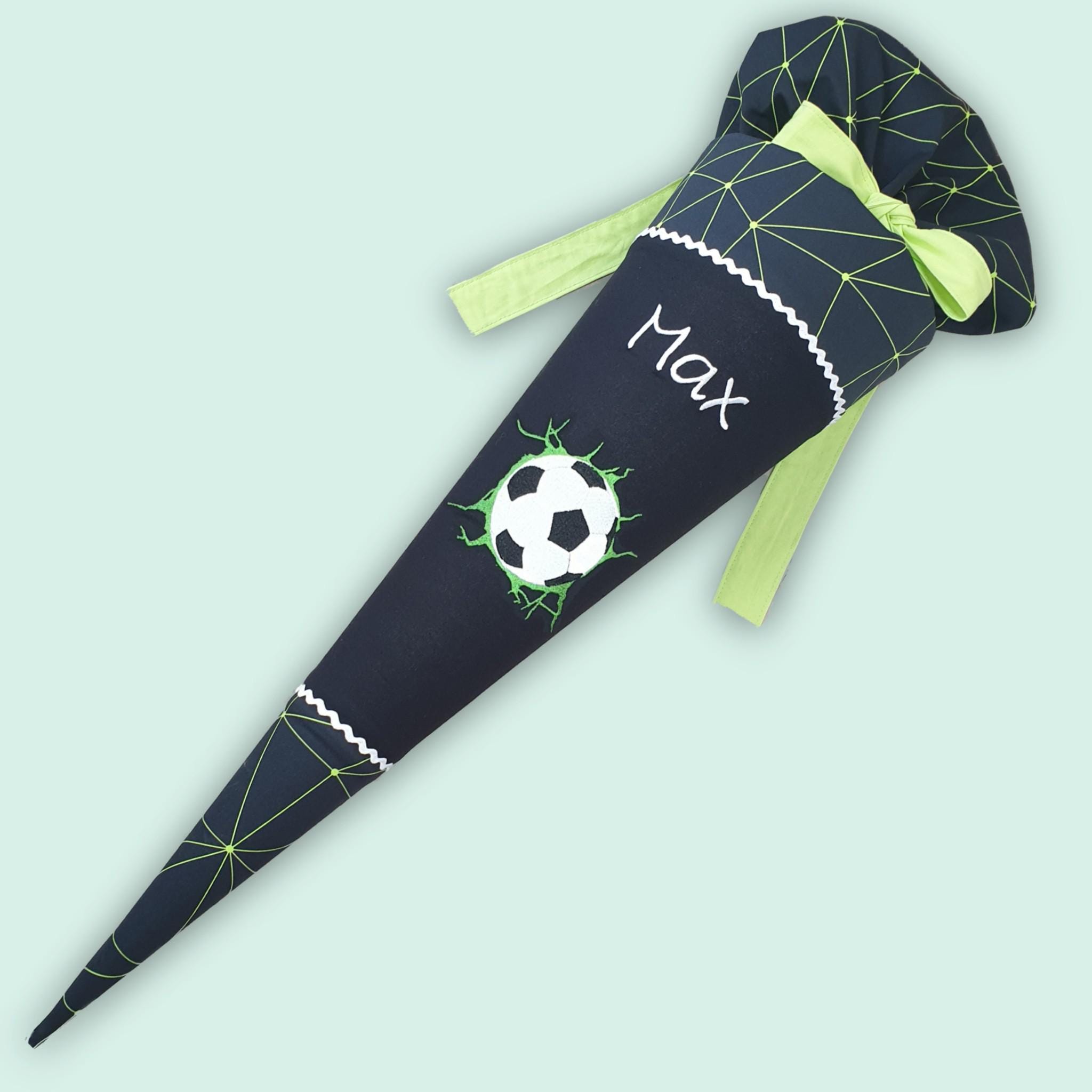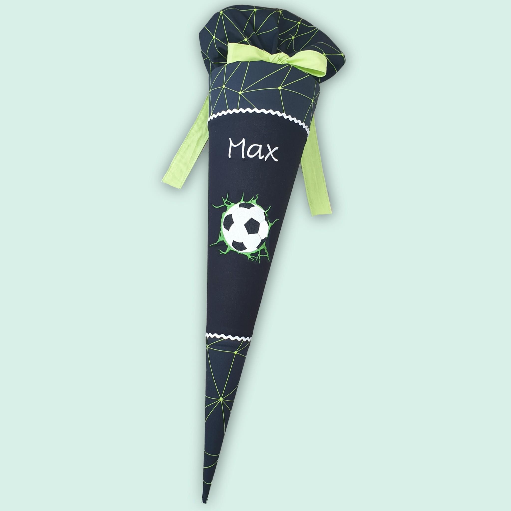 Schultüte mit Fussball und Namen farblich auf den Cybär Race Schulranzen abgestimmt.