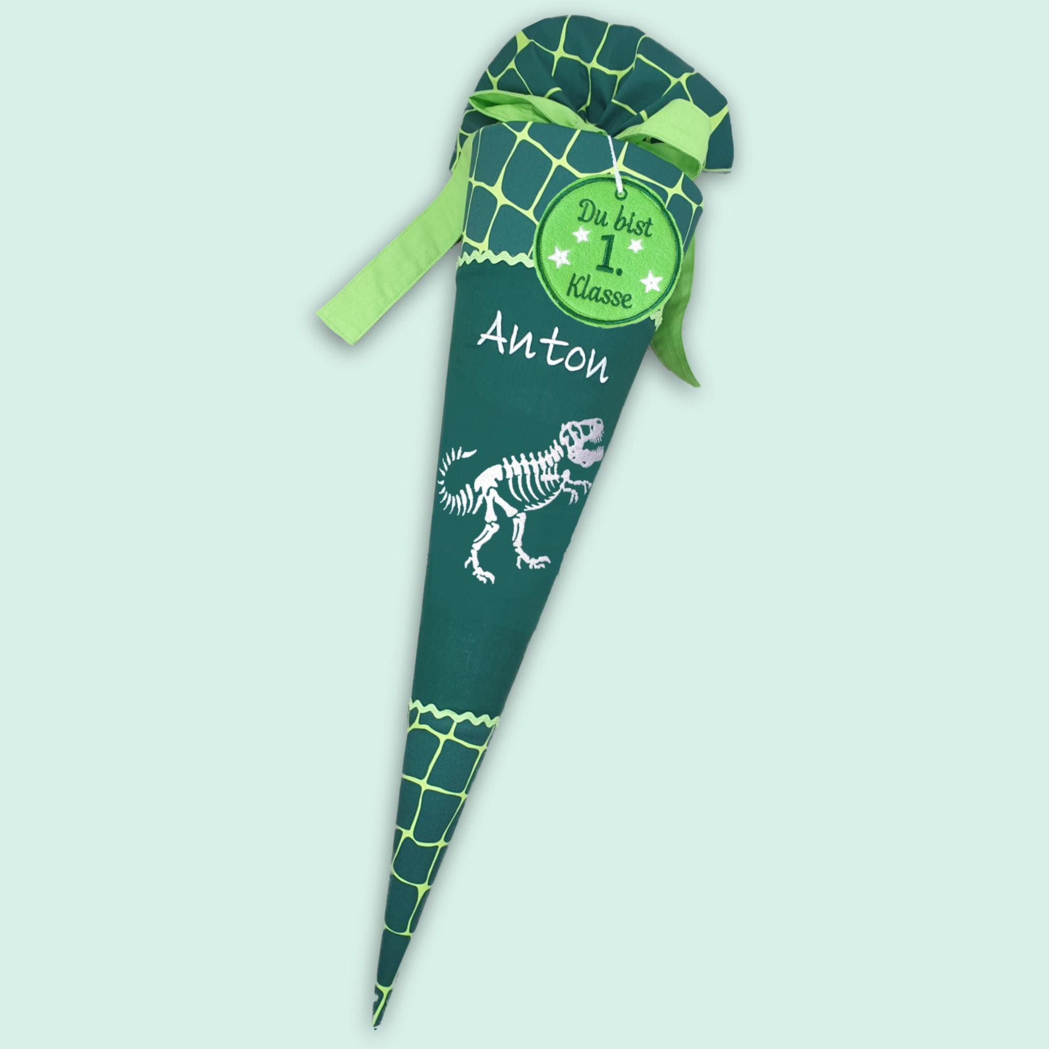 Schultüte mit Dinoskelett und Namen farblich auf den Bärex Schulranzen abgestimmt.