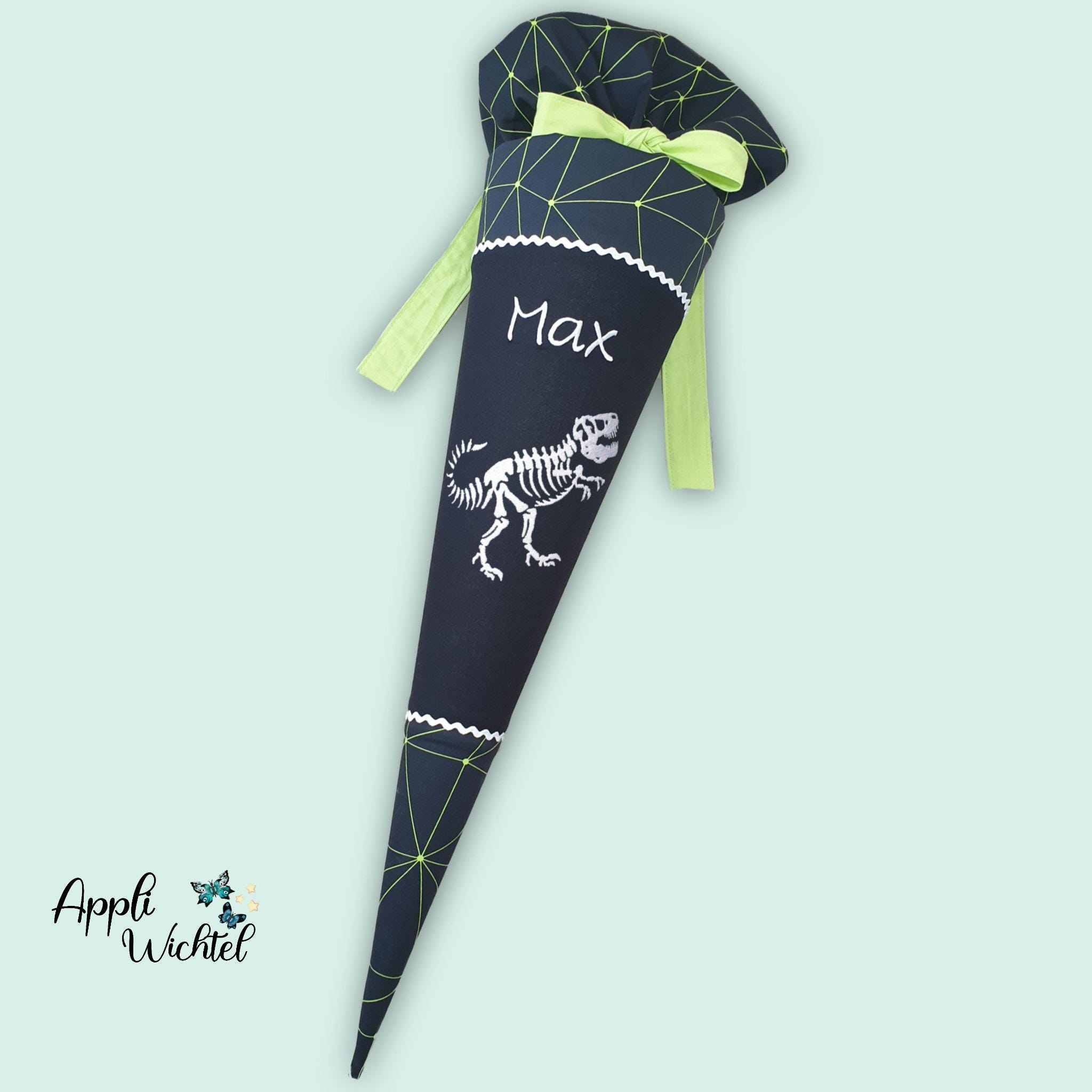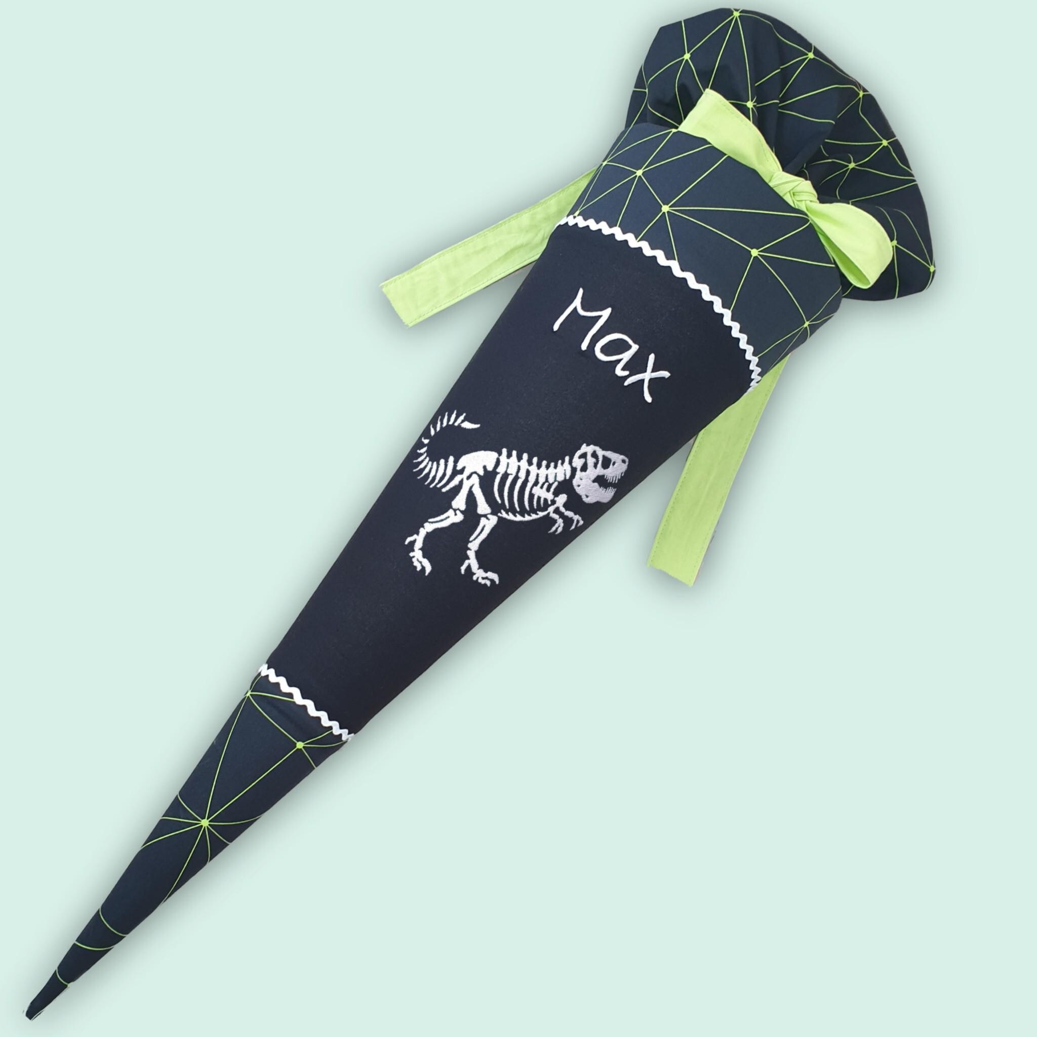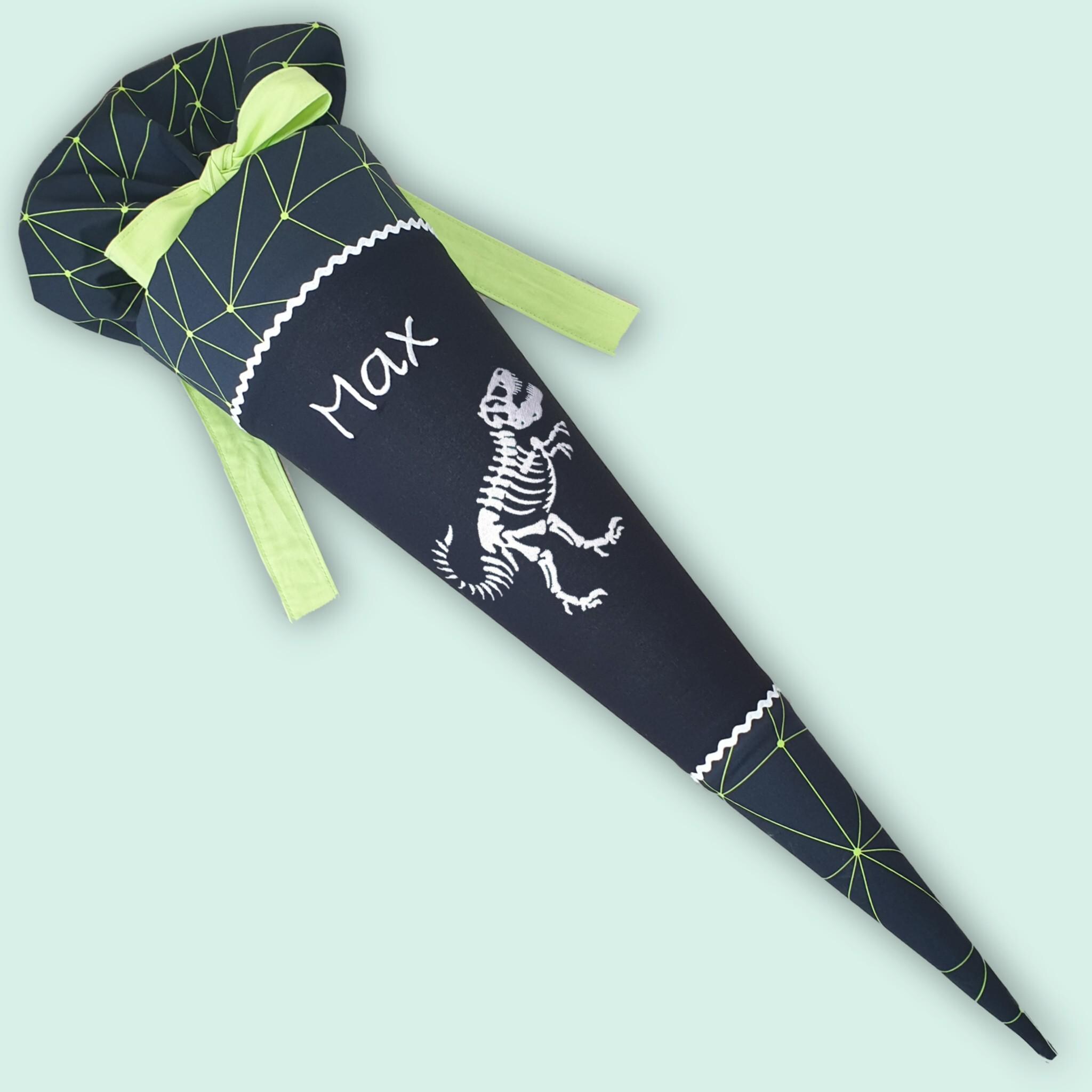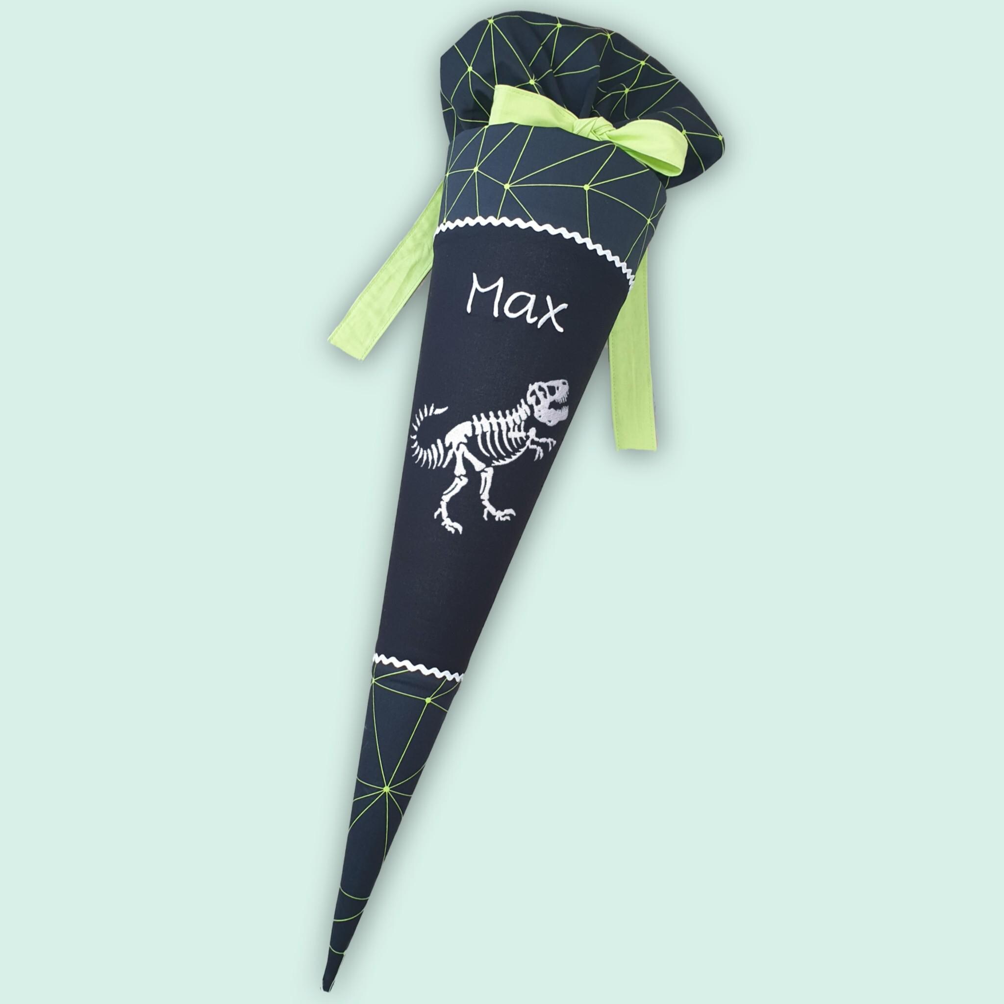 Schultüte mit Dino und Namen farblich auf den Cybär Race Schulranzen abgestimmt.