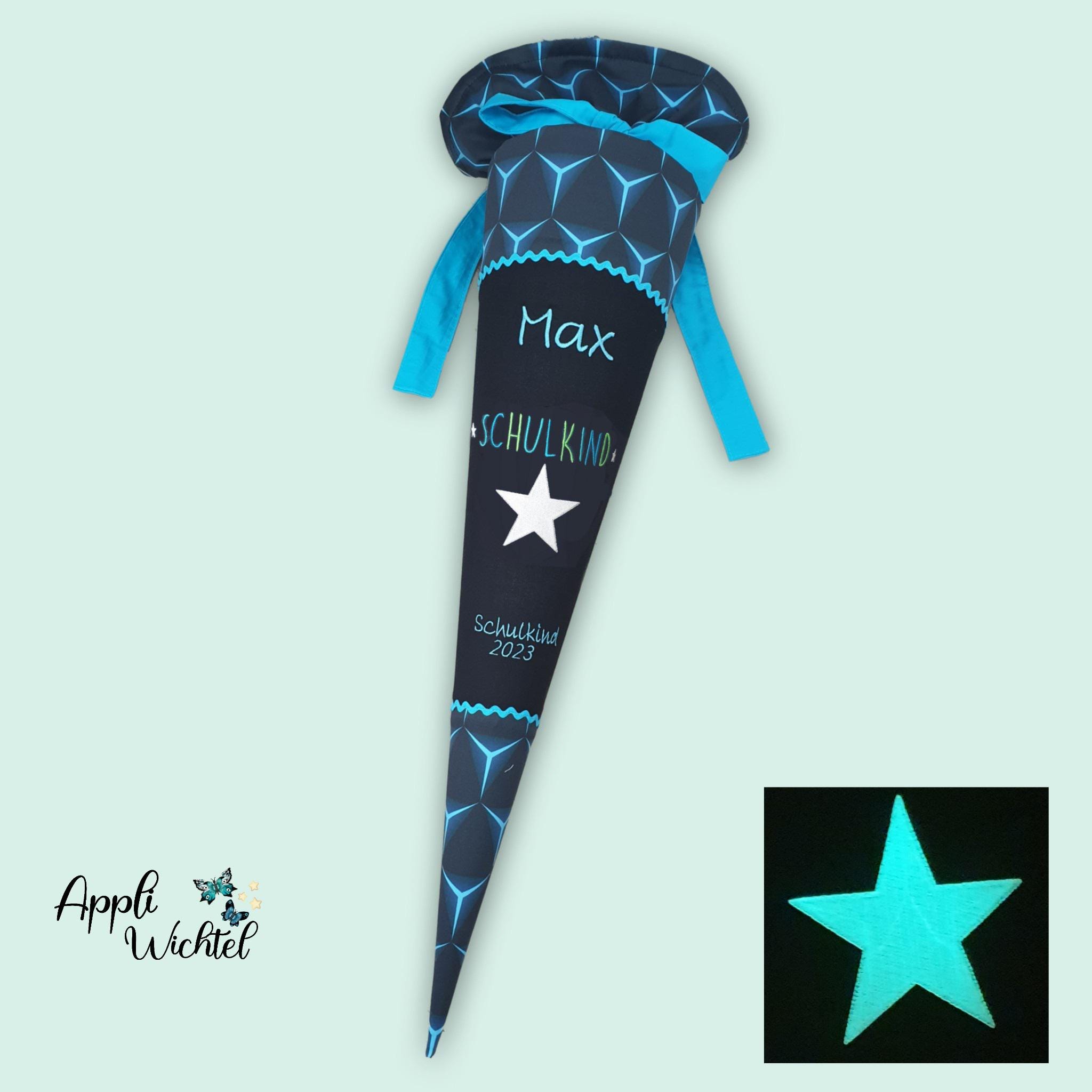 Schultüte mit Schulkind (Sterne leuchten im Dunkeln) und Namen farblich auf den Tiger Night Kimba Schulranzen abgestimmt.