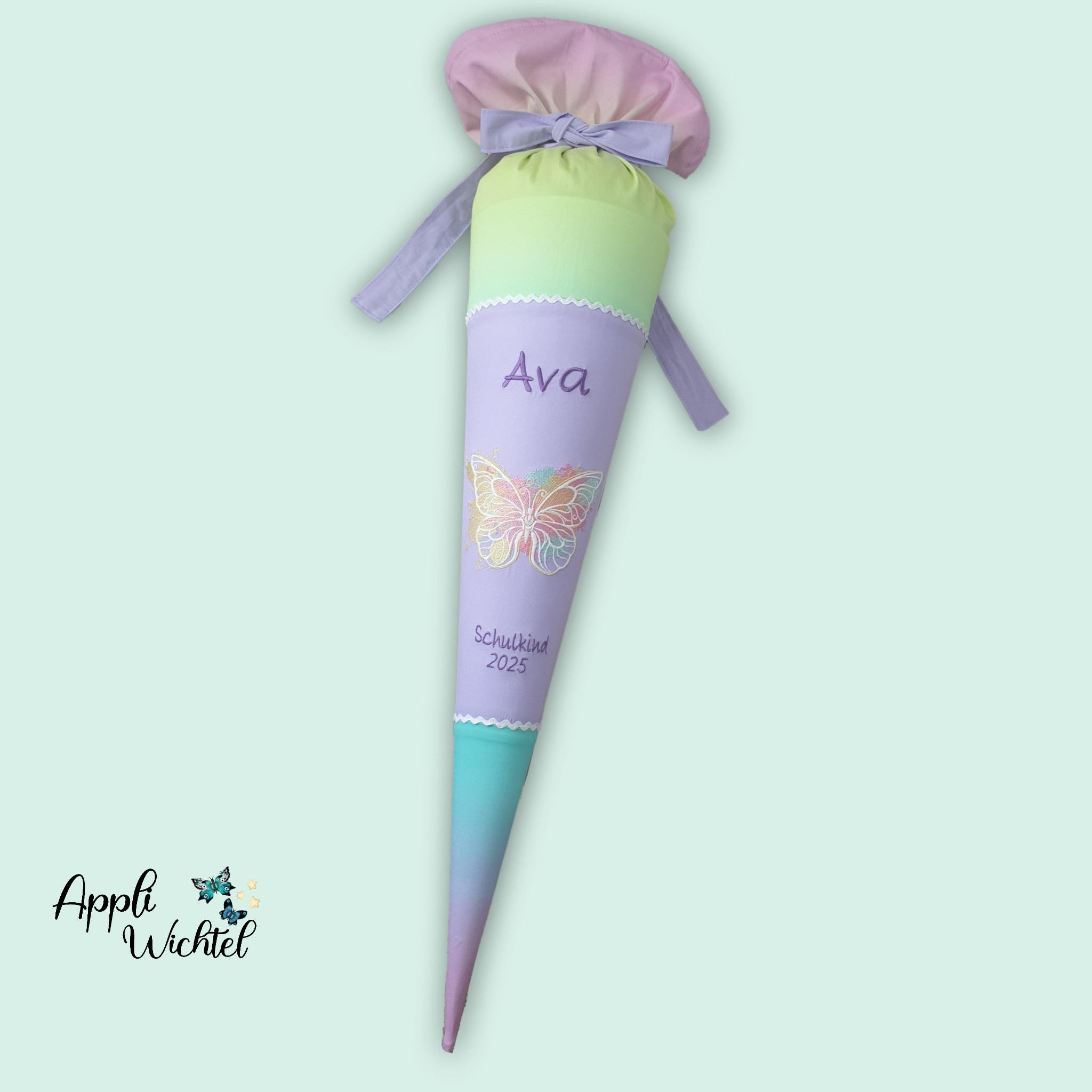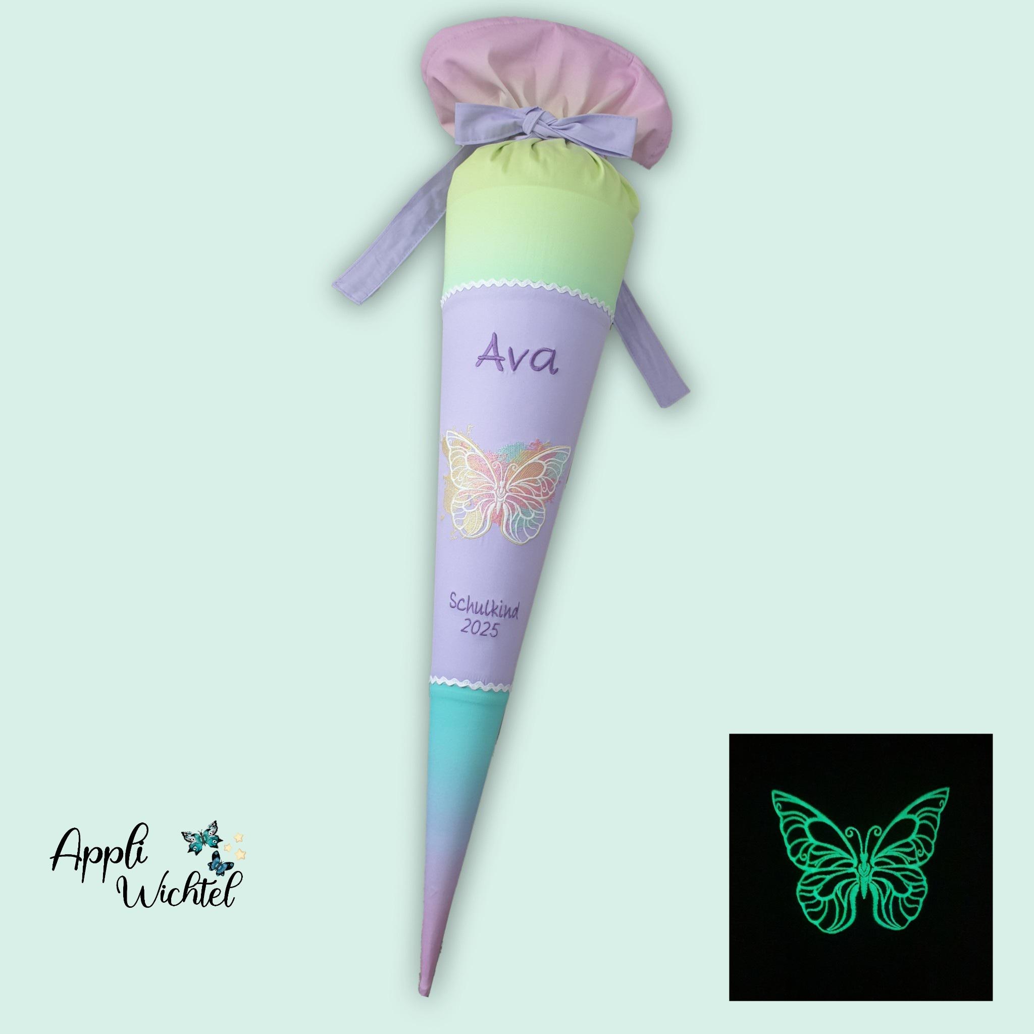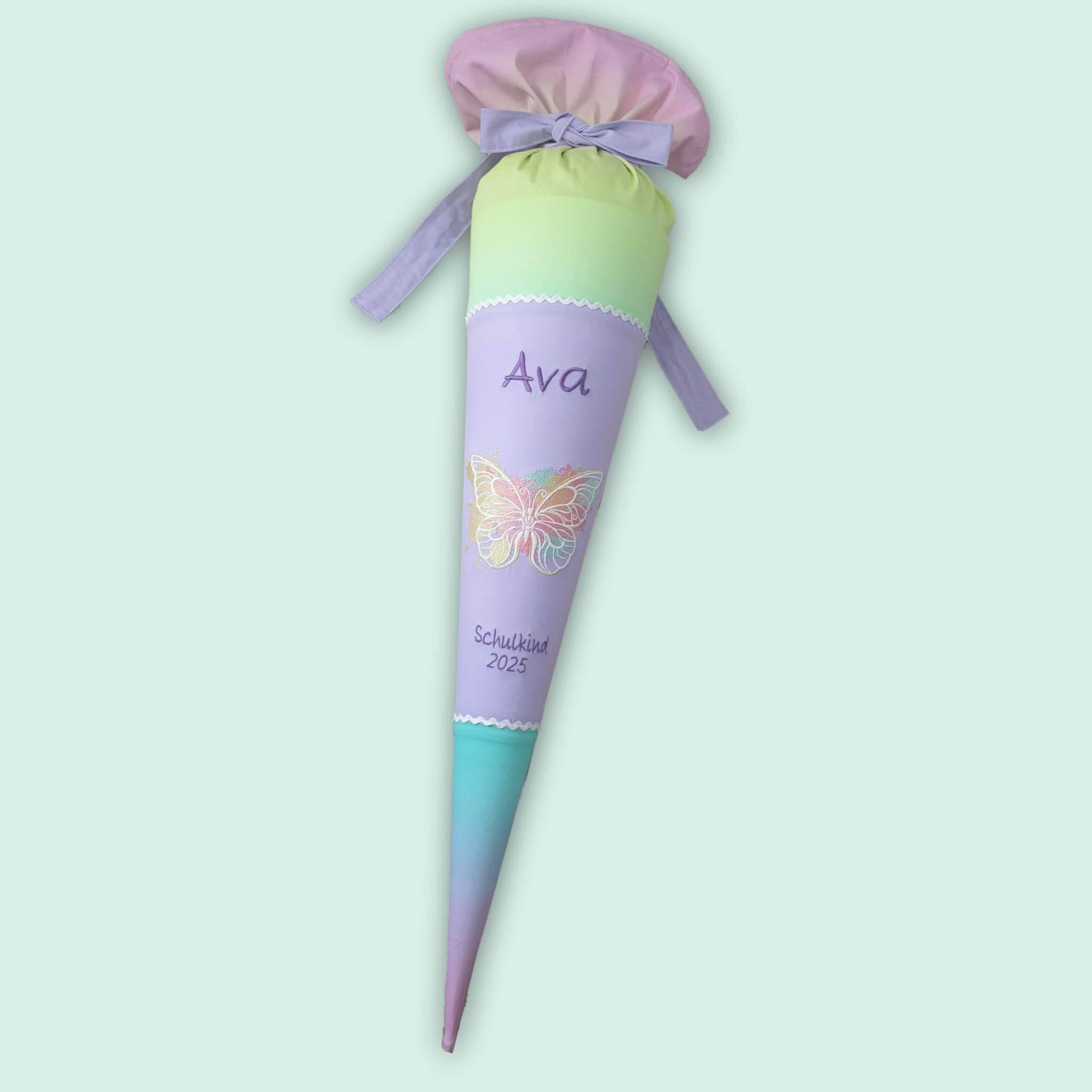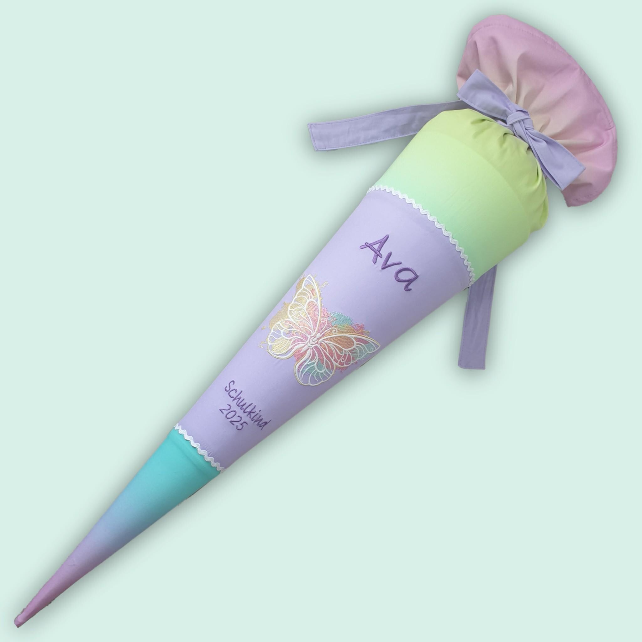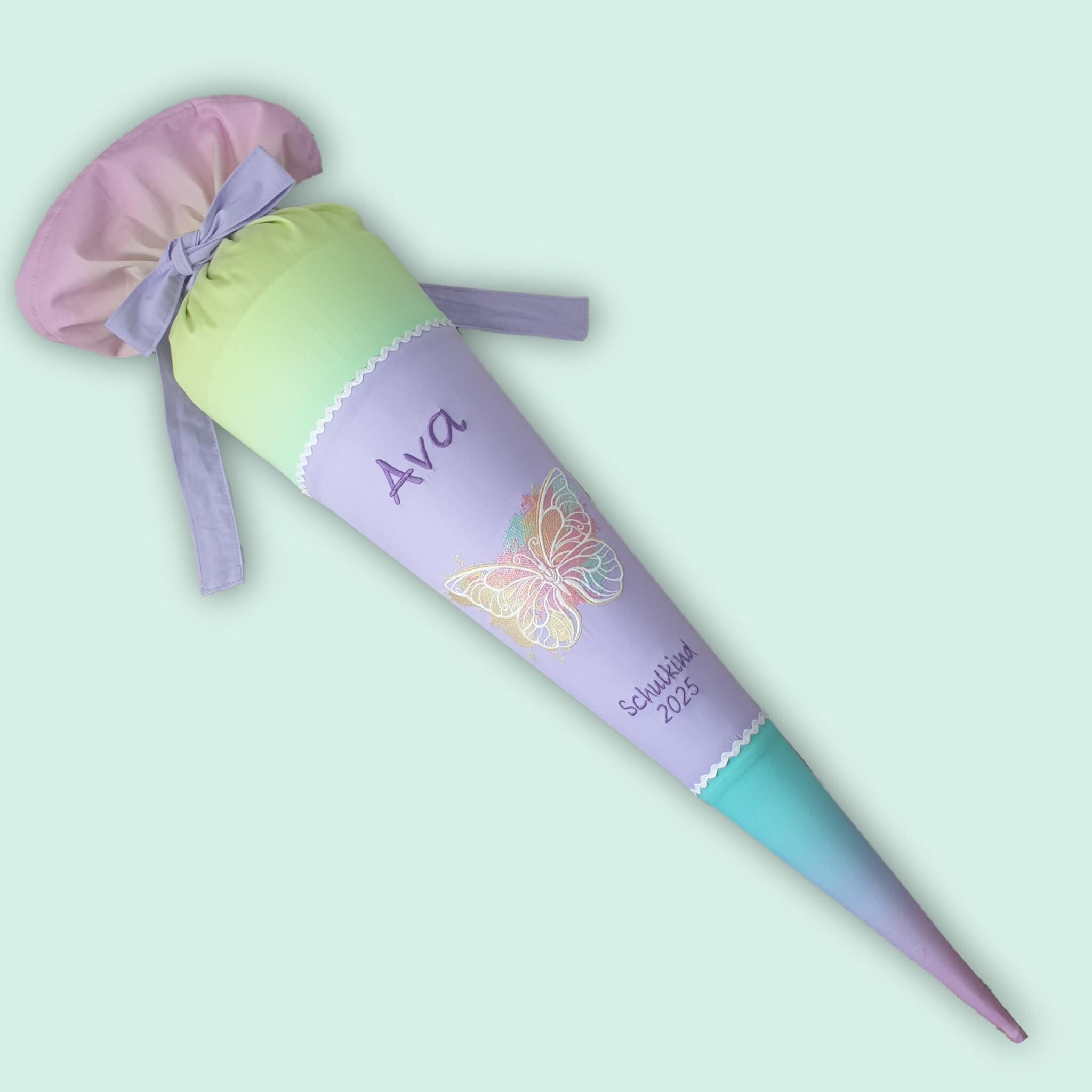 Schultüte mit Schmetterling und Namen farblich auf den Ergobag Zaubärwelt Schulranzen abgestimmt.