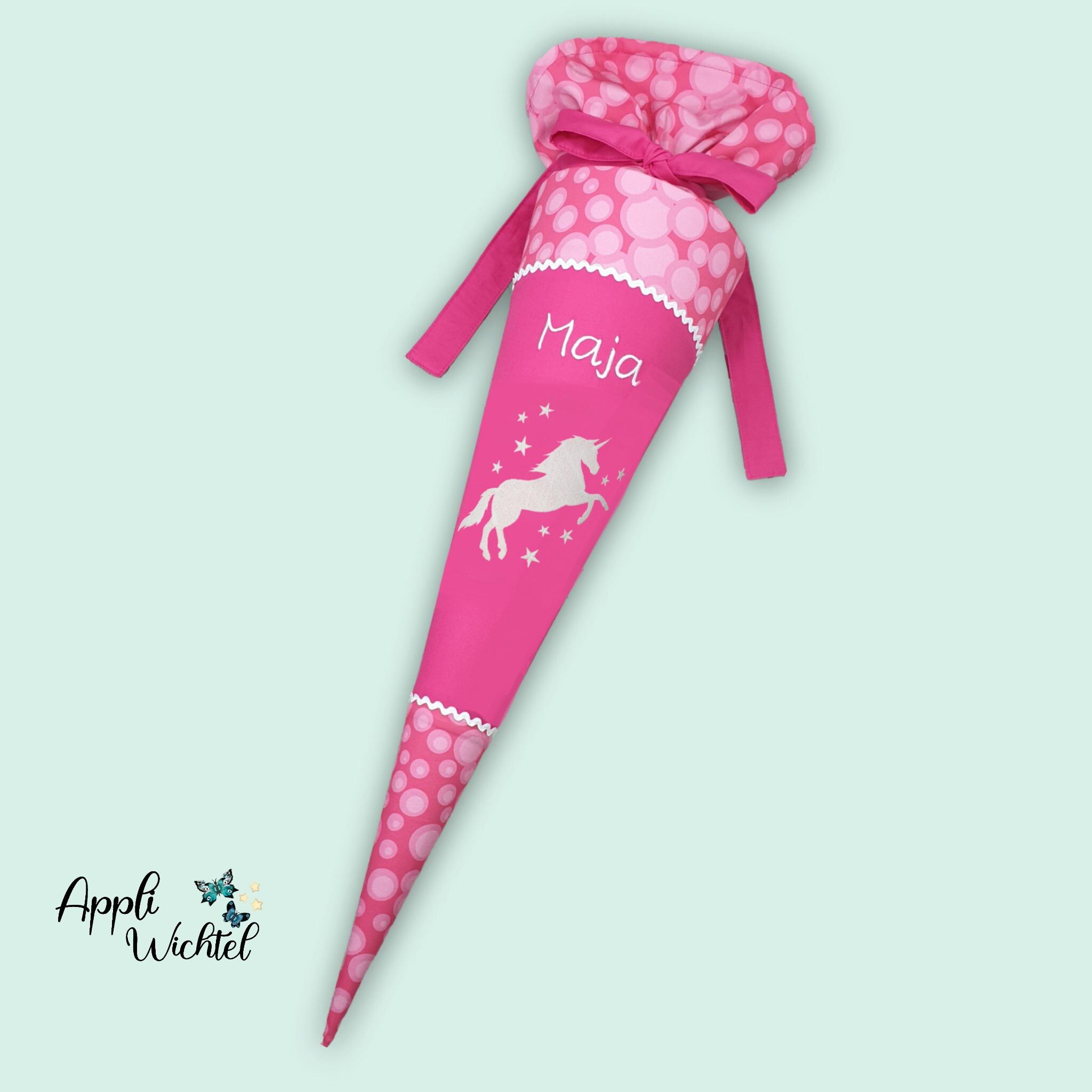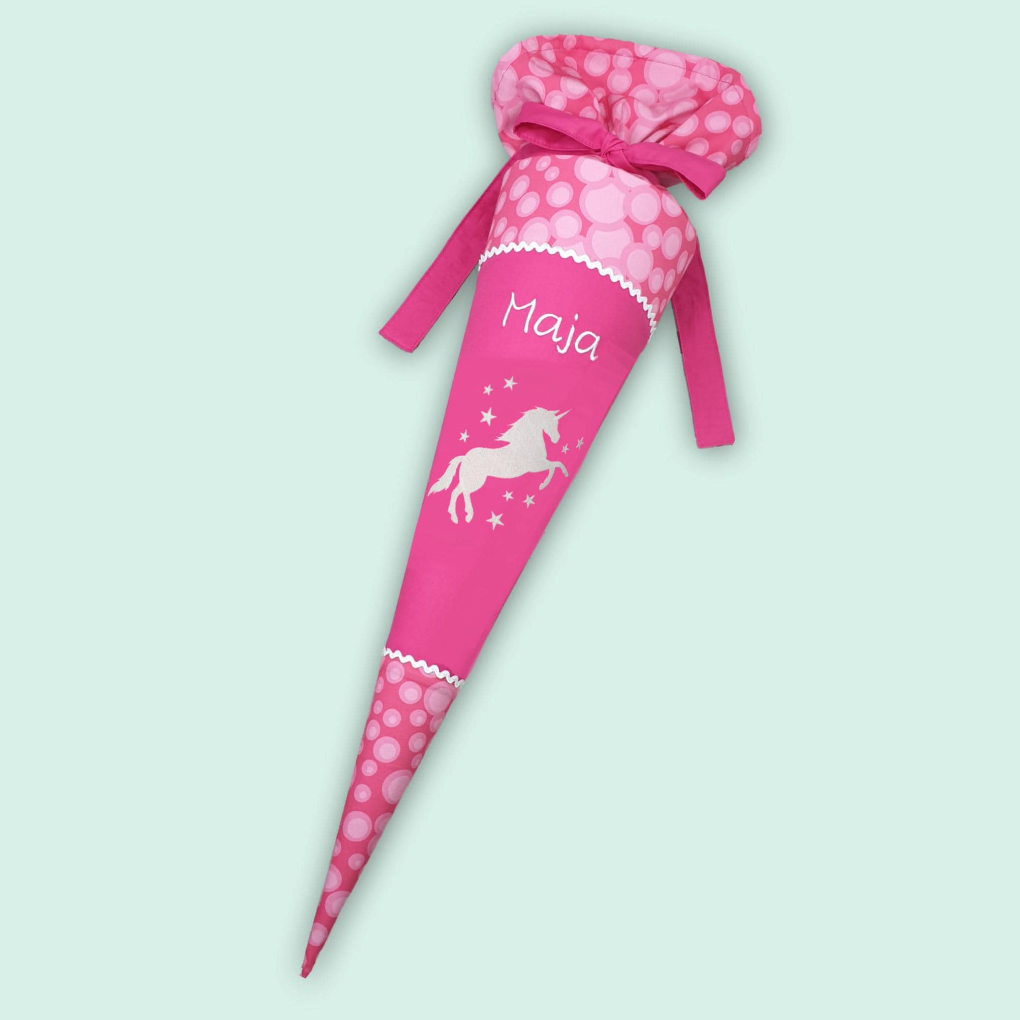 Jede Schultüte wird mit einem gestickten Motiv und dem Namen deines Kindes individuell gestaltet. Auf Wunsch fügen wir auch das Datum des ersten Schultages hinzu.