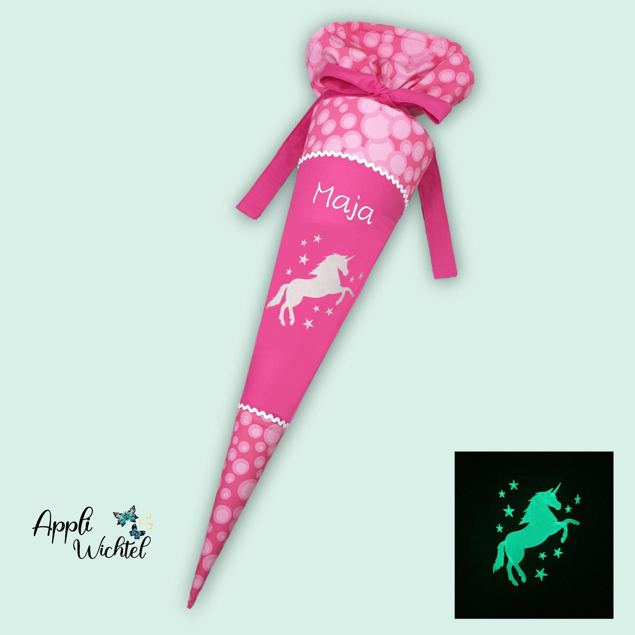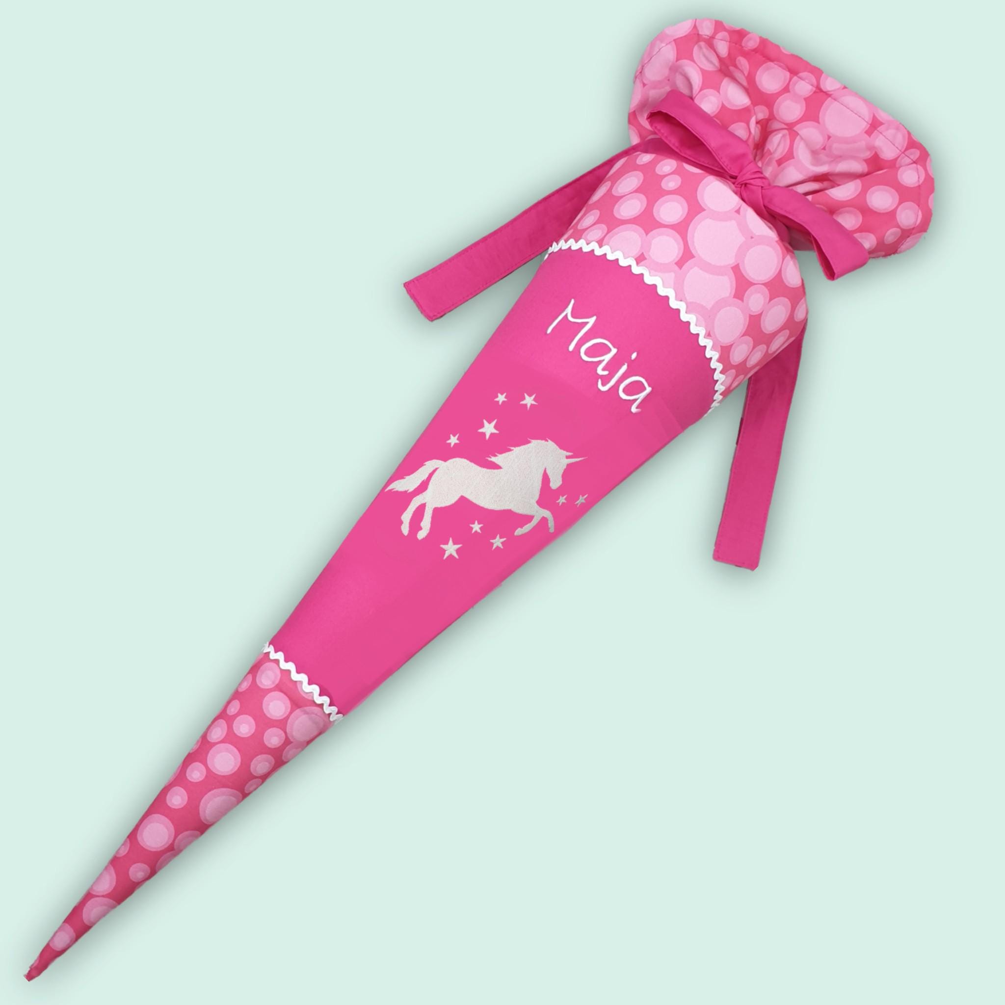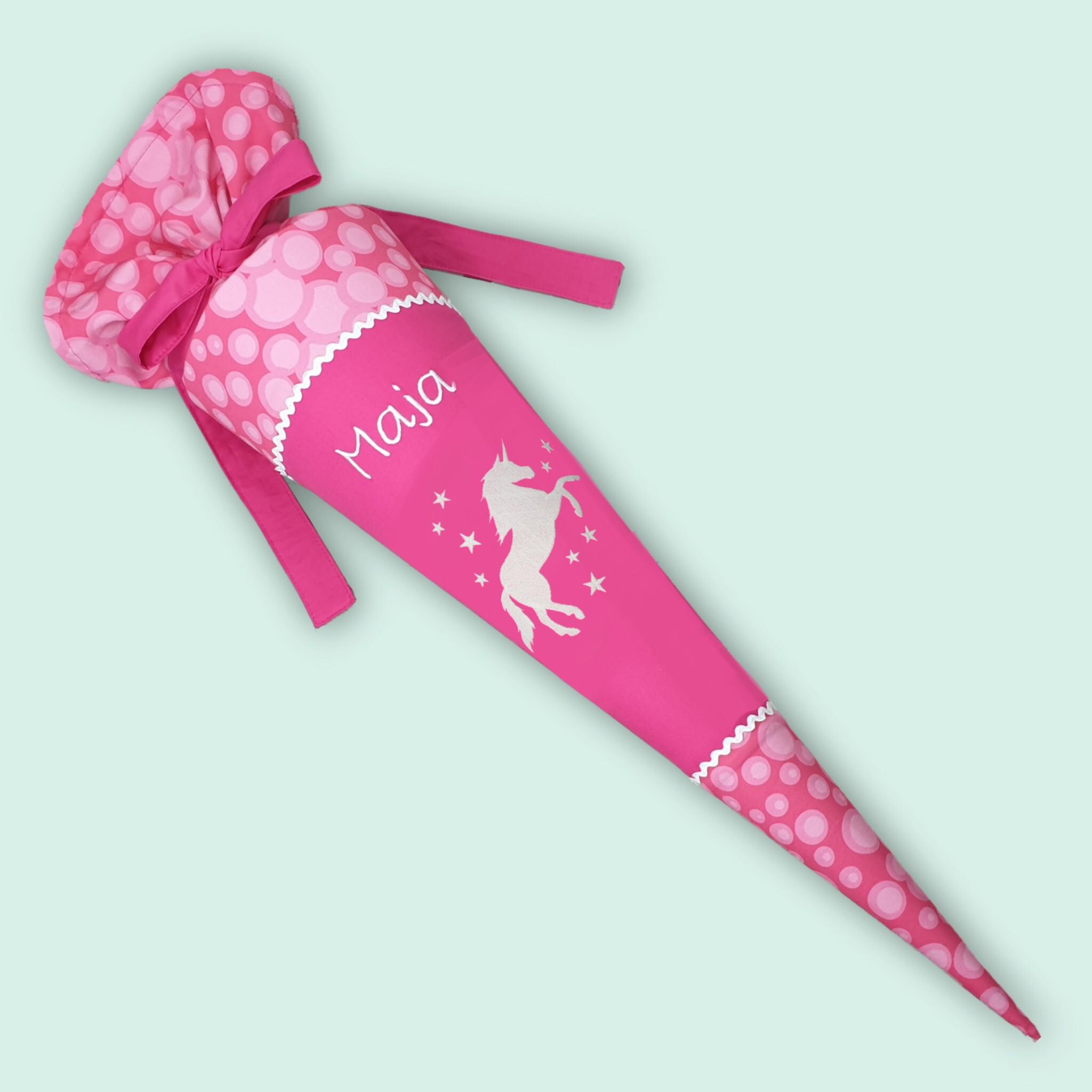 Schultüte mit Einhorn und Namen farblich auf den Ergobag Kuntbärbuntes Einhorn Schulranzen abgestimmt.