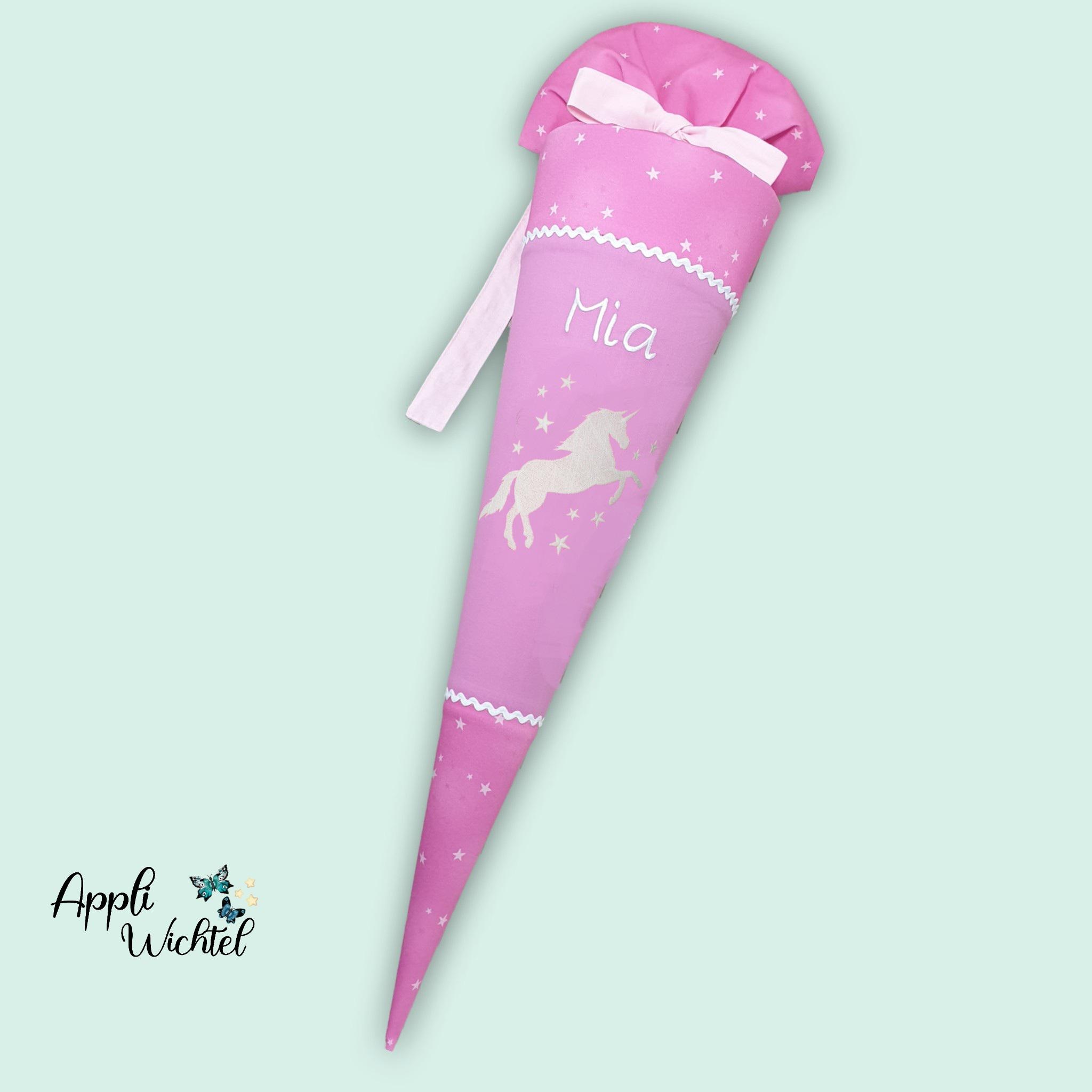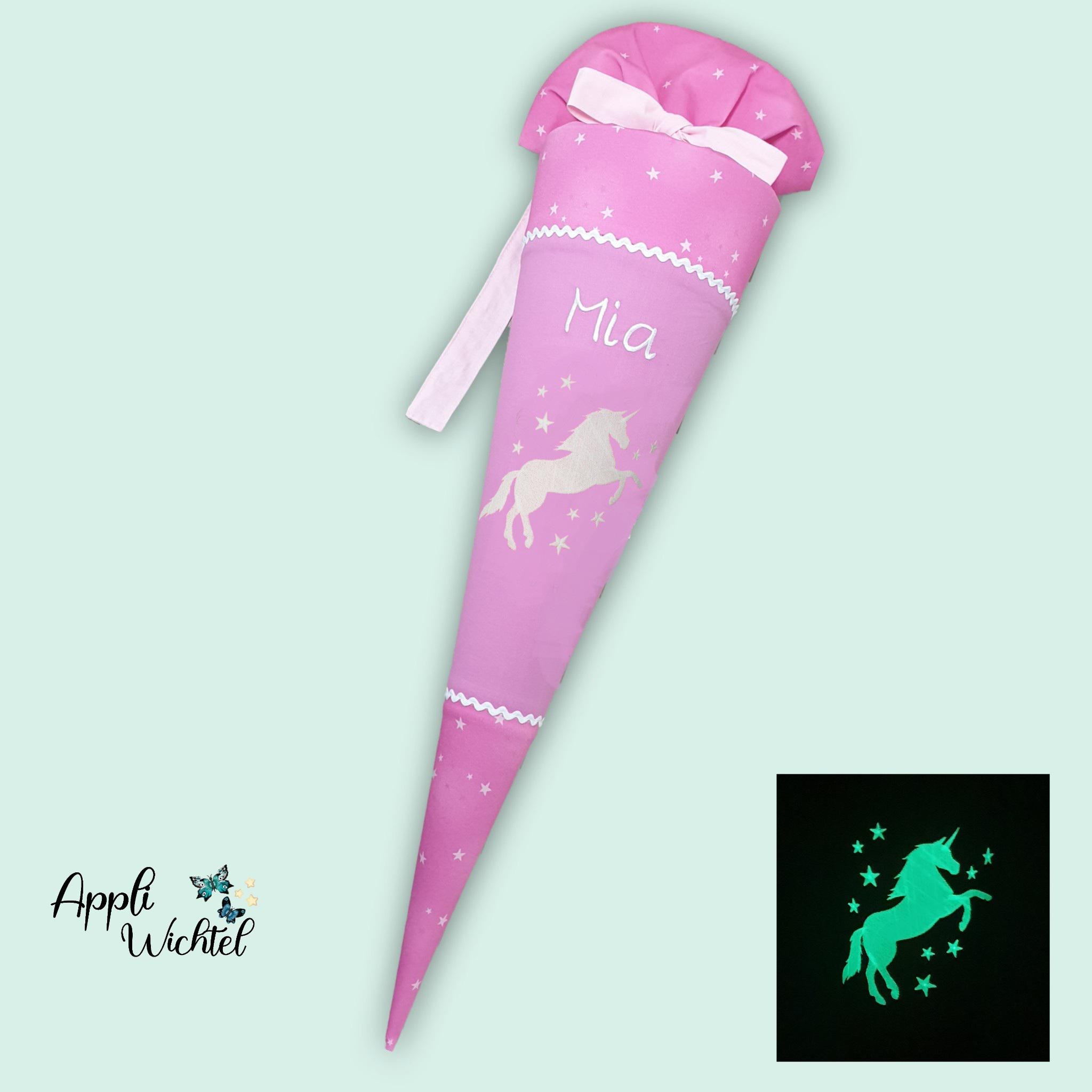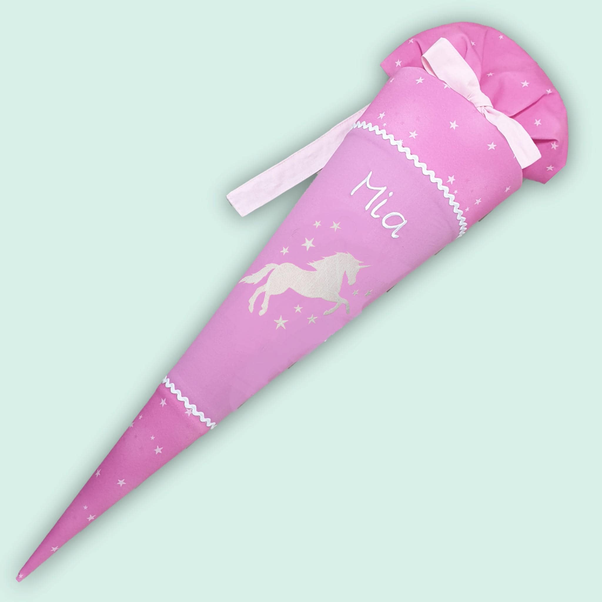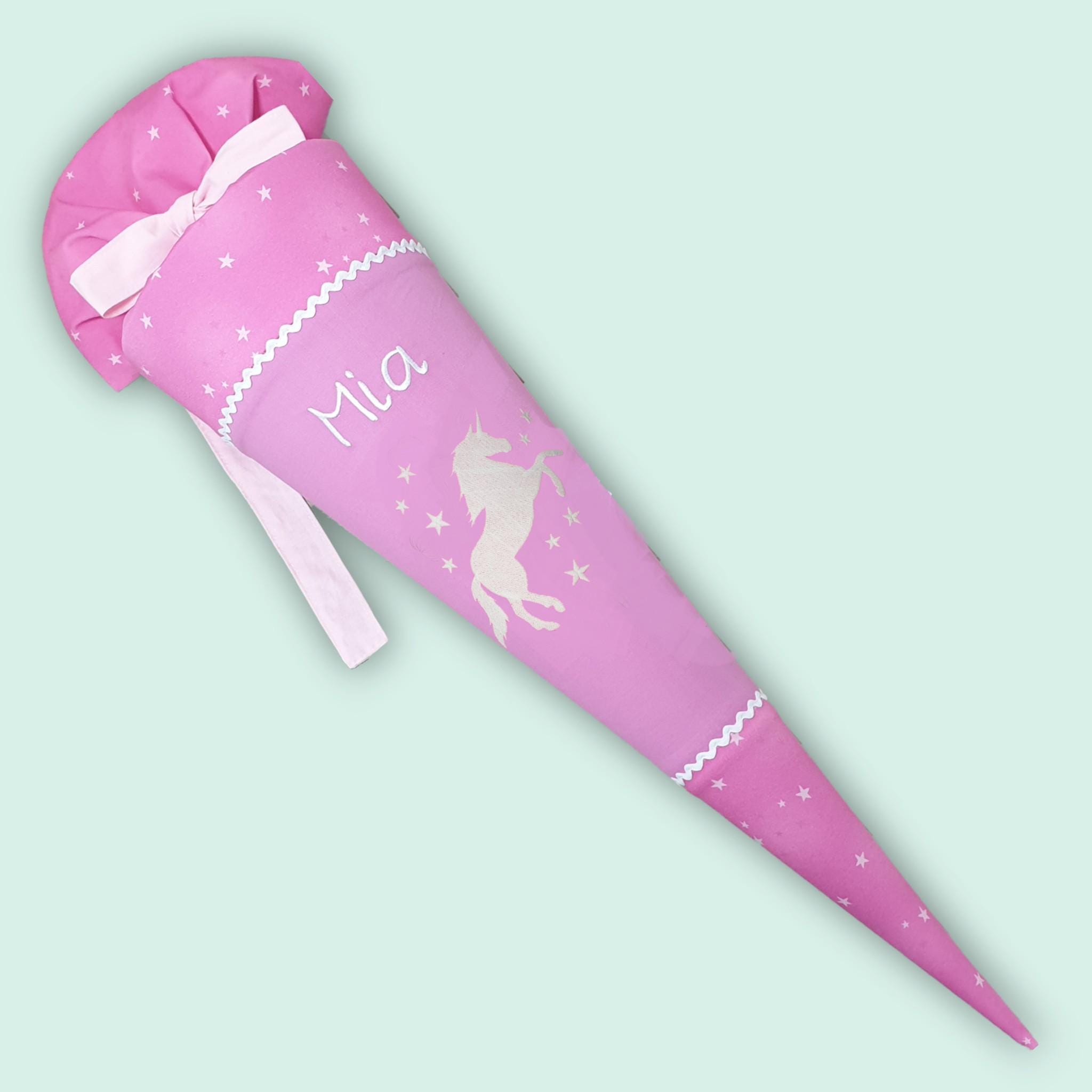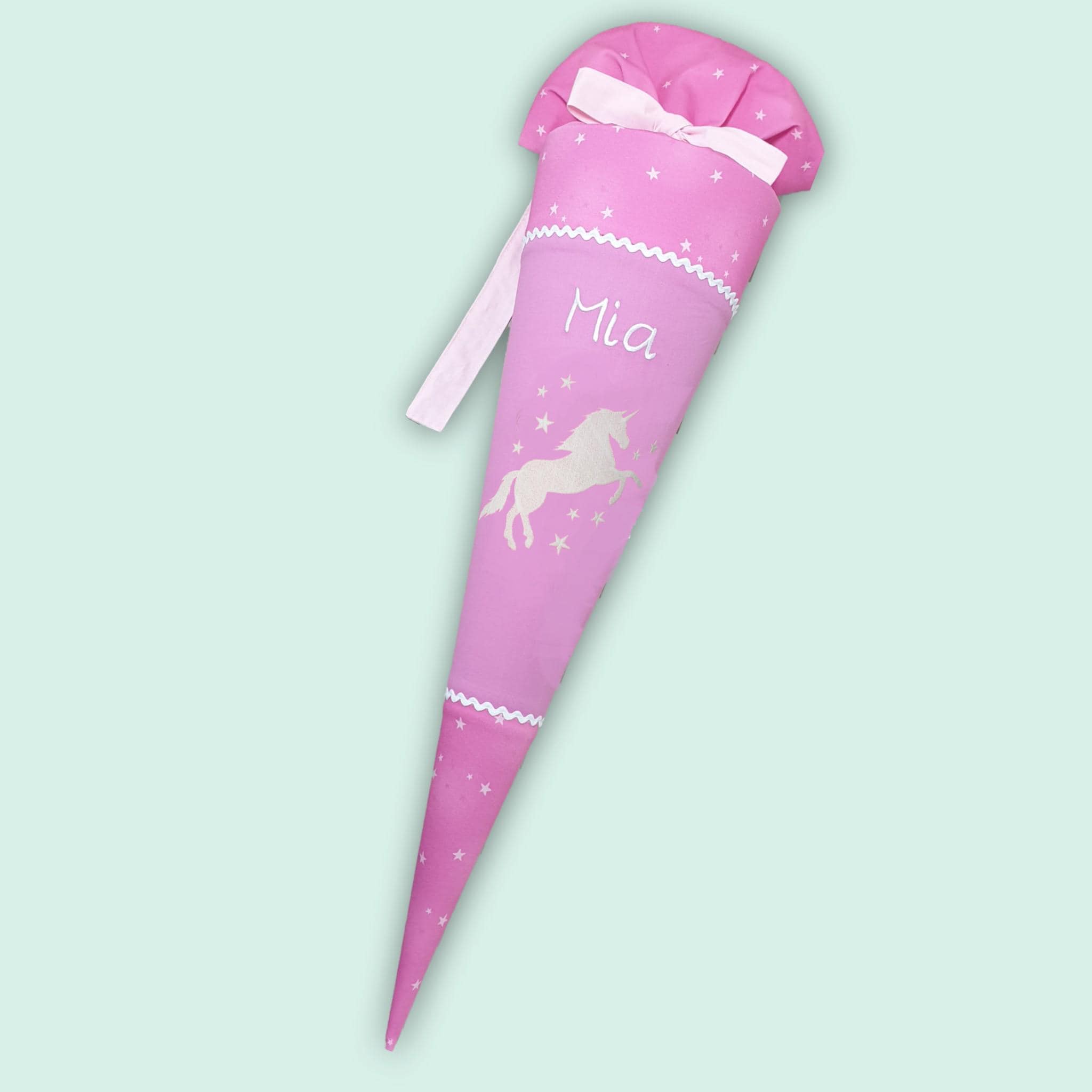 Schultüte mit Einhorn und Namen farblich auf den Wolkenzaubär Schulranzen abgestimmt.