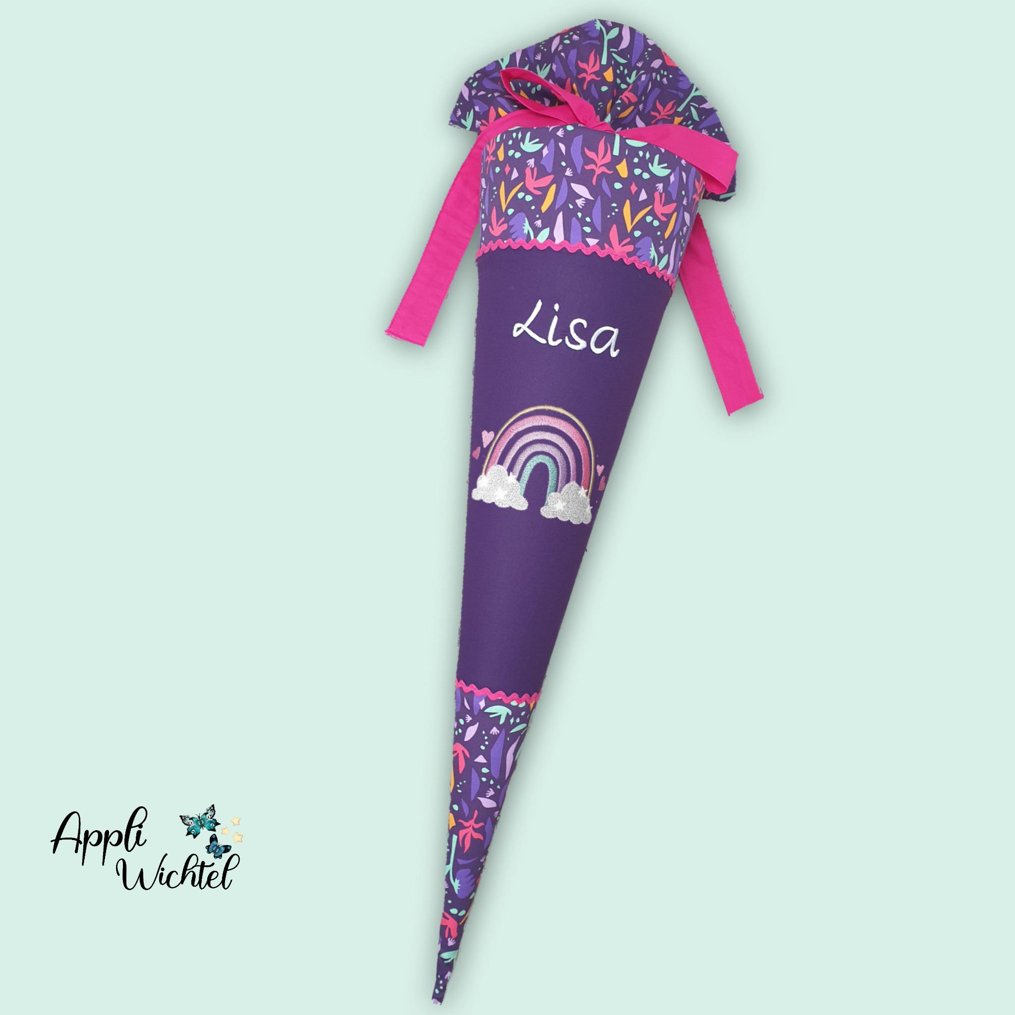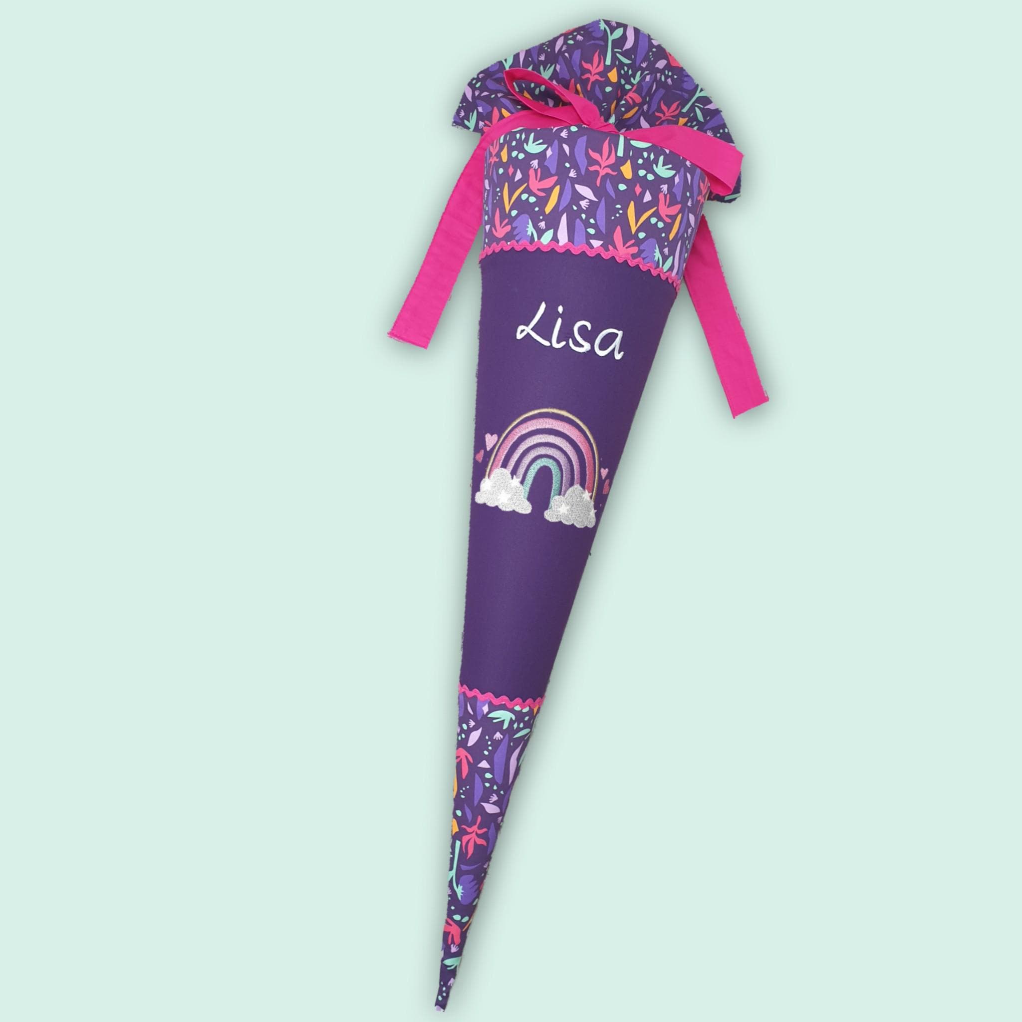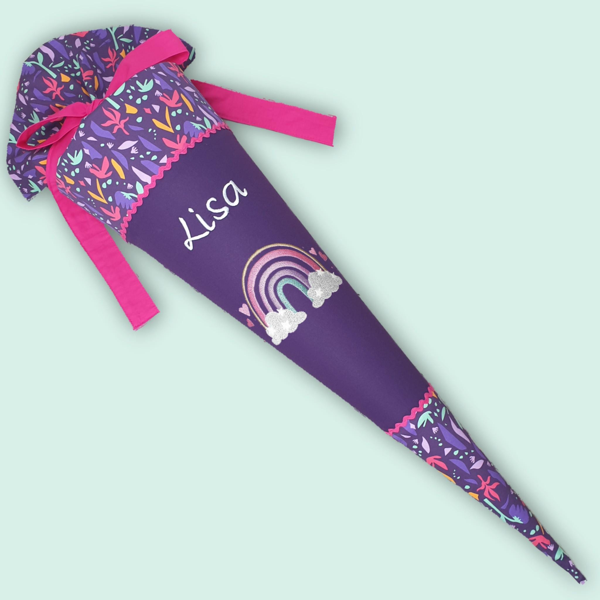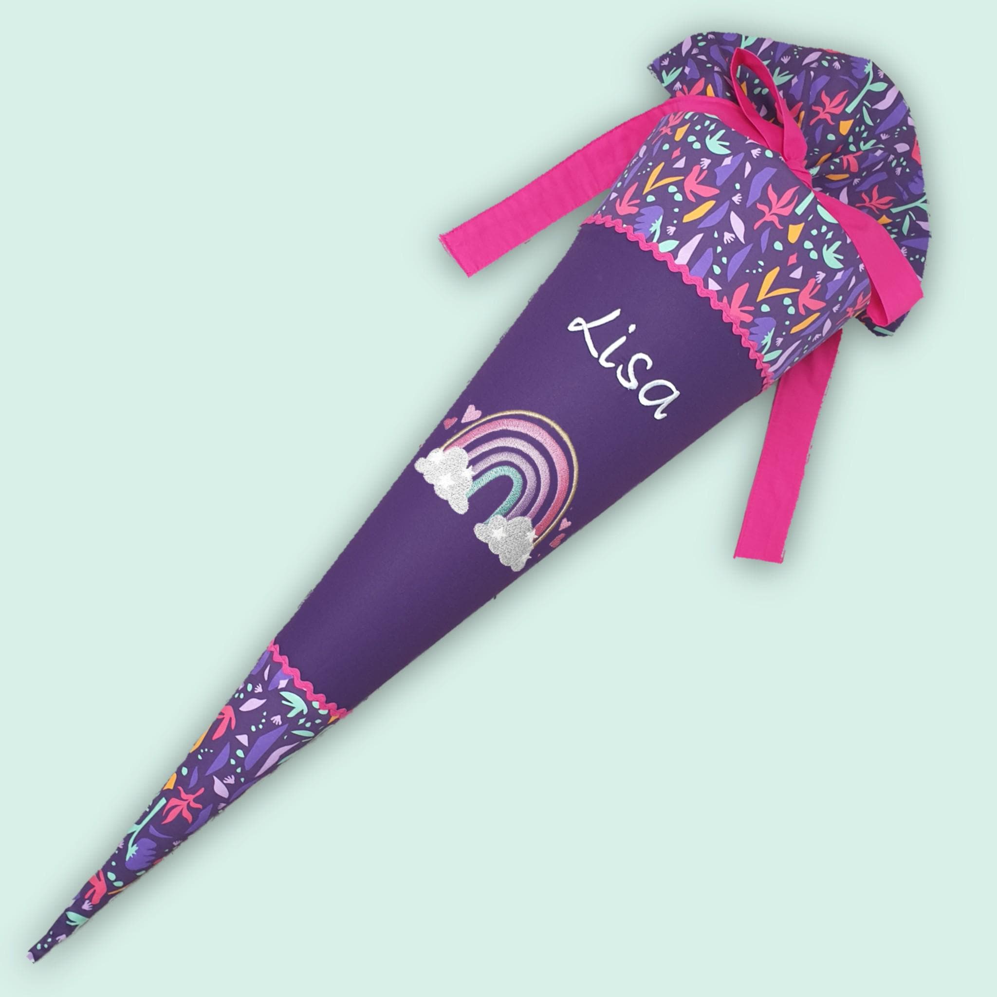 Schultüte mit Regenbogen und Namen farblich auf den Ambärzonas Schulranzen abgestimmt.